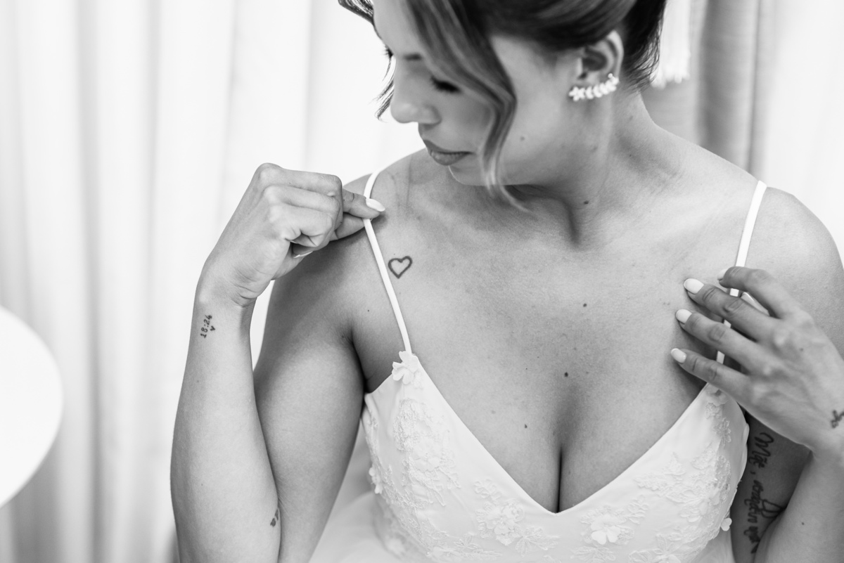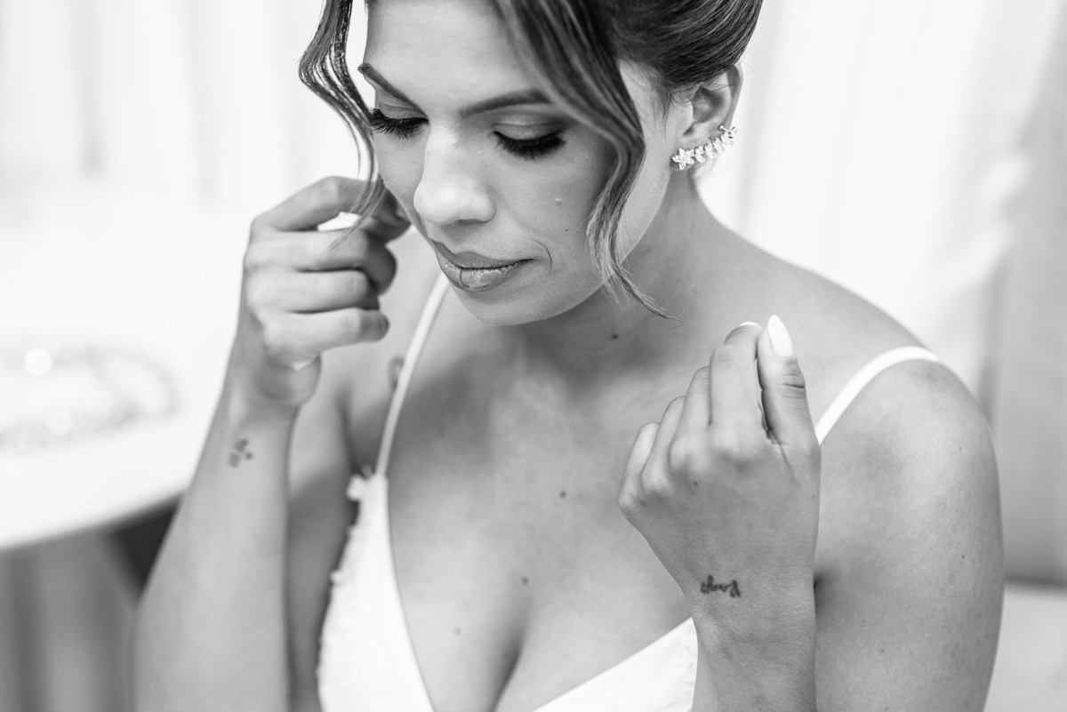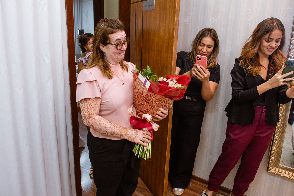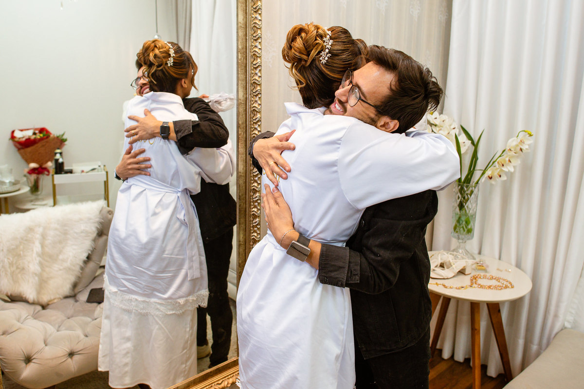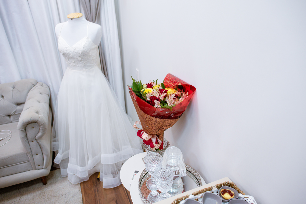 Bheatriz, por sua vez, fez seu dia de noiva aqui em Patos. Pelas mãos talentosíssimas de Brisley Ariel, quando chegamos no local, a make estava prontinha. A noiva plena, aguardando somente o penteado ser produzido. E ninguém menos do que seu padrinho e amigo de infância - Marcos Allvez, que ficou encarregado dessa tarefa muito especial. Bheatriz contou ainda com uma ajuda importante: a filha do casal. A pequena fez questão de acompanhar de perto, brincou, correu e fez a alegria de todos com sua graça e simpatia. A mãe do noivo e a sua madrinha de confiança a acompanharam também. Estávamos fazendo as fotografias quando de repente, somos surpreendidos com um lindíssimo presente do noivo. Ele enviou um buquê maravilhoso, com cartinha escrita à mão lembrando ela dos 10 anos de amor até ali. Bheatriz ficou muito feliz. Além do mais, ela ama amarelo, e as flores escolhidas por ele foram certeiras. A cada minuto que se passava, a ansiedade insistia em rondar o salão. Por mais tranquila que a noiva é, os minutos não davam trégua. Fizemos o brinde para quebrar um pouco da ansiedade do momento. Elas brindaram super felizes e deixaram a noiva a sós. Enfim, depois de fazermos mais algumas fotos e o penteado ficar pronto, era hora de colocar o vestido.