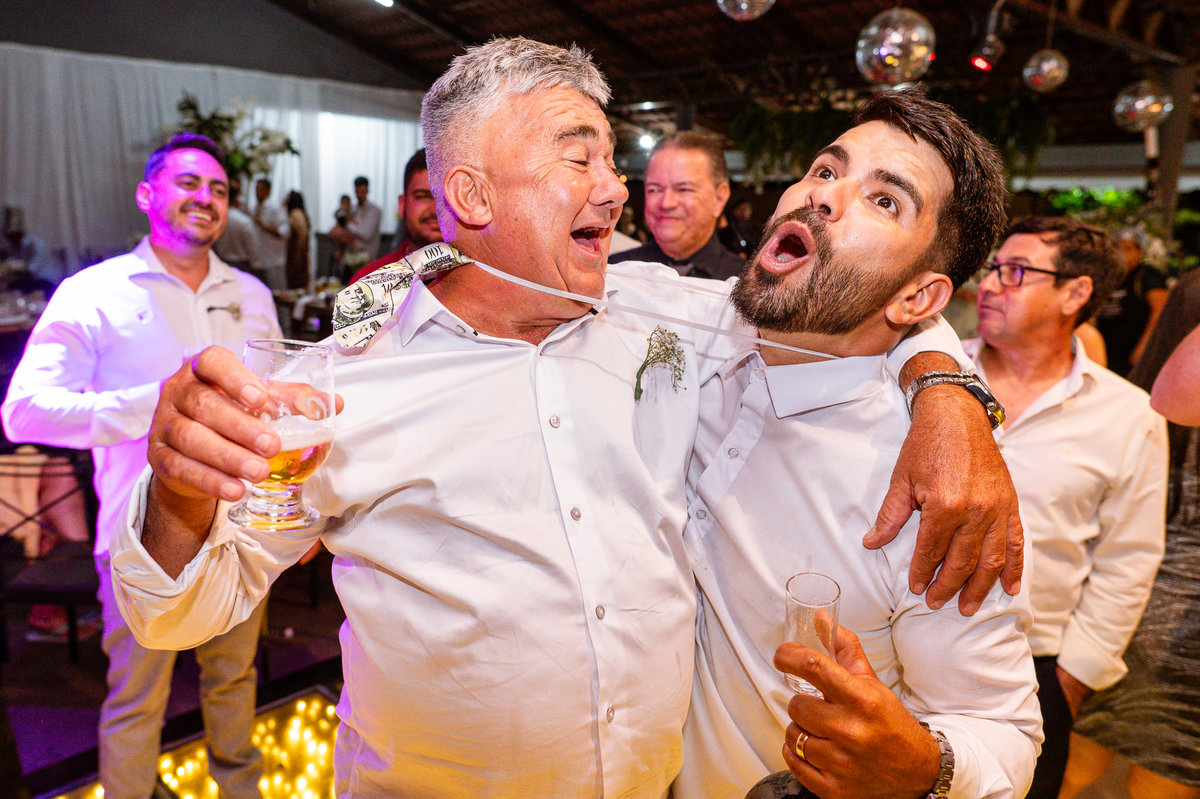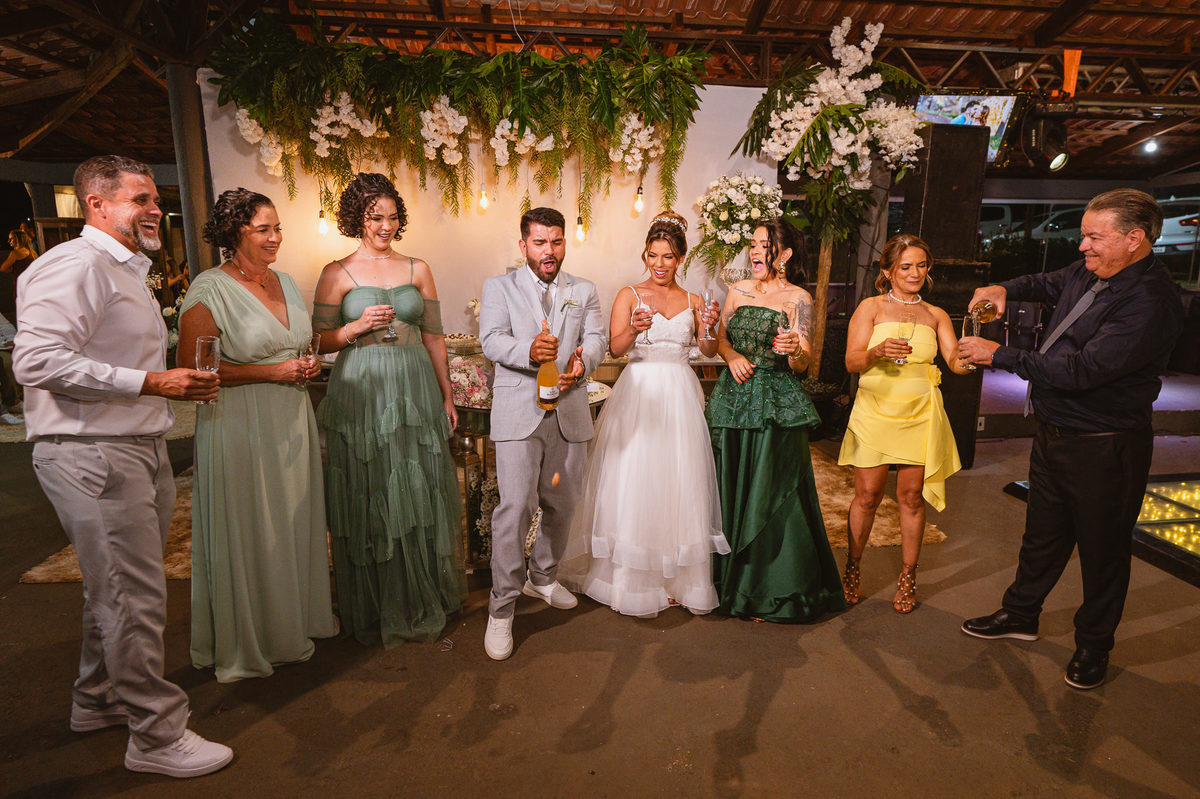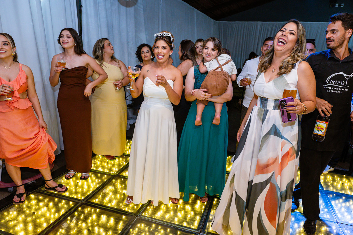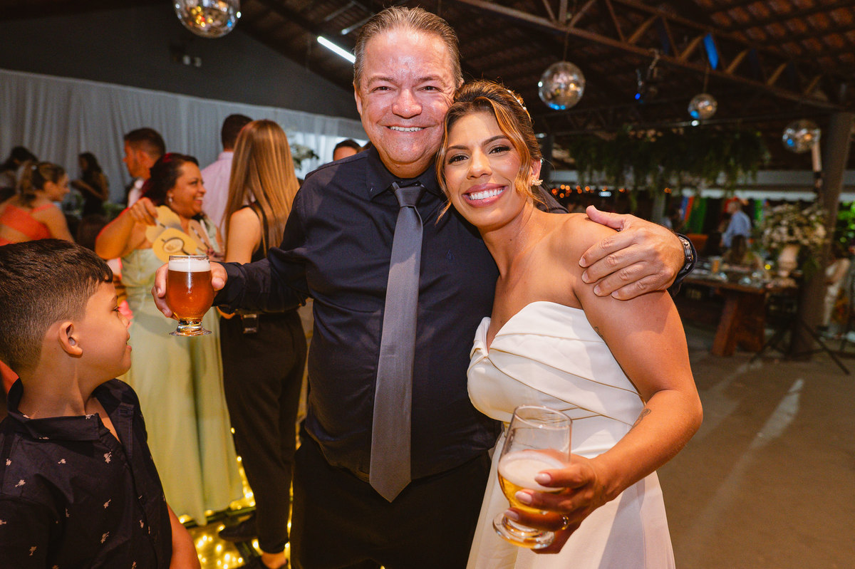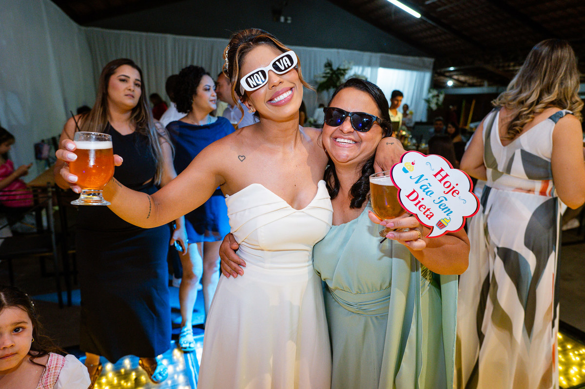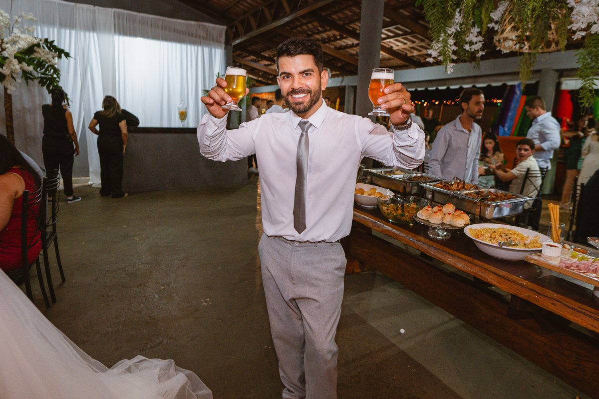 Deixamos os convidados sendo encaminhados para a recepção enquanto aproveitávamos o tempo para fotografar. Fizemos nosso tradicionalíssimo ensaio dos recém-casados. Em poucos minutos, conseguimos fotografias lindas. Terminadas as fotos, partimos pra recepção. Lá chegando, os noivos se alimentaram enquanto os padrinhos foram perfilados na entrada da festa. Com muitos bastões de led nas mãos, óculos personalizados e muito som, eles foram anunciados para adentrar a pista de dança. Passaram pela fila com muita felicidade, curtindo, gritando e comemorando muito com todos seus padrinhos. Já na pista, eles agradeceram os seus convidados e desejaram que curtissem muito aquela noite. Fizemos mais algumas fotografias protocolares na mesa do bolo e dispensamos o noivo, que tratou de ser raptado pelos padrinhos da gravata. Percorremos o salão junto com a noiva que cumprimentou todos os seus convidados. Bheatriz dançou, bebeu, curtiu, dançou e comeu. Aproveitou cada minuto da sua festa. Quando a cantora Aletis Garcia subiu ao palco, trazendo seu sanfoneiro que é prata da casa, todo mundo caiu na dança. Com um repertório vasto e que agradou a todos sem exceção, fez da noiva e até o fotógrafo dançar.