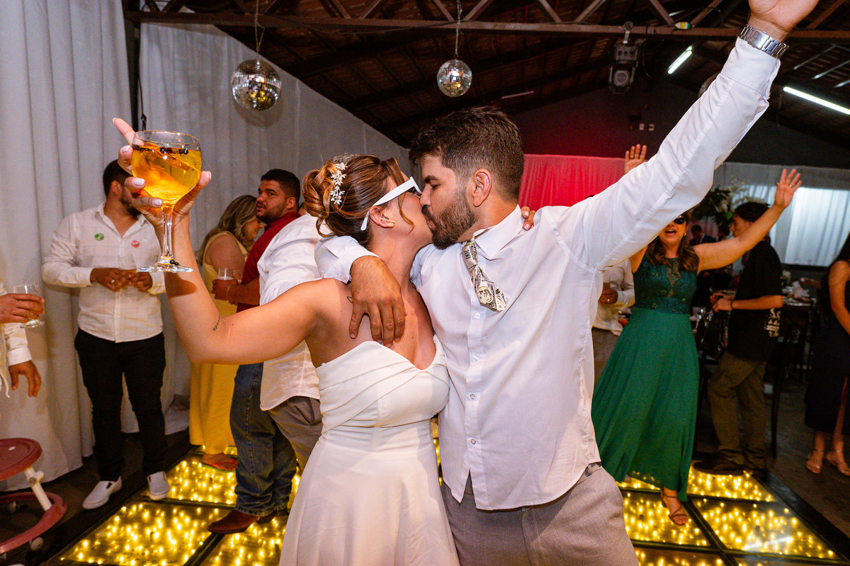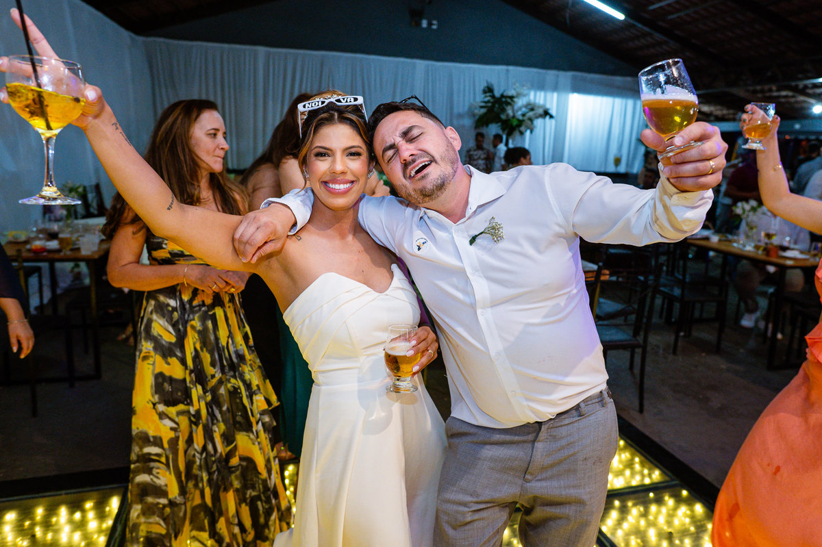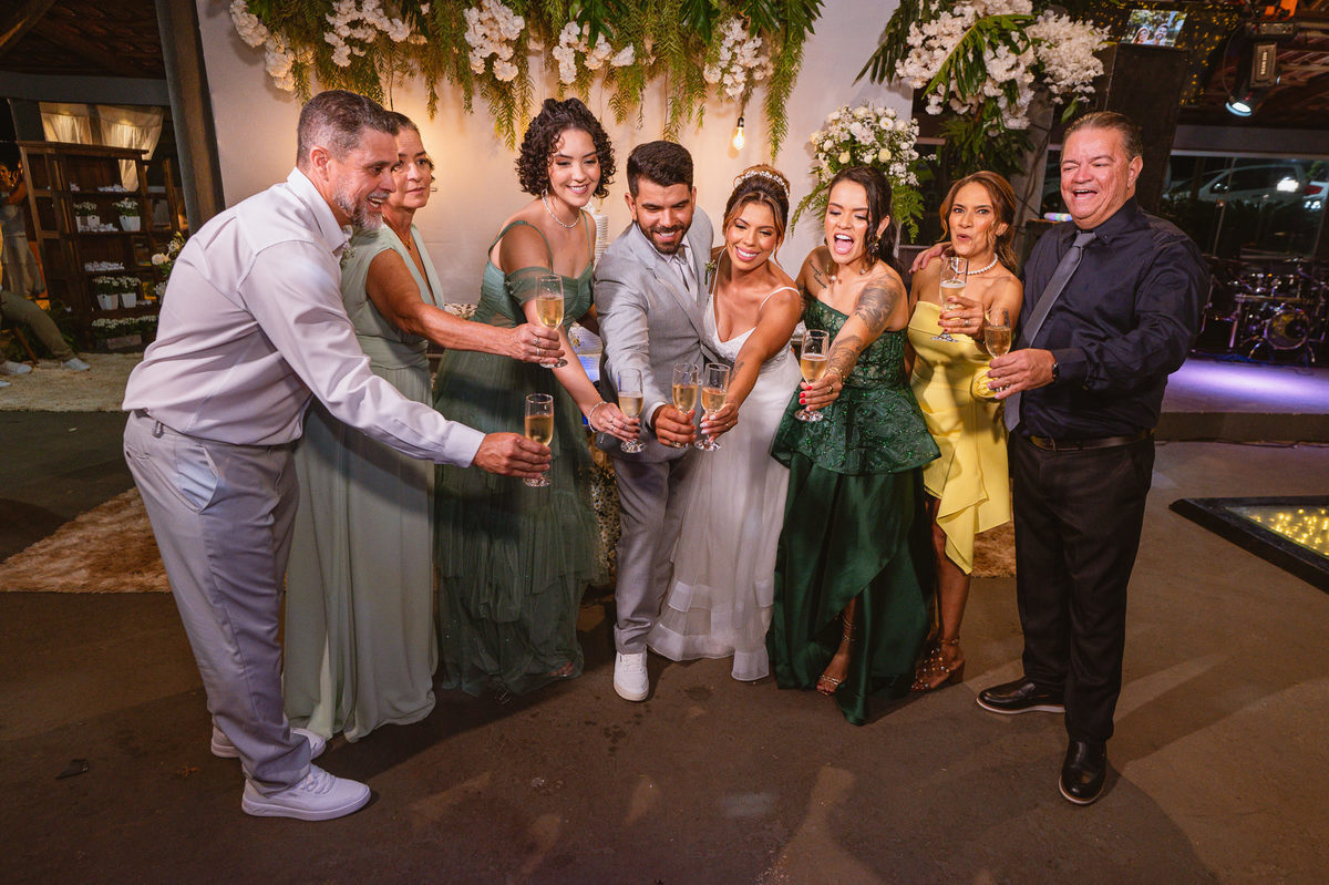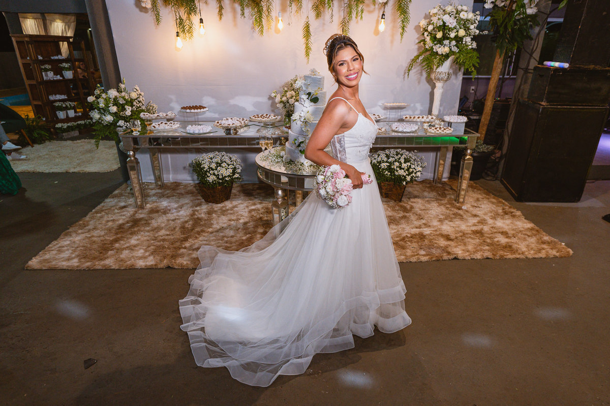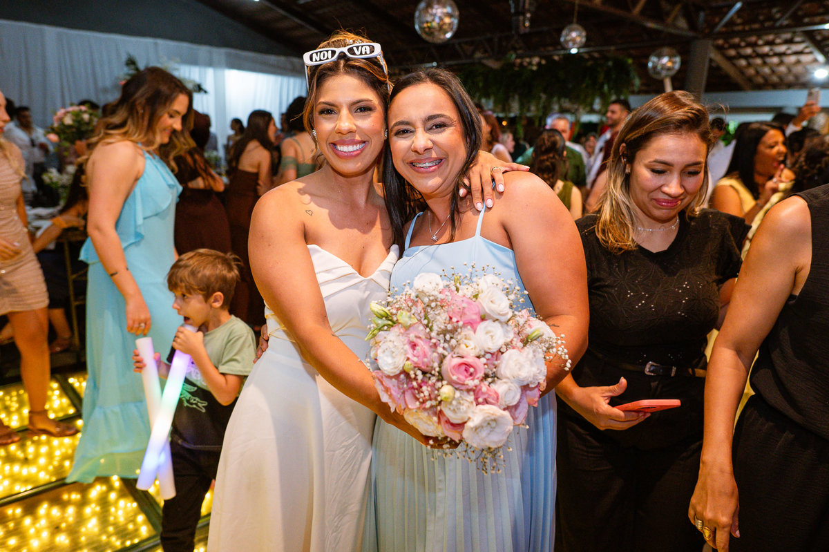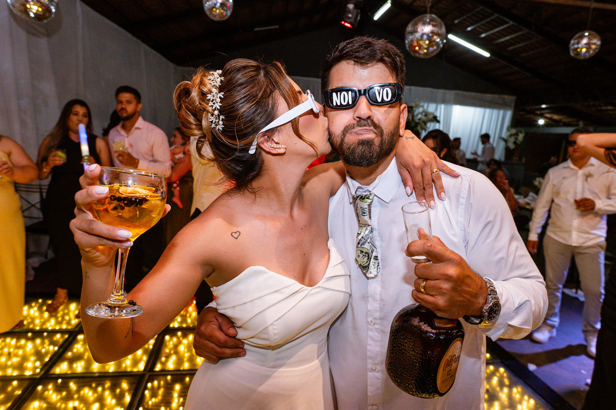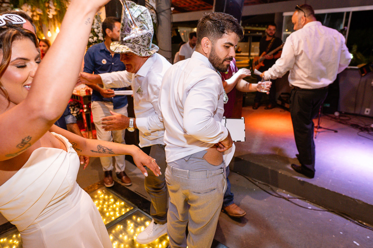 Deixamos os convidados sendo encaminhados para a recepção enquanto aproveitávamos o tempo para fotografar. Fizemos nosso tradicionalíssimo ensaio dos recém-casados. Em poucos minutos, conseguimos fotografias lindas. Terminadas as fotos, partimos pra recepção. Lá chegando, os noivos se alimentaram enquanto os padrinhos foram perfilados na entrada da festa. Com muitos bastões de led nas mãos, óculos personalizados e muito som, eles foram anunciados para adentrar a pista de dança. Passaram pela fila com muita felicidade, curtindo, gritando e comemorando muito com todos seus padrinhos. Já na pista, eles agradeceram os seus convidados e desejaram que curtissem muito aquela noite. Fizemos mais algumas fotografias protocolares na mesa do bolo e dispensamos o noivo, que tratou de ser raptado pelos padrinhos da gravata. Percorremos o salão junto com a noiva que cumprimentou todos os seus convidados. Bheatriz dançou, bebeu, curtiu, dançou e comeu. Aproveitou cada minuto da sua festa. Quando a cantora Aletis Garcia subiu ao palco, trazendo seu sanfoneiro que é prata da casa, todo mundo caiu na dança. Com um repertório vasto e que agradou a todos sem exceção, fez da noiva e até o fotógrafo dançar.