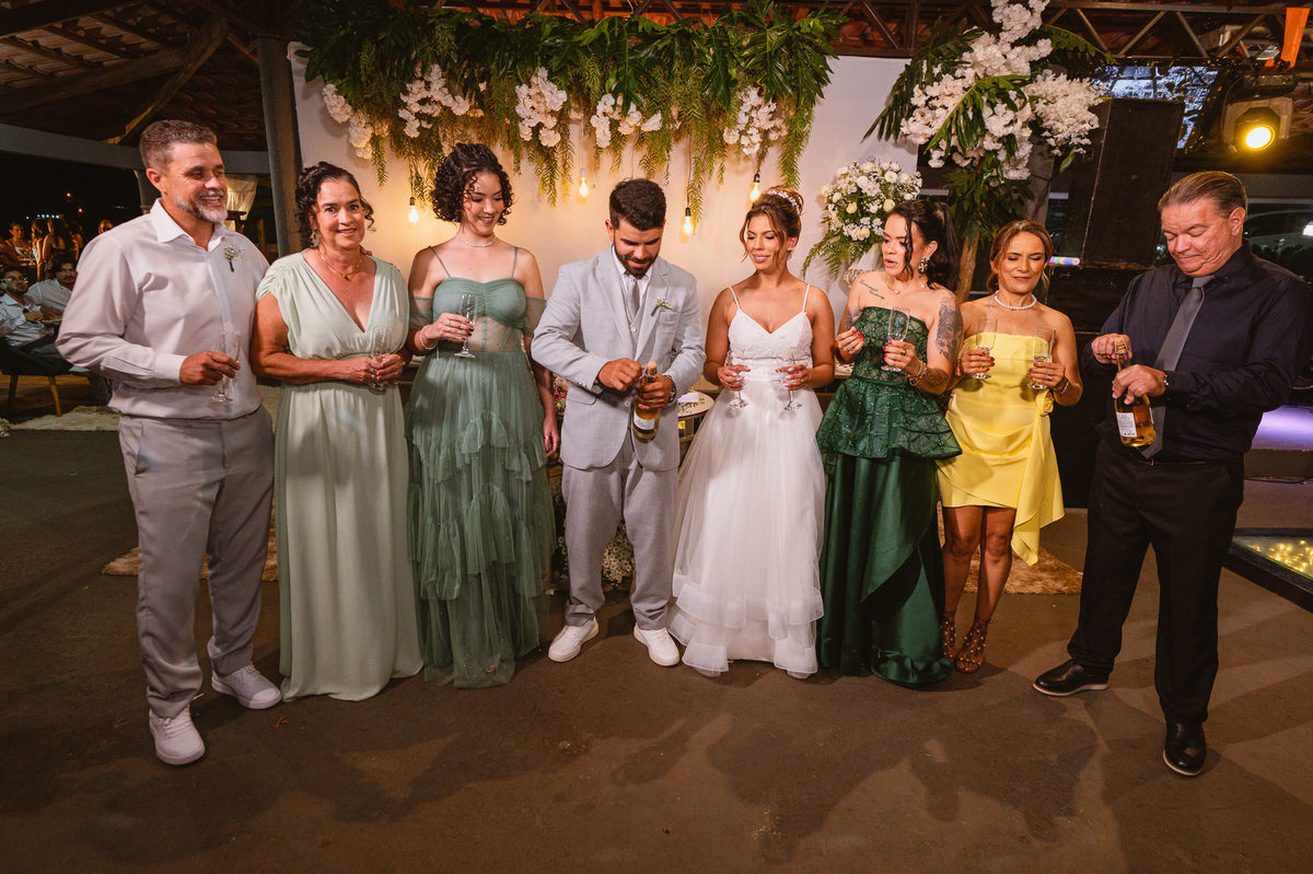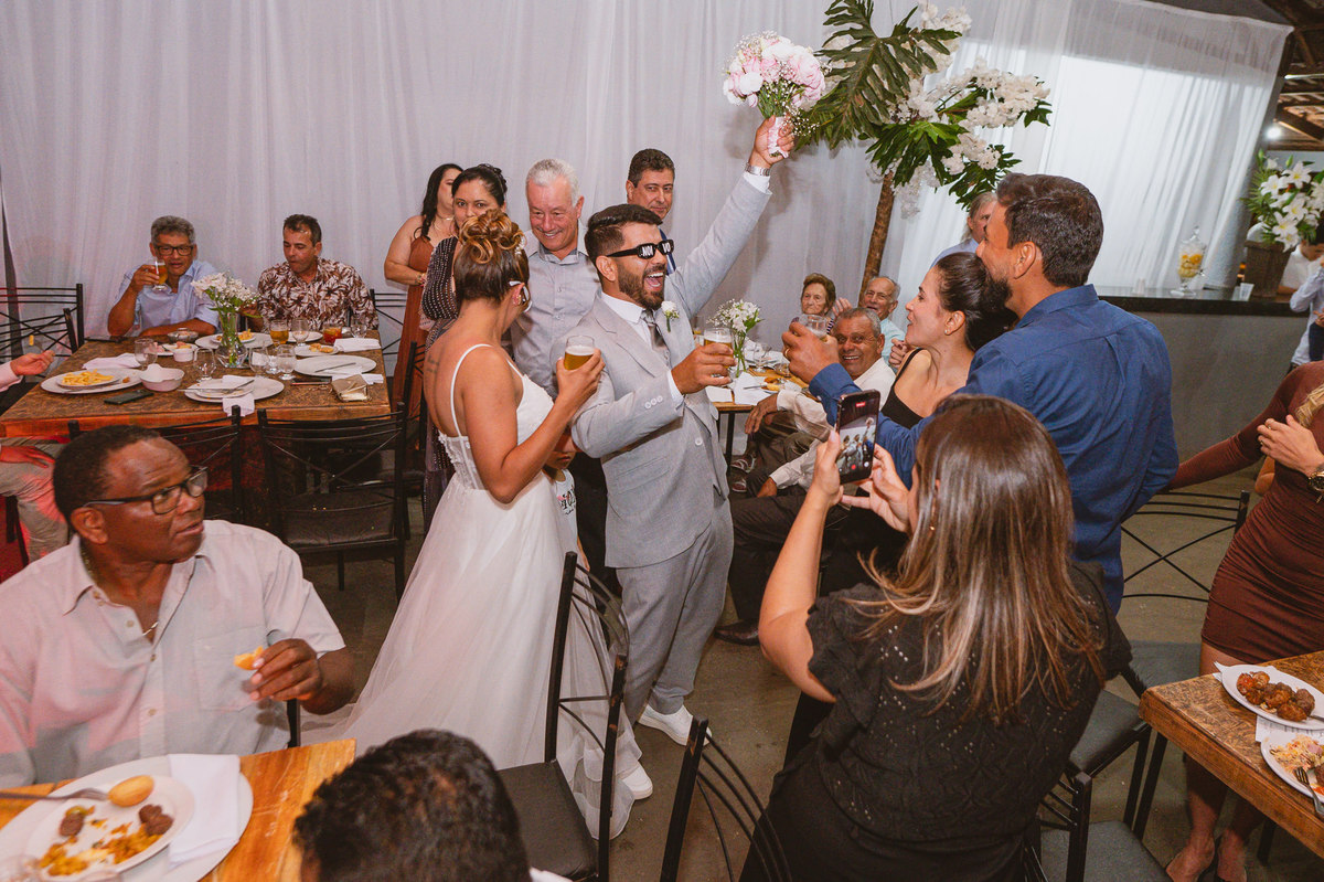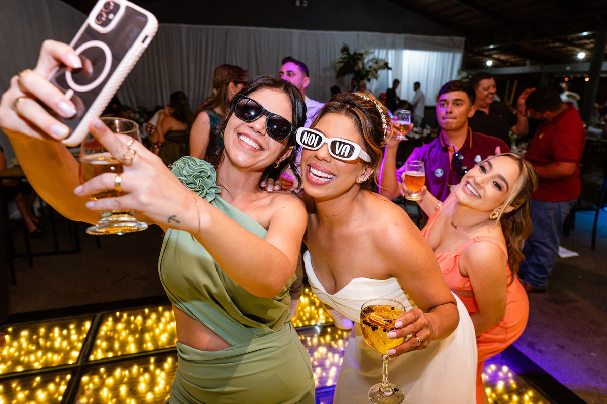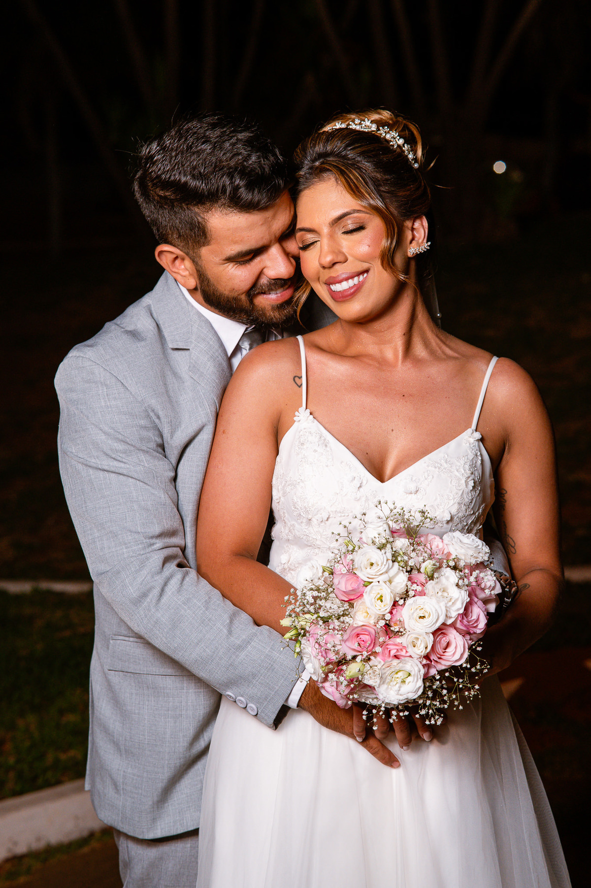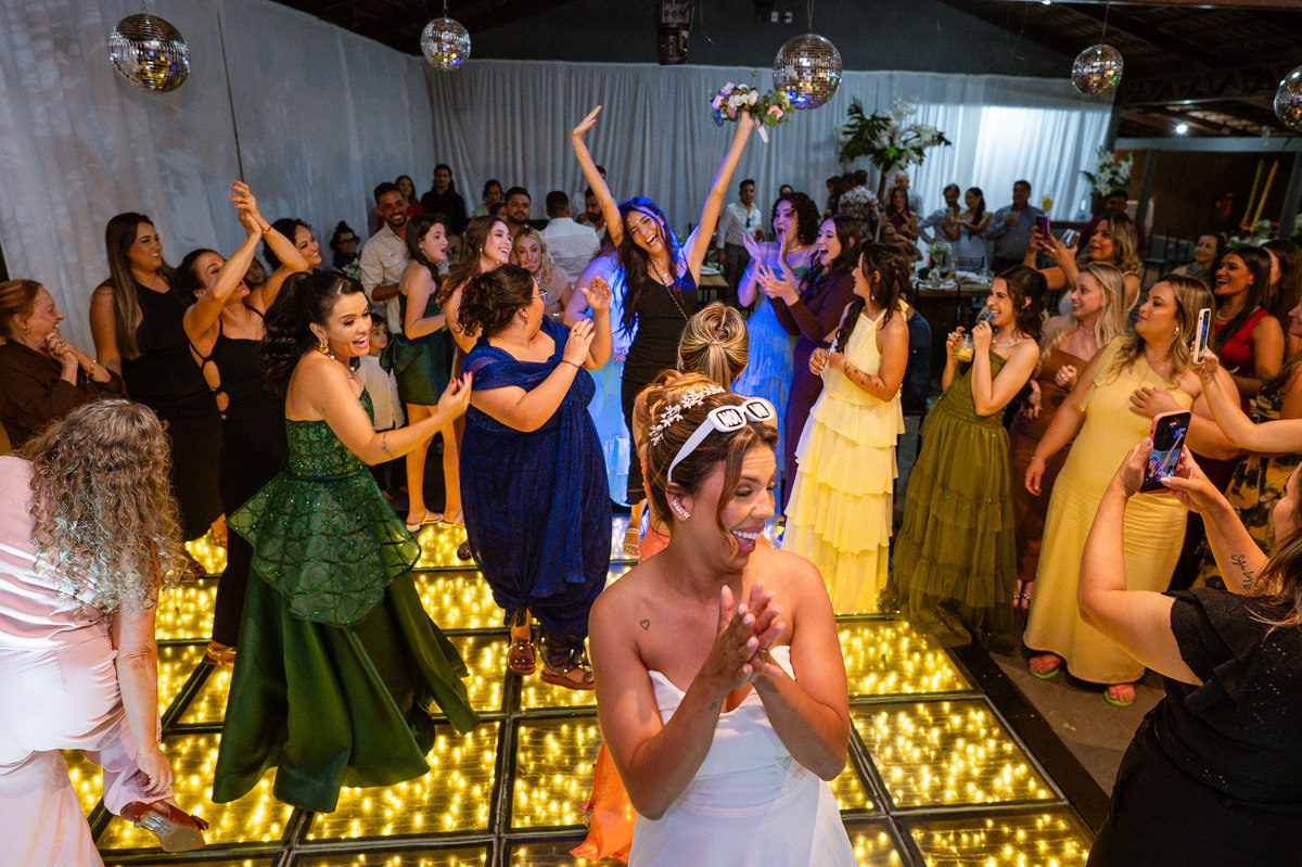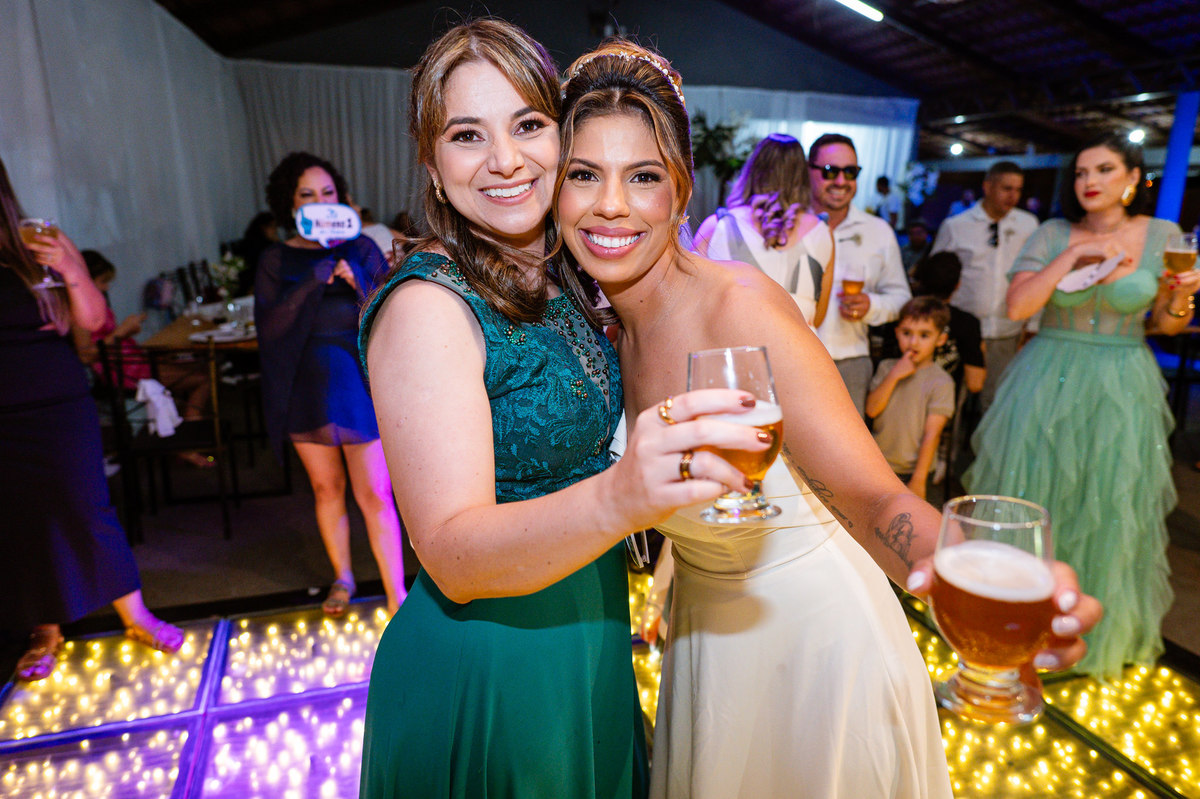 Deixamos os convidados sendo encaminhados para a recepção enquanto aproveitávamos o tempo para fotografar. Fizemos nosso tradicionalíssimo ensaio dos recém-casados. Em poucos minutos, conseguimos fotografias lindas. Terminadas as fotos, partimos pra recepção. Lá chegando, os noivos se alimentaram enquanto os padrinhos foram perfilados na entrada da festa. Com muitos bastões de led nas mãos, óculos personalizados e muito som, eles foram anunciados para adentrar a pista de dança. Passaram pela fila com muita felicidade, curtindo, gritando e comemorando muito com todos seus padrinhos. Já na pista, eles agradeceram os seus convidados e desejaram que curtissem muito aquela noite. Fizemos mais algumas fotografias protocolares na mesa do bolo e dispensamos o noivo, que tratou de ser raptado pelos padrinhos da gravata. Percorremos o salão junto com a noiva que cumprimentou todos os seus convidados. Bheatriz dançou, bebeu, curtiu, dançou e comeu. Aproveitou cada minuto da sua festa. Quando a cantora Aletis Garcia subiu ao palco, trazendo seu sanfoneiro que é prata da casa, todo mundo caiu na dança. Com um repertório vasto e que agradou a todos sem exceção, fez da noiva e até o fotógrafo dançar.