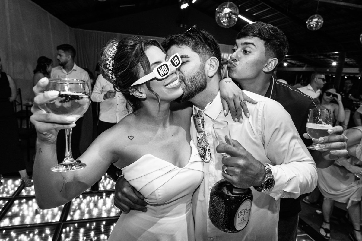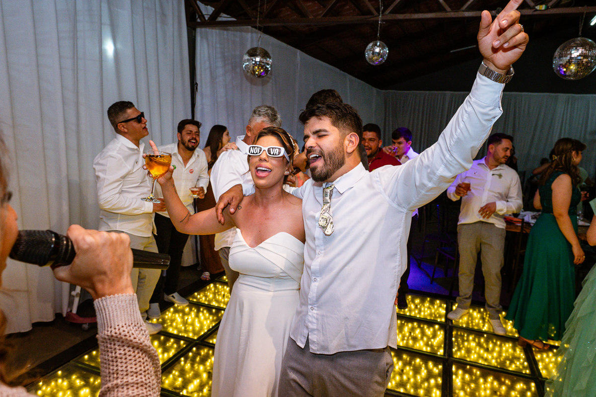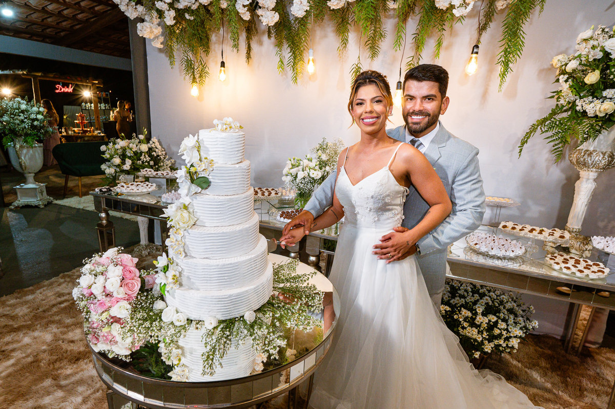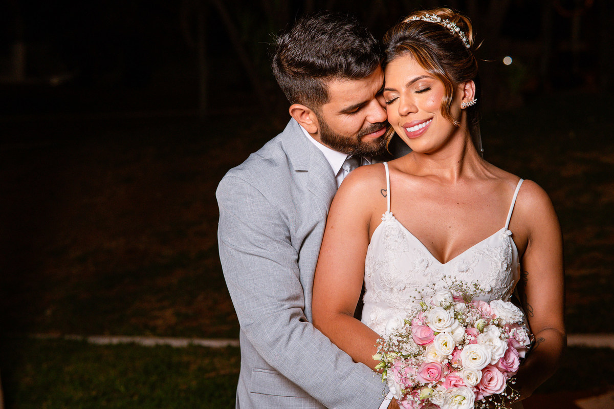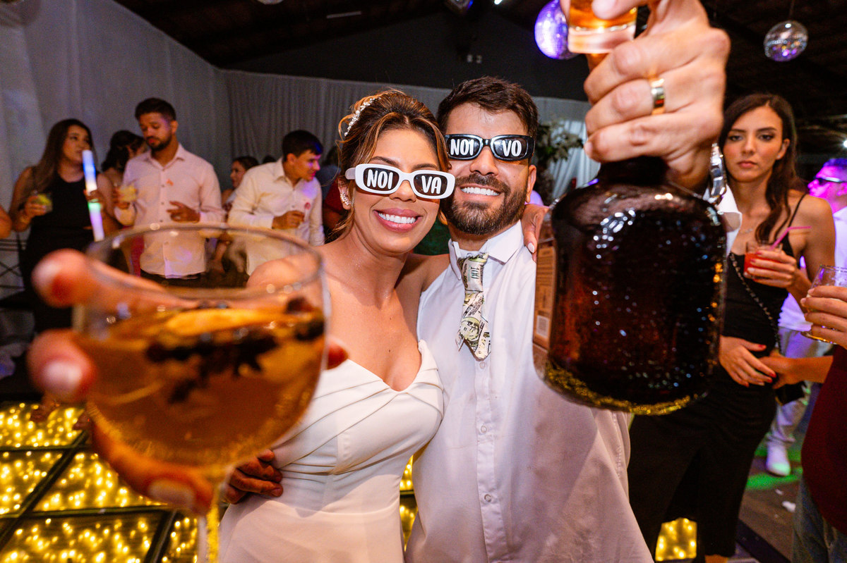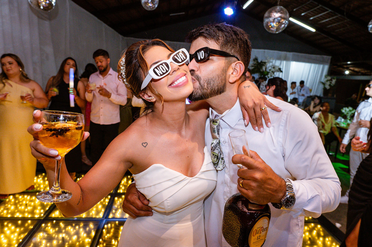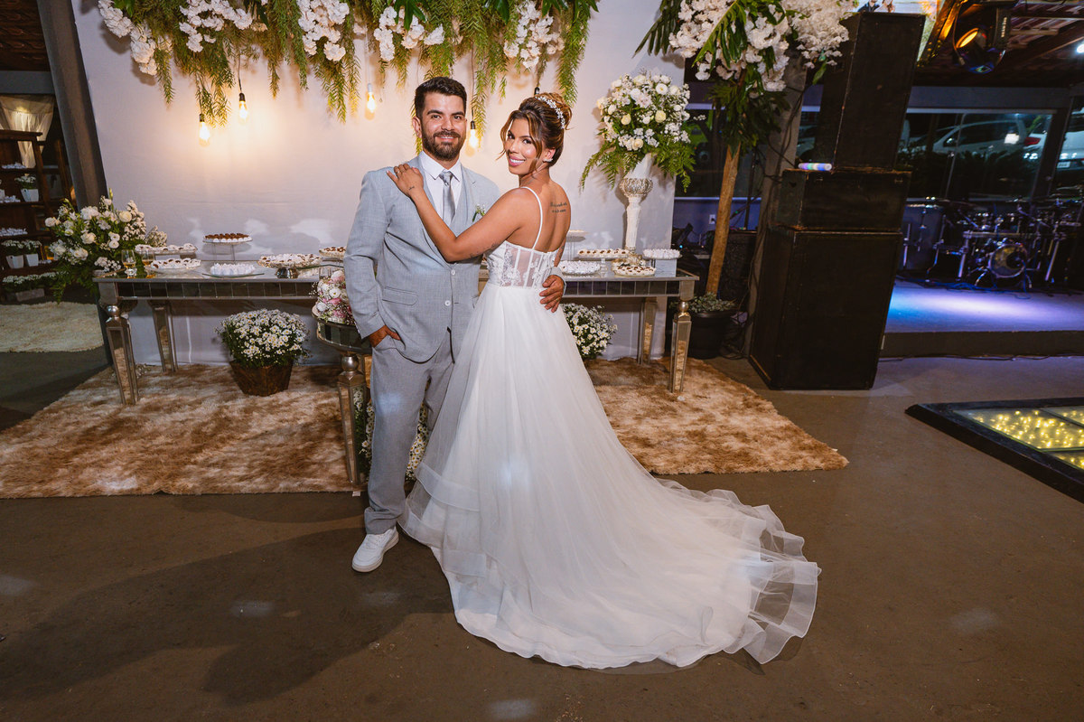 Deixamos os convidados sendo encaminhados para a recepção enquanto aproveitávamos o tempo para fotografar. Fizemos nosso tradicionalíssimo ensaio dos recém-casados. Em poucos minutos, conseguimos fotografias lindas. Terminadas as fotos, partimos pra recepção. Lá chegando, os noivos se alimentaram enquanto os padrinhos foram perfilados na entrada da festa. Com muitos bastões de led nas mãos, óculos personalizados e muito som, eles foram anunciados para adentrar a pista de dança. Passaram pela fila com muita felicidade, curtindo, gritando e comemorando muito com todos seus padrinhos. Já na pista, eles agradeceram os seus convidados e desejaram que curtissem muito aquela noite. Fizemos mais algumas fotografias protocolares na mesa do bolo e dispensamos o noivo, que tratou de ser raptado pelos padrinhos da gravata. Percorremos o salão junto com a noiva que cumprimentou todos os seus convidados. Bheatriz dançou, bebeu, curtiu, dançou e comeu. Aproveitou cada minuto da sua festa. Quando a cantora Aletis Garcia subiu ao palco, trazendo seu sanfoneiro que é prata da casa, todo mundo caiu na dança. Com um repertório vasto e que agradou a todos sem exceção, fez da noiva e até o fotógrafo dançar.