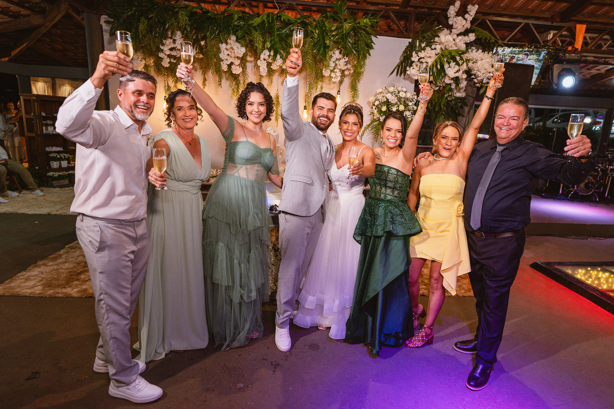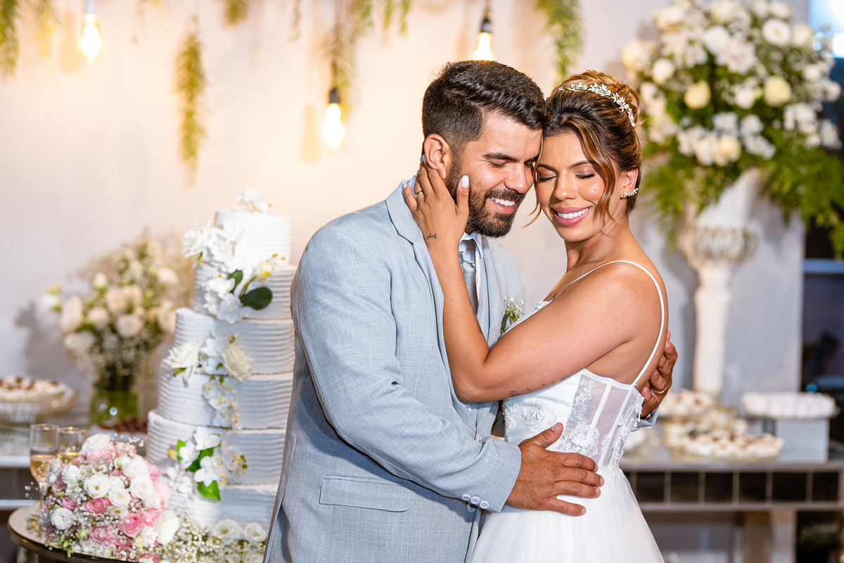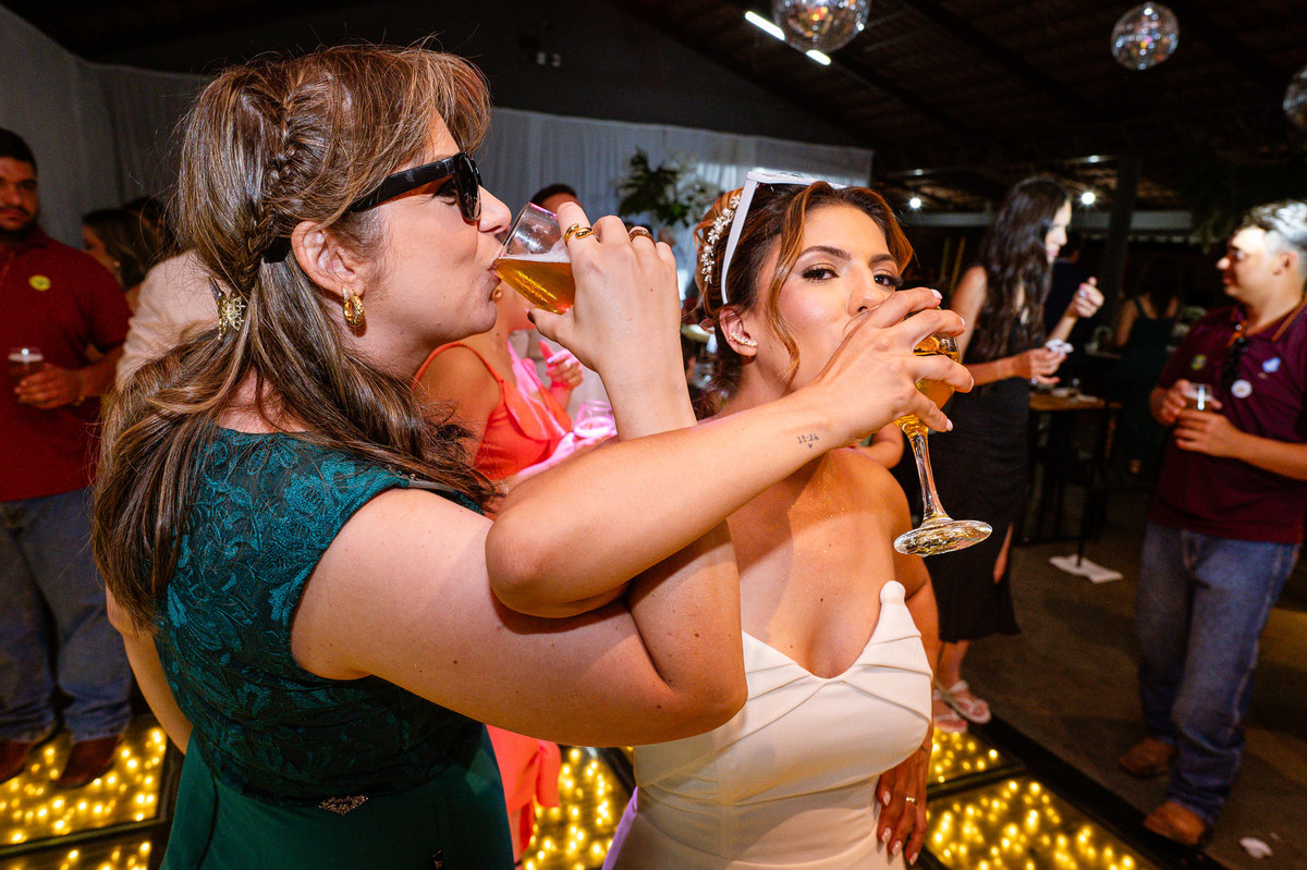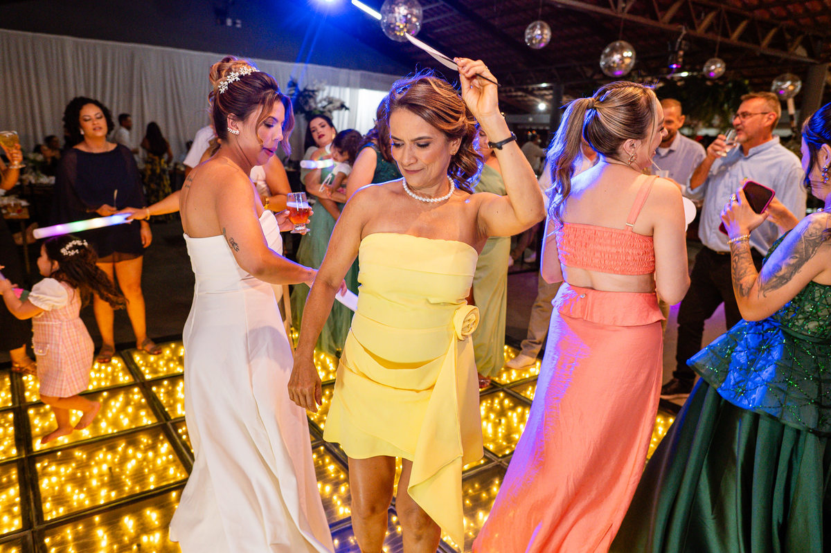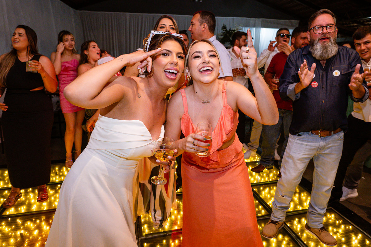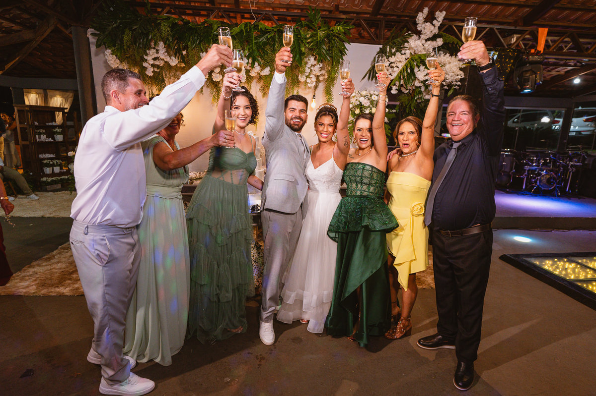 Deixamos os convidados sendo encaminhados para a recepção enquanto aproveitávamos o tempo para fotografar. Fizemos nosso tradicionalíssimo ensaio dos recém-casados. Em poucos minutos, conseguimos fotografias lindas. Terminadas as fotos, partimos pra recepção. Lá chegando, os noivos se alimentaram enquanto os padrinhos foram perfilados na entrada da festa. Com muitos bastões de led nas mãos, óculos personalizados e muito som, eles foram anunciados para adentrar a pista de dança. Passaram pela fila com muita felicidade, curtindo, gritando e comemorando muito com todos seus padrinhos. Já na pista, eles agradeceram os seus convidados e desejaram que curtissem muito aquela noite. Fizemos mais algumas fotografias protocolares na mesa do bolo e dispensamos o noivo, que tratou de ser raptado pelos padrinhos da gravata. Percorremos o salão junto com a noiva que cumprimentou todos os seus convidados. Bheatriz dançou, bebeu, curtiu, dançou e comeu. Aproveitou cada minuto da sua festa. Quando a cantora Aletis Garcia subiu ao palco, trazendo seu sanfoneiro que é prata da casa, todo mundo caiu na dança. Com um repertório vasto e que agradou a todos sem exceção, fez da noiva e até o fotógrafo dançar.