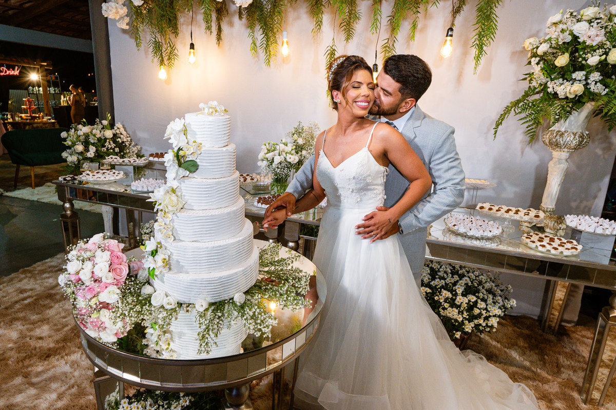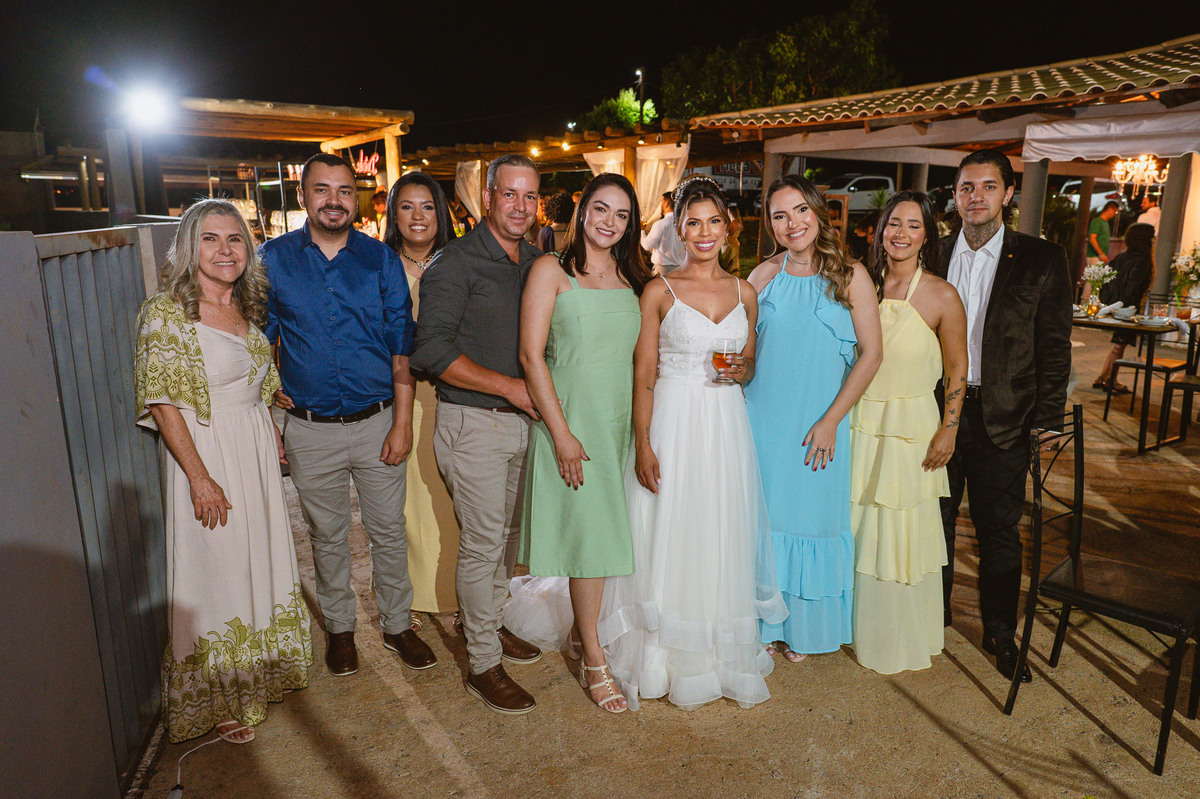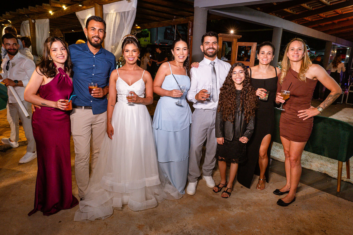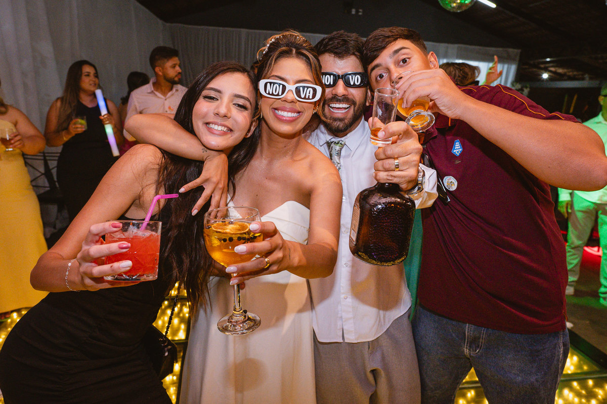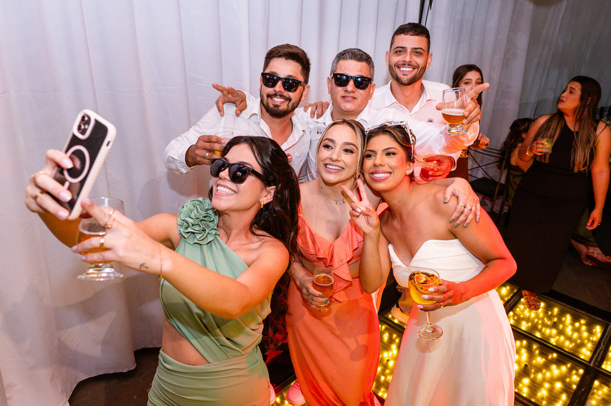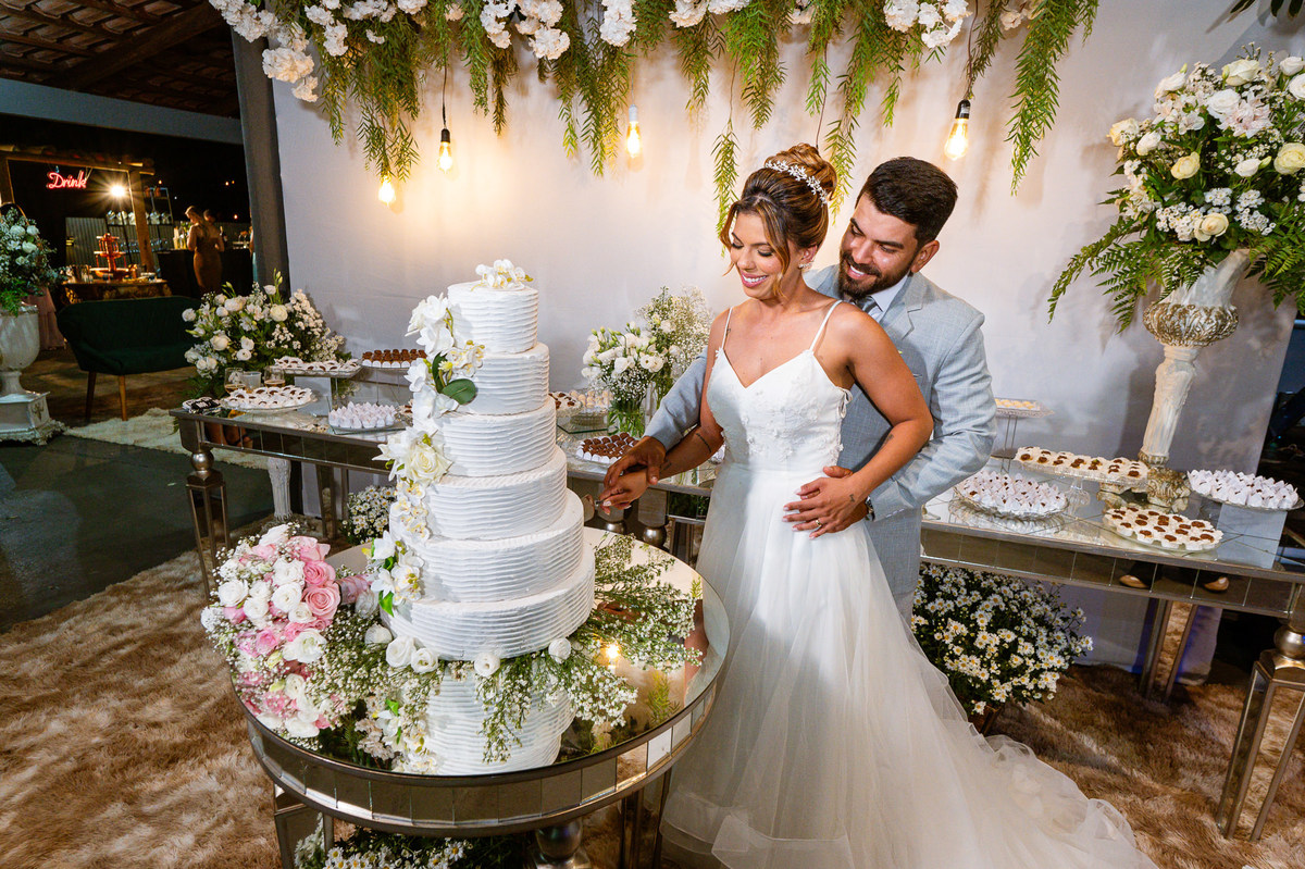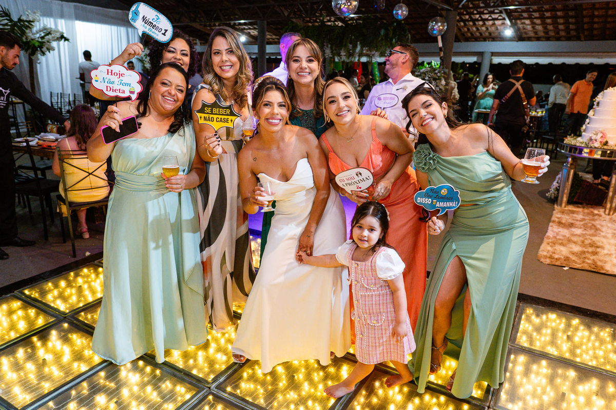 Deixamos os convidados sendo encaminhados para a recepção enquanto aproveitávamos o tempo para fotografar. Fizemos nosso tradicionalíssimo ensaio dos recém-casados. Em poucos minutos, conseguimos fotografias lindas. Terminadas as fotos, partimos pra recepção. Lá chegando, os noivos se alimentaram enquanto os padrinhos foram perfilados na entrada da festa. Com muitos bastões de led nas mãos, óculos personalizados e muito som, eles foram anunciados para adentrar a pista de dança. Passaram pela fila com muita felicidade, curtindo, gritando e comemorando muito com todos seus padrinhos. Já na pista, eles agradeceram os seus convidados e desejaram que curtissem muito aquela noite. Fizemos mais algumas fotografias protocolares na mesa do bolo e dispensamos o noivo, que tratou de ser raptado pelos padrinhos da gravata. Percorremos o salão junto com a noiva que cumprimentou todos os seus convidados. Bheatriz dançou, bebeu, curtiu, dançou e comeu. Aproveitou cada minuto da sua festa. Quando a cantora Aletis Garcia subiu ao palco, trazendo seu sanfoneiro que é prata da casa, todo mundo caiu na dança. Com um repertório vasto e que agradou a todos sem exceção, fez da noiva e até o fotógrafo dançar.