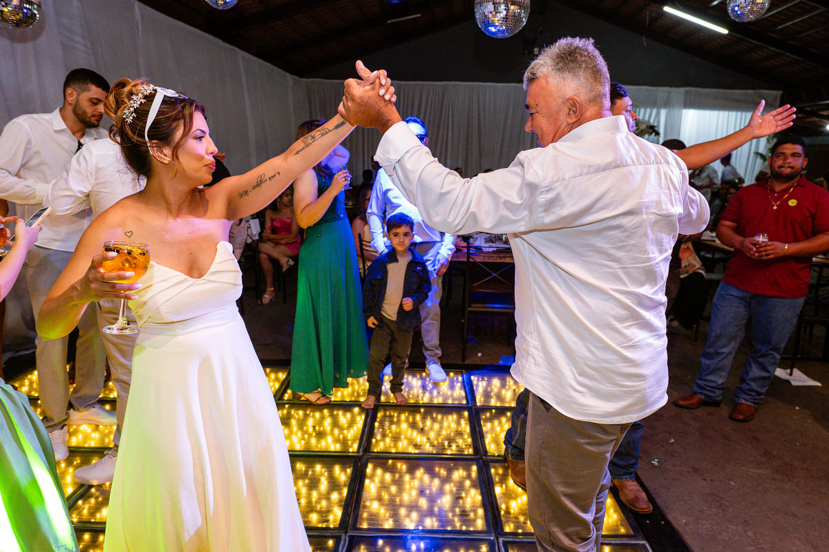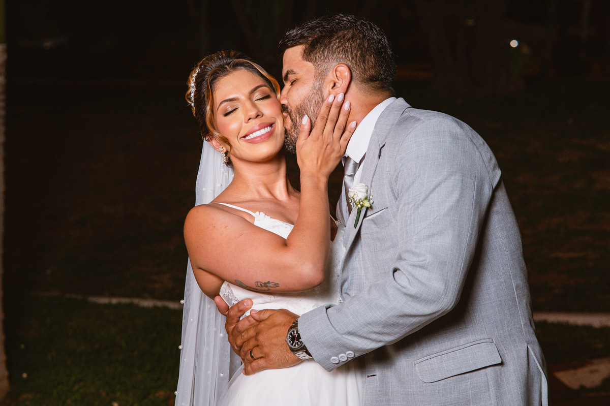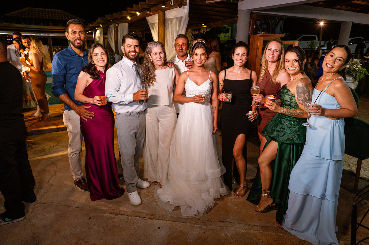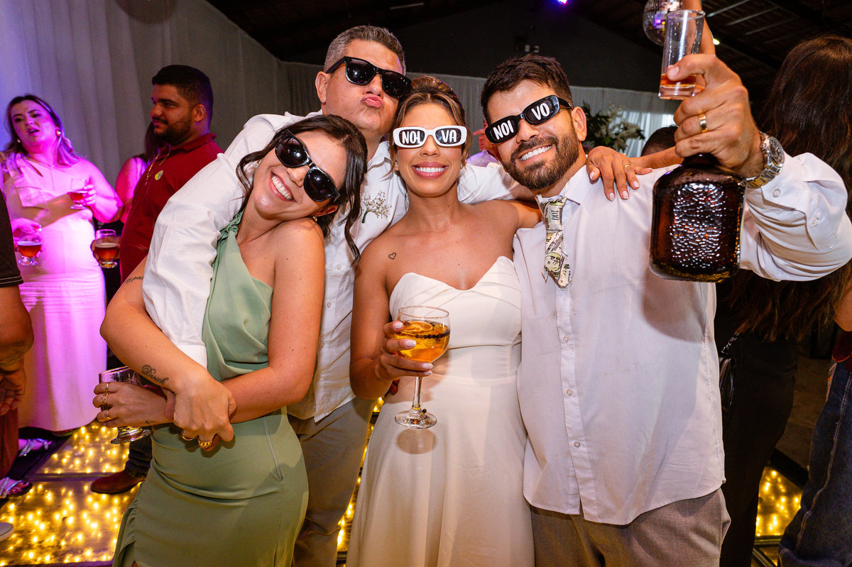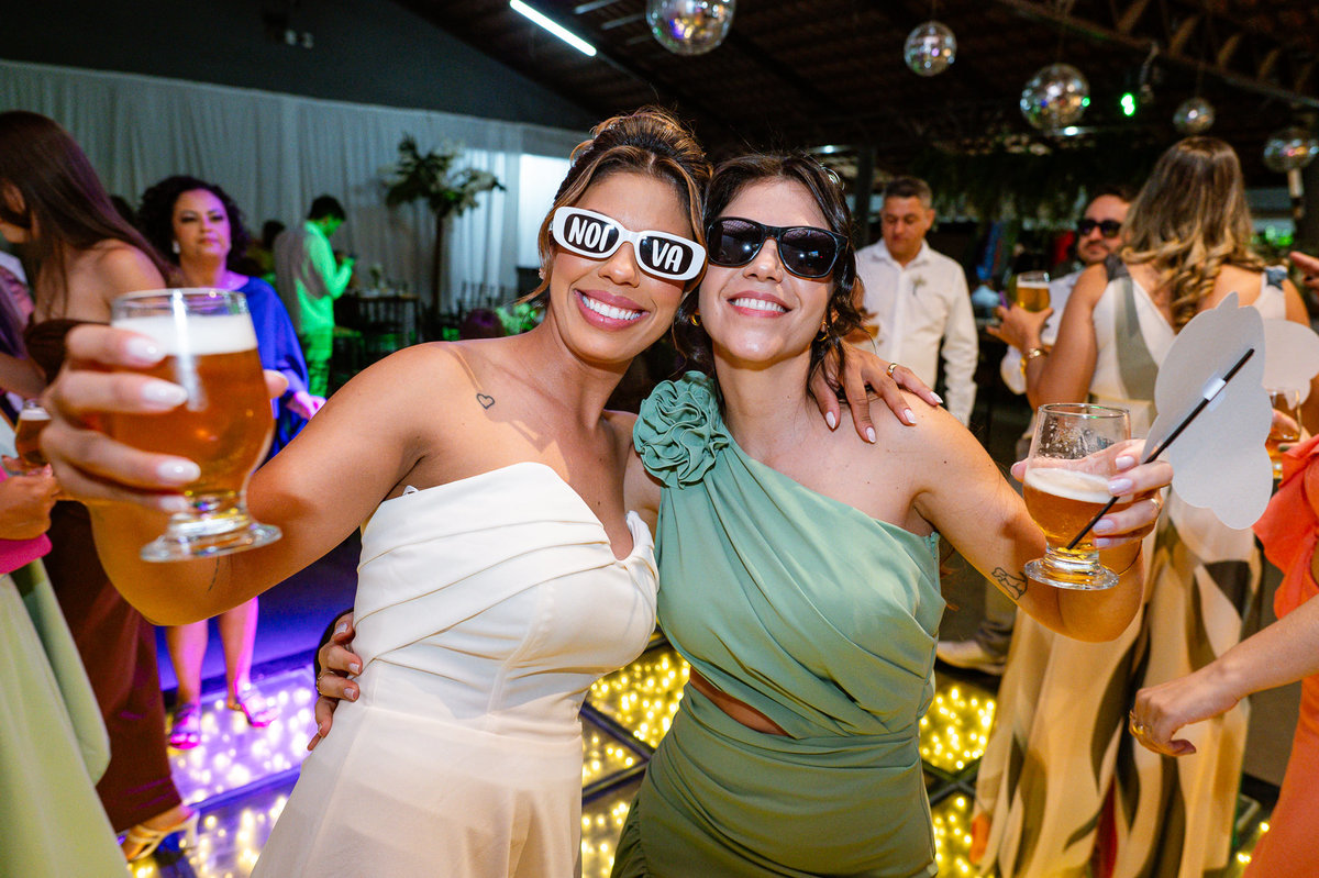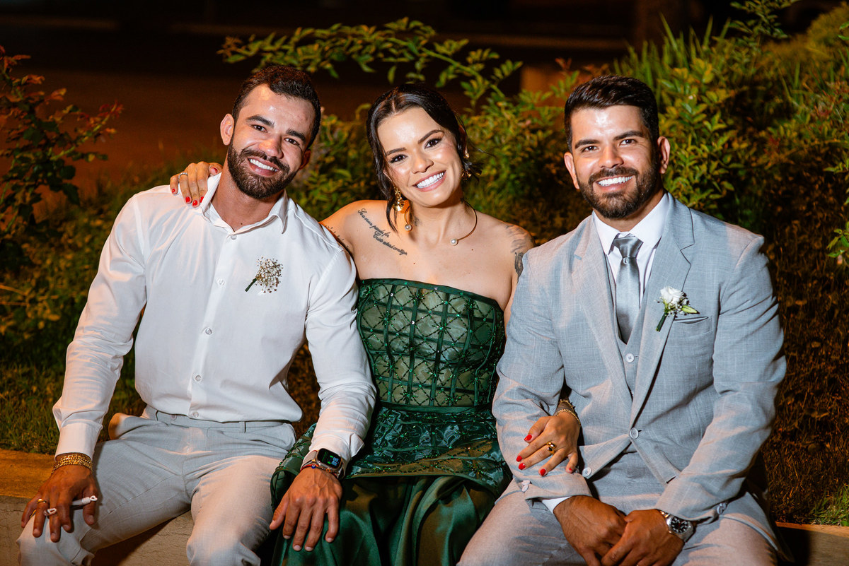 Deixamos os convidados sendo encaminhados para a recepção enquanto aproveitávamos o tempo para fotografar. Fizemos nosso tradicionalíssimo ensaio dos recém-casados. Em poucos minutos, conseguimos fotografias lindas. Terminadas as fotos, partimos pra recepção. Lá chegando, os noivos se alimentaram enquanto os padrinhos foram perfilados na entrada da festa. Com muitos bastões de led nas mãos, óculos personalizados e muito som, eles foram anunciados para adentrar a pista de dança. Passaram pela fila com muita felicidade, curtindo, gritando e comemorando muito com todos seus padrinhos. Já na pista, eles agradeceram os seus convidados e desejaram que curtissem muito aquela noite. Fizemos mais algumas fotografias protocolares na mesa do bolo e dispensamos o noivo, que tratou de ser raptado pelos padrinhos da gravata. Percorremos o salão junto com a noiva que cumprimentou todos os seus convidados. Bheatriz dançou, bebeu, curtiu, dançou e comeu. Aproveitou cada minuto da sua festa. Quando a cantora Aletis Garcia subiu ao palco, trazendo seu sanfoneiro que é prata da casa, todo mundo caiu na dança. Com um repertório vasto e que agradou a todos sem exceção, fez da noiva e até o fotógrafo dançar.