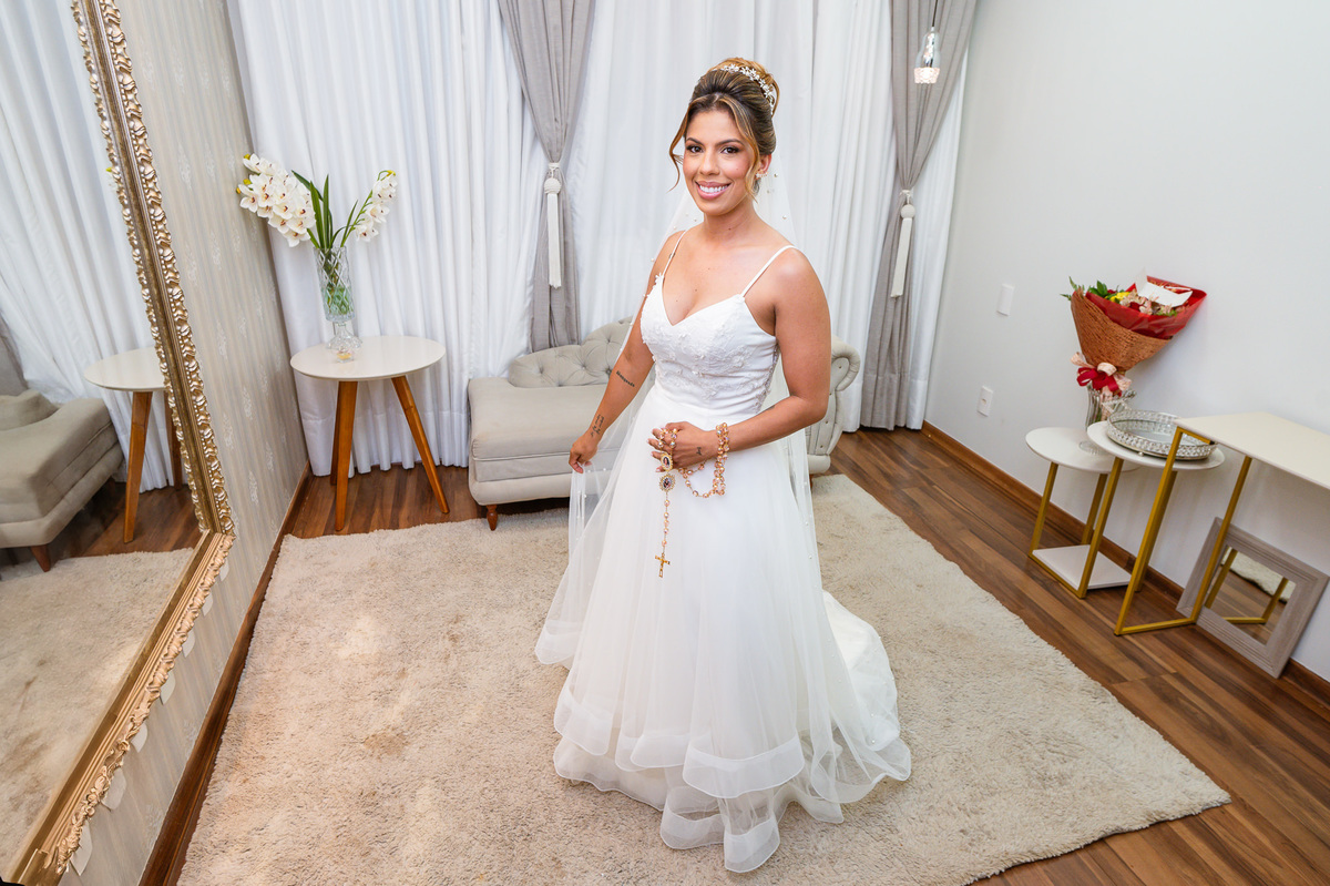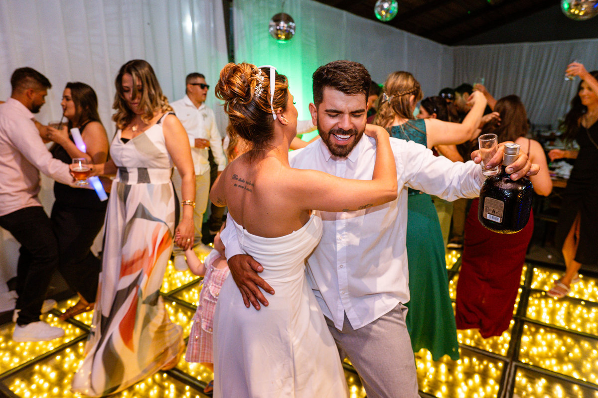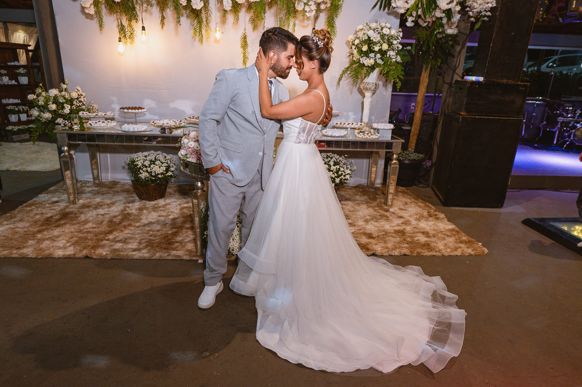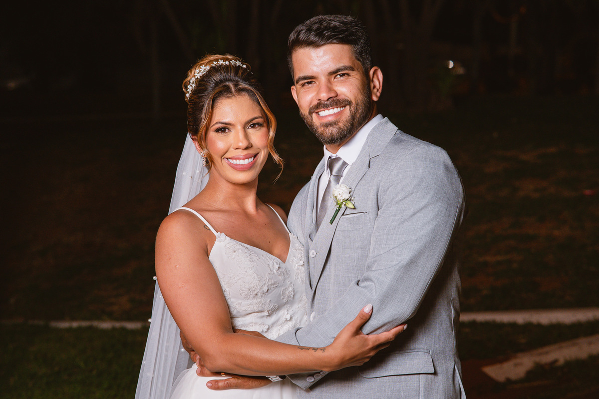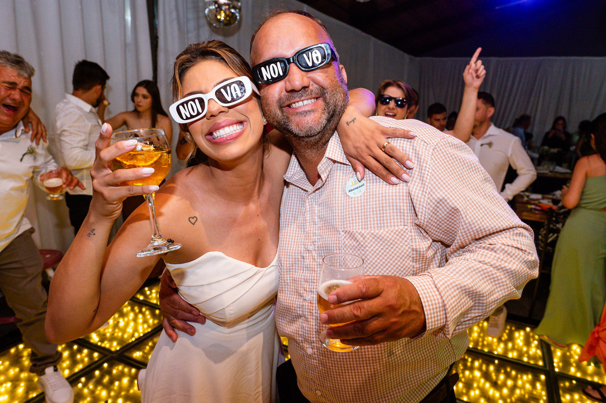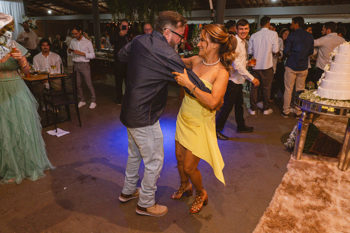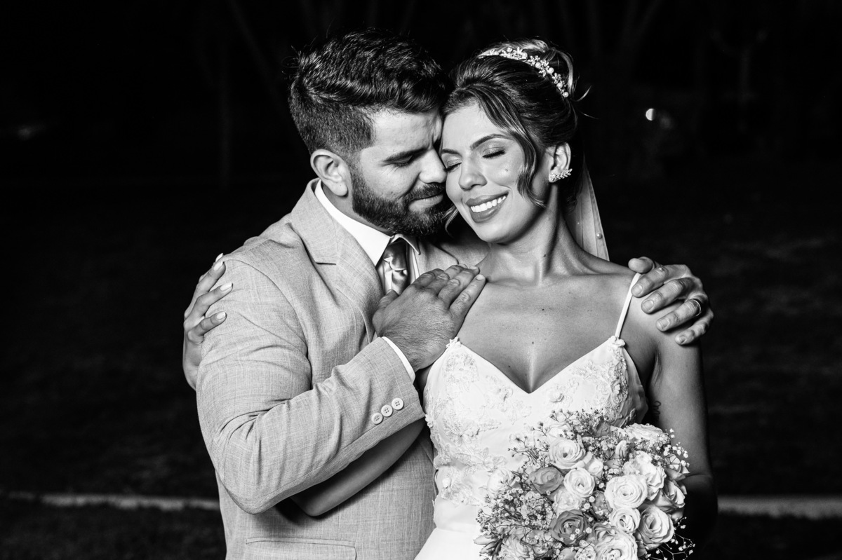 Deixamos os convidados sendo encaminhados para a recepção enquanto aproveitávamos o tempo para fotografar. Fizemos nosso tradicionalíssimo ensaio dos recém-casados. Em poucos minutos, conseguimos fotografias lindas. Terminadas as fotos, partimos pra recepção. Lá chegando, os noivos se alimentaram enquanto os padrinhos foram perfilados na entrada da festa. Com muitos bastões de led nas mãos, óculos personalizados e muito som, eles foram anunciados para adentrar a pista de dança. Passaram pela fila com muita felicidade, curtindo, gritando e comemorando muito com todos seus padrinhos. Já na pista, eles agradeceram os seus convidados e desejaram que curtissem muito aquela noite. Fizemos mais algumas fotografias protocolares na mesa do bolo e dispensamos o noivo, que tratou de ser raptado pelos padrinhos da gravata. Percorremos o salão junto com a noiva que cumprimentou todos os seus convidados. Bheatriz dançou, bebeu, curtiu, dançou e comeu. Aproveitou cada minuto da sua festa. Quando a cantora Aletis Garcia subiu ao palco, trazendo seu sanfoneiro que é prata da casa, todo mundo caiu na dança. Com um repertório vasto e que agradou a todos sem exceção, fez da noiva e até o fotógrafo dançar.