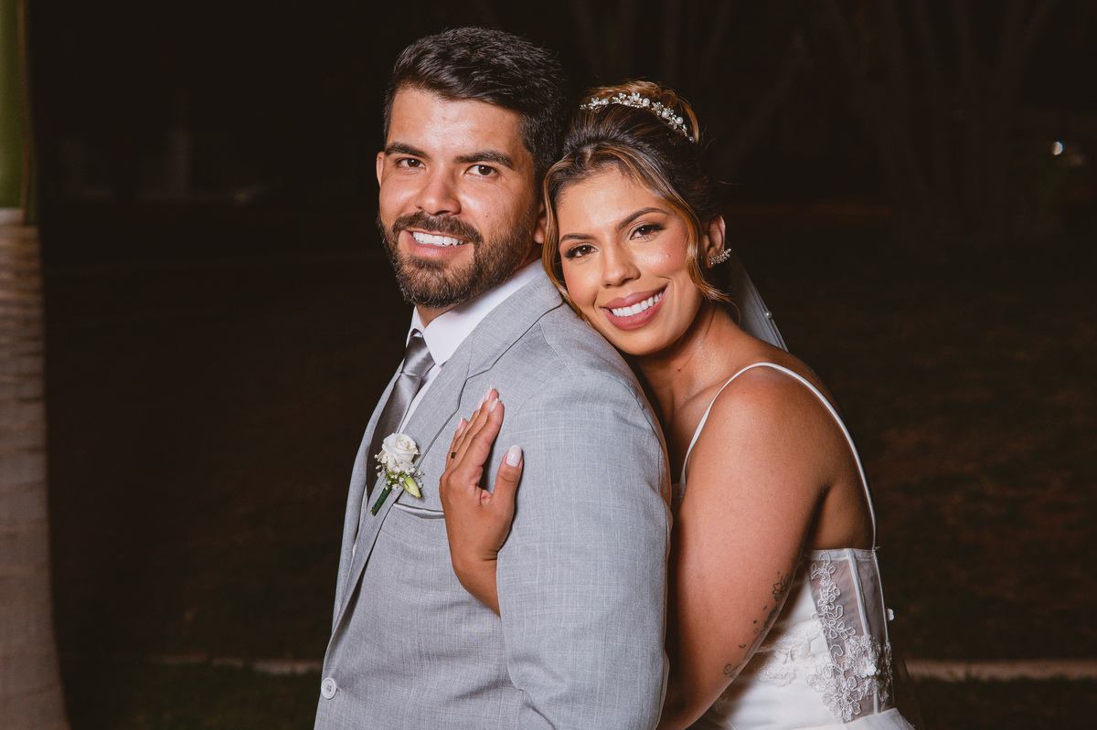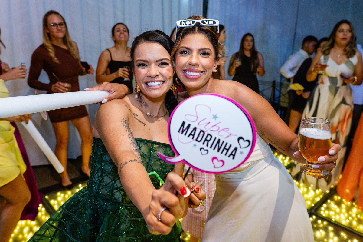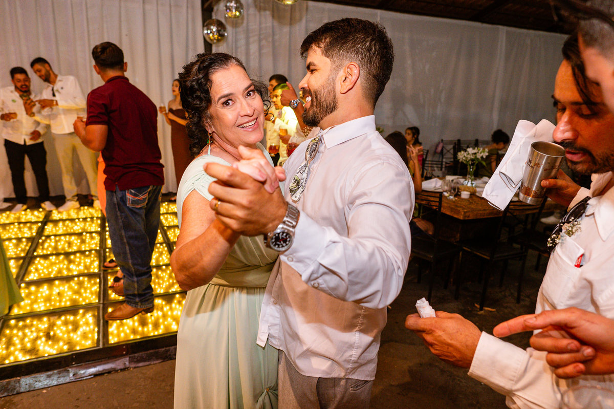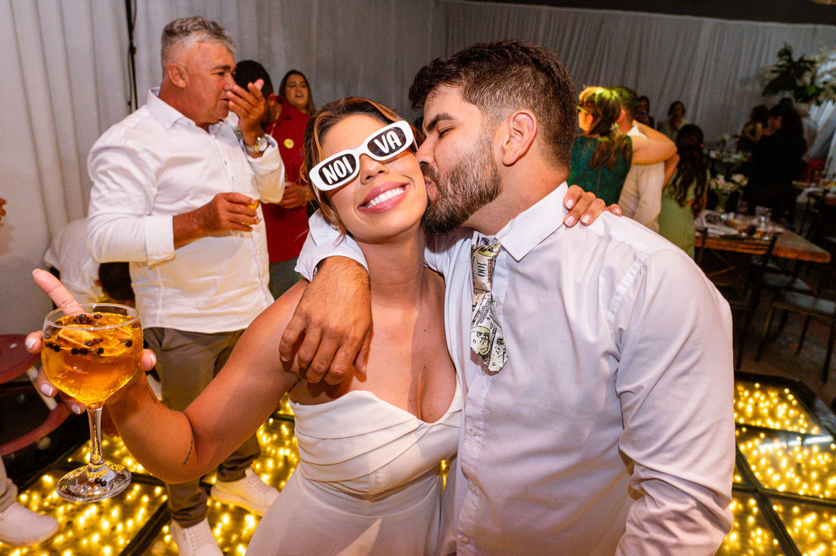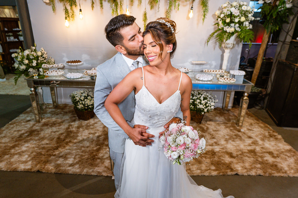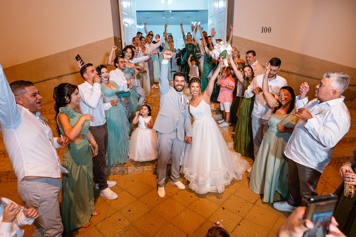 Deixamos os convidados sendo encaminhados para a recepção enquanto aproveitávamos o tempo para fotografar. Fizemos nosso tradicionalíssimo ensaio dos recém-casados. Em poucos minutos, conseguimos fotografias lindas. Terminadas as fotos, partimos pra recepção. Lá chegando, os noivos se alimentaram enquanto os padrinhos foram perfilados na entrada da festa. Com muitos bastões de led nas mãos, óculos personalizados e muito som, eles foram anunciados para adentrar a pista de dança. Passaram pela fila com muita felicidade, curtindo, gritando e comemorando muito com todos seus padrinhos. Já na pista, eles agradeceram os seus convidados e desejaram que curtissem muito aquela noite. Fizemos mais algumas fotografias protocolares na mesa do bolo e dispensamos o noivo, que tratou de ser raptado pelos padrinhos da gravata. Percorremos o salão junto com a noiva que cumprimentou todos os seus convidados. Bheatriz dançou, bebeu, curtiu, dançou e comeu. Aproveitou cada minuto da sua festa. Quando a cantora Aletis Garcia subiu ao palco, trazendo seu sanfoneiro que é prata da casa, todo mundo caiu na dança. Com um repertório vasto e que agradou a todos sem exceção, fez da noiva e até o fotógrafo dançar.
