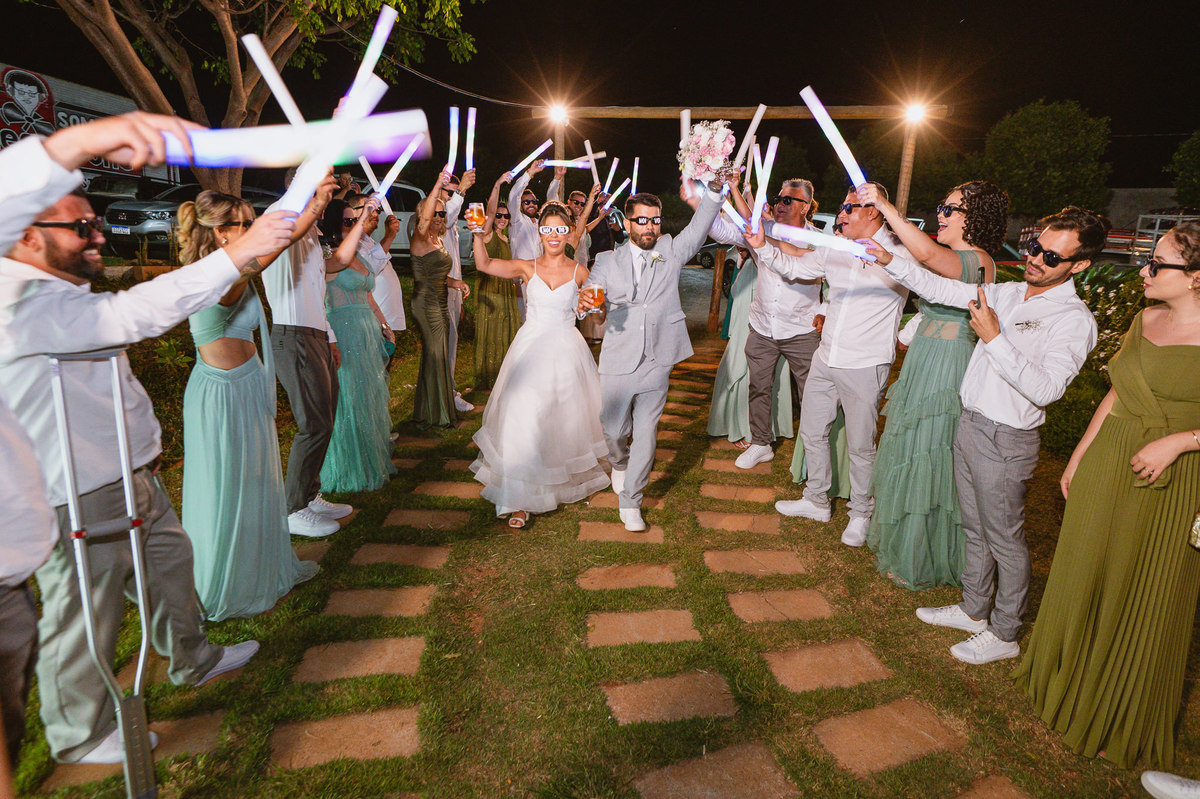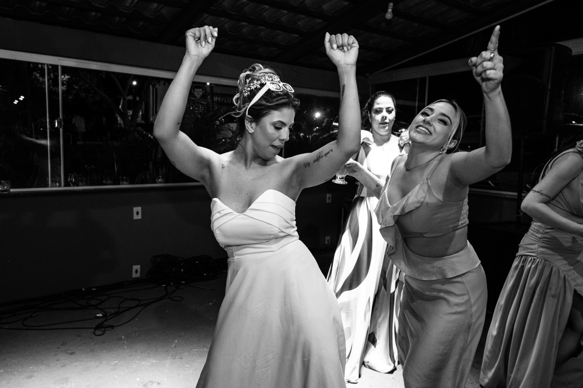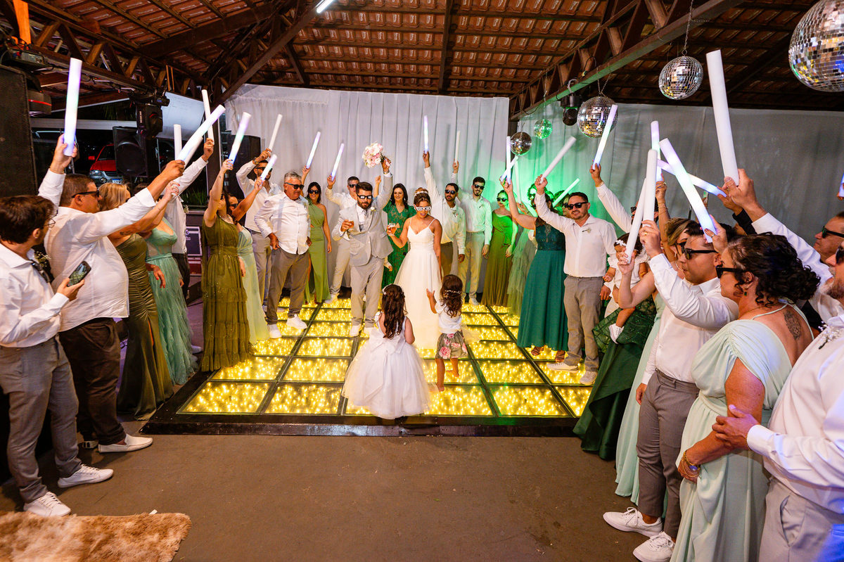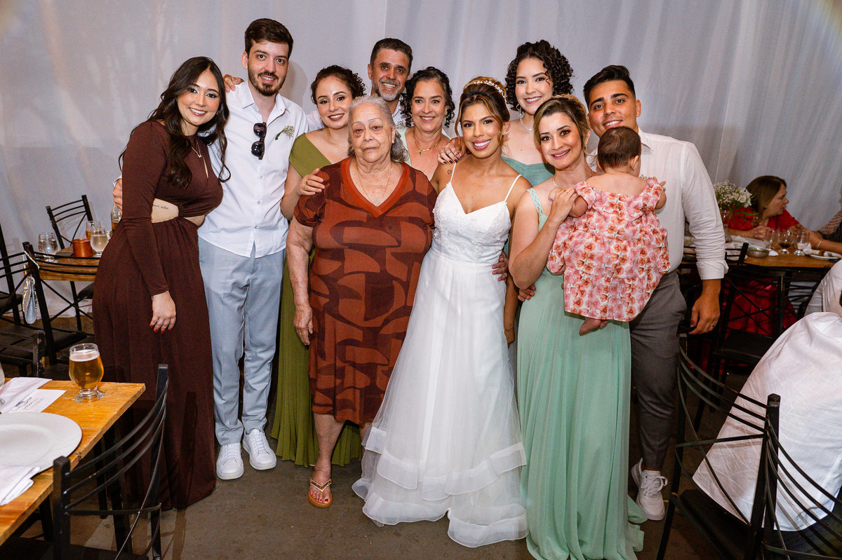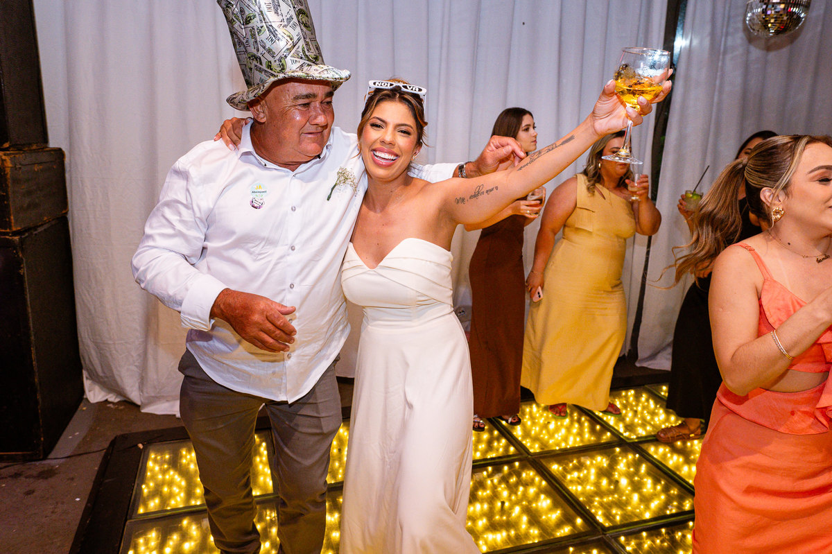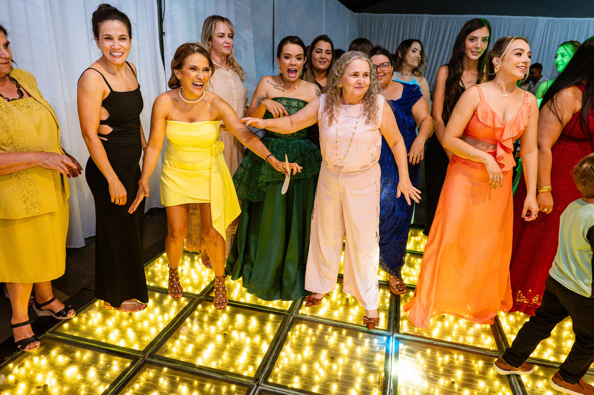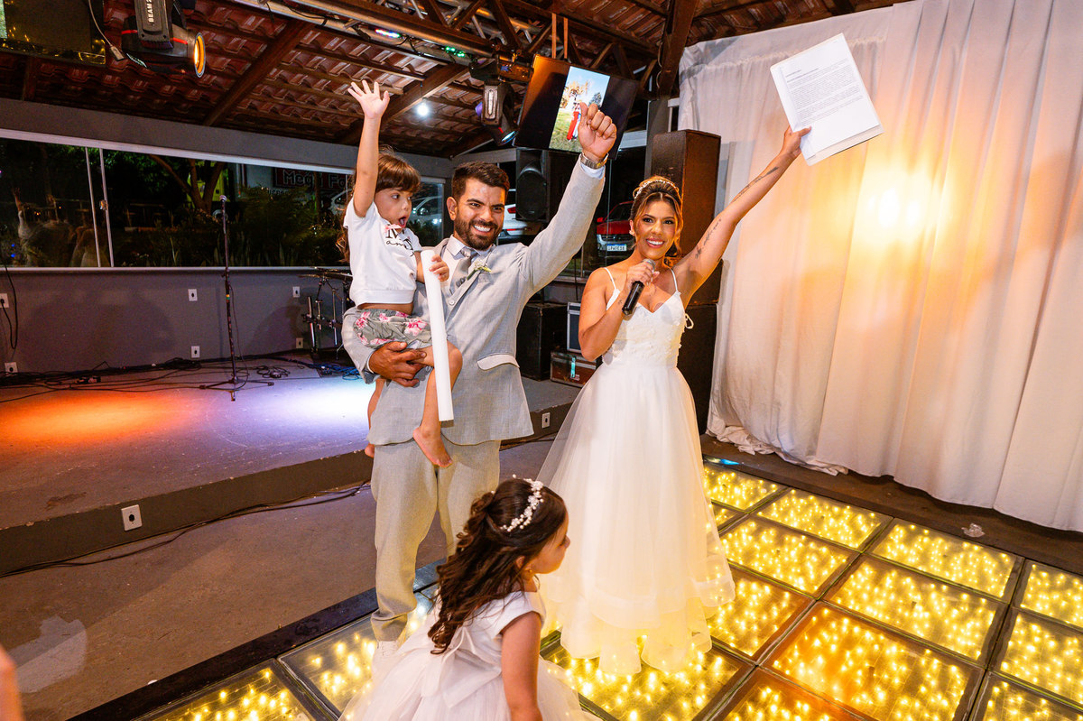 Deixamos os convidados sendo encaminhados para a recepção enquanto aproveitávamos o tempo para fotografar. Fizemos nosso tradicionalíssimo ensaio dos recém-casados. Em poucos minutos, conseguimos fotografias lindas. Terminadas as fotos, partimos pra recepção. Lá chegando, os noivos se alimentaram enquanto os padrinhos foram perfilados na entrada da festa. Com muitos bastões de led nas mãos, óculos personalizados e muito som, eles foram anunciados para adentrar a pista de dança. Passaram pela fila com muita felicidade, curtindo, gritando e comemorando muito com todos seus padrinhos. Já na pista, eles agradeceram os seus convidados e desejaram que curtissem muito aquela noite. Fizemos mais algumas fotografias protocolares na mesa do bolo e dispensamos o noivo, que tratou de ser raptado pelos padrinhos da gravata. Percorremos o salão junto com a noiva que cumprimentou todos os seus convidados. Bheatriz dançou, bebeu, curtiu, dançou e comeu. Aproveitou cada minuto da sua festa. Quando a cantora Aletis Garcia subiu ao palco, trazendo seu sanfoneiro que é prata da casa, todo mundo caiu na dança. Com um repertório vasto e que agradou a todos sem exceção, fez da noiva e até o fotógrafo dançar.
