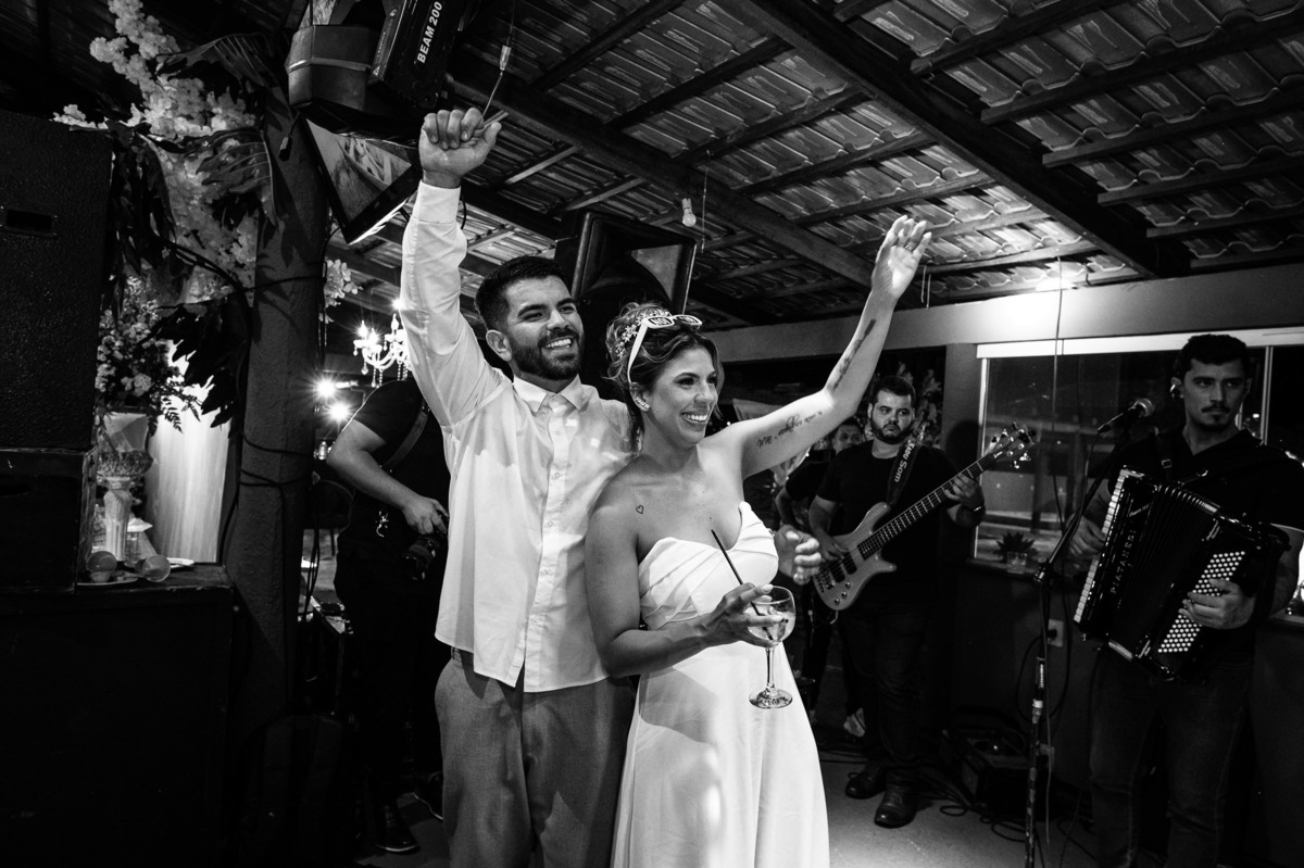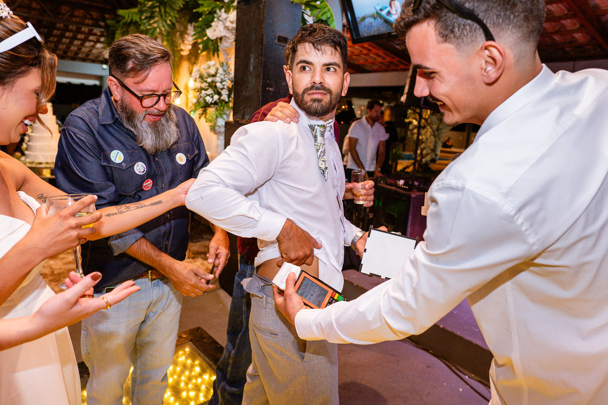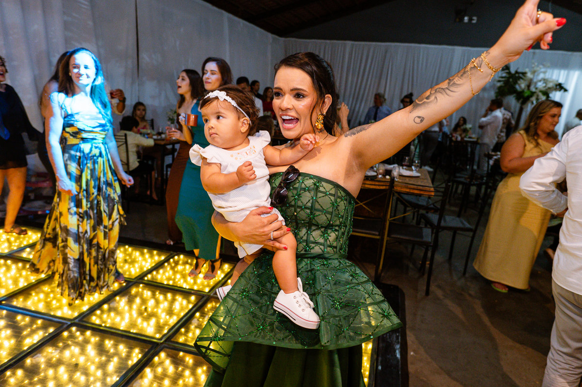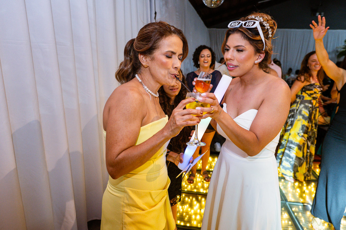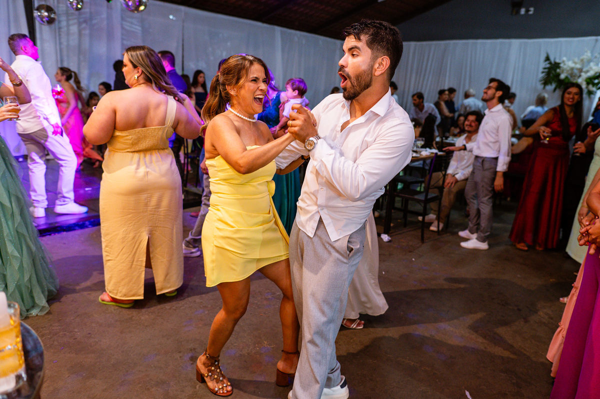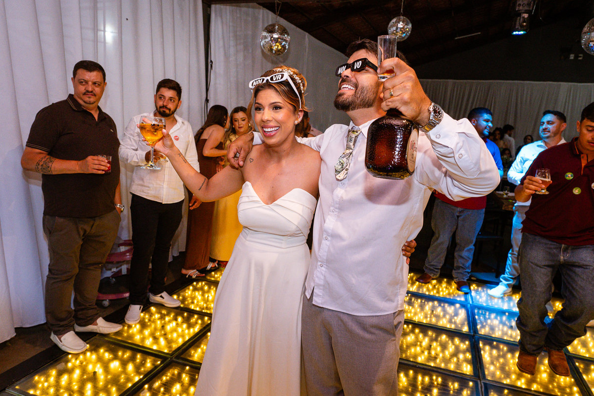 Deixamos os convidados sendo encaminhados para a recepção enquanto aproveitávamos o tempo para fotografar. Fizemos nosso tradicionalíssimo ensaio dos recém-casados. Em poucos minutos, conseguimos fotografias lindas. Terminadas as fotos, partimos pra recepção. Lá chegando, os noivos se alimentaram enquanto os padrinhos foram perfilados na entrada da festa. Com muitos bastões de led nas mãos, óculos personalizados e muito som, eles foram anunciados para adentrar a pista de dança. Passaram pela fila com muita felicidade, curtindo, gritando e comemorando muito com todos seus padrinhos. Já na pista, eles agradeceram os seus convidados e desejaram que curtissem muito aquela noite. Fizemos mais algumas fotografias protocolares na mesa do bolo e dispensamos o noivo, que tratou de ser raptado pelos padrinhos da gravata. Percorremos o salão junto com a noiva que cumprimentou todos os seus convidados. Bheatriz dançou, bebeu, curtiu, dançou e comeu. Aproveitou cada minuto da sua festa. Quando a cantora Aletis Garcia subiu ao palco, trazendo seu sanfoneiro que é prata da casa, todo mundo caiu na dança. Com um repertório vasto e que agradou a todos sem exceção, fez da noiva e até o fotógrafo dançar.