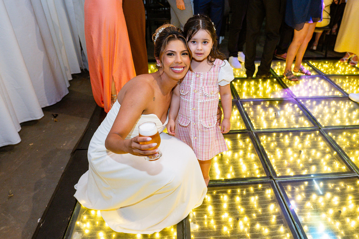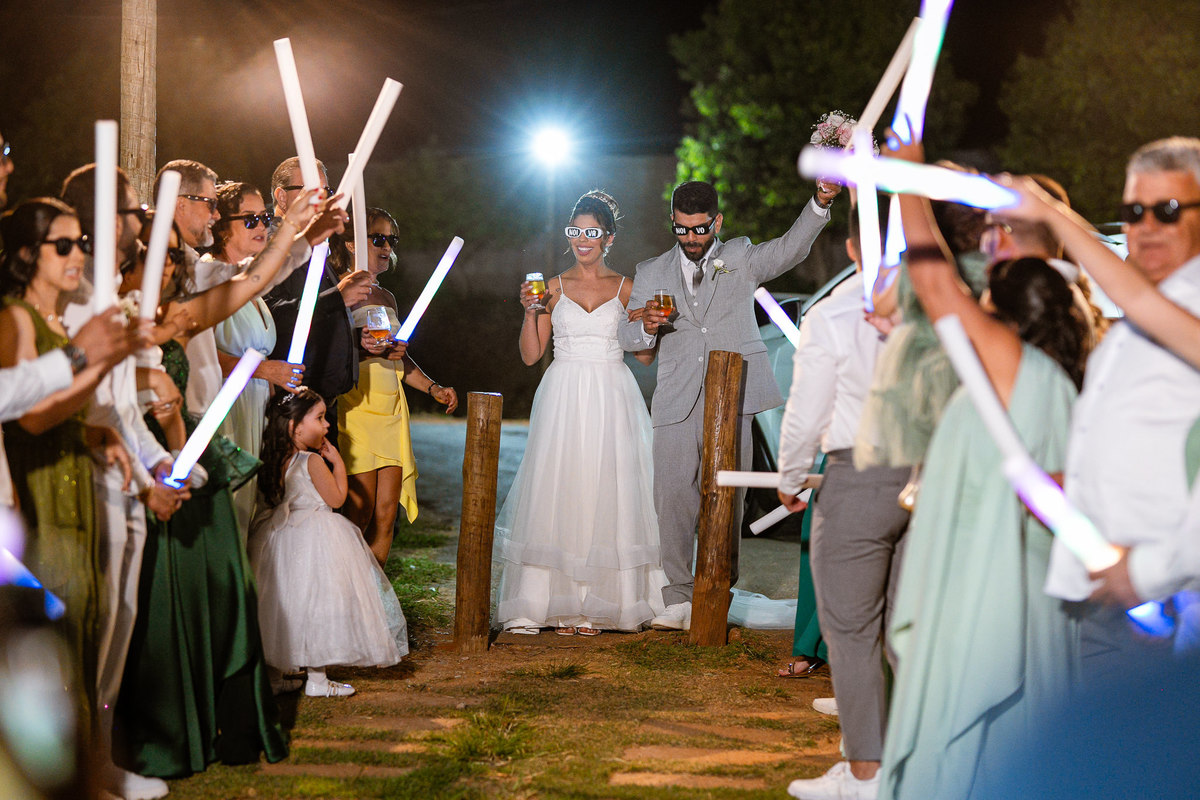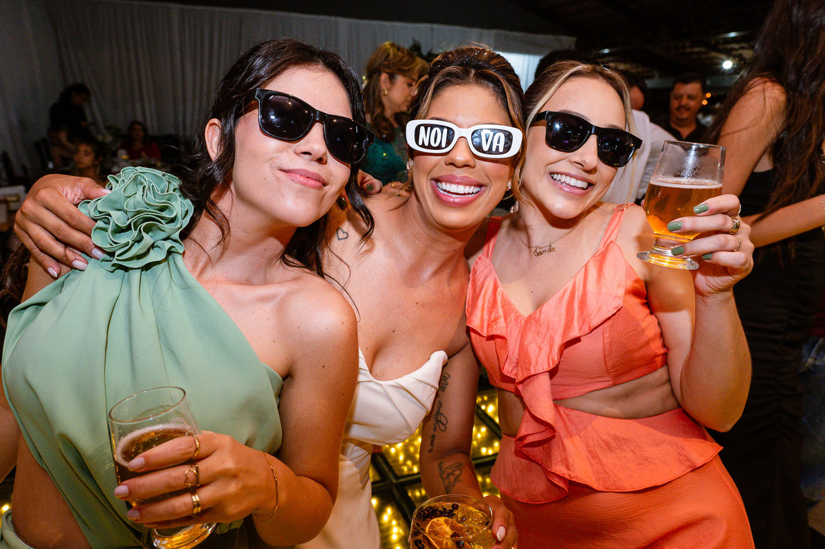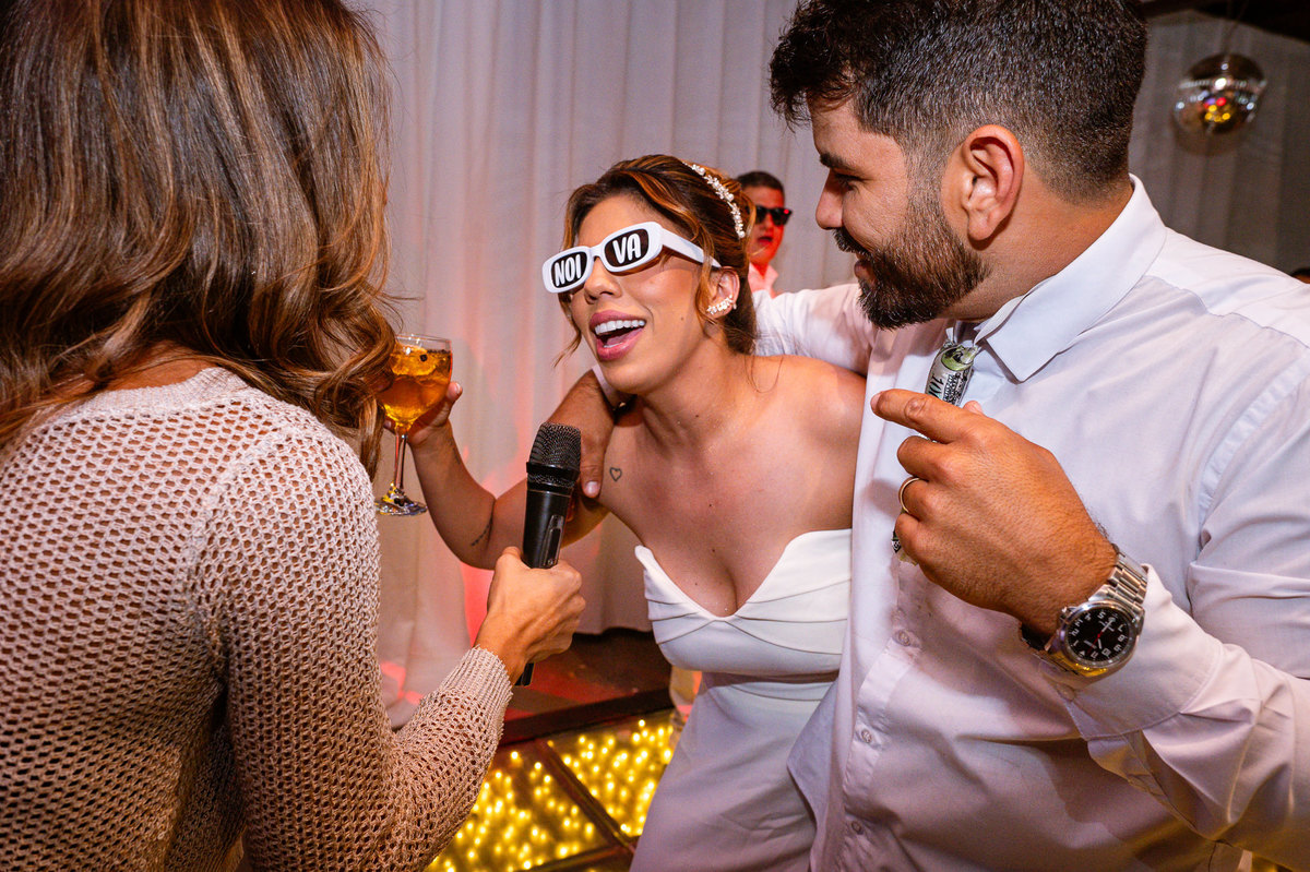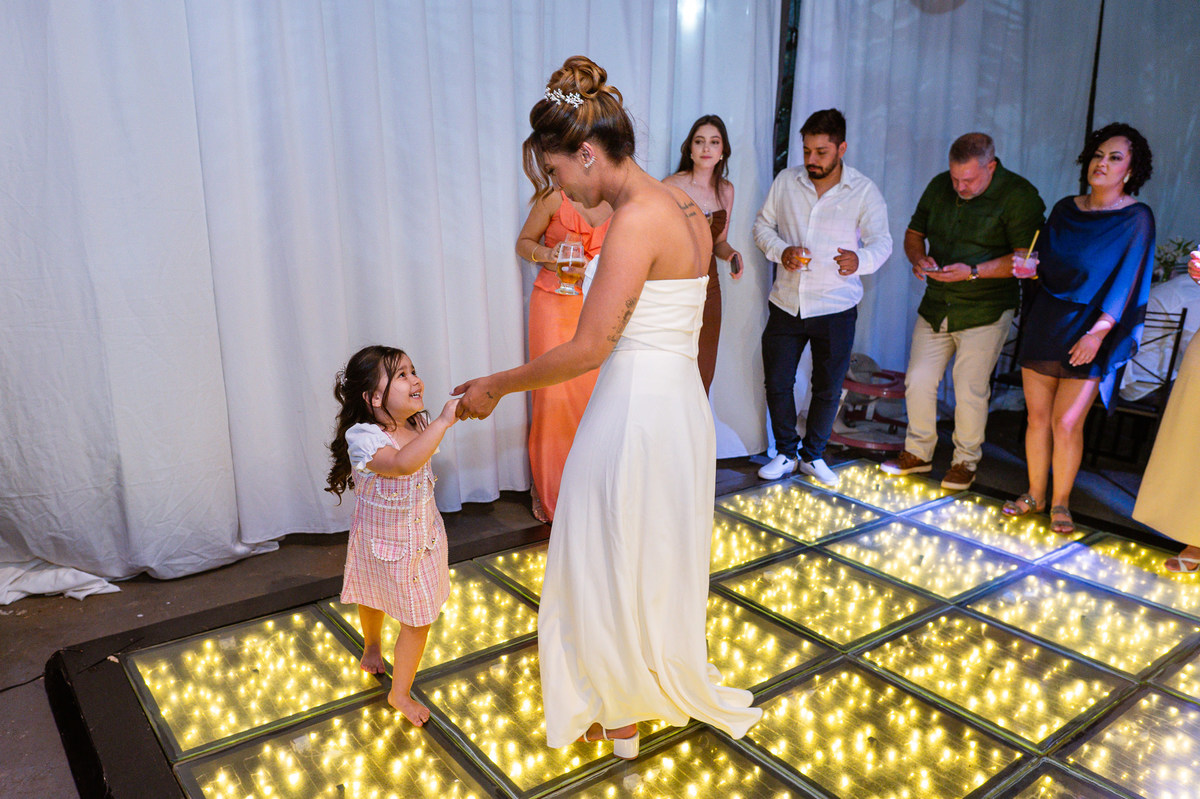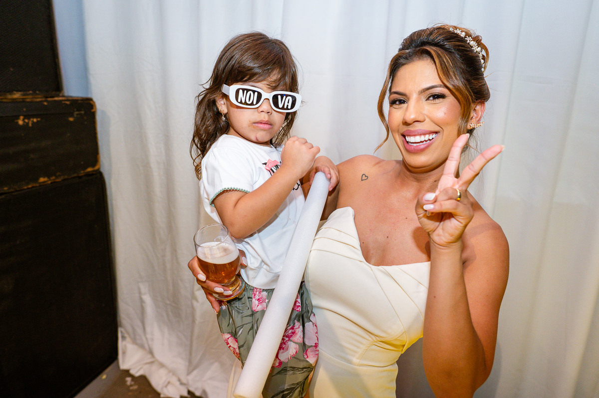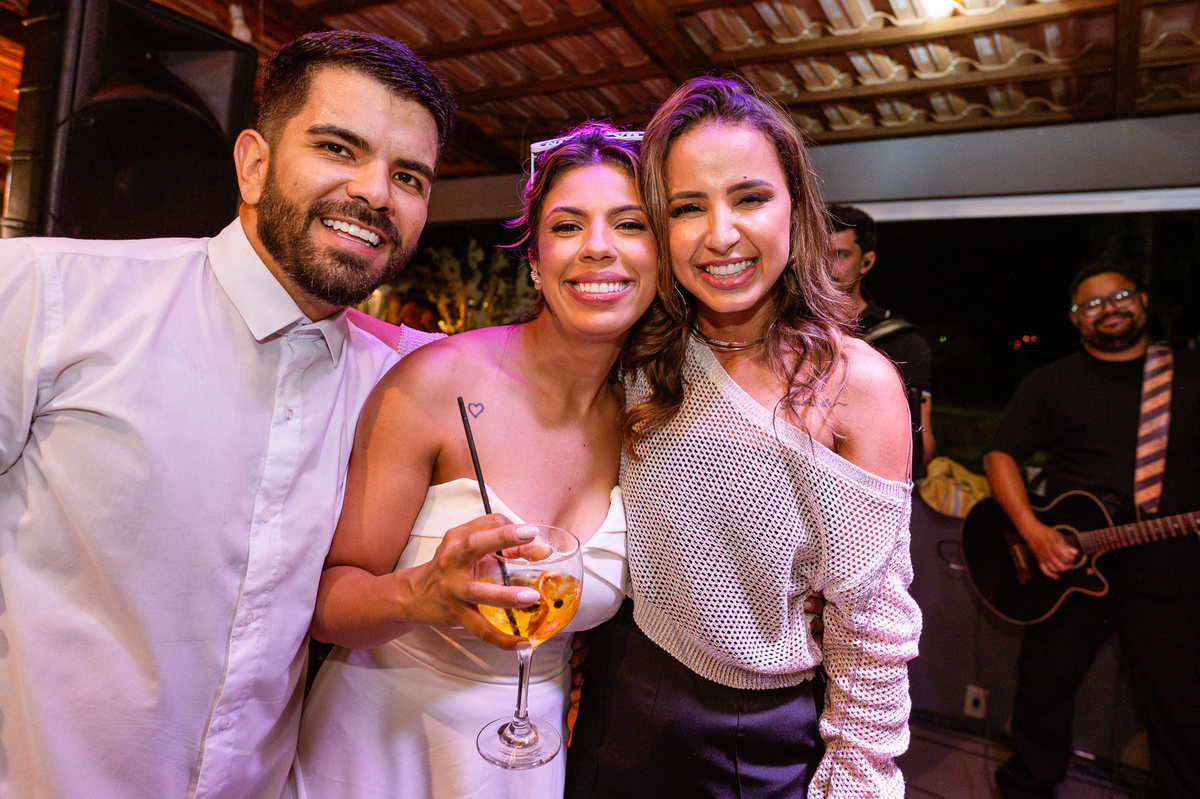 Deixamos os convidados sendo encaminhados para a recepção enquanto aproveitávamos o tempo para fotografar. Fizemos nosso tradicionalíssimo ensaio dos recém-casados. Em poucos minutos, conseguimos fotografias lindas. Terminadas as fotos, partimos pra recepção. Lá chegando, os noivos se alimentaram enquanto os padrinhos foram perfilados na entrada da festa. Com muitos bastões de led nas mãos, óculos personalizados e muito som, eles foram anunciados para adentrar a pista de dança. Passaram pela fila com muita felicidade, curtindo, gritando e comemorando muito com todos seus padrinhos. Já na pista, eles agradeceram os seus convidados e desejaram que curtissem muito aquela noite. Fizemos mais algumas fotografias protocolares na mesa do bolo e dispensamos o noivo, que tratou de ser raptado pelos padrinhos da gravata. Percorremos o salão junto com a noiva que cumprimentou todos os seus convidados. Bheatriz dançou, bebeu, curtiu, dançou e comeu. Aproveitou cada minuto da sua festa. Quando a cantora Aletis Garcia subiu ao palco, trazendo seu sanfoneiro que é prata da casa, todo mundo caiu na dança. Com um repertório vasto e que agradou a todos sem exceção, fez da noiva e até o fotógrafo dançar.