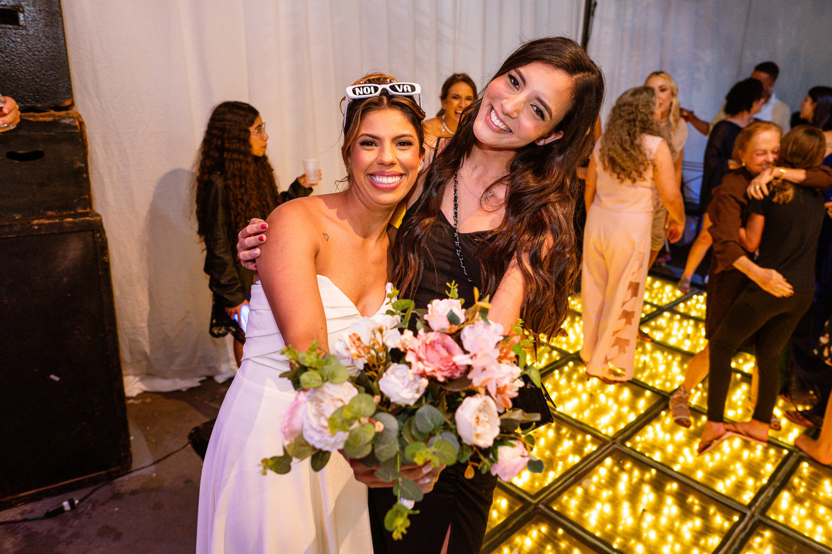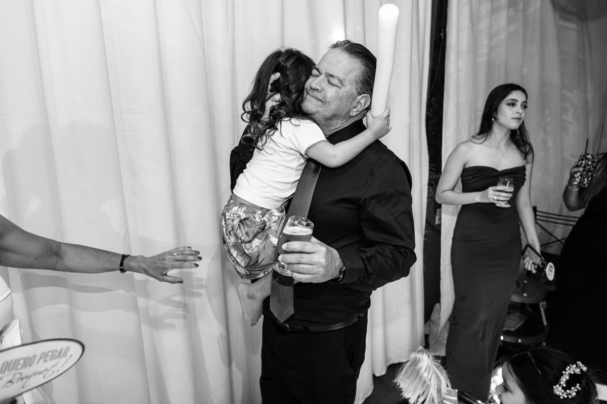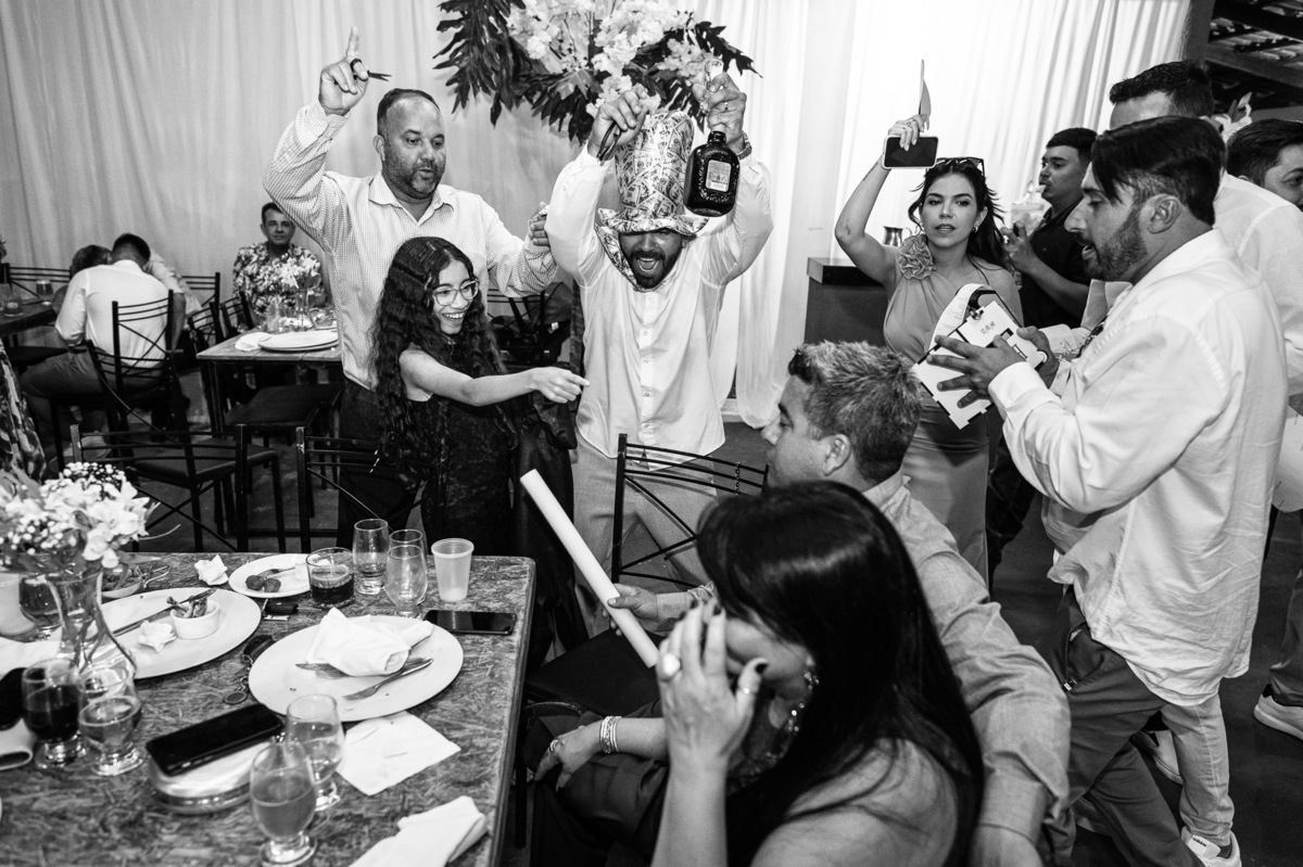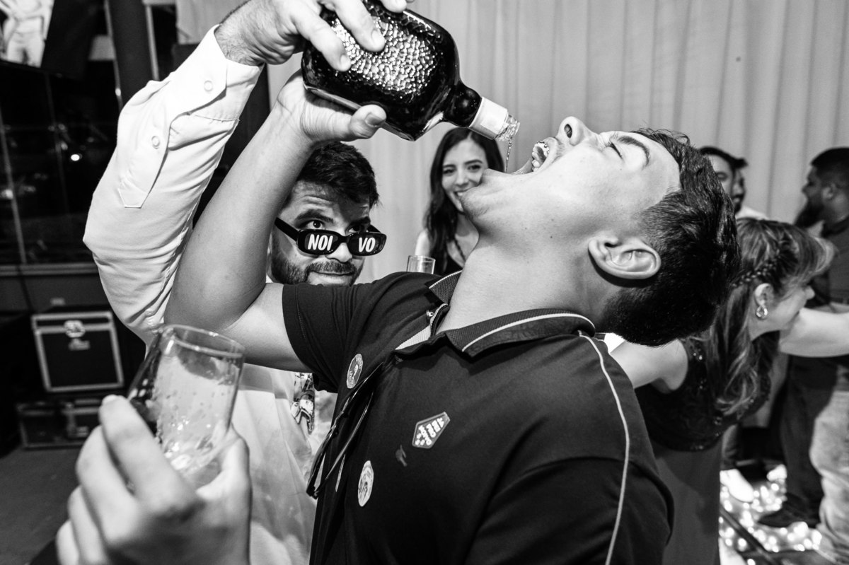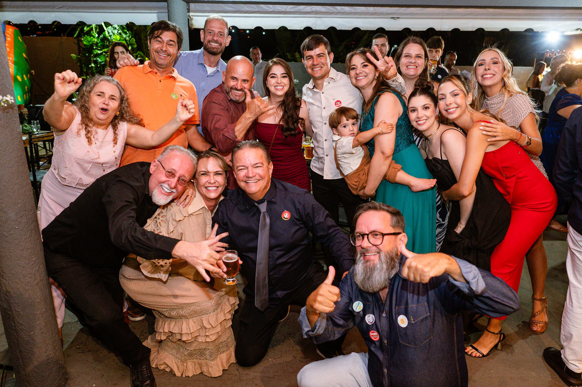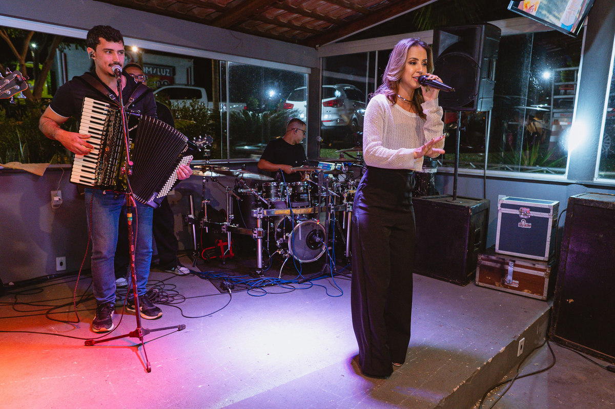 Deixamos os convidados sendo encaminhados para a recepção enquanto aproveitávamos o tempo para fotografar. Fizemos nosso tradicionalíssimo ensaio dos recém-casados. Em poucos minutos, conseguimos fotografias lindas. Terminadas as fotos, partimos pra recepção. Lá chegando, os noivos se alimentaram enquanto os padrinhos foram perfilados na entrada da festa. Com muitos bastões de led nas mãos, óculos personalizados e muito som, eles foram anunciados para adentrar a pista de dança. Passaram pela fila com muita felicidade, curtindo, gritando e comemorando muito com todos seus padrinhos. Já na pista, eles agradeceram os seus convidados e desejaram que curtissem muito aquela noite. Fizemos mais algumas fotografias protocolares na mesa do bolo e dispensamos o noivo, que tratou de ser raptado pelos padrinhos da gravata. Percorremos o salão junto com a noiva que cumprimentou todos os seus convidados. Bheatriz dançou, bebeu, curtiu, dançou e comeu. Aproveitou cada minuto da sua festa. Quando a cantora Aletis Garcia subiu ao palco, trazendo seu sanfoneiro que é prata da casa, todo mundo caiu na dança. Com um repertório vasto e que agradou a todos sem exceção, fez da noiva e até o fotógrafo dançar.