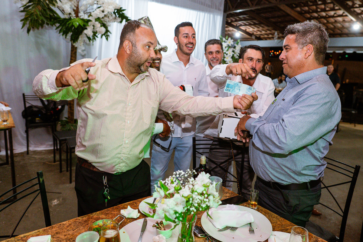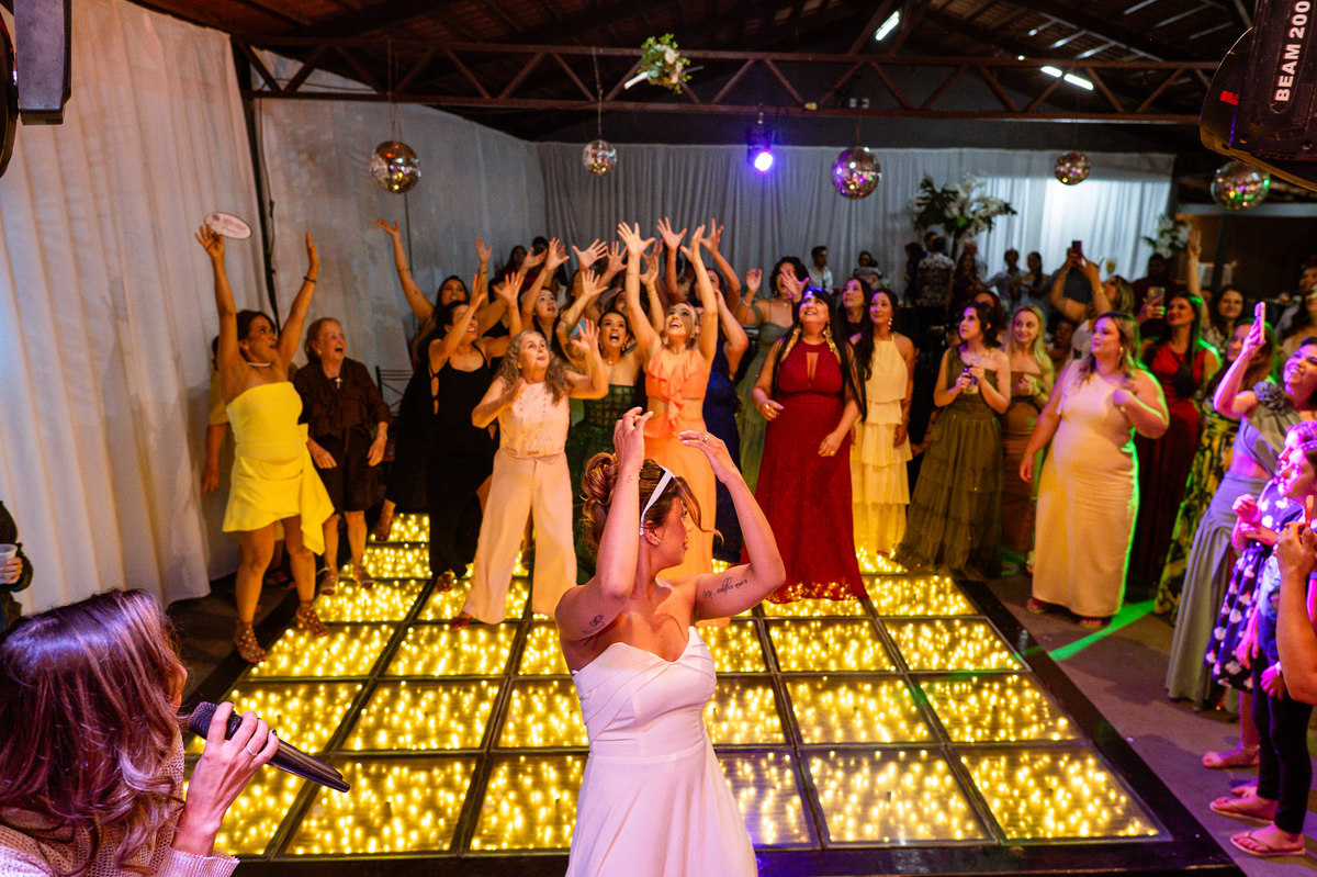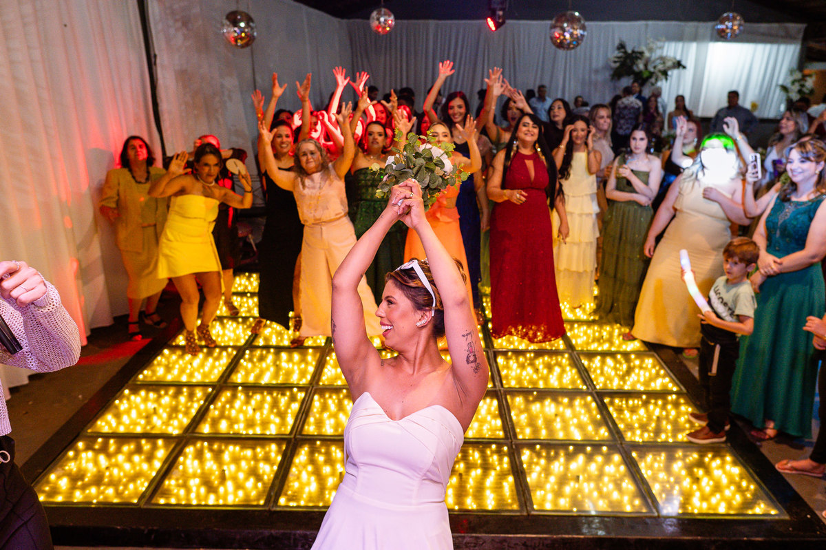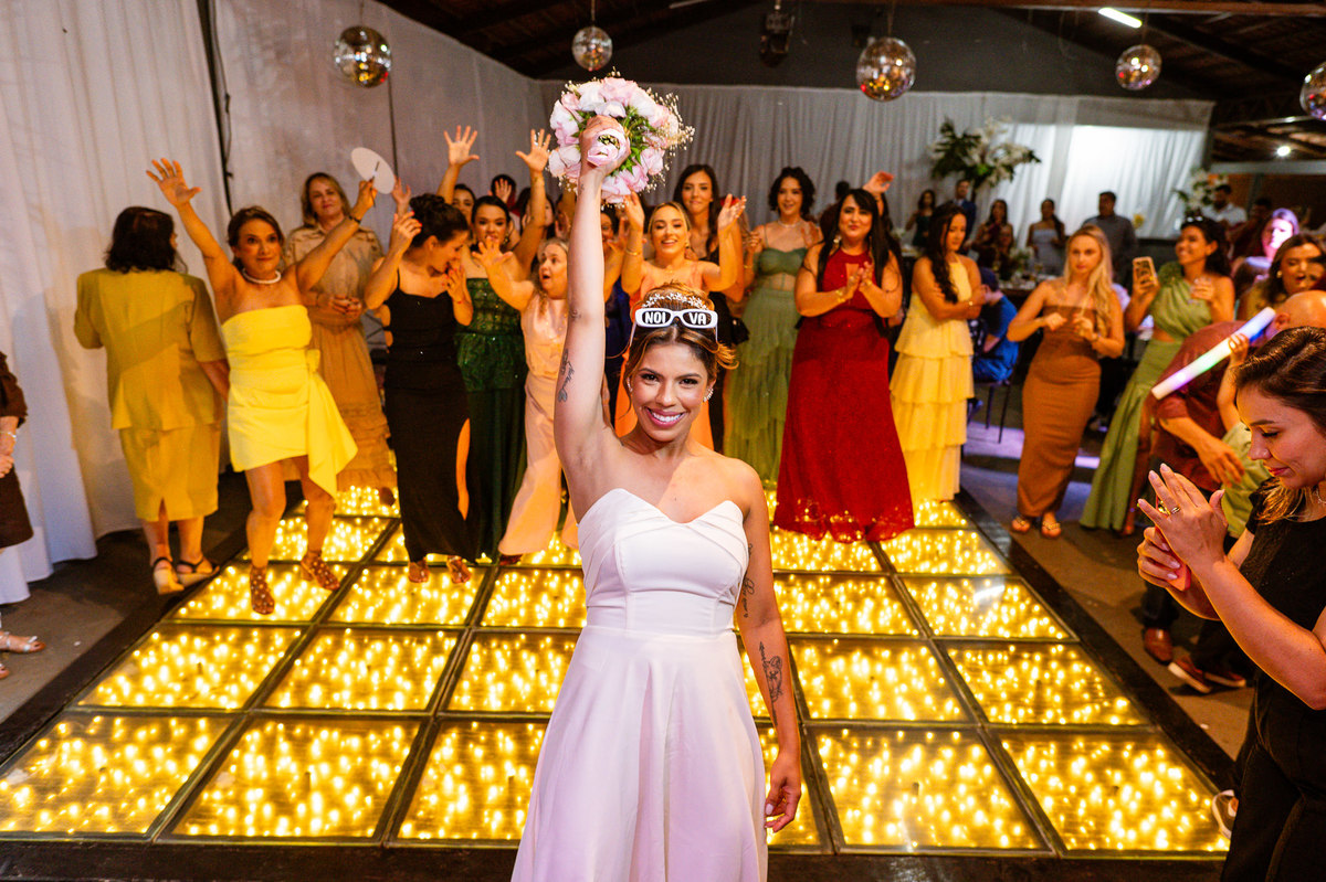 Depois de uma sessão de dança e muita curtição, era hora de jogar o buquê. As solteiras disputaram no braço, pedaço por pedaço da pista de dança. Bheatriz fez daquele momento um evento. Dançou, fez as madrinhas descerem até o chão diversas vezes, até que virada de costas, ela lançou seu buquê. Uma das solteironas pulou mais alto do que todas elas e alçou o pódio. Porém, ao ir com sede demais, o buquê esbarrou em sua mão e quase caiu. Mas ela estava determinada. Antes mesmo que caísse, no ar, ela conseguiu reverter a situação e abraçou sua conquista, colocando-o pro alto em sinal de vitória. E a festa não parou por ai. Teve mais show de forró e sertanejo e também contou com o DJ Mega Fone animando a pista logo após. Os recém-casados fizeram uma verdadeira farra com seus convidados. Ninguém queria ir embora. Era foto com um, foto com outros, dança de cá e abraça de lá. Não parou um minuto sequer. A noiva não conseguia comer um torresmo sem ter que tirar uma foto. Depois de mais algum tempo, encerramos nosso trabalho com a certeza de termos exercido o melhor trabalho possível aos queridos noivinhos. Despedimo-nos dos dois com sentimento eterno de gratidão. E agora, aqui abaixo você confere tudo isso que foi relatado aqui através de imagens inesquecíveis desse dia tão especial. Aos noivos, Nosso muito obrigado pela confiança. Amamos de coração todos os maravilhosos clientes da cidade de Presidente Olegário e região. A você que chegou até aqui, nosso muito obrigado também. Esse texto só existe porque as pessoas leem, se emocionam e me cobram depois de que no delas, elas querem a postagem. Até a próxima :)