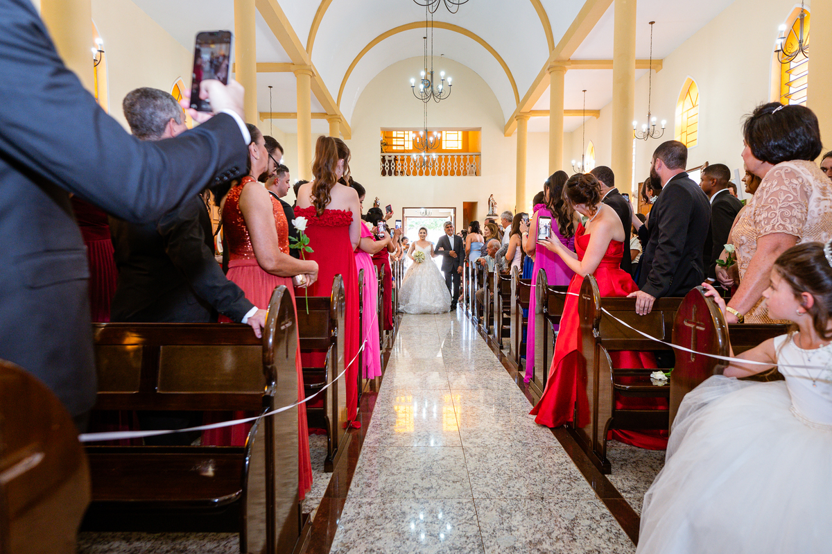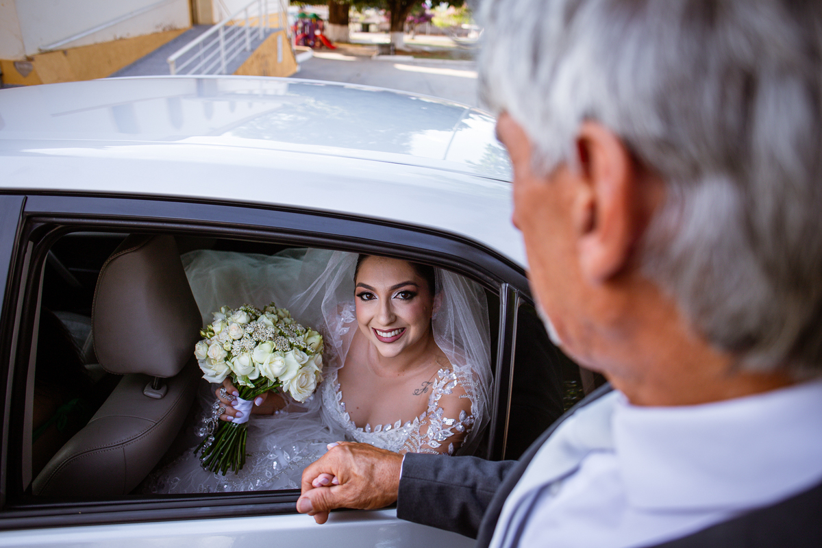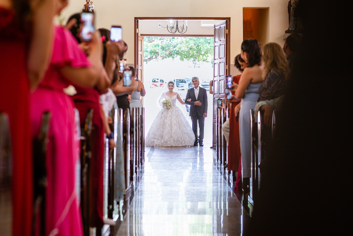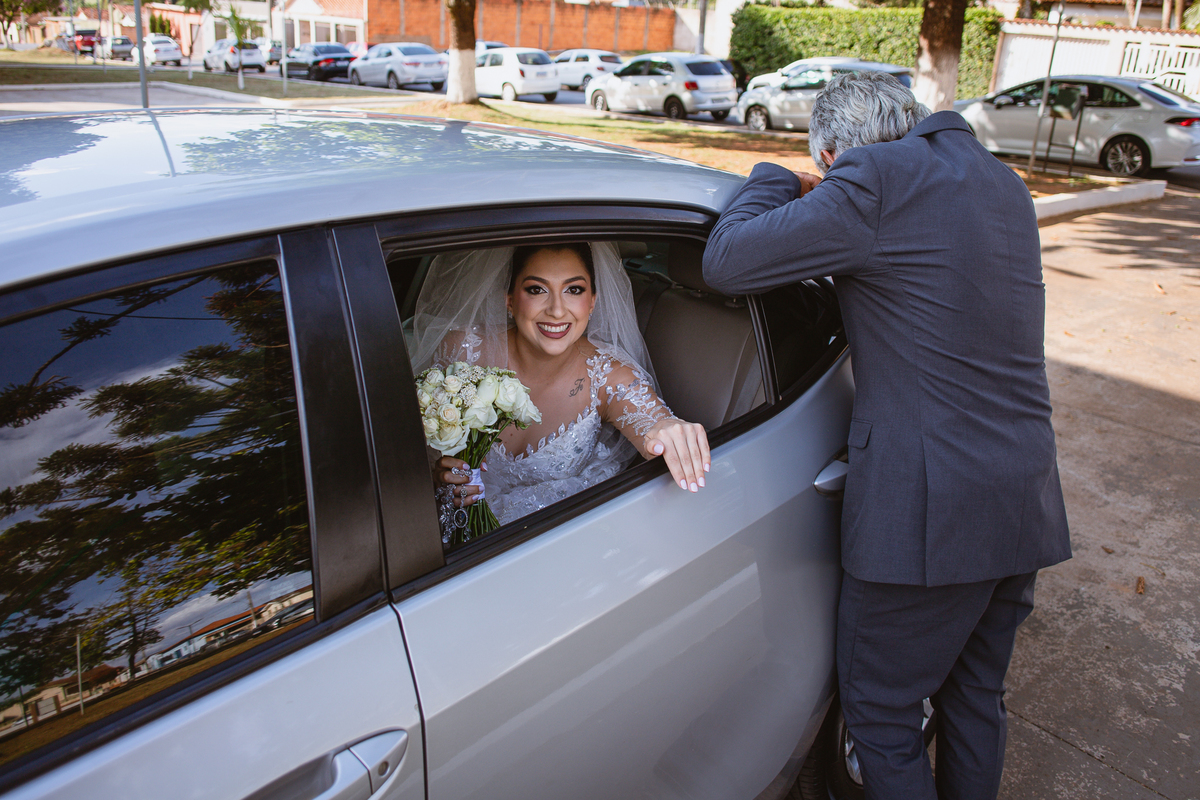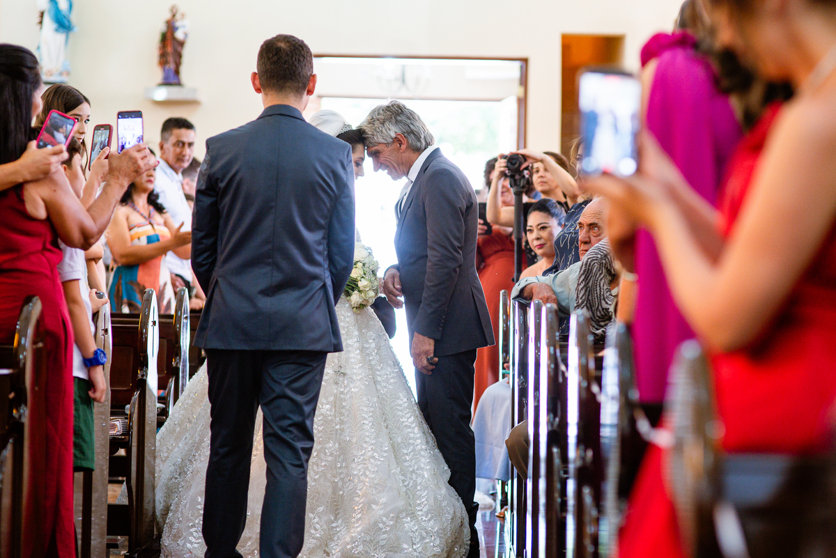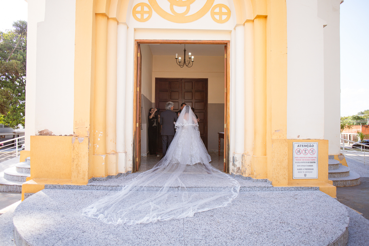 As entradas aconteceram lindamente, super organizadas. A florista, os pais dos noivos, padrinhos e o noivo entraram desfilando toda sua beleza. O dia estava lindo, o sol brilhava entre as nuvens e um céu azul contrastava com o amarelo da Igreja Matriz. DO lado de fora, toda a ansiedade de um dia de noiva. Amanda estava lá, poucos minutos de dizer o sim eterno e os segundos passavam lentamente. Do lado de dentro, Murilo aguardava ansiosamente também pelo seu encontro final. Depois de todas as entradas, as portas da Igreja se fecharam e os olhares de todos se dividiam entre a reação do noivo e a entrada da noiva. Amanda estava ainda dentro do carro, quando seu pai foi chamado para fazer as fotos e ajudar ela a descer. Quando ele chegou e olhou nos olhos de sua filha, ele teve uma reação muito espontânea e caiu em lágrimas sem condições de segurar o choro. Ele apoiou no veículo ainda de mãos dadas com ela e desabou em lágrimas.