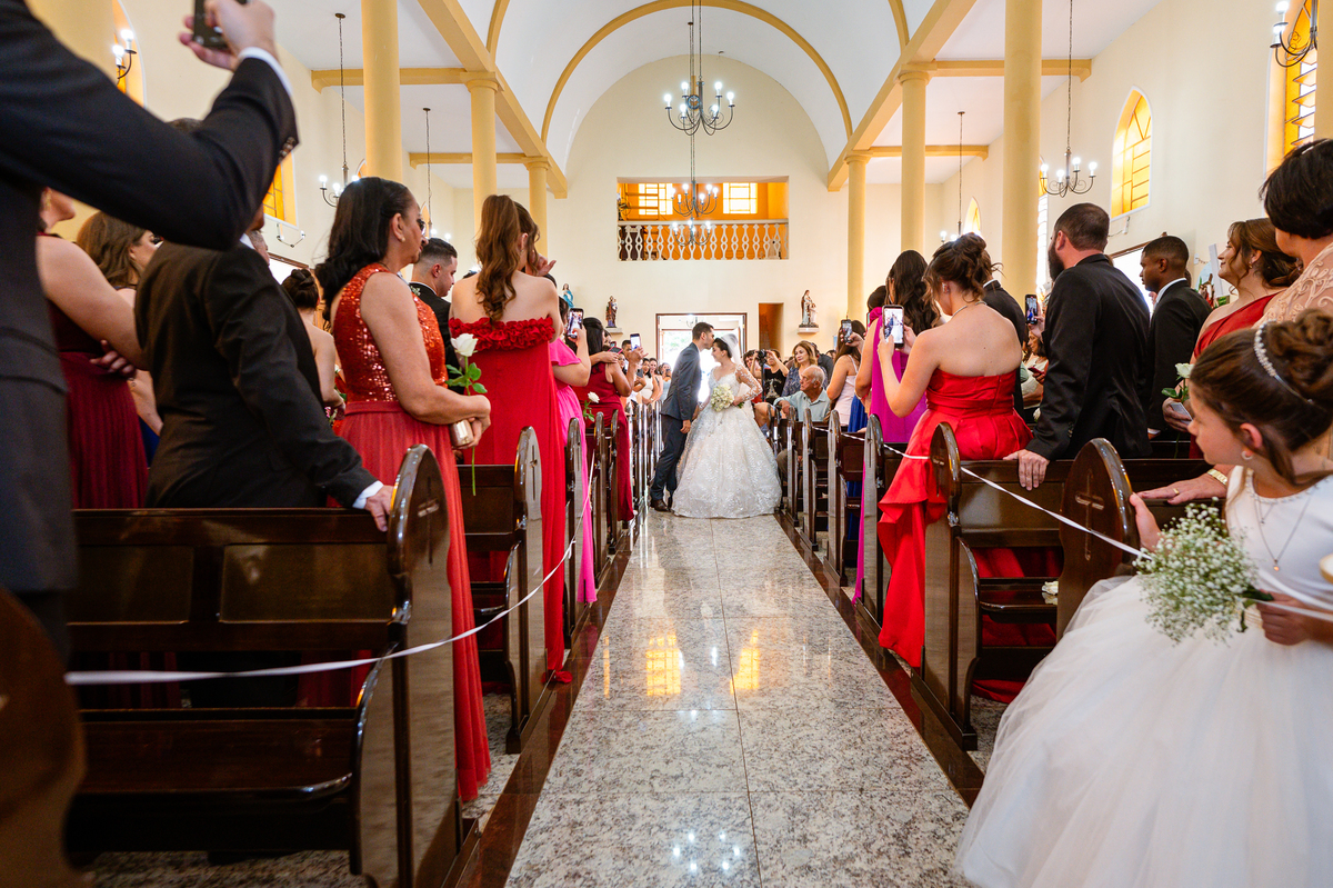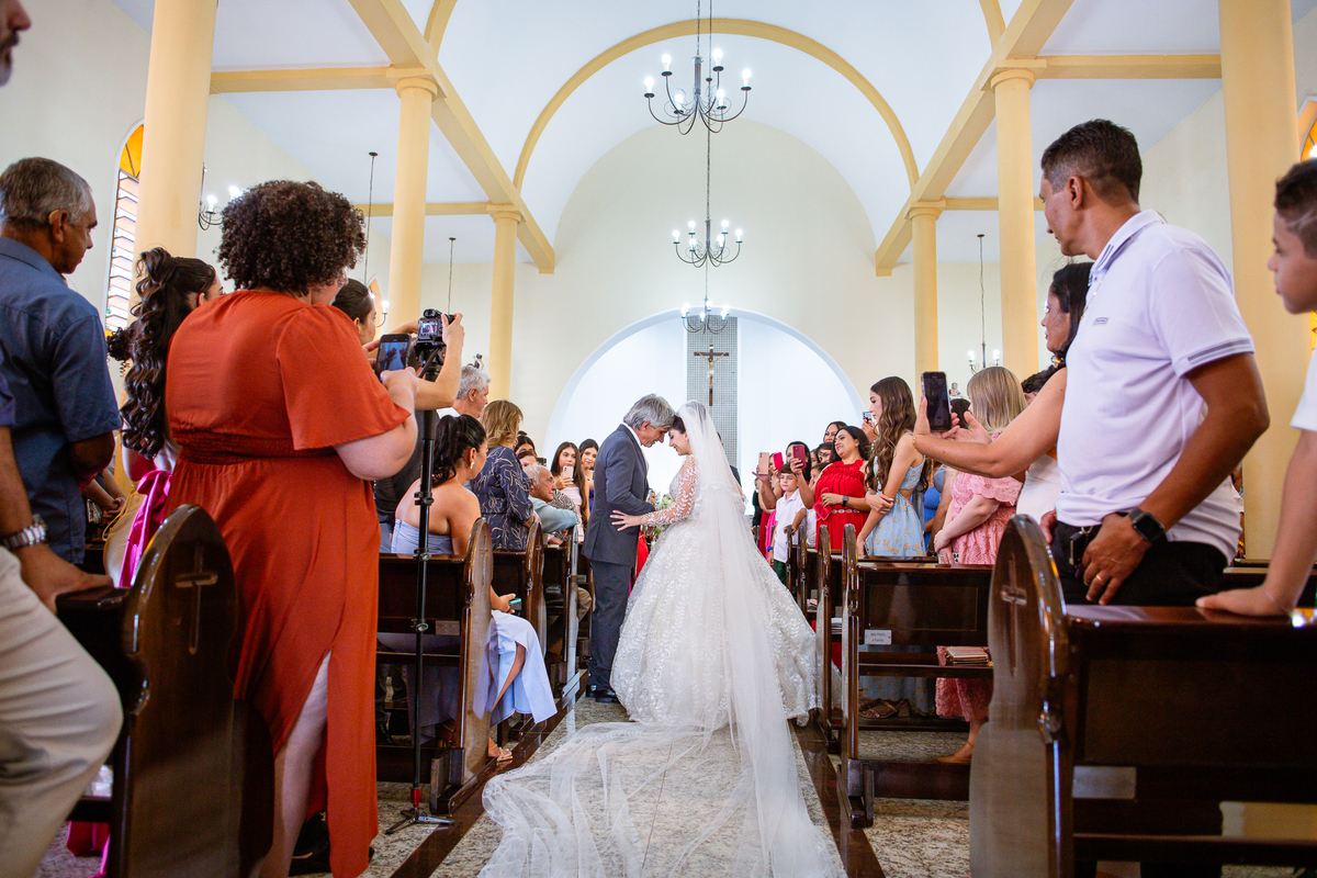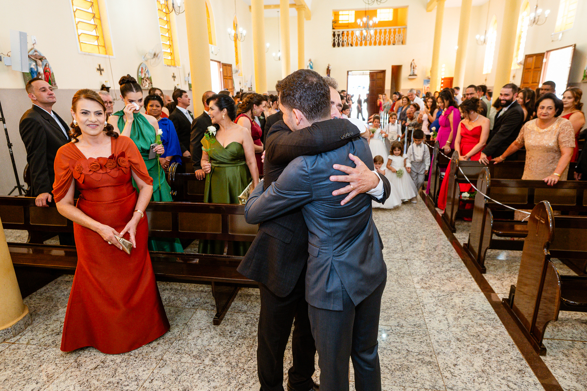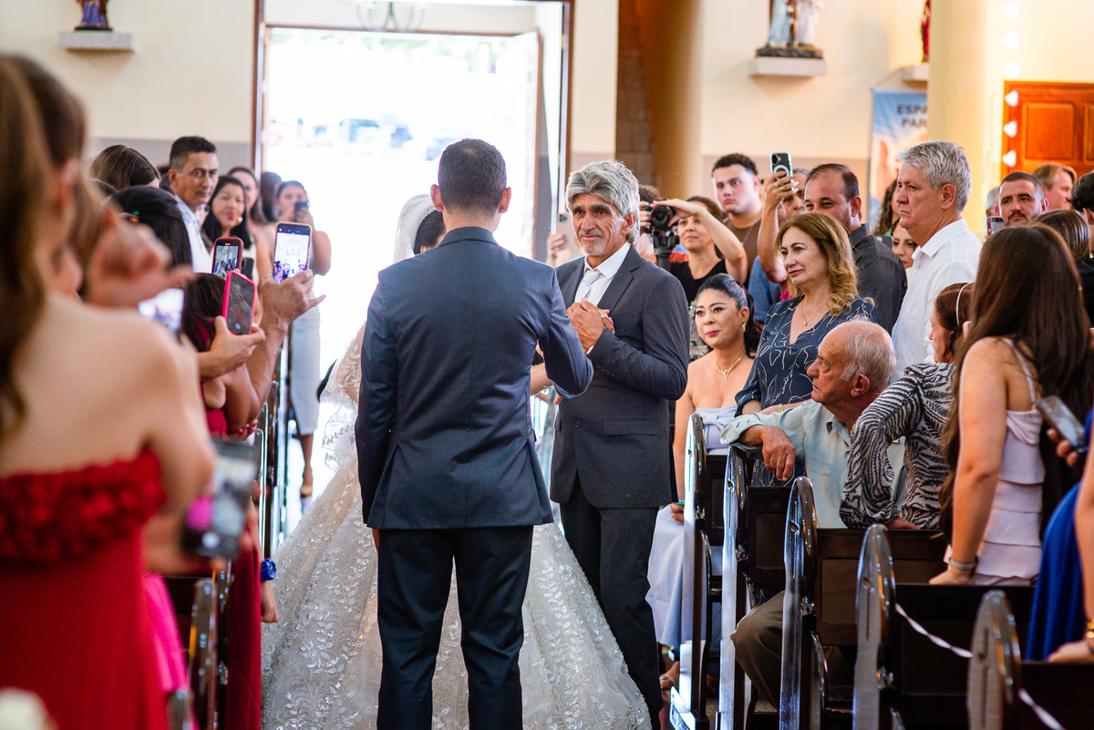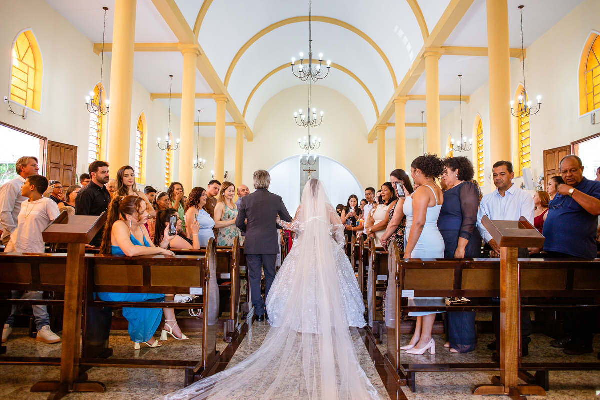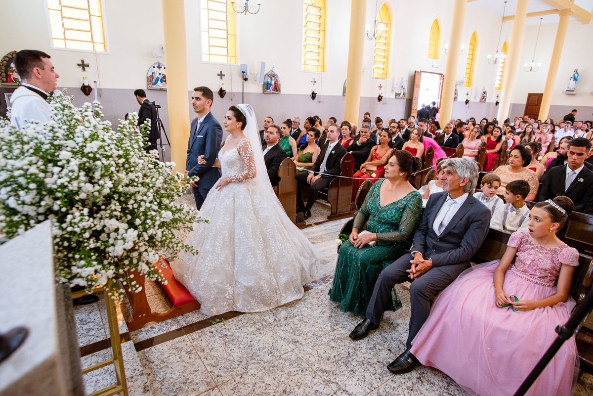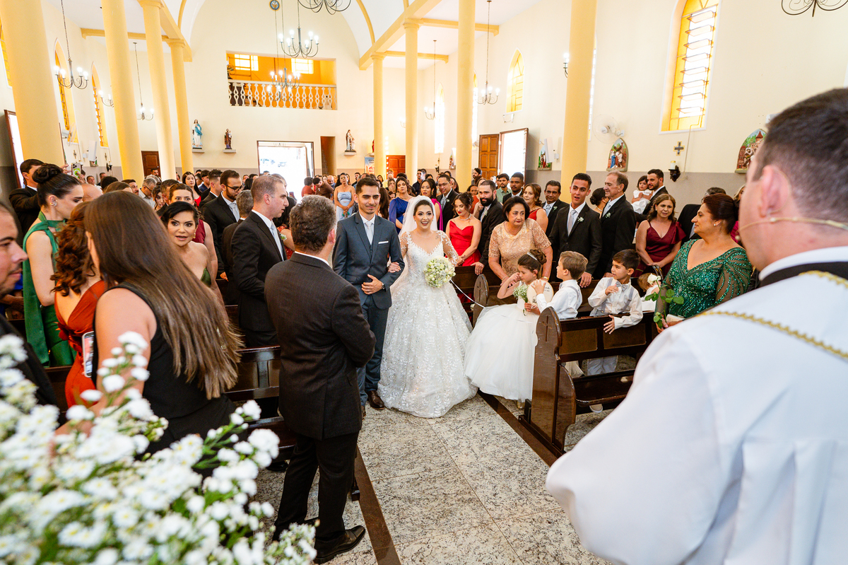 As entradas aconteceram lindamente, super organizadas. A florista, os pais dos noivos, padrinhos e o noivo entraram desfilando toda sua beleza. O dia estava lindo, o sol brilhava entre as nuvens e um céu azul contrastava com o amarelo da Igreja Matriz. DO lado de fora, toda a ansiedade de um dia de noiva. Amanda estava lá, poucos minutos de dizer o sim eterno e os segundos passavam lentamente. Do lado de dentro, Murilo aguardava ansiosamente também pelo seu encontro final. Depois de todas as entradas, as portas da Igreja se fecharam e os olhares de todos se dividiam entre a reação do noivo e a entrada da noiva. Amanda estava ainda dentro do carro, quando seu pai foi chamado para fazer as fotos e ajudar ela a descer. Quando ele chegou e olhou nos olhos de sua filha, ele teve uma reação muito espontânea e caiu em lágrimas sem condições de segurar o choro. Ele apoiou no veículo ainda de mãos dadas com ela e desabou em lágrimas.