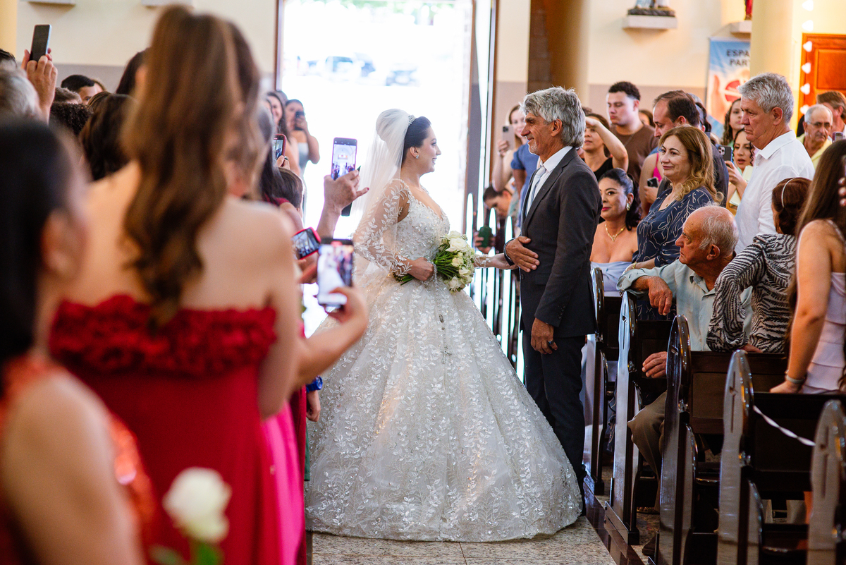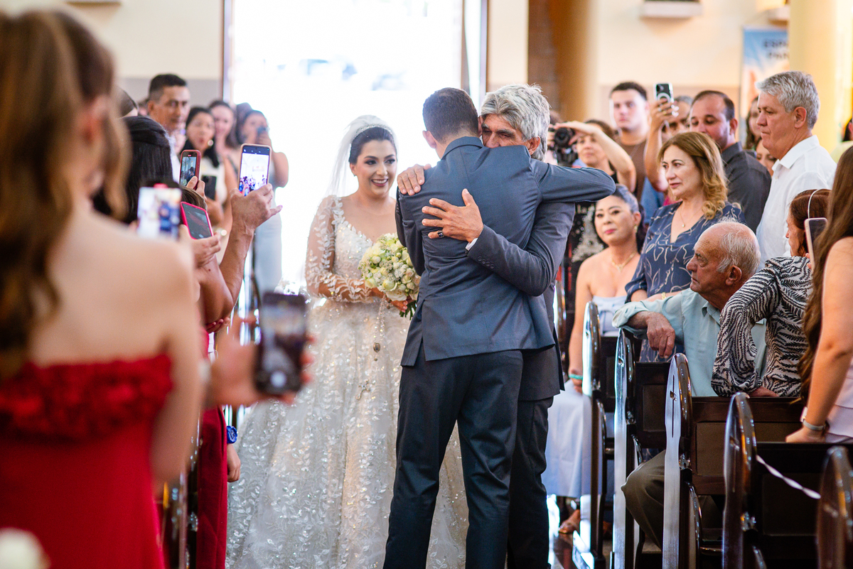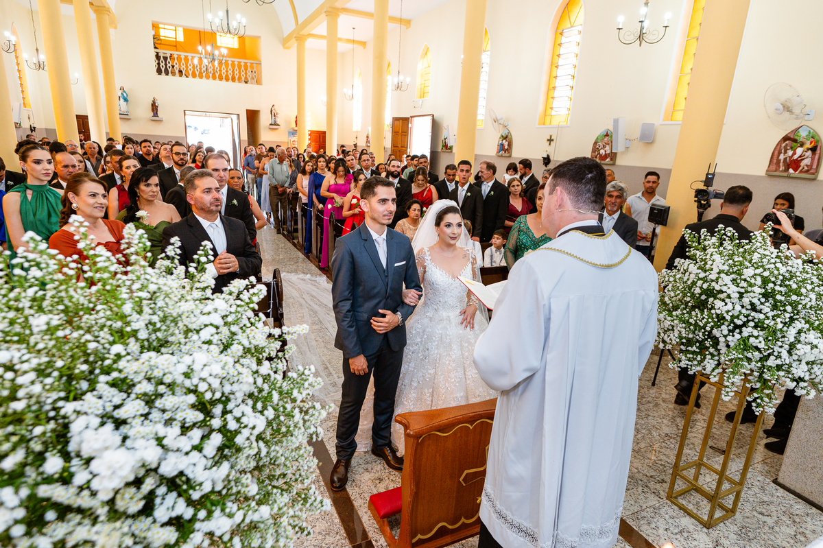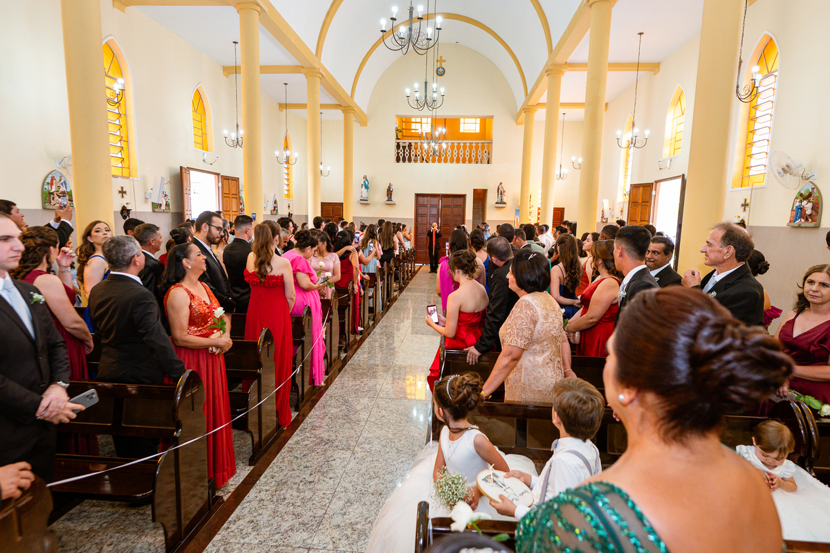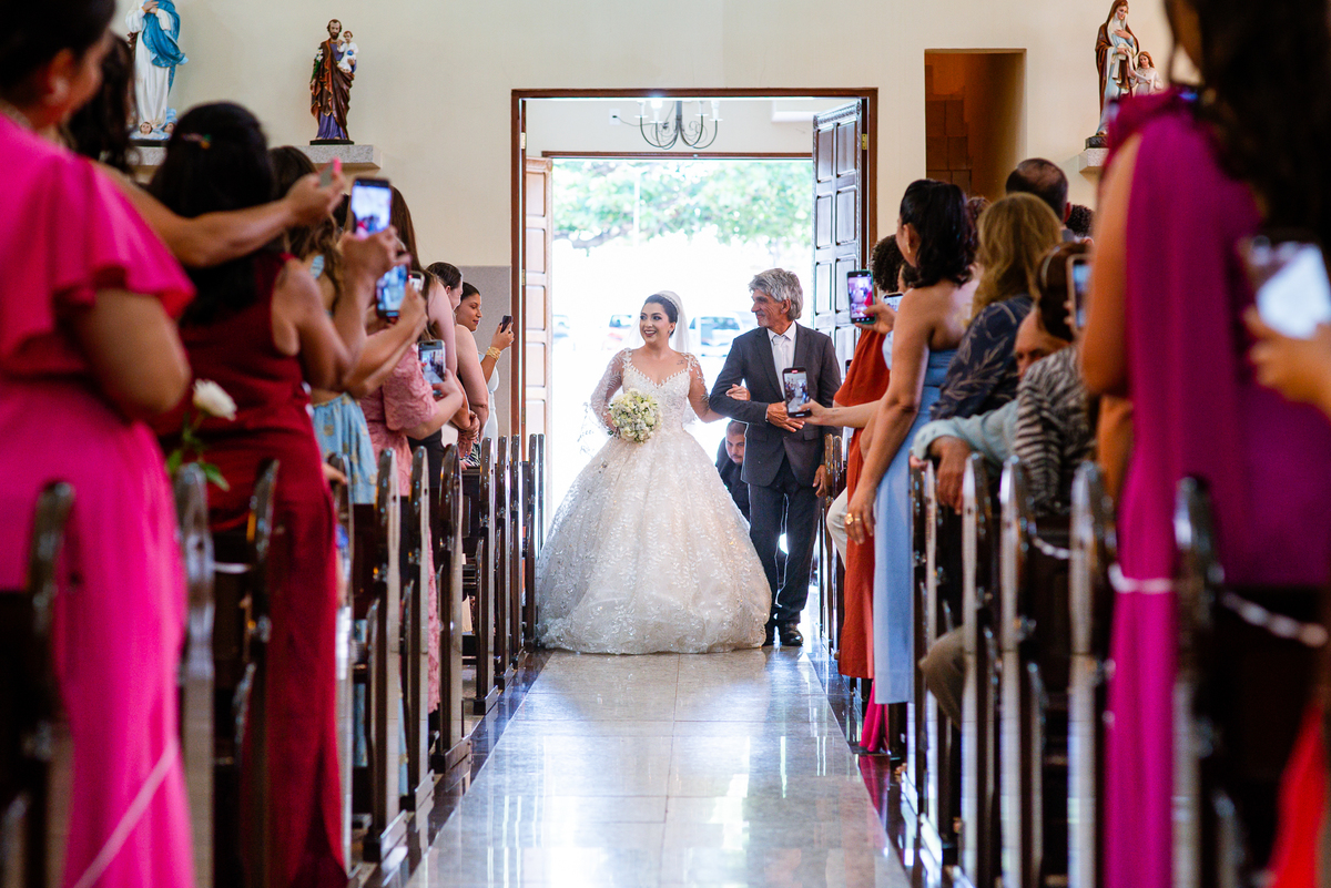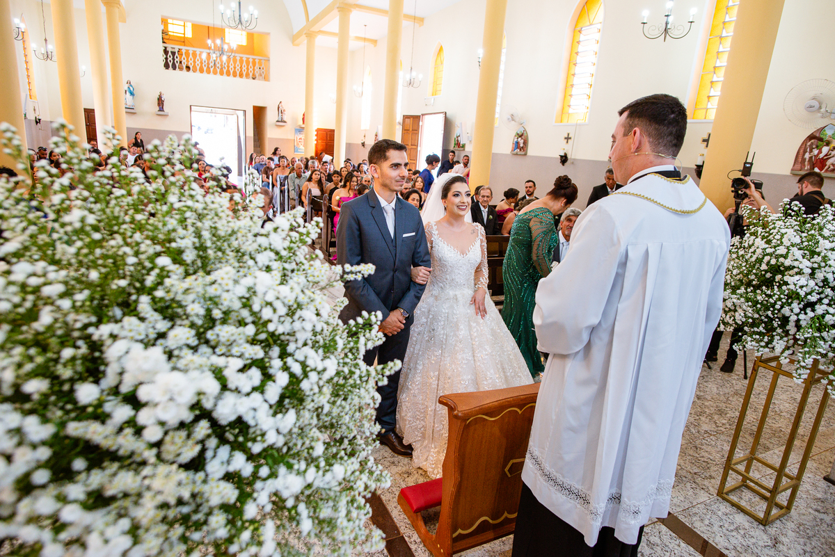 As entradas aconteceram lindamente, super organizadas. A florista, os pais dos noivos, padrinhos e o noivo entraram desfilando toda sua beleza. O dia estava lindo, o sol brilhava entre as nuvens e um céu azul contrastava com o amarelo da Igreja Matriz. DO lado de fora, toda a ansiedade de um dia de noiva. Amanda estava lá, poucos minutos de dizer o sim eterno e os segundos passavam lentamente. Do lado de dentro, Murilo aguardava ansiosamente também pelo seu encontro final. Depois de todas as entradas, as portas da Igreja se fecharam e os olhares de todos se dividiam entre a reação do noivo e a entrada da noiva. Amanda estava ainda dentro do carro, quando seu pai foi chamado para fazer as fotos e ajudar ela a descer. Quando ele chegou e olhou nos olhos de sua filha, ele teve uma reação muito espontânea e caiu em lágrimas sem condições de segurar o choro. Ele apoiou no veículo ainda de mãos dadas com ela e desabou em lágrimas.