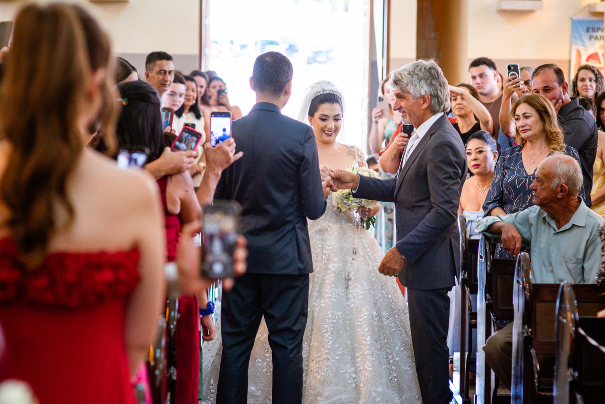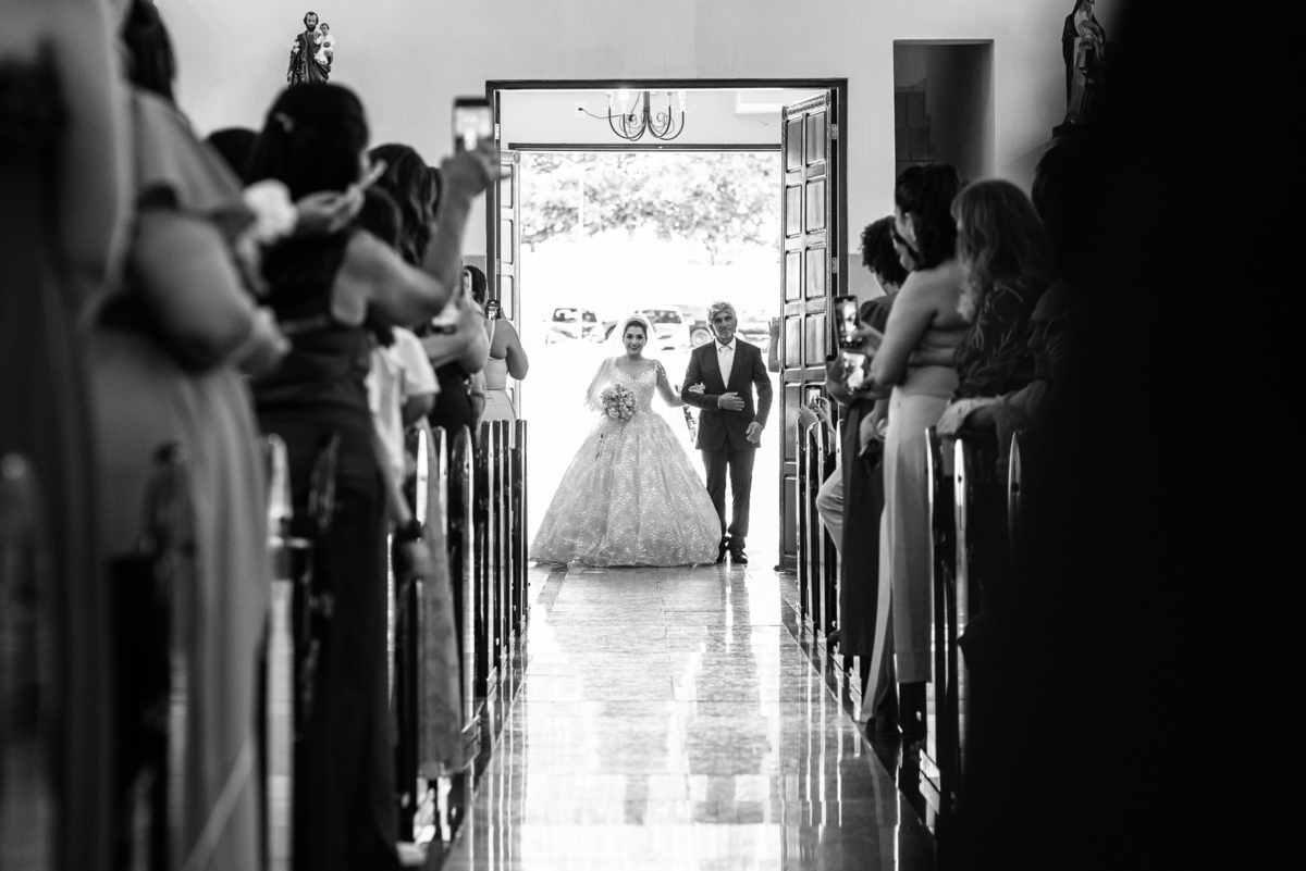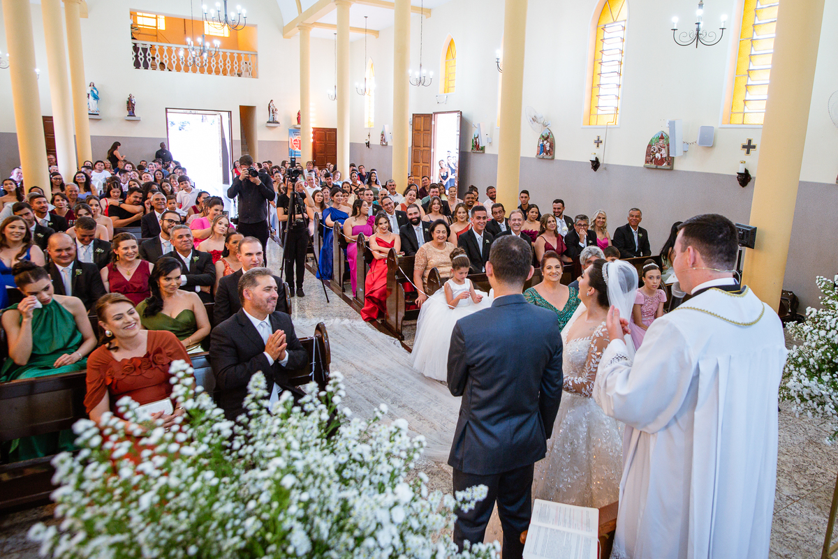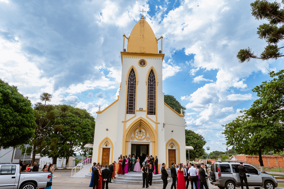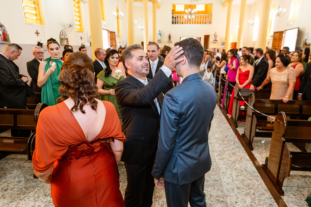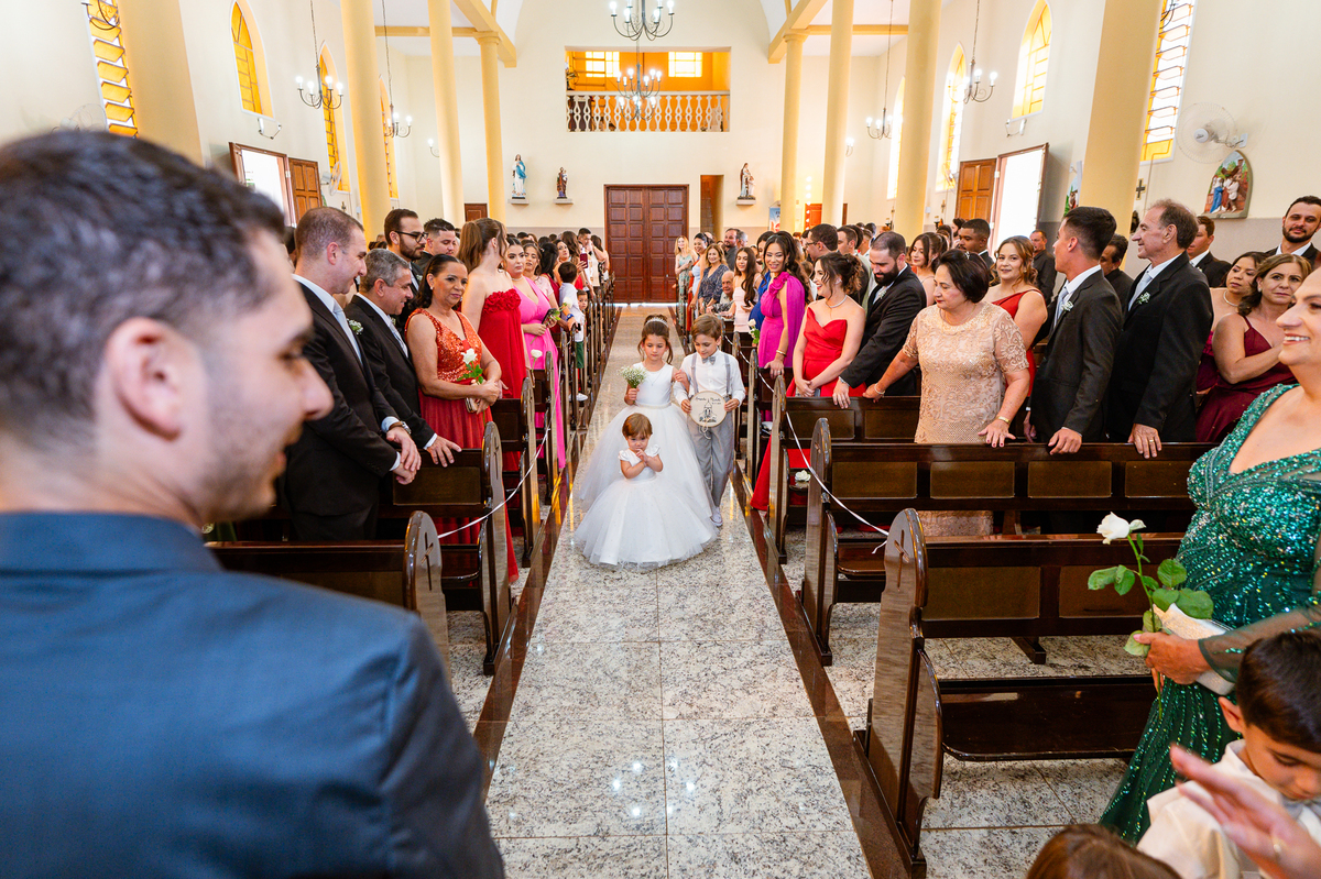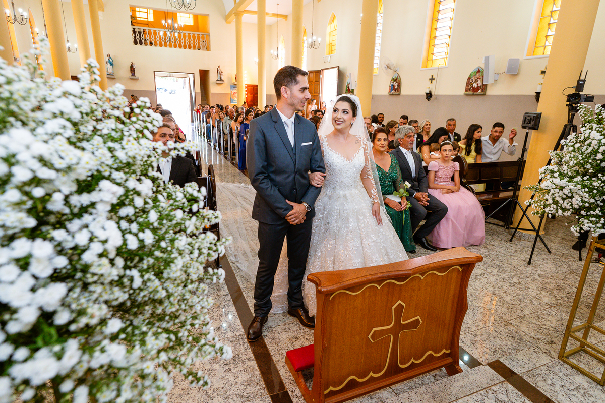 As entradas aconteceram lindamente, super organizadas. A florista, os pais dos noivos, padrinhos e o noivo entraram desfilando toda sua beleza. O dia estava lindo, o sol brilhava entre as nuvens e um céu azul contrastava com o amarelo da Igreja Matriz. DO lado de fora, toda a ansiedade de um dia de noiva. Amanda estava lá, poucos minutos de dizer o sim eterno e os segundos passavam lentamente. Do lado de dentro, Murilo aguardava ansiosamente também pelo seu encontro final. Depois de todas as entradas, as portas da Igreja se fecharam e os olhares de todos se dividiam entre a reação do noivo e a entrada da noiva. Amanda estava ainda dentro do carro, quando seu pai foi chamado para fazer as fotos e ajudar ela a descer. Quando ele chegou e olhou nos olhos de sua filha, ele teve uma reação muito espontânea e caiu em lágrimas sem condições de segurar o choro. Ele apoiou no veículo ainda de mãos dadas com ela e desabou em lágrimas.