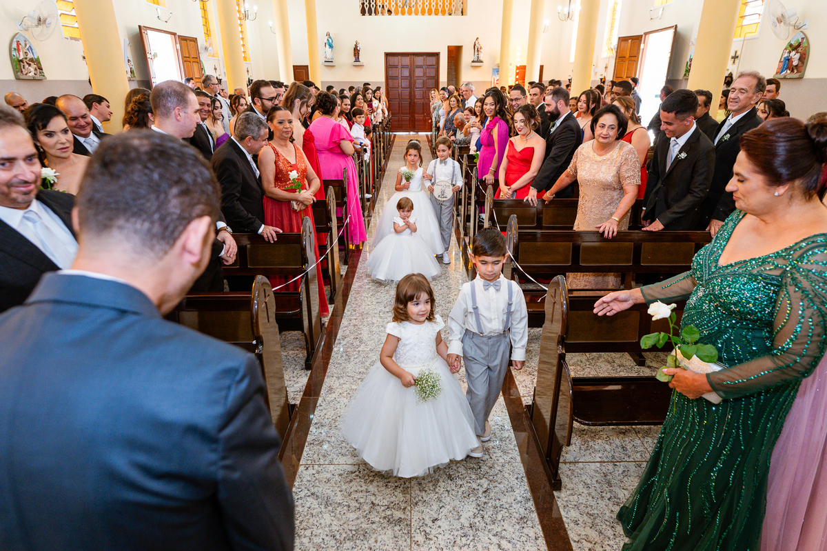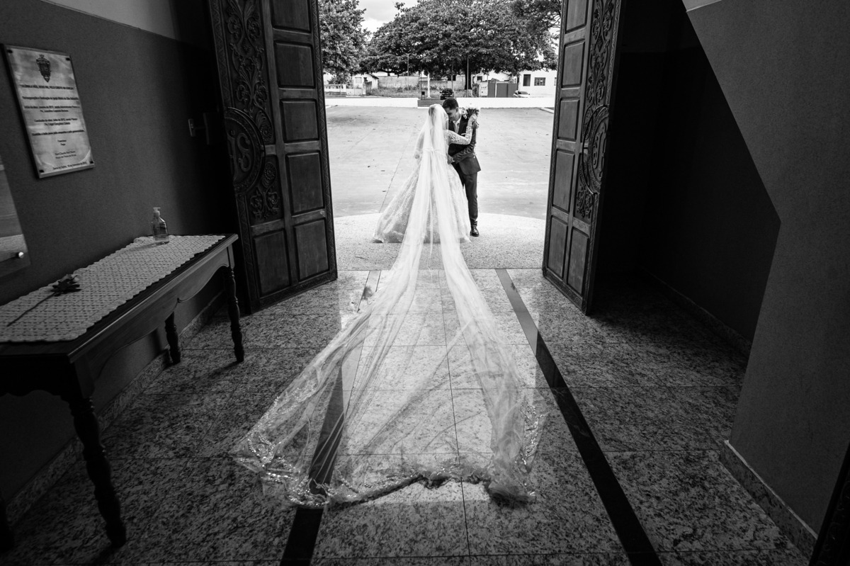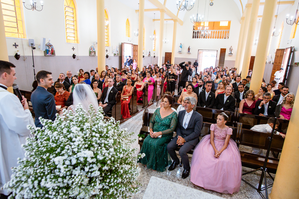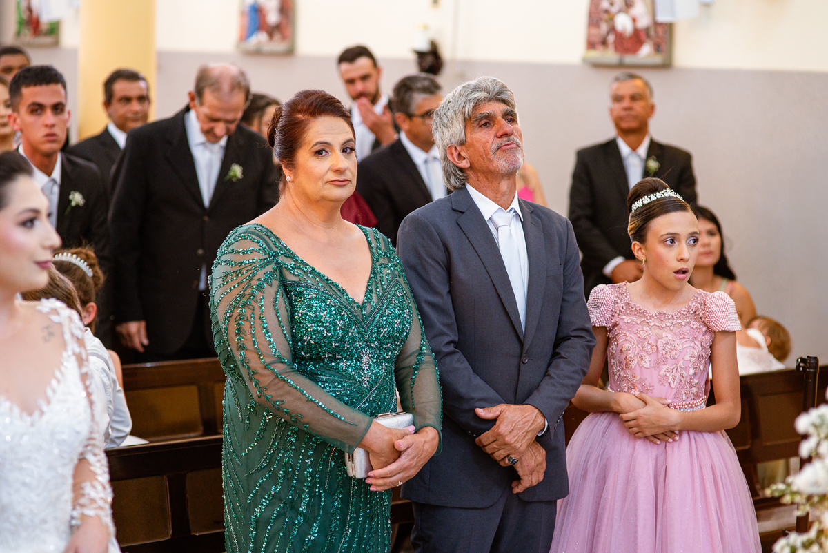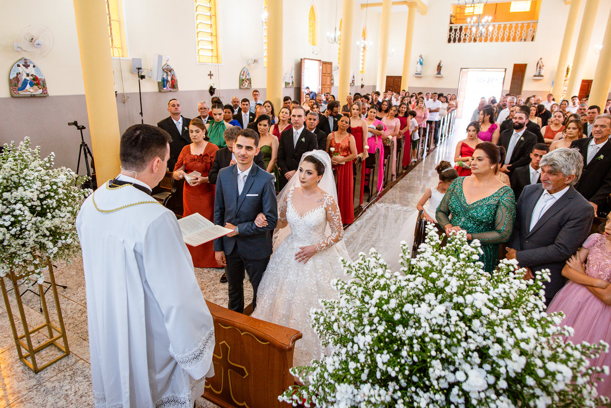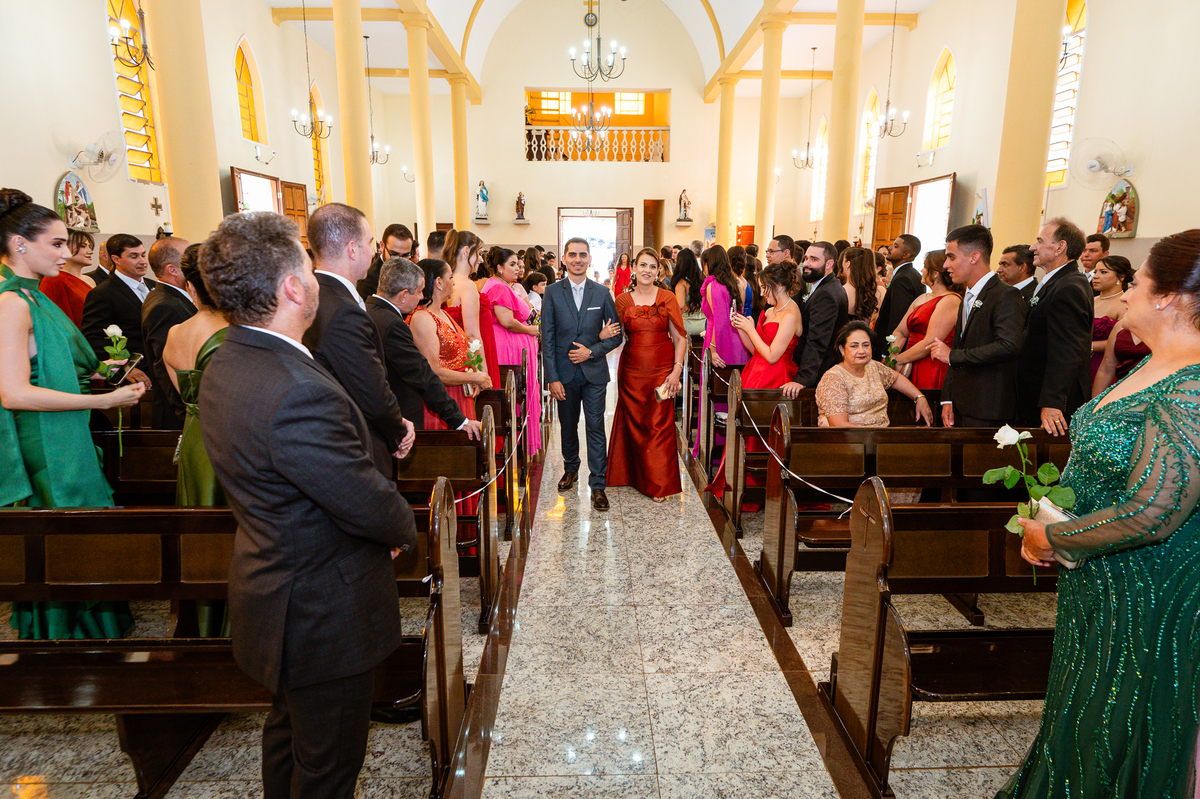 As entradas aconteceram lindamente, super organizadas. A florista, os pais dos noivos, padrinhos e o noivo entraram desfilando toda sua beleza. O dia estava lindo, o sol brilhava entre as nuvens e um céu azul contrastava com o amarelo da Igreja Matriz. DO lado de fora, toda a ansiedade de um dia de noiva. Amanda estava lá, poucos minutos de dizer o sim eterno e os segundos passavam lentamente. Do lado de dentro, Murilo aguardava ansiosamente também pelo seu encontro final. Depois de todas as entradas, as portas da Igreja se fecharam e os olhares de todos se dividiam entre a reação do noivo e a entrada da noiva. Amanda estava ainda dentro do carro, quando seu pai foi chamado para fazer as fotos e ajudar ela a descer. Quando ele chegou e olhou nos olhos de sua filha, ele teve uma reação muito espontânea e caiu em lágrimas sem condições de segurar o choro. Ele apoiou no veículo ainda de mãos dadas com ela e desabou em lágrimas.