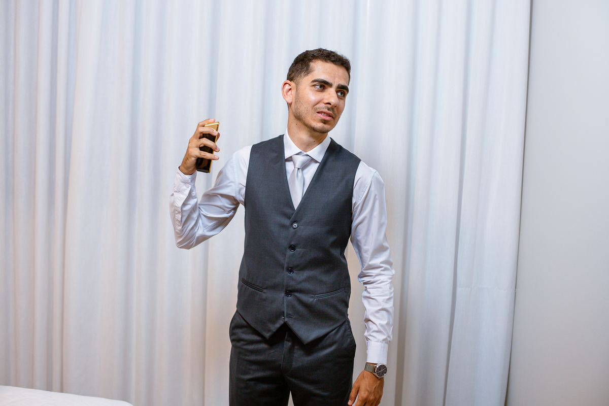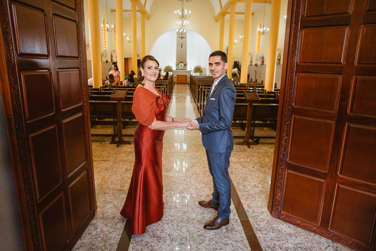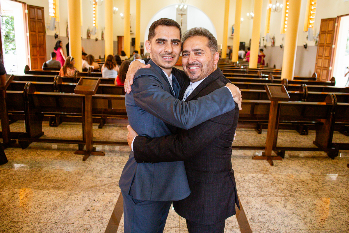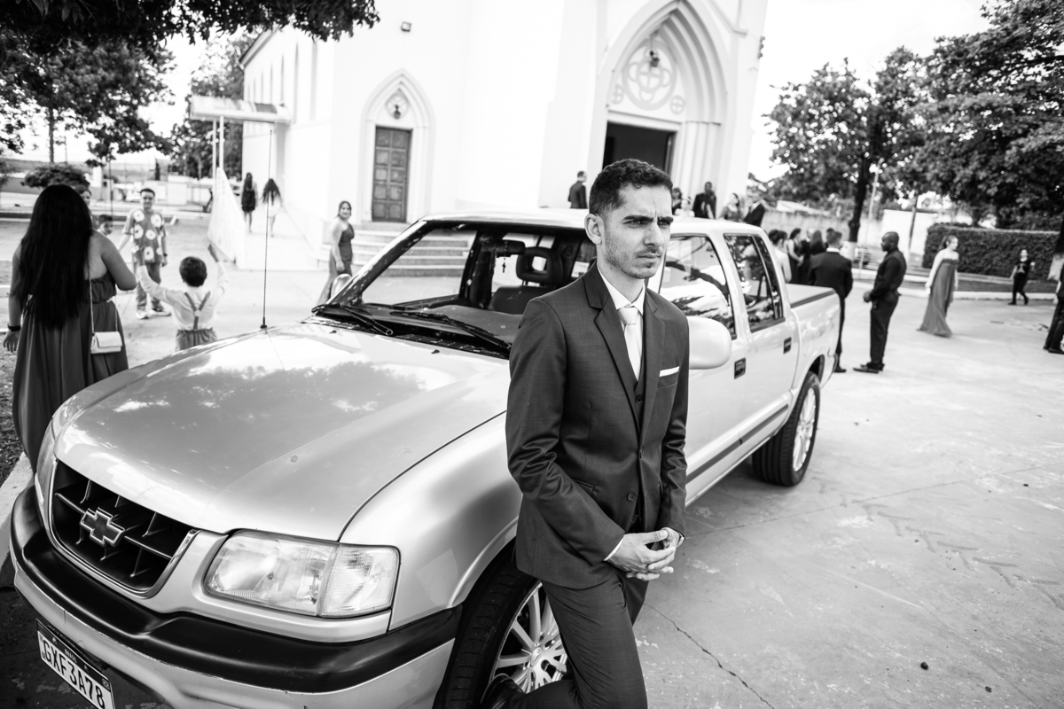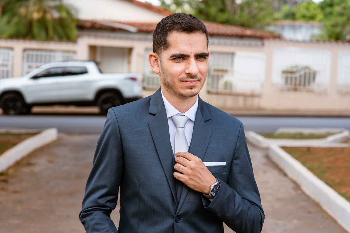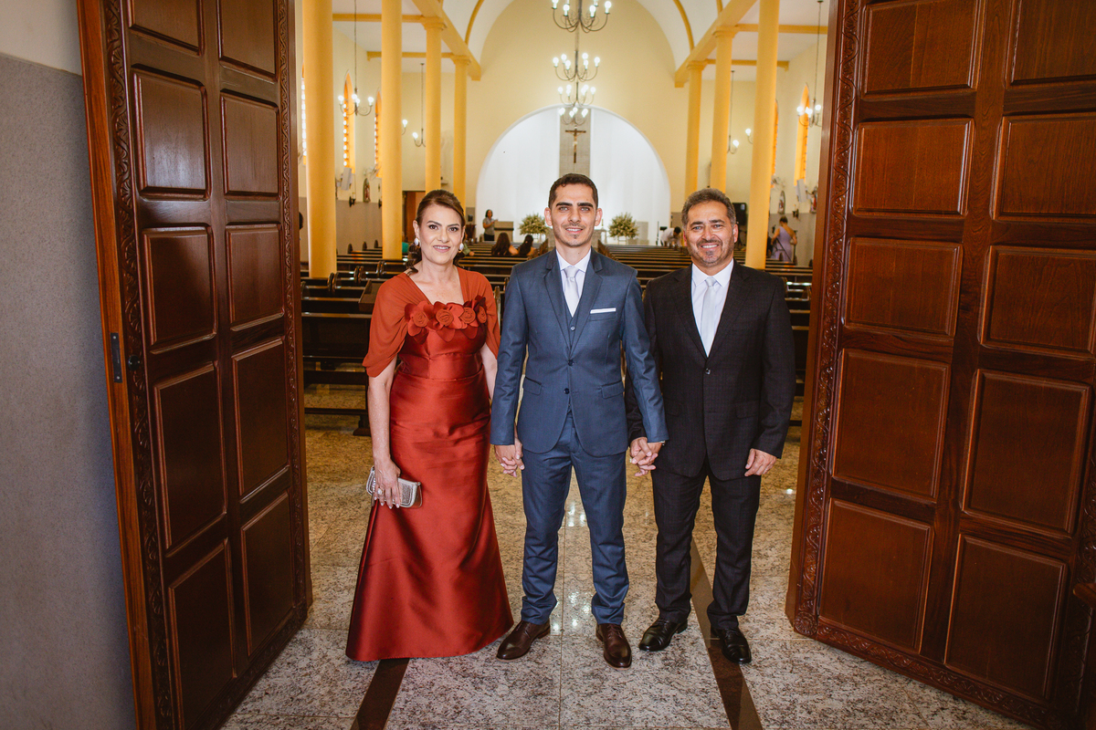 Enquanto ela se arrumava, Murilo foi acompanhar seus padrinhos e amigos na conveniência. Eles fizeram uma boa farra antes de o noivo começar a se arrumar, preparando para a festa mais tarde. Murilo se arrumou em casa, com o auxílio de seu pai. O traje, vindo direto da Alkha Ternos, veio em uma maleta chiquíssima. Ele colocou seu terno, passou seu perfume e fizemos as fotografias com seus parentes que o acompanhavam. Vinda de muito longe, sua irmã fez questão de participar também e dar os últimos ajustes à sua vestimenta. E também fotografar junto de seu irmão querido. Depois das fotos, eles se encaminharam para a Igreja. Lá na porta, padrinhos e convidados estavam chegando aos poucos.