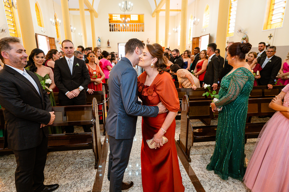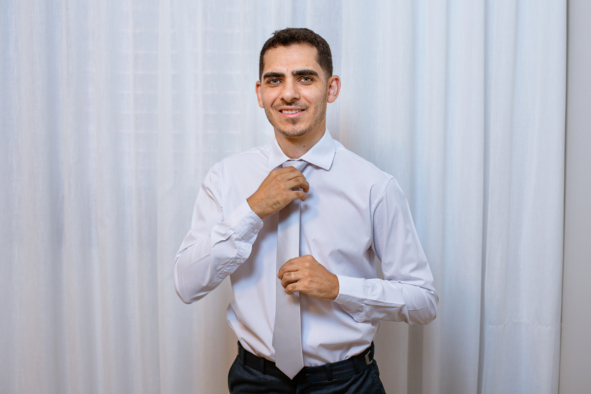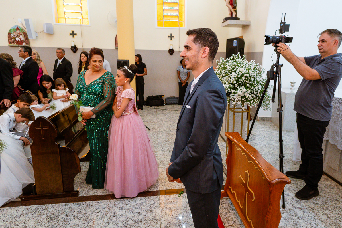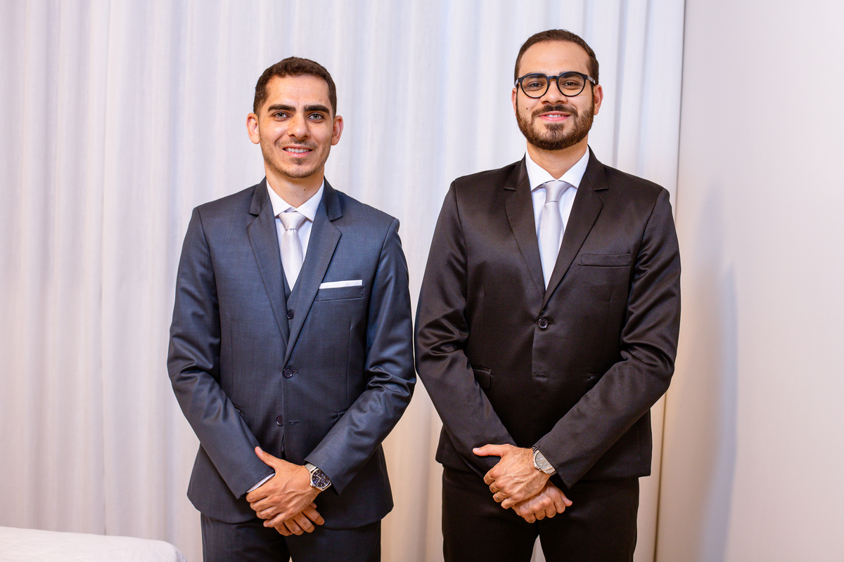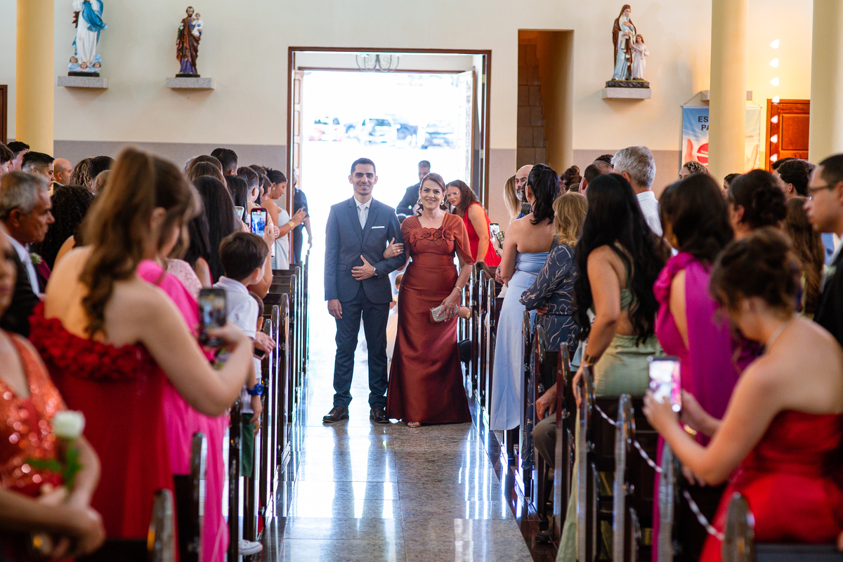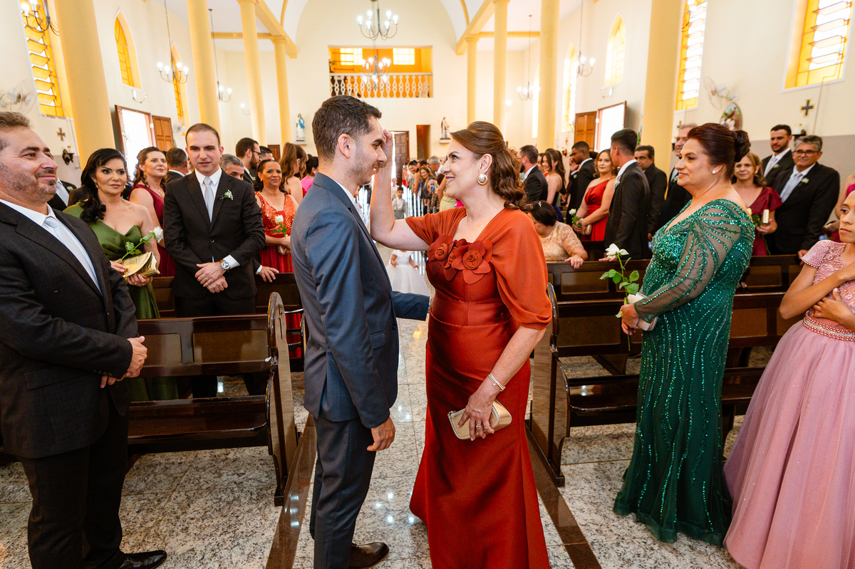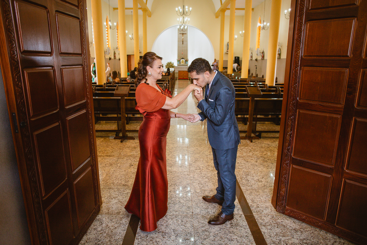 Enquanto ela se arrumava, Murilo foi acompanhar seus padrinhos e amigos na conveniência. Eles fizeram uma boa farra antes de o noivo começar a se arrumar, preparando para a festa mais tarde. Murilo se arrumou em casa, com o auxílio de seu pai. O traje, vindo direto da Alkha Ternos, veio em uma maleta chiquíssima. Ele colocou seu terno, passou seu perfume e fizemos as fotografias com seus parentes que o acompanhavam. Vinda de muito longe, sua irmã fez questão de participar também e dar os últimos ajustes à sua vestimenta. E também fotografar junto de seu irmão querido. Depois das fotos, eles se encaminharam para a Igreja. Lá na porta, padrinhos e convidados estavam chegando aos poucos.