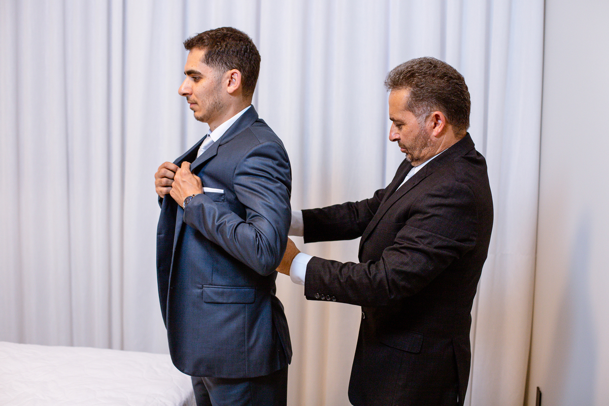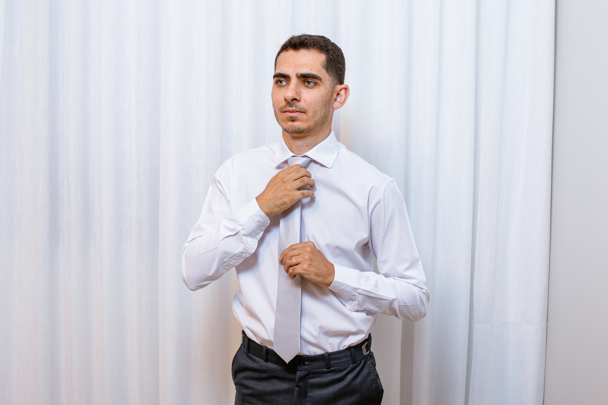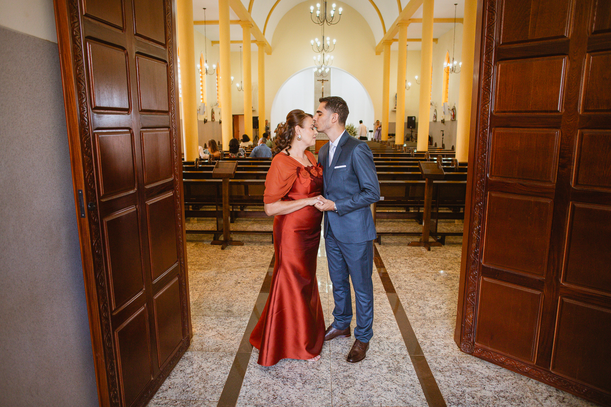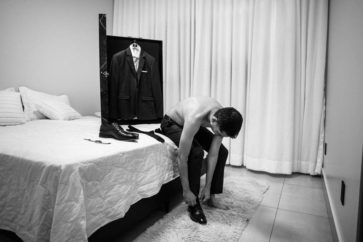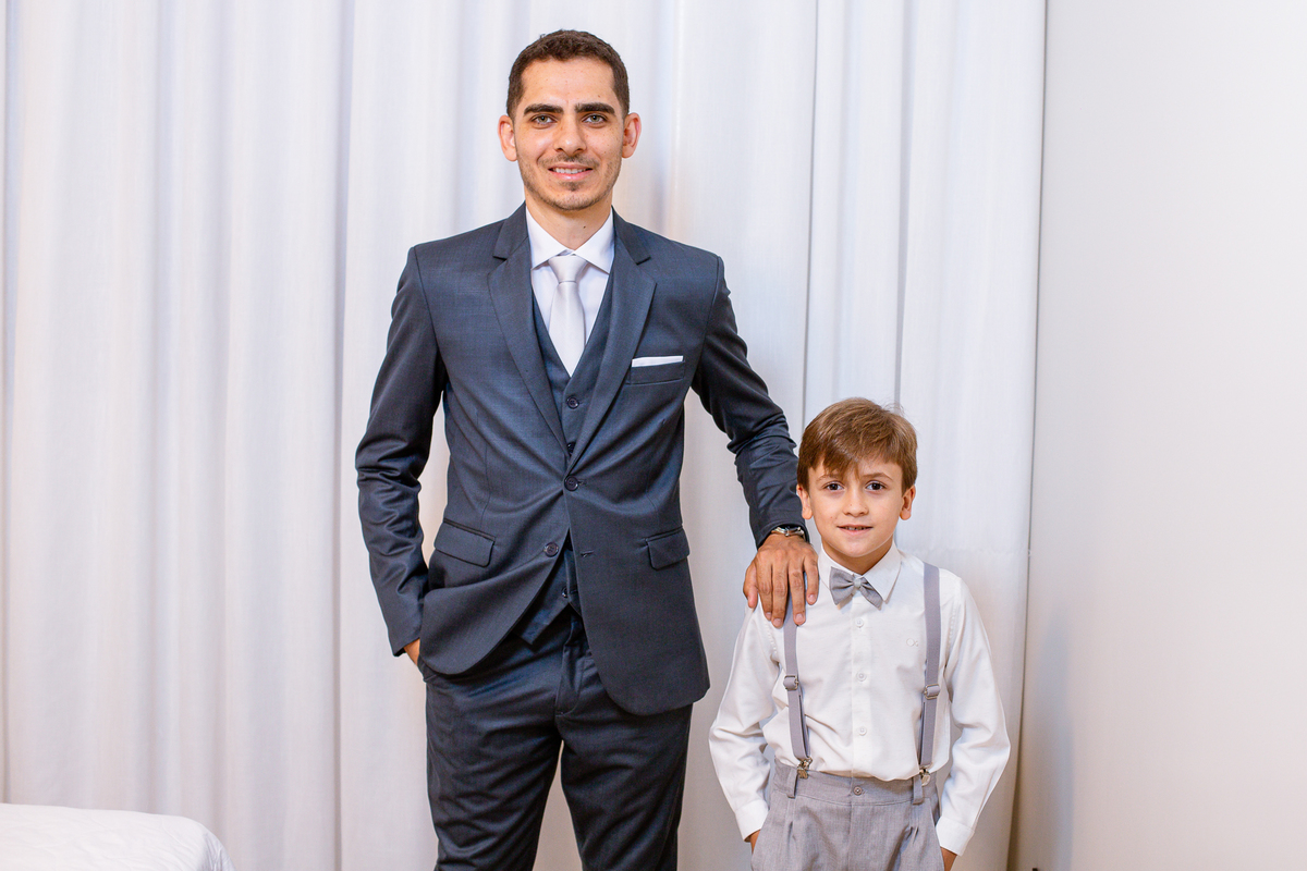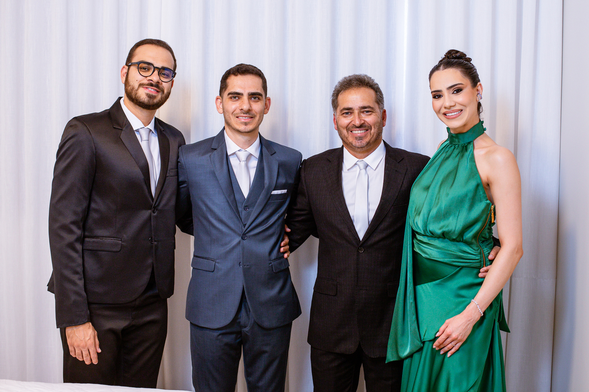 Enquanto ela se arrumava, Murilo foi acompanhar seus padrinhos e amigos na conveniência. Eles fizeram uma boa farra antes de o noivo começar a se arrumar, preparando para a festa mais tarde. Murilo se arrumou em casa, com o auxílio de seu pai. O traje, vindo direto da Alkha Ternos, veio em uma maleta chiquíssima. Ele colocou seu terno, passou seu perfume e fizemos as fotografias com seus parentes que o acompanhavam. Vinda de muito longe, sua irmã fez questão de participar também e dar os últimos ajustes à sua vestimenta. E também fotografar junto de seu irmão querido. Depois das fotos, eles se encaminharam para a Igreja. Lá na porta, padrinhos e convidados estavam chegando aos poucos.