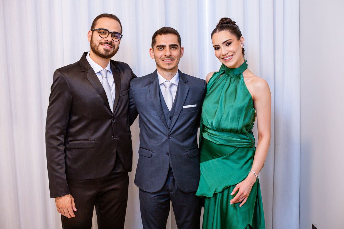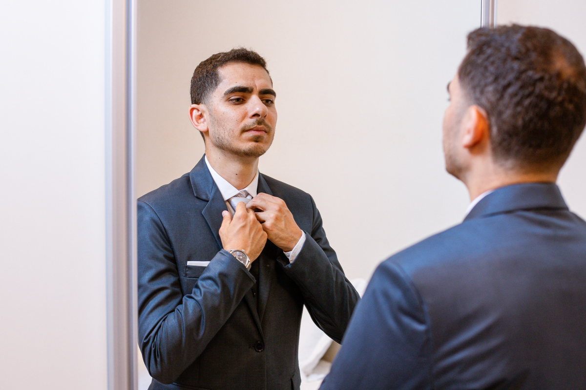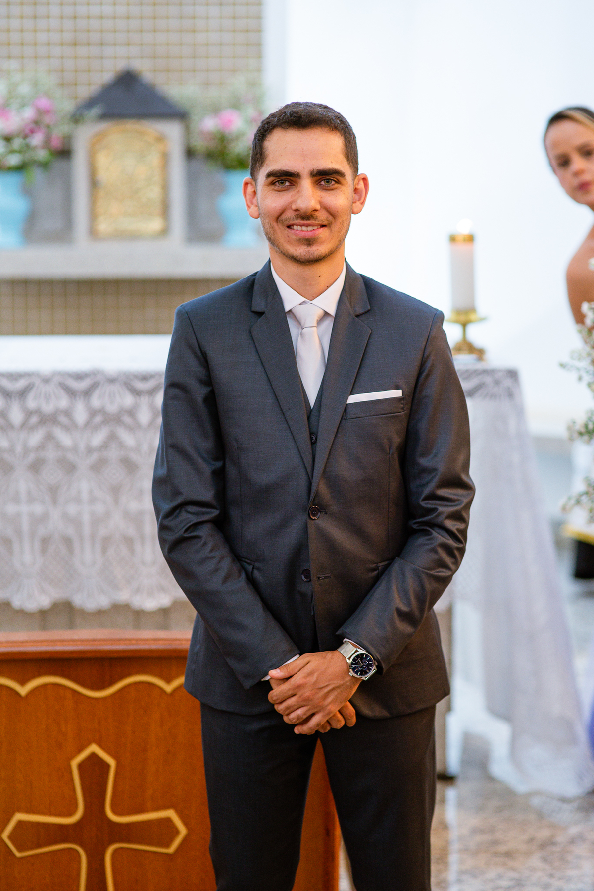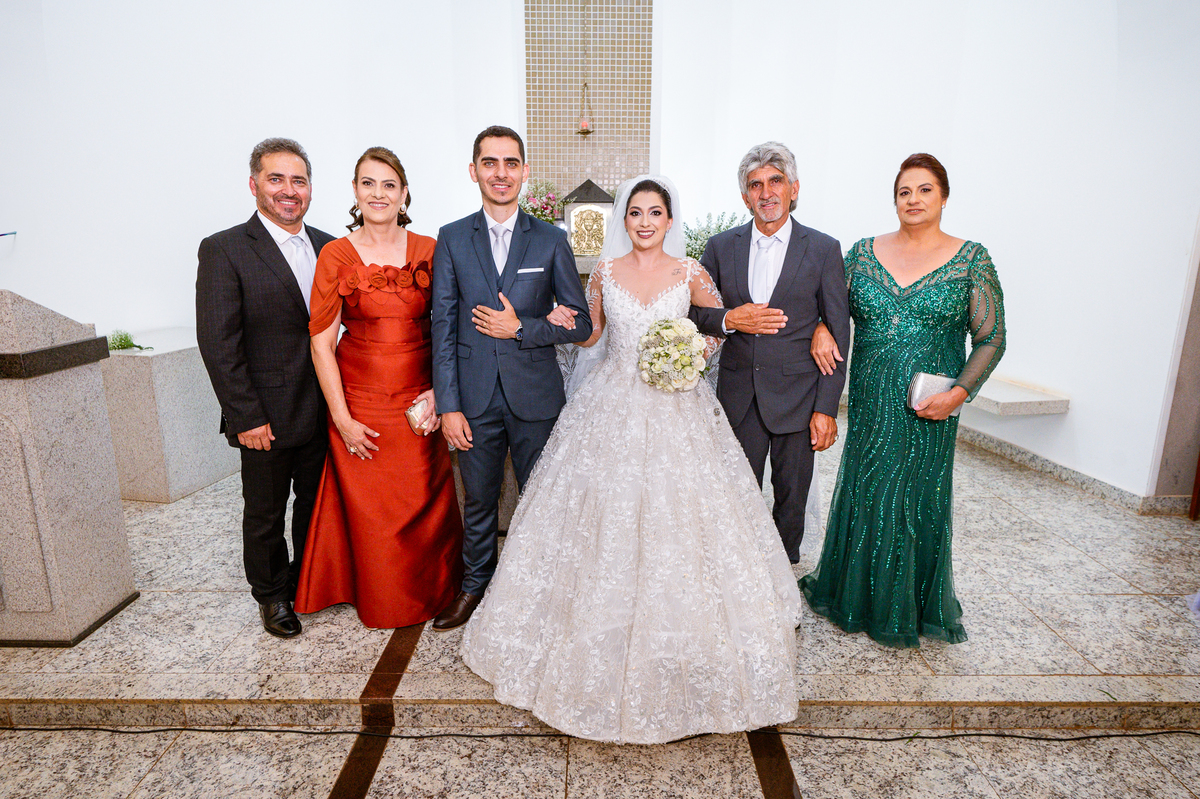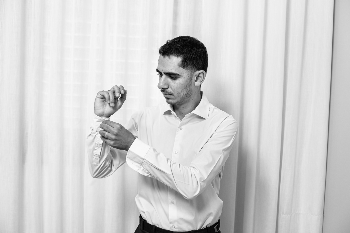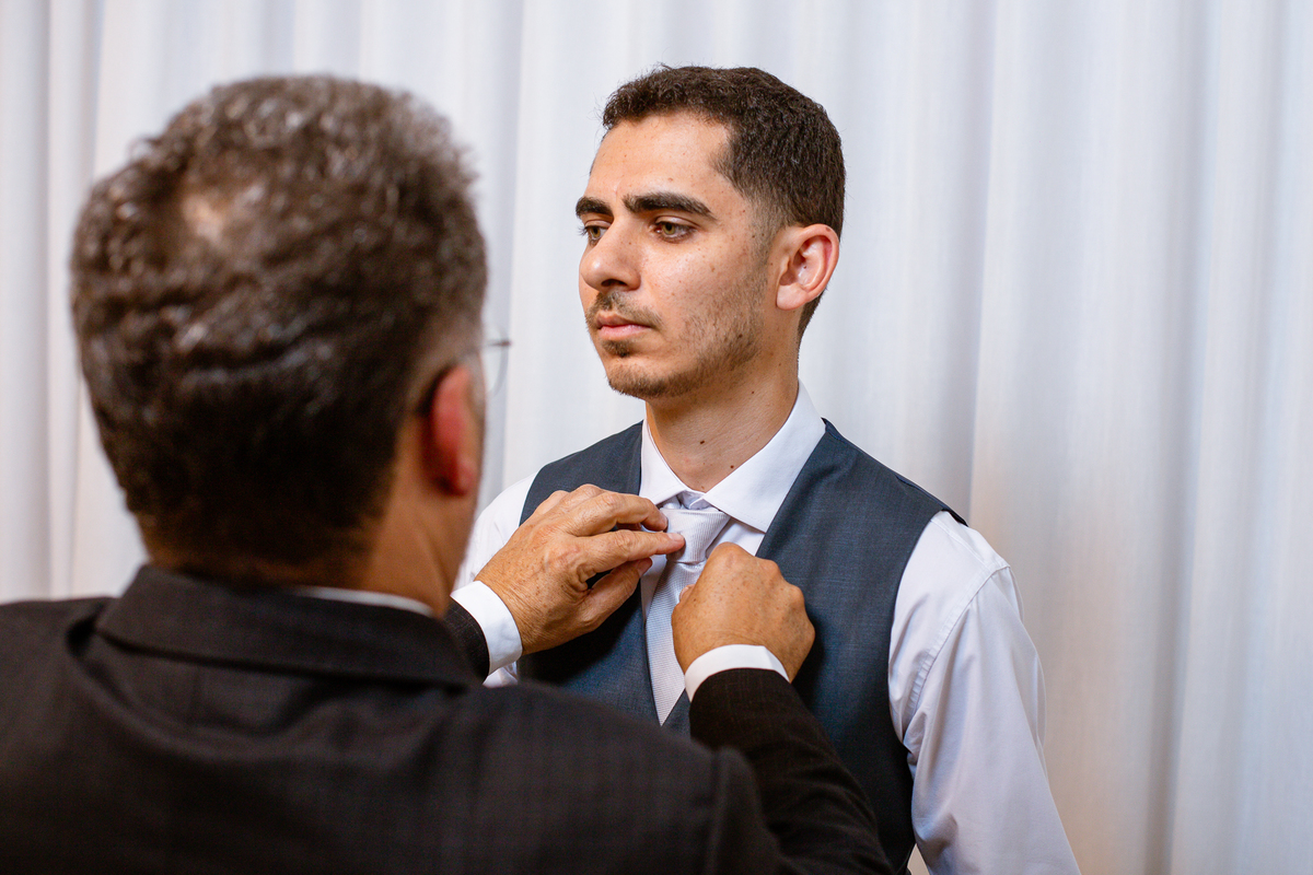 Enquanto ela se arrumava, Murilo foi acompanhar seus padrinhos e amigos na conveniência. Eles fizeram uma boa farra antes de o noivo começar a se arrumar, preparando para a festa mais tarde. Murilo se arrumou em casa, com o auxílio de seu pai. O traje, vindo direto da Alkha Ternos, veio em uma maleta chiquíssima. Ele colocou seu terno, passou seu perfume e fizemos as fotografias com seus parentes que o acompanhavam. Vinda de muito longe, sua irmã fez questão de participar também e dar os últimos ajustes à sua vestimenta. E também fotografar junto de seu irmão querido. Depois das fotos, eles se encaminharam para a Igreja. Lá na porta, padrinhos e convidados estavam chegando aos poucos.