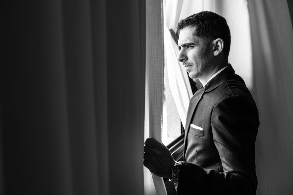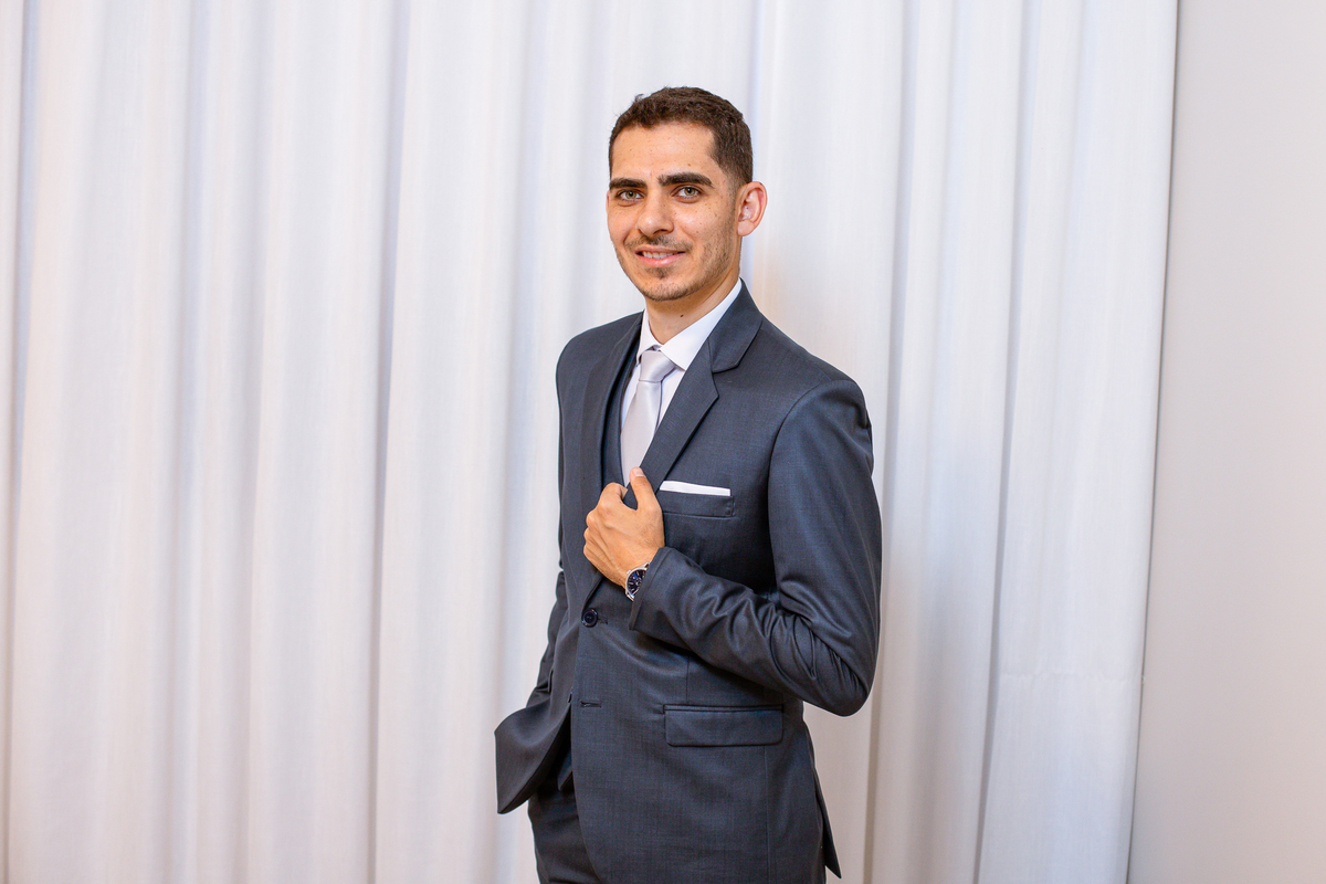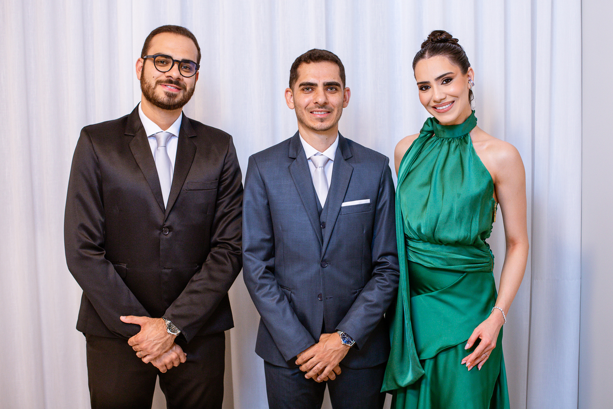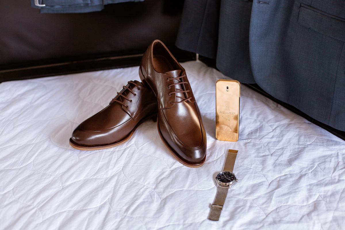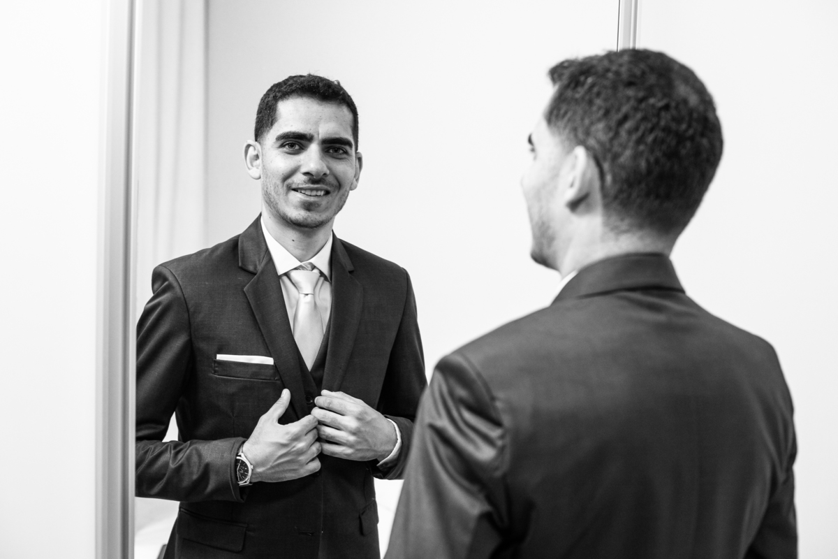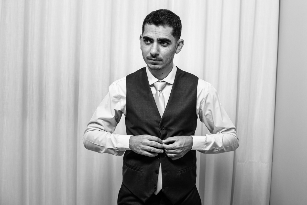 Enquanto ela se arrumava, Murilo foi acompanhar seus padrinhos e amigos na conveniência. Eles fizeram uma boa farra antes de o noivo começar a se arrumar, preparando para a festa mais tarde. Murilo se arrumou em casa, com o auxílio de seu pai. O traje, vindo direto da Alkha Ternos, veio em uma maleta chiquíssima. Ele colocou seu terno, passou seu perfume e fizemos as fotografias com seus parentes que o acompanhavam. Vinda de muito longe, sua irmã fez questão de participar também e dar os últimos ajustes à sua vestimenta. E também fotografar junto de seu irmão querido. Depois das fotos, eles se encaminharam para a Igreja. Lá na porta, padrinhos e convidados estavam chegando aos poucos.