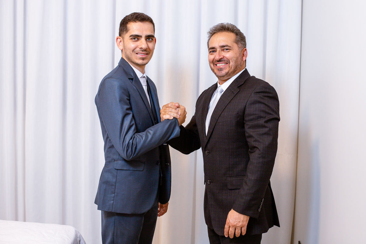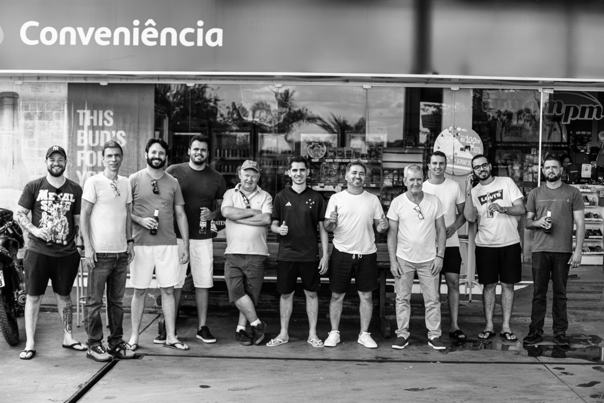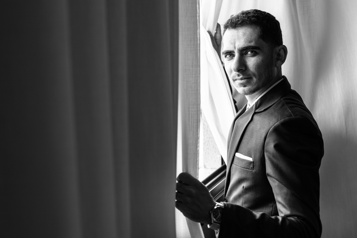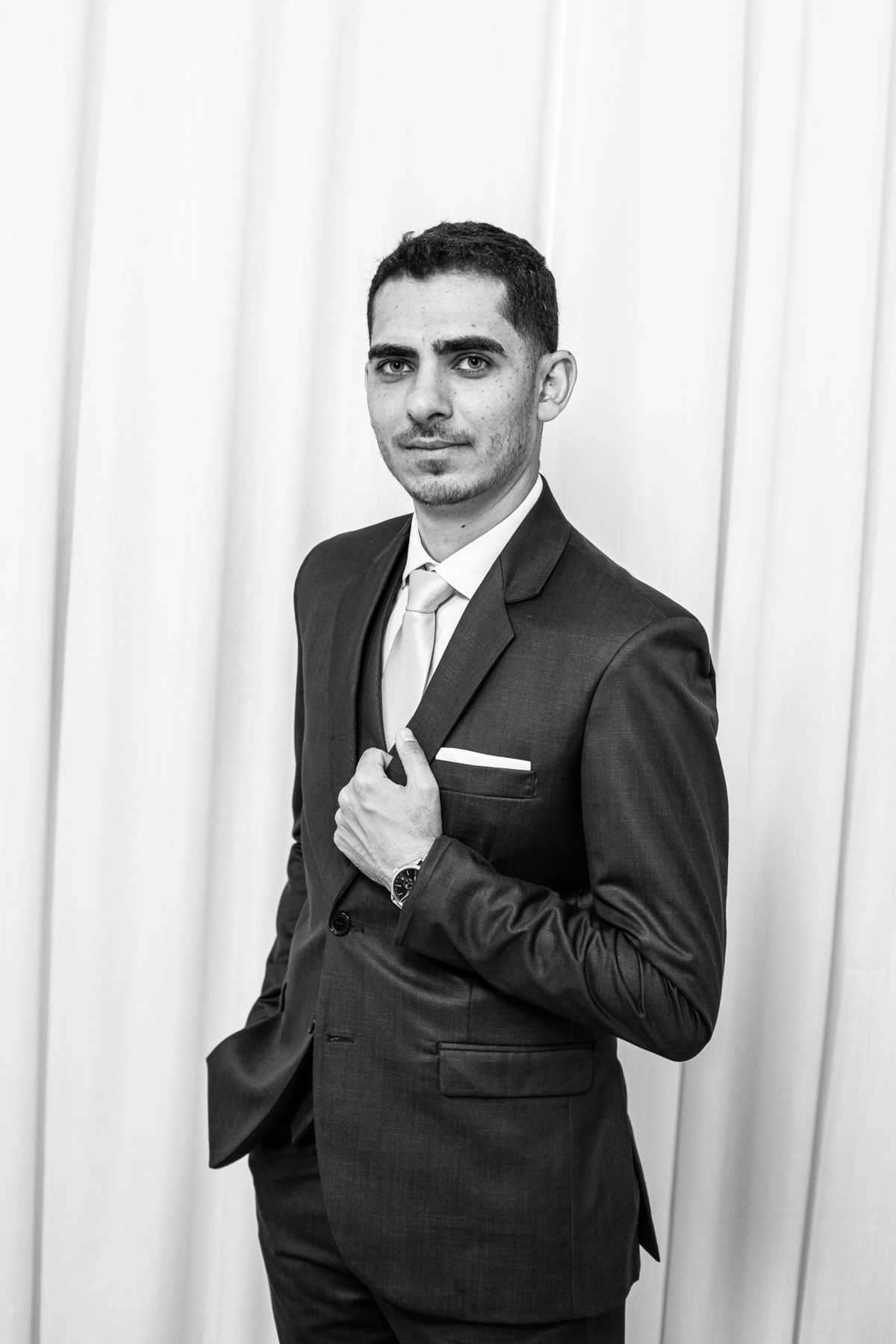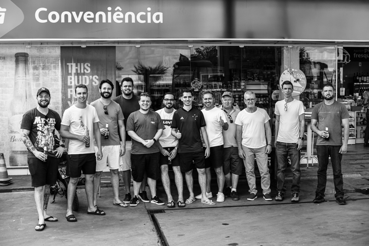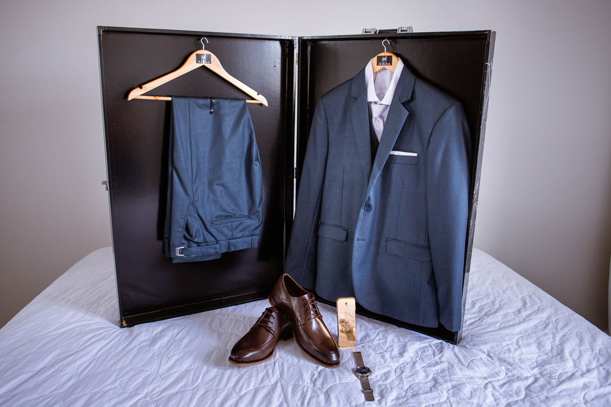 Enquanto ela se arrumava, Murilo foi acompanhar seus padrinhos e amigos na conveniência. Eles fizeram uma boa farra antes de o noivo começar a se arrumar, preparando para a festa mais tarde. Murilo se arrumou em casa, com o auxílio de seu pai. O traje, vindo direto da Alkha Ternos, veio em uma maleta chiquíssima. Ele colocou seu terno, passou seu perfume e fizemos as fotografias com seus parentes que o acompanhavam. Vinda de muito longe, sua irmã fez questão de participar também e dar os últimos ajustes à sua vestimenta. E também fotografar junto de seu irmão querido. Depois das fotos, eles se encaminharam para a Igreja. Lá na porta, padrinhos e convidados estavam chegando aos poucos.