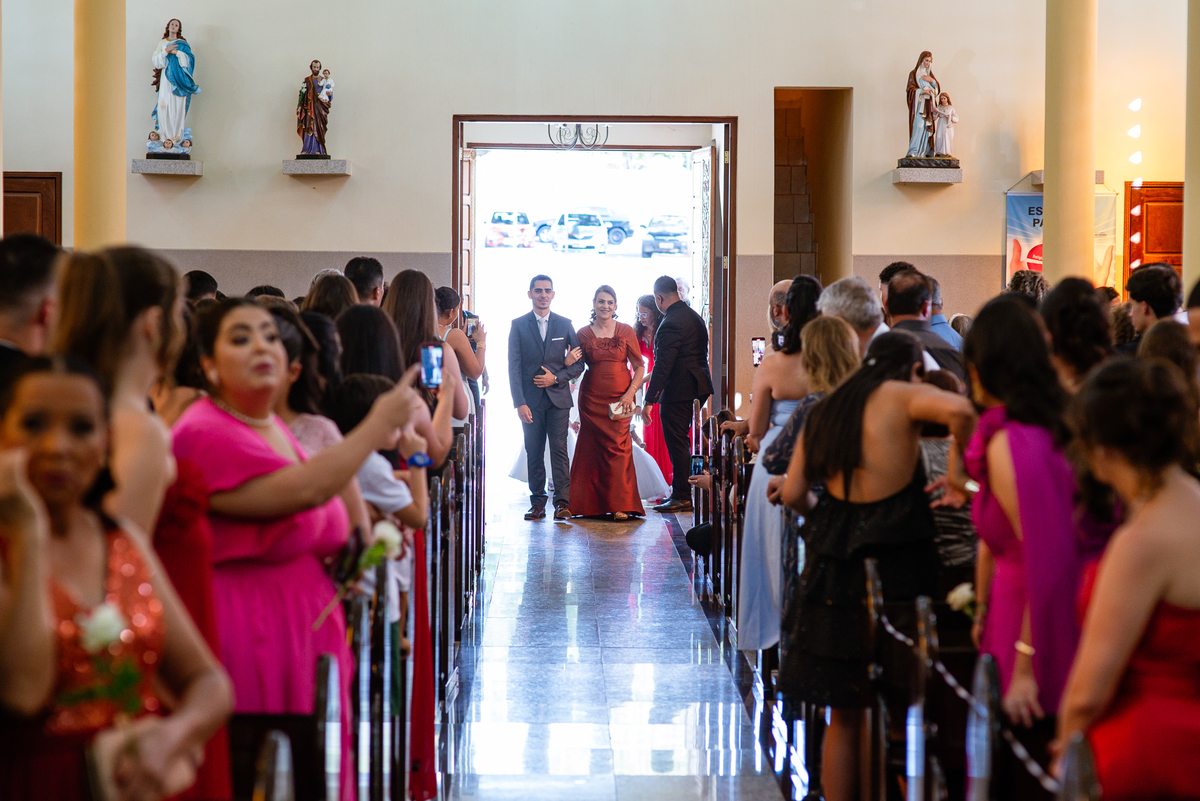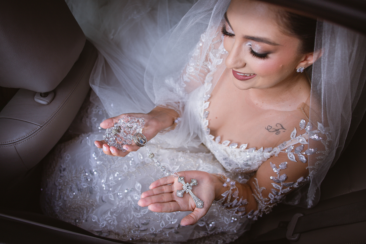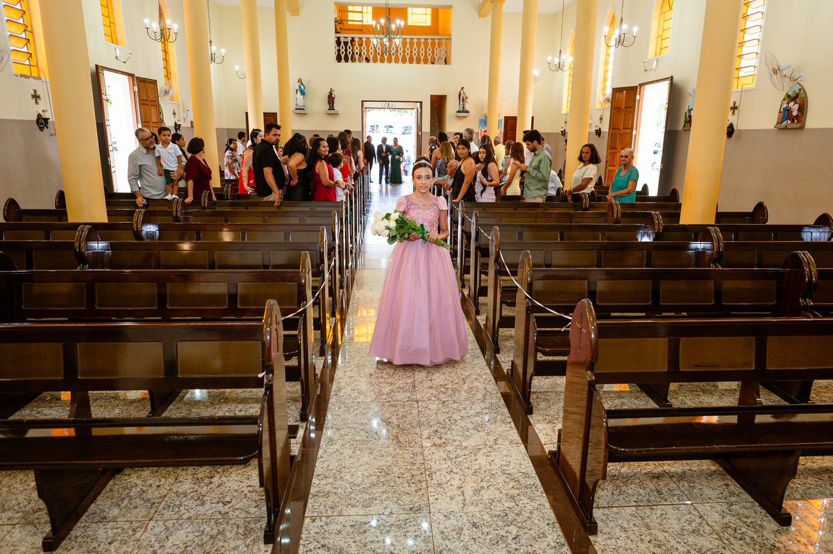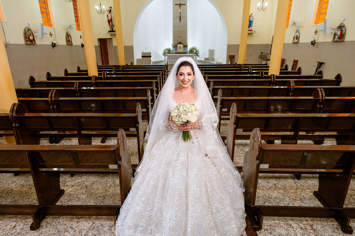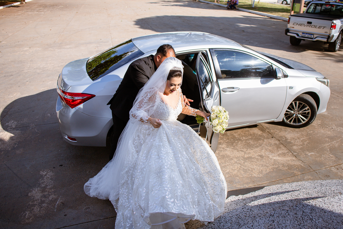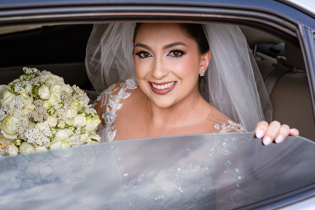 No salão, Amanda estava praticamente pronta. Era hora de colocar seu vestido. Em alguns minutos ela surgiu pronta, com seu penteado e make belíssimos e o vestido divo colocado em seu corpo. Enfim, era hora dos últimos retoques para partimos para a Igreja. Mas ainda tivemos tempo de surpresas! Até então, ela não havia visto seu buquê, e quem fez essa entrega foi a sua mãe. Quando Amanda recebeu, ela sorriu de canto a canto do rosto. Havia ficado muito além de suas expectativas. Agora o conjunto estava completo e a noiva pronta. Fizemos nossas tradicionais fotografias da noiva pronta e já seguimos pra celebração. Chegando na Igreja, os padrinhos já estavam todos alinhados pela equipe cerimonial. Fizemos as fotografias da noiva no carro e já partimos pro altar. A equipe musical estava aguardando o início e tão logo chegamos eles começaram a cantar.