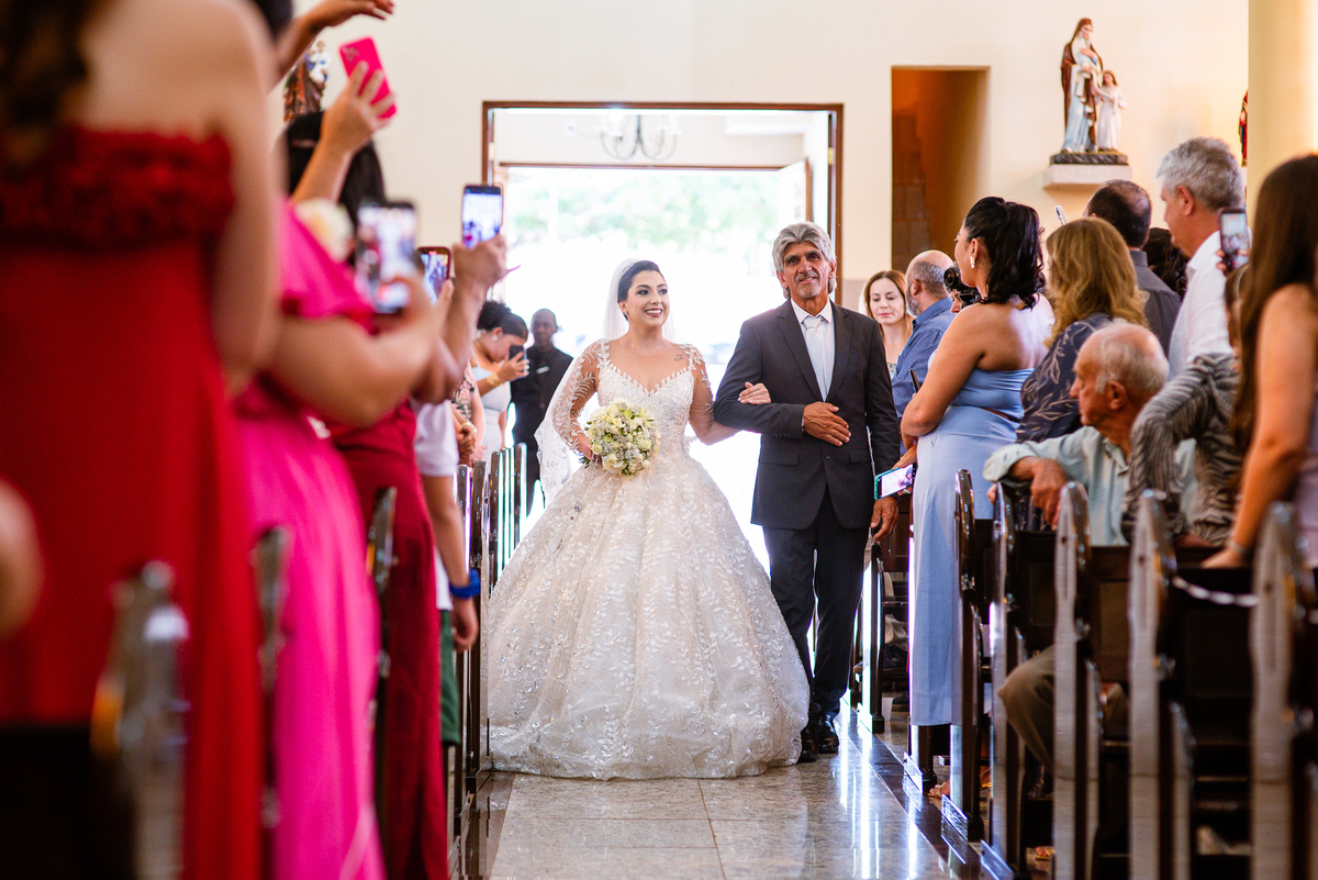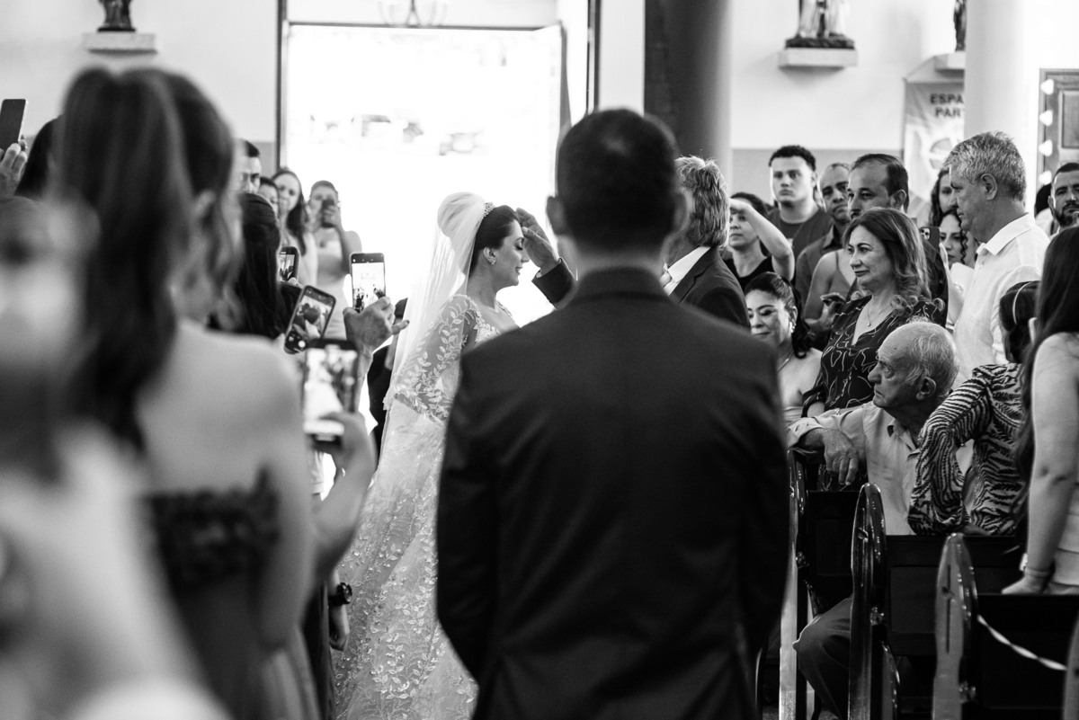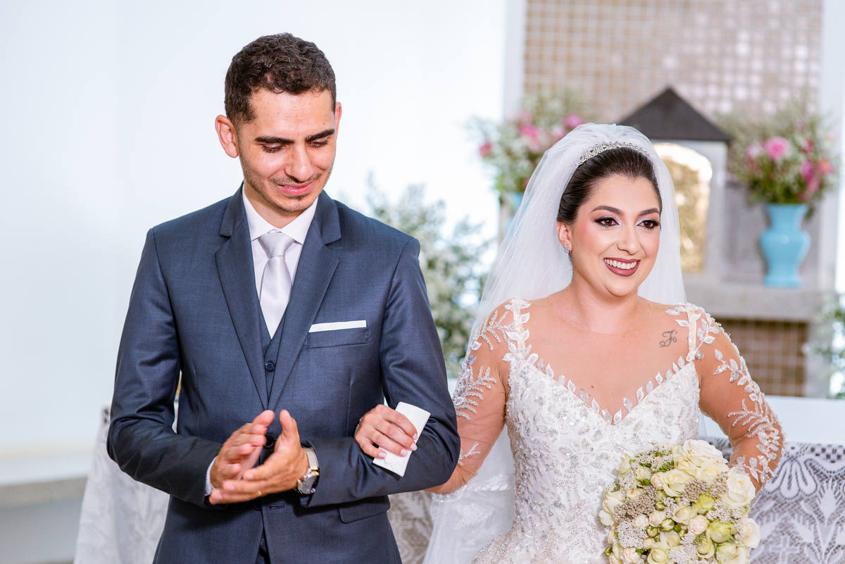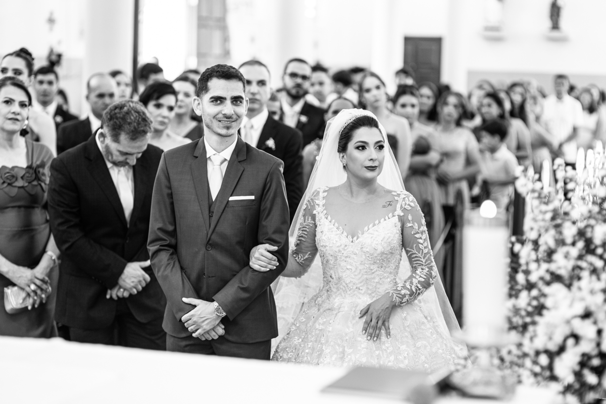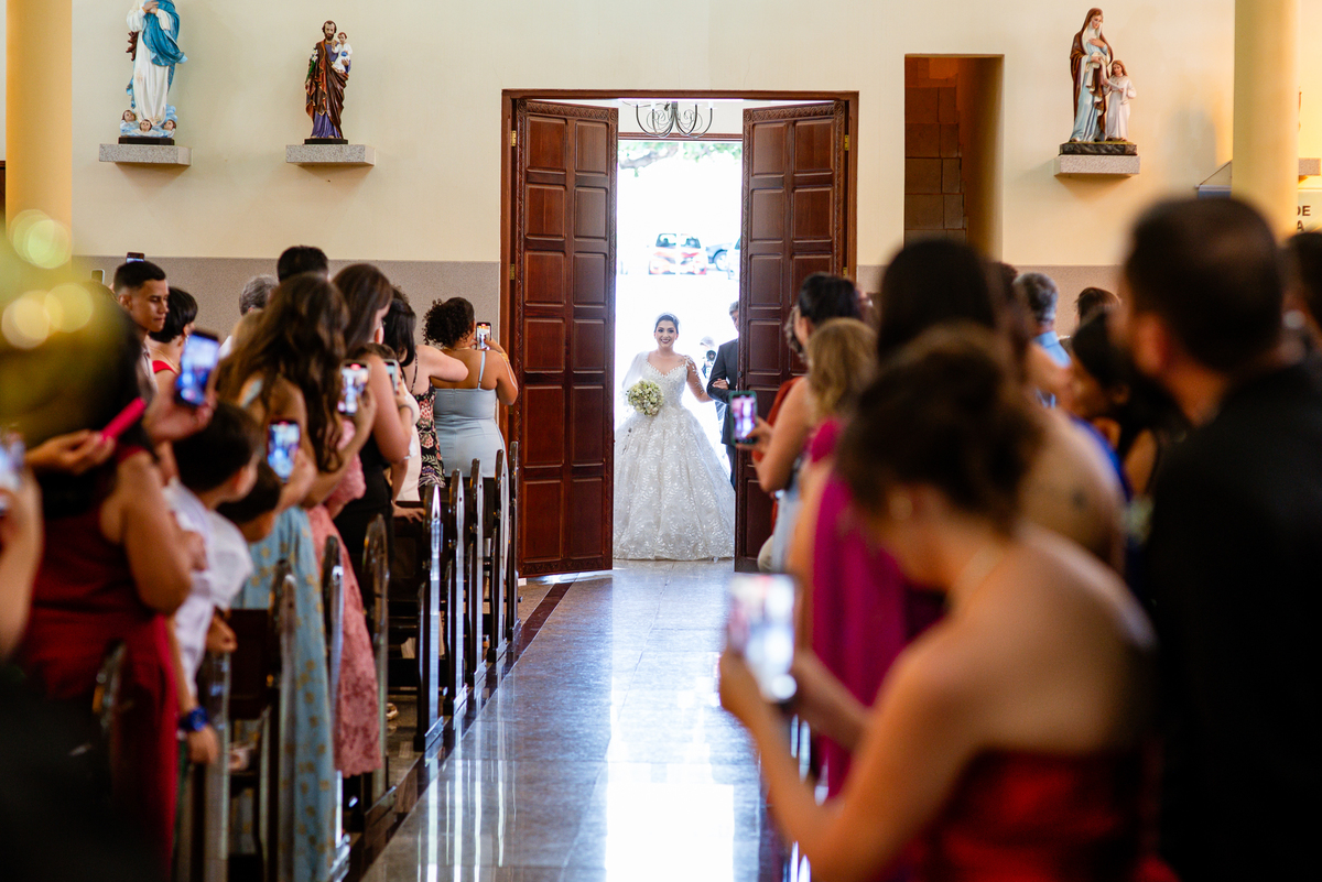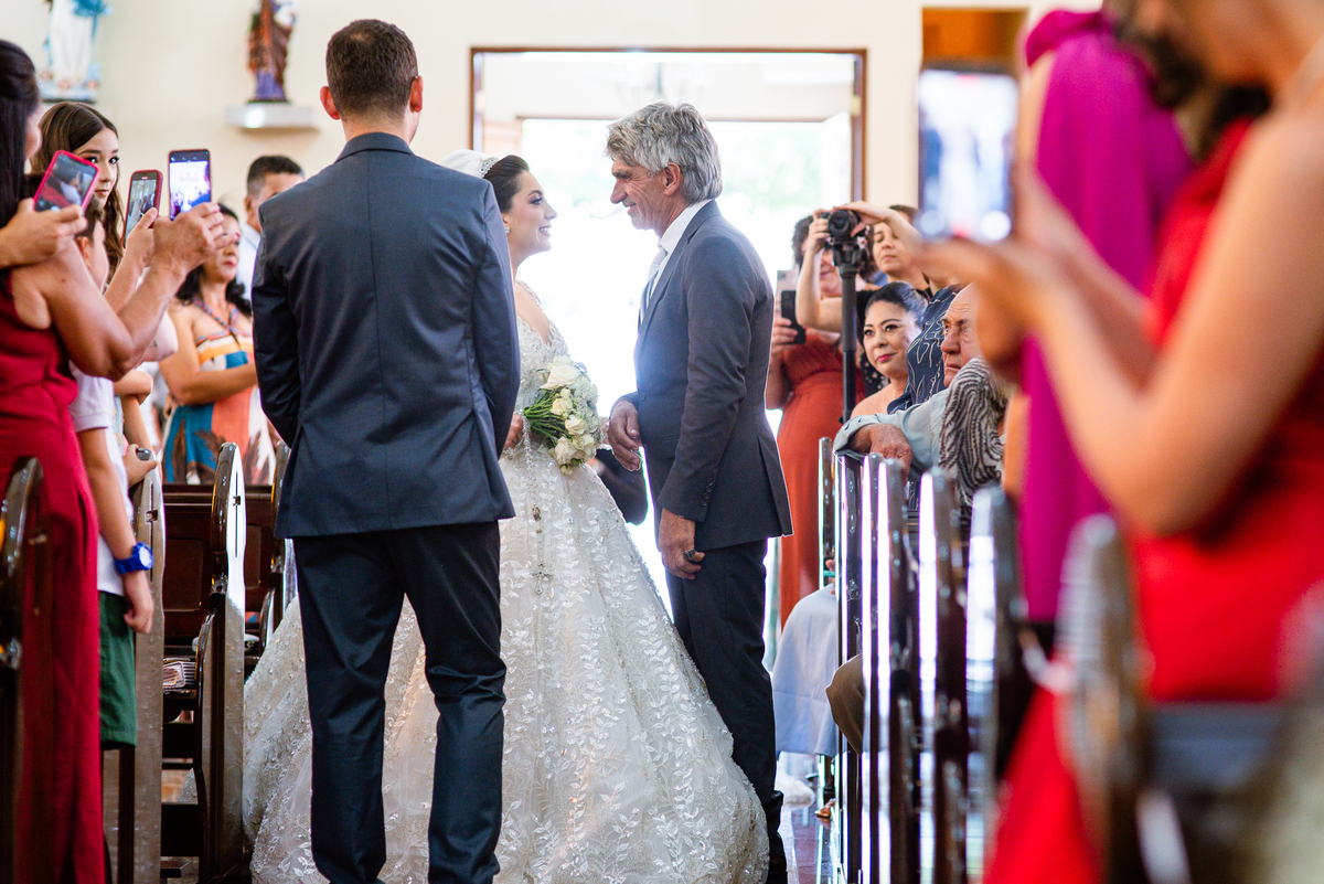 No salão, Amanda estava praticamente pronta. Era hora de colocar seu vestido. Em alguns minutos ela surgiu pronta, com seu penteado e make belíssimos e o vestido divo colocado em seu corpo. Enfim, era hora dos últimos retoques para partimos para a Igreja. Mas ainda tivemos tempo de surpresas! Até então, ela não havia visto seu buquê, e quem fez essa entrega foi a sua mãe. Quando Amanda recebeu, ela sorriu de canto a canto do rosto. Havia ficado muito além de suas expectativas. Agora o conjunto estava completo e a noiva pronta. Fizemos nossas tradicionais fotografias da noiva pronta e já seguimos pra celebração. Chegando na Igreja, os padrinhos já estavam todos alinhados pela equipe cerimonial. Fizemos as fotografias da noiva no carro e já partimos pro altar. A equipe musical estava aguardando o início e tão logo chegamos eles começaram a cantar.