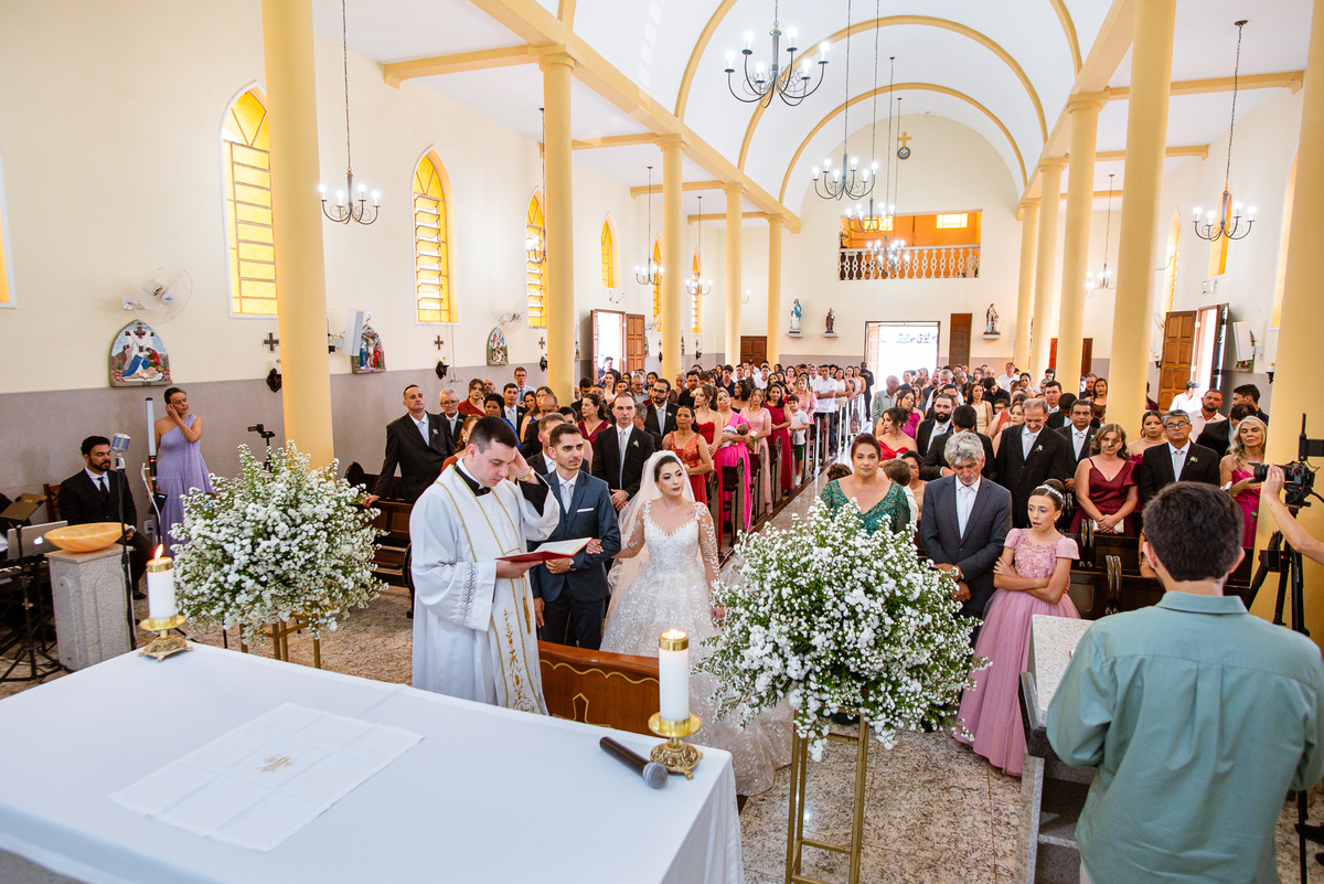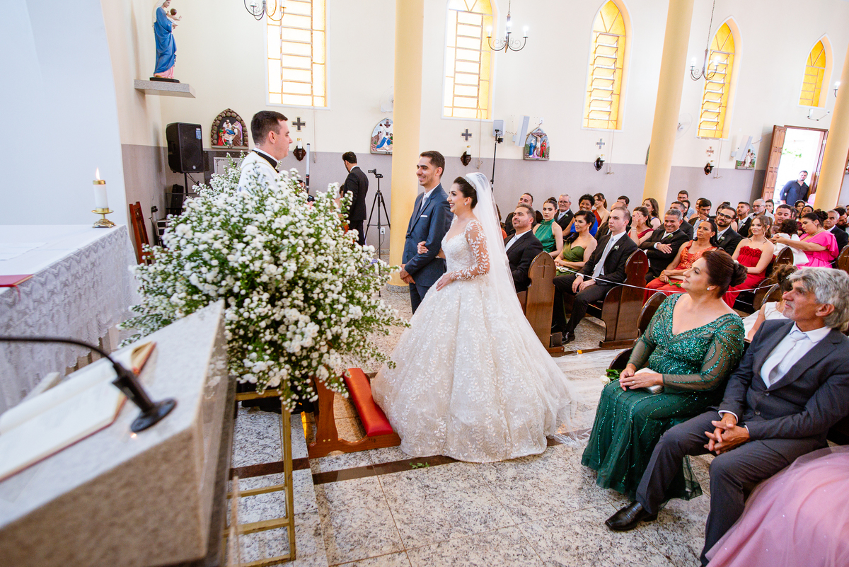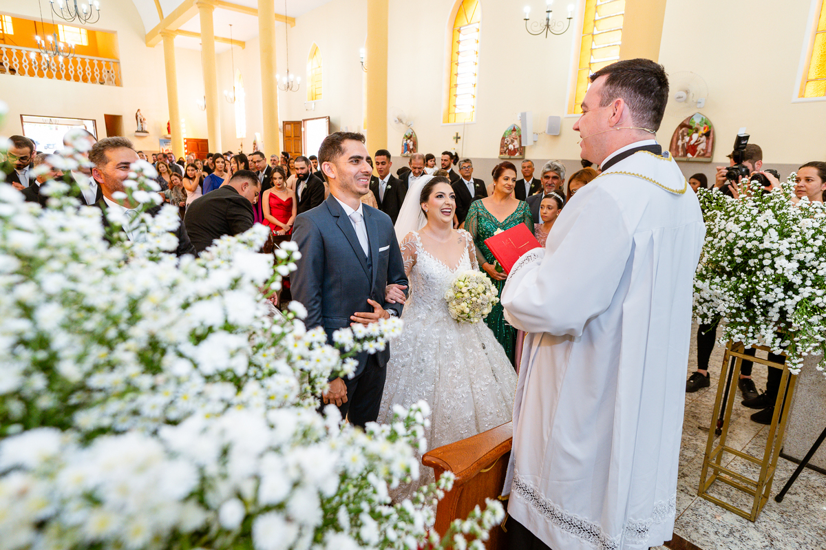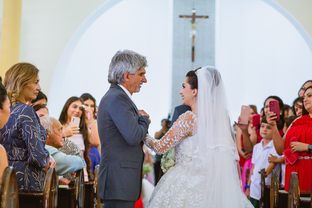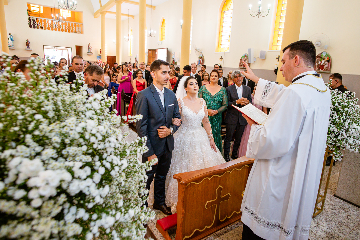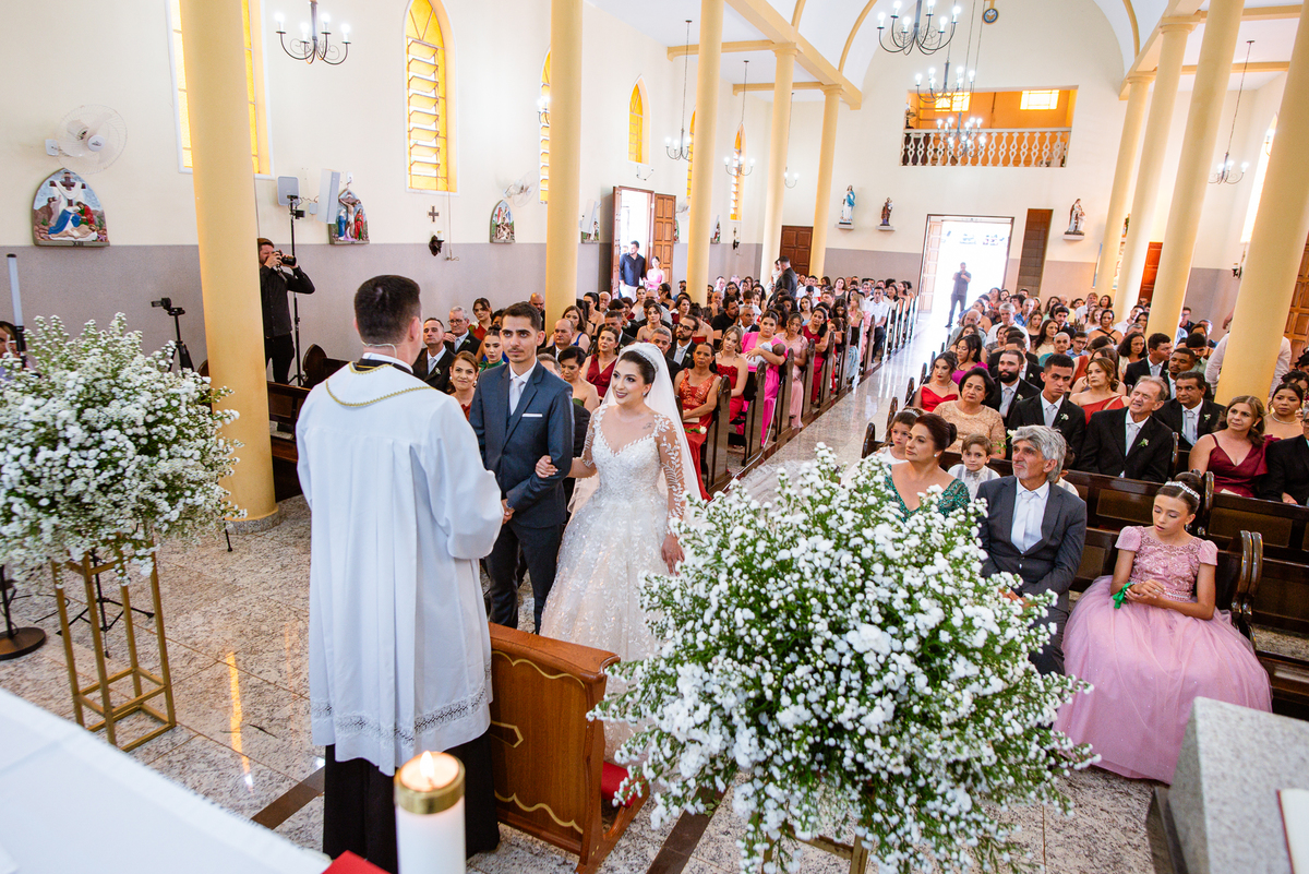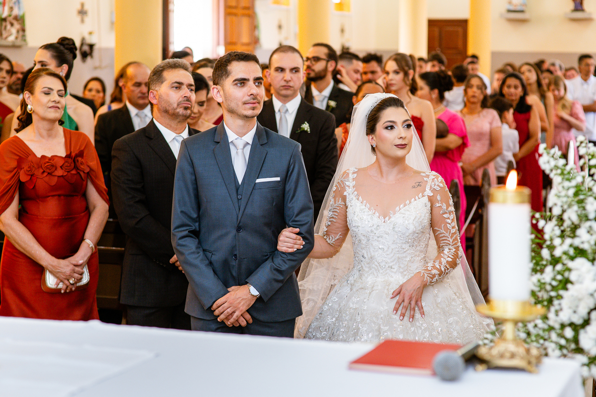 No salão, Amanda estava praticamente pronta. Era hora de colocar seu vestido. Em alguns minutos ela surgiu pronta, com seu penteado e make belíssimos e o vestido divo colocado em seu corpo. Enfim, era hora dos últimos retoques para partimos para a Igreja. Mas ainda tivemos tempo de surpresas! Até então, ela não havia visto seu buquê, e quem fez essa entrega foi a sua mãe. Quando Amanda recebeu, ela sorriu de canto a canto do rosto. Havia ficado muito além de suas expectativas. Agora o conjunto estava completo e a noiva pronta. Fizemos nossas tradicionais fotografias da noiva pronta e já seguimos pra celebração. Chegando na Igreja, os padrinhos já estavam todos alinhados pela equipe cerimonial. Fizemos as fotografias da noiva no carro e já partimos pro altar. A equipe musical estava aguardando o início e tão logo chegamos eles começaram a cantar.