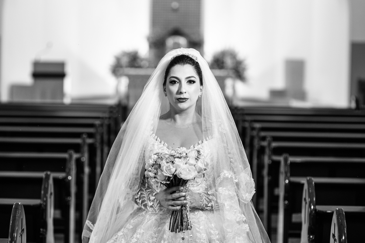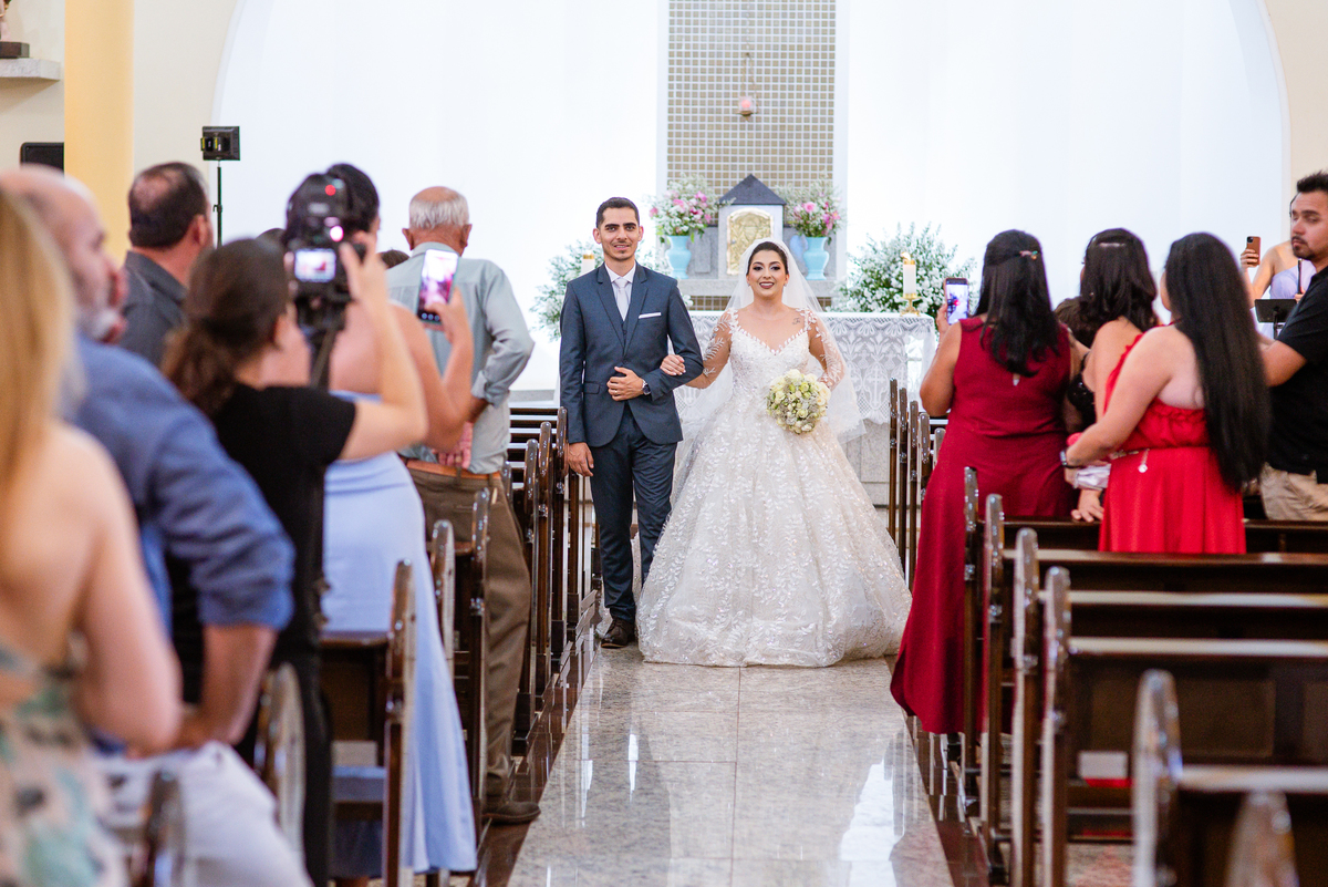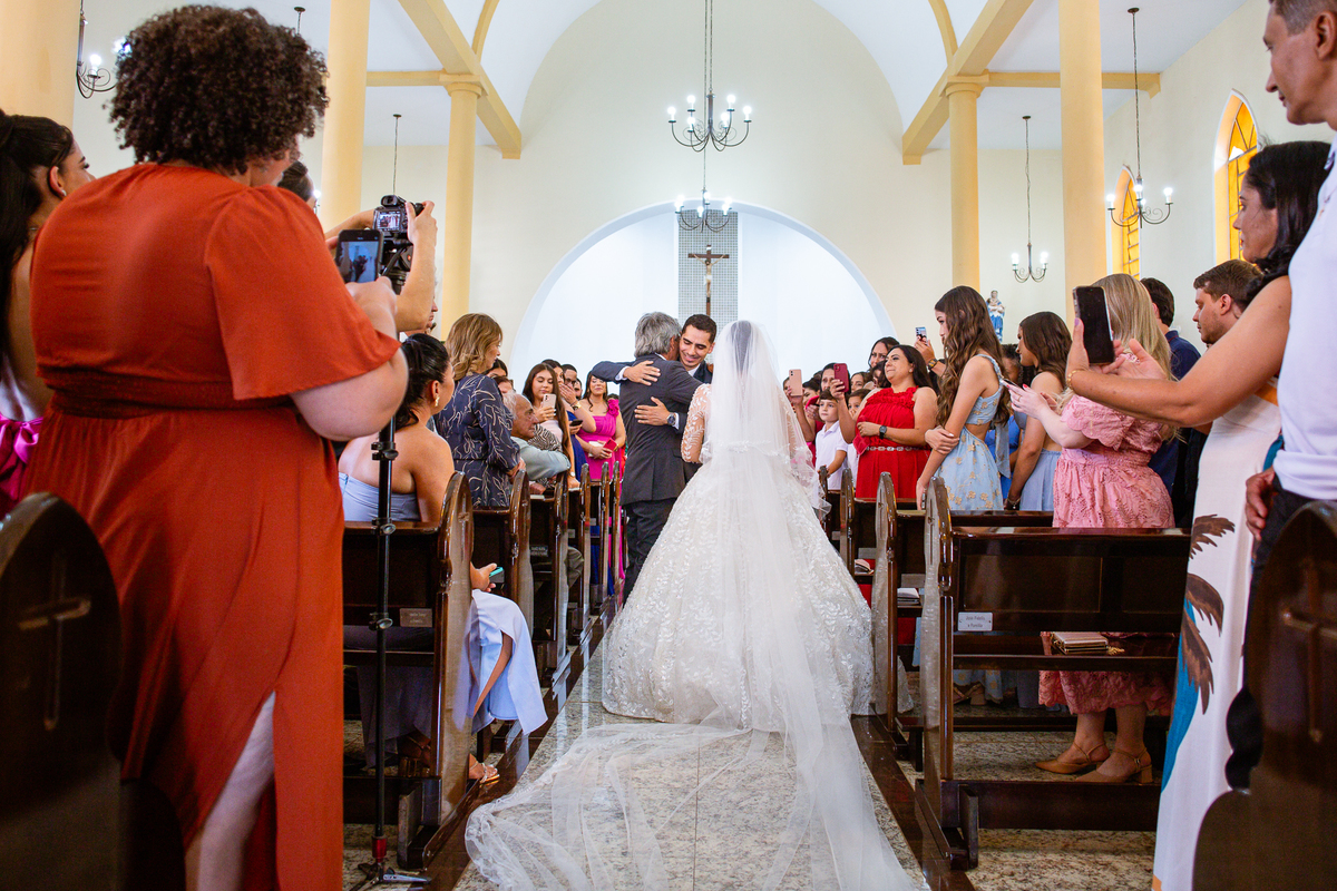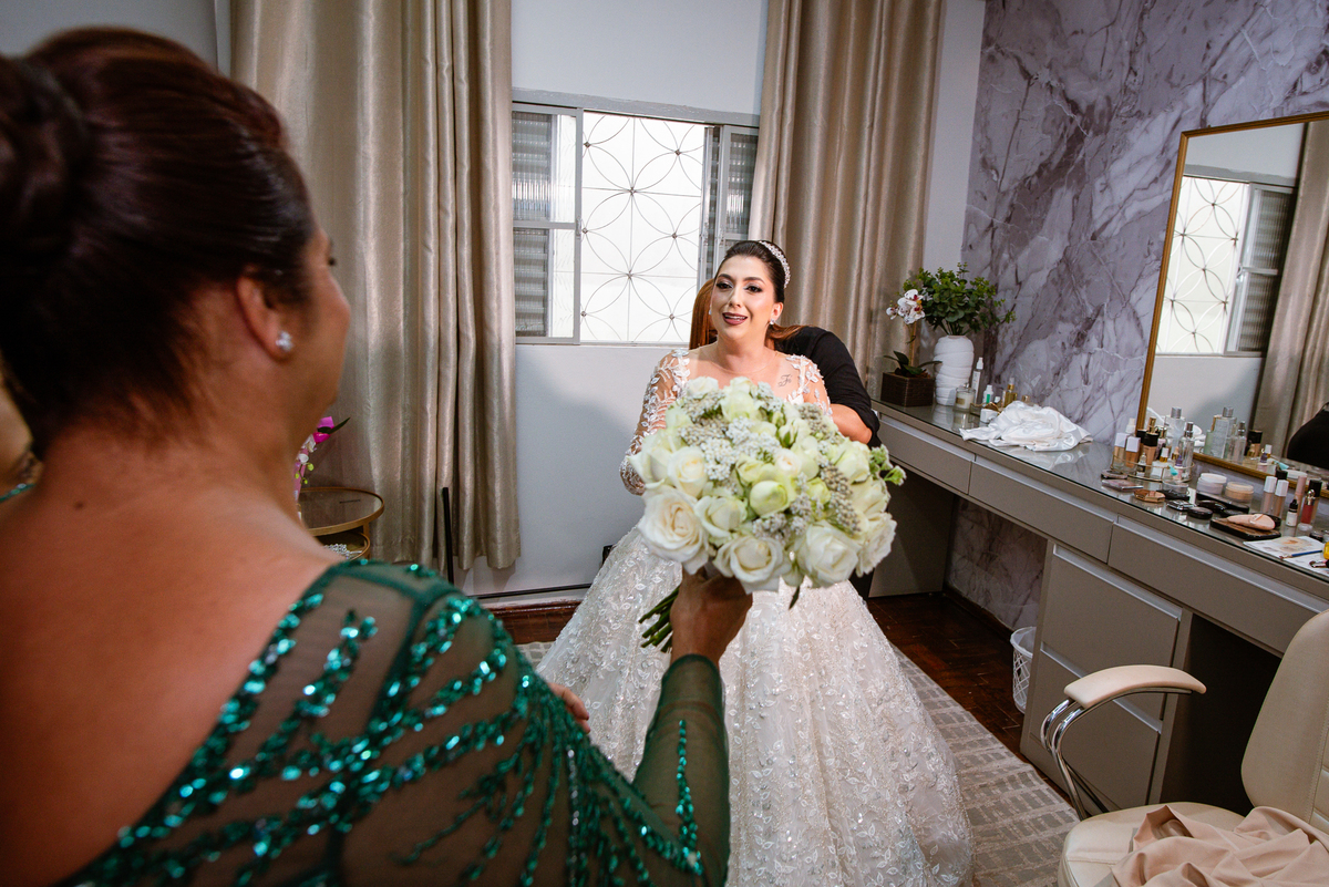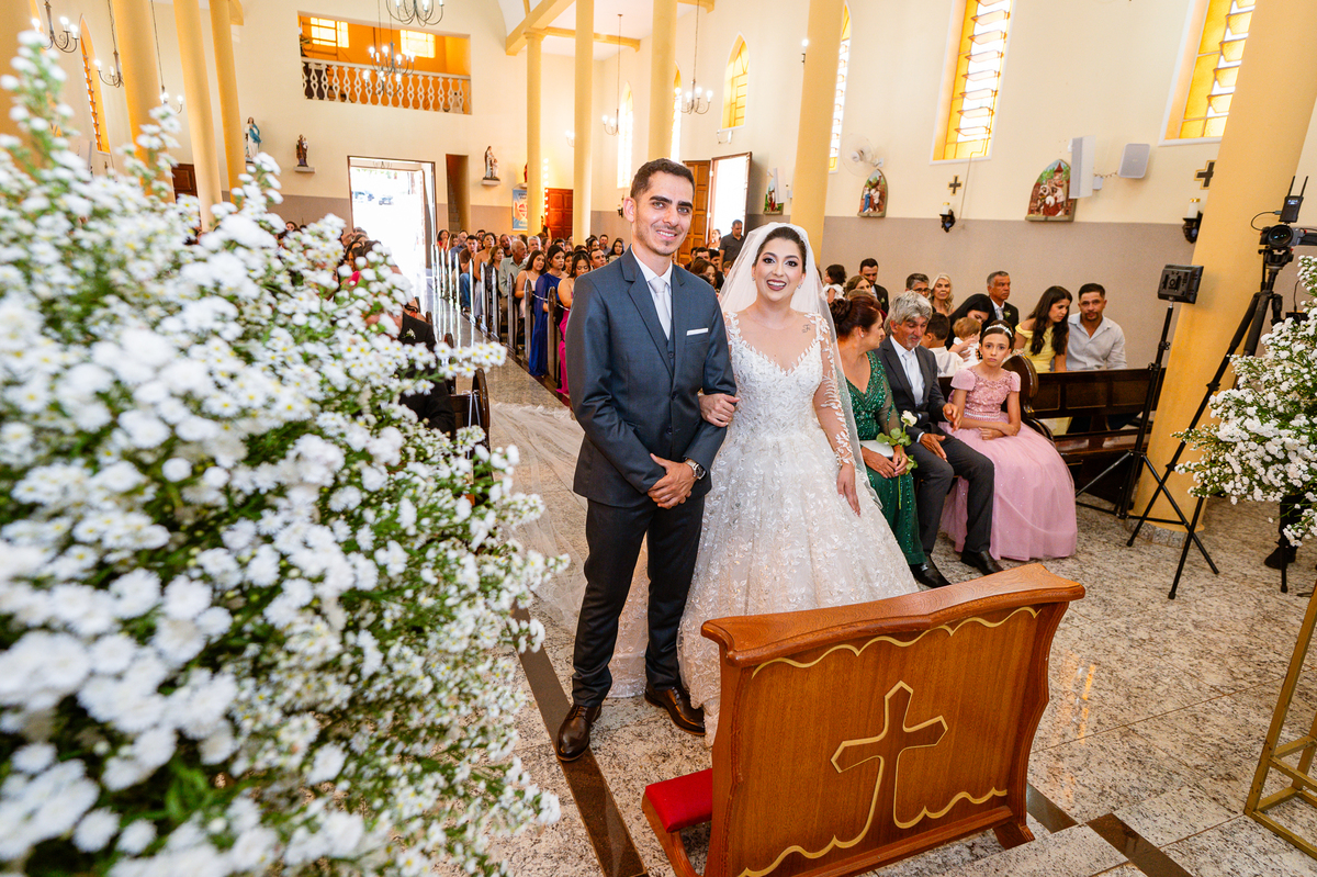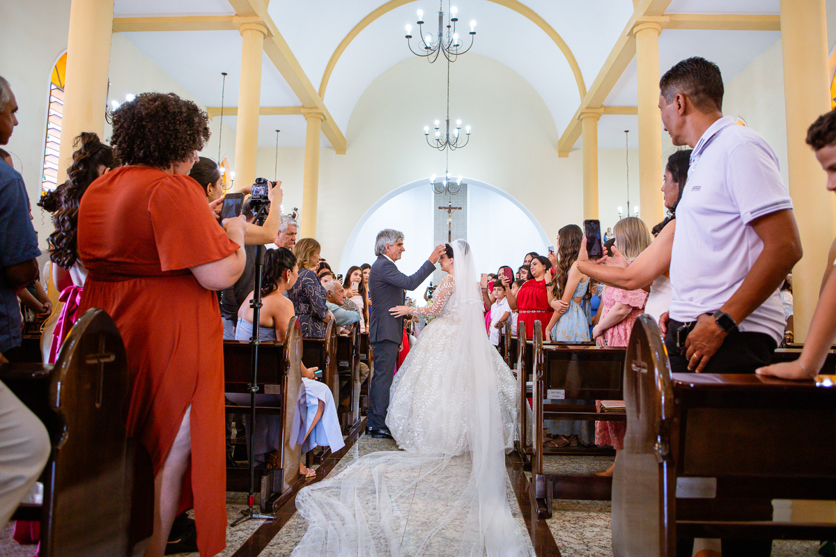 No salão, Amanda estava praticamente pronta. Era hora de colocar seu vestido. Em alguns minutos ela surgiu pronta, com seu penteado e make belíssimos e o vestido divo colocado em seu corpo. Enfim, era hora dos últimos retoques para partimos para a Igreja. Mas ainda tivemos tempo de surpresas! Até então, ela não havia visto seu buquê, e quem fez essa entrega foi a sua mãe. Quando Amanda recebeu, ela sorriu de canto a canto do rosto. Havia ficado muito além de suas expectativas. Agora o conjunto estava completo e a noiva pronta. Fizemos nossas tradicionais fotografias da noiva pronta e já seguimos pra celebração. Chegando na Igreja, os padrinhos já estavam todos alinhados pela equipe cerimonial. Fizemos as fotografias da noiva no carro e já partimos pro altar. A equipe musical estava aguardando o início e tão logo chegamos eles começaram a cantar.