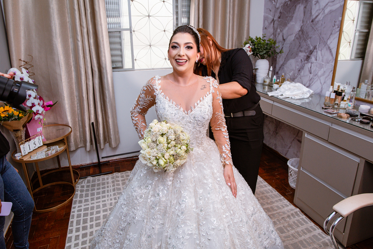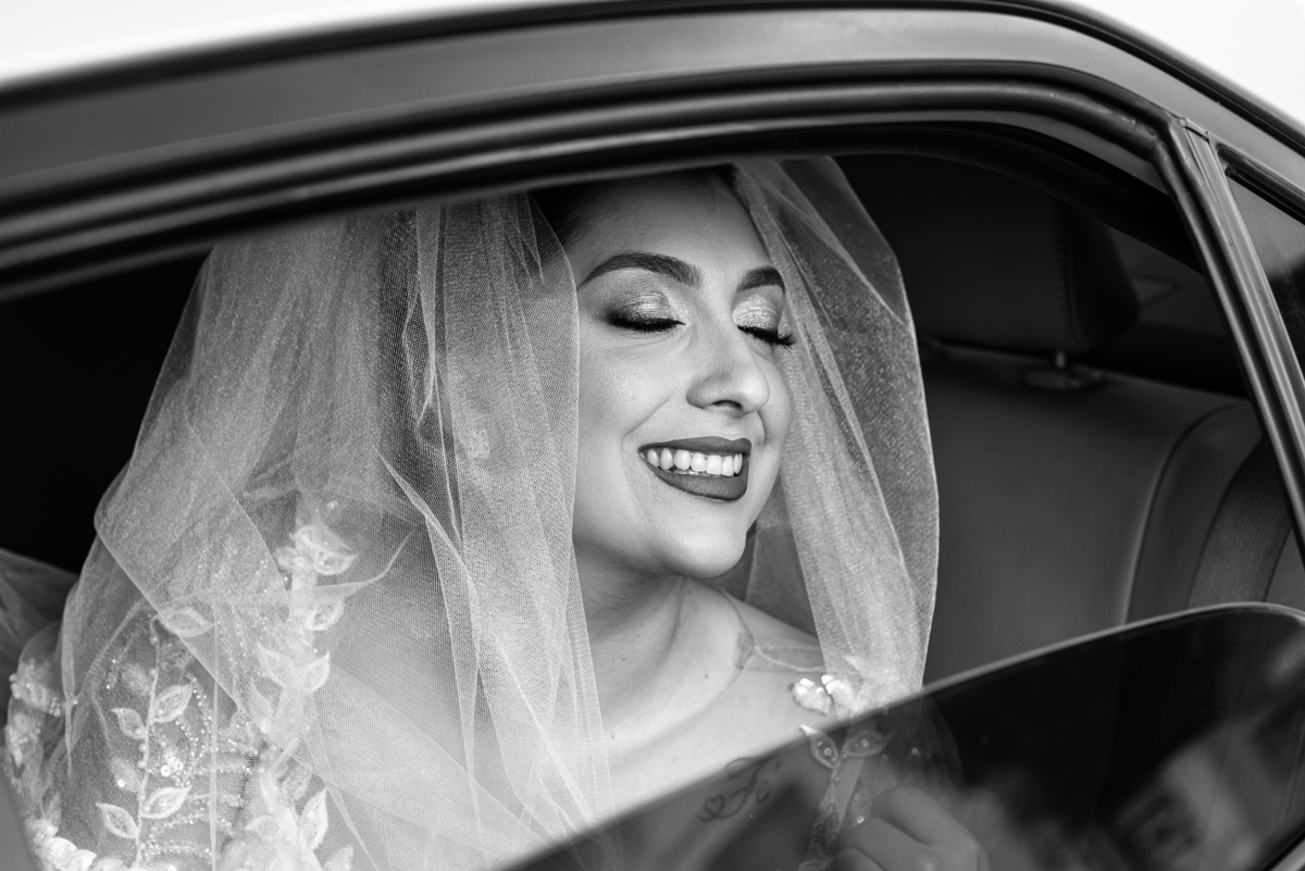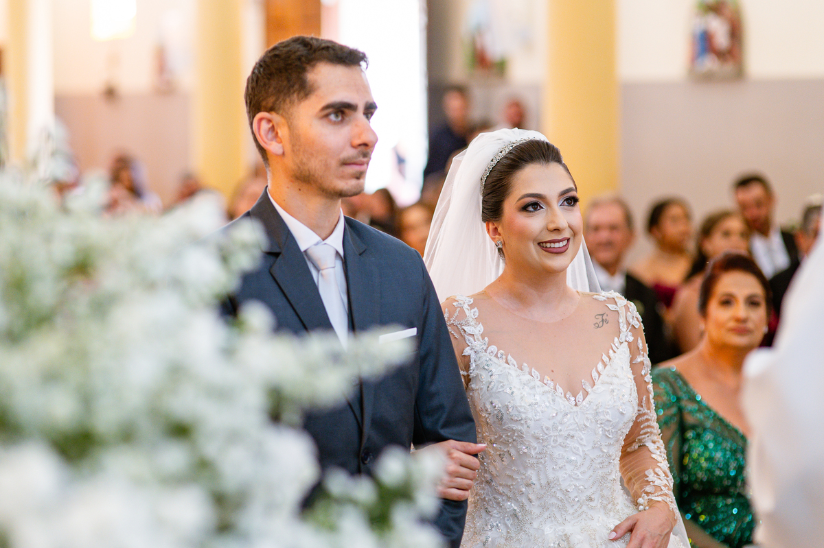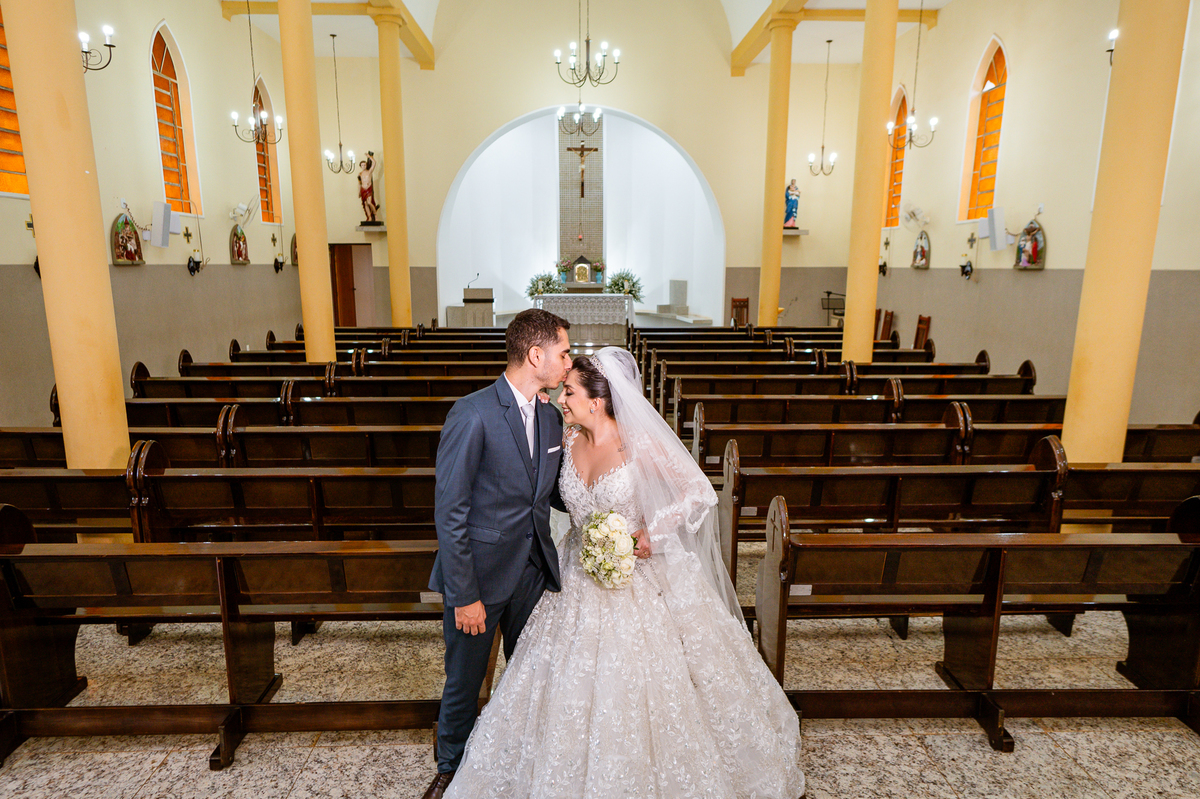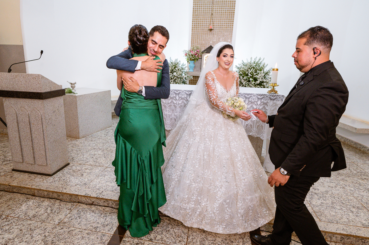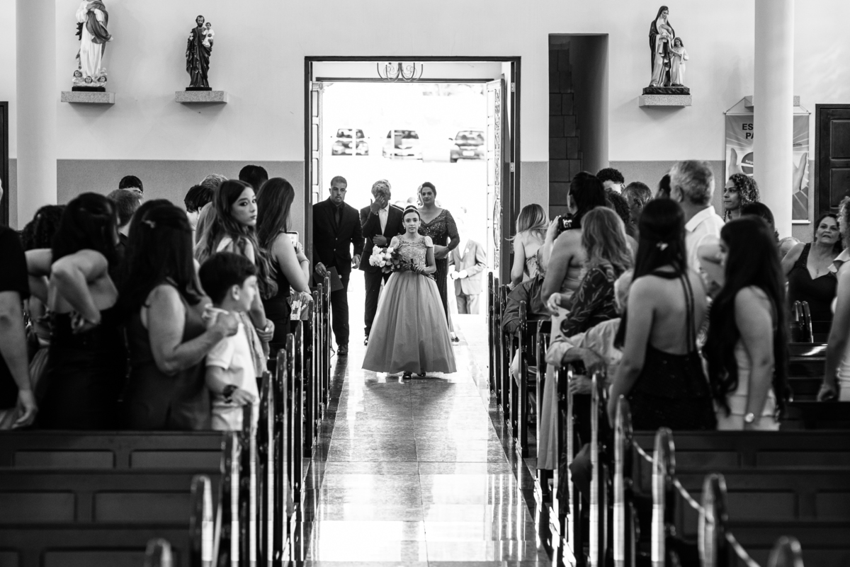 No salão, Amanda estava praticamente pronta. Era hora de colocar seu vestido. Em alguns minutos ela surgiu pronta, com seu penteado e make belíssimos e o vestido divo colocado em seu corpo. Enfim, era hora dos últimos retoques para partimos para a Igreja. Mas ainda tivemos tempo de surpresas! Até então, ela não havia visto seu buquê, e quem fez essa entrega foi a sua mãe. Quando Amanda recebeu, ela sorriu de canto a canto do rosto. Havia ficado muito além de suas expectativas. Agora o conjunto estava completo e a noiva pronta. Fizemos nossas tradicionais fotografias da noiva pronta e já seguimos pra celebração. Chegando na Igreja, os padrinhos já estavam todos alinhados pela equipe cerimonial. Fizemos as fotografias da noiva no carro e já partimos pro altar. A equipe musical estava aguardando o início e tão logo chegamos eles começaram a cantar.