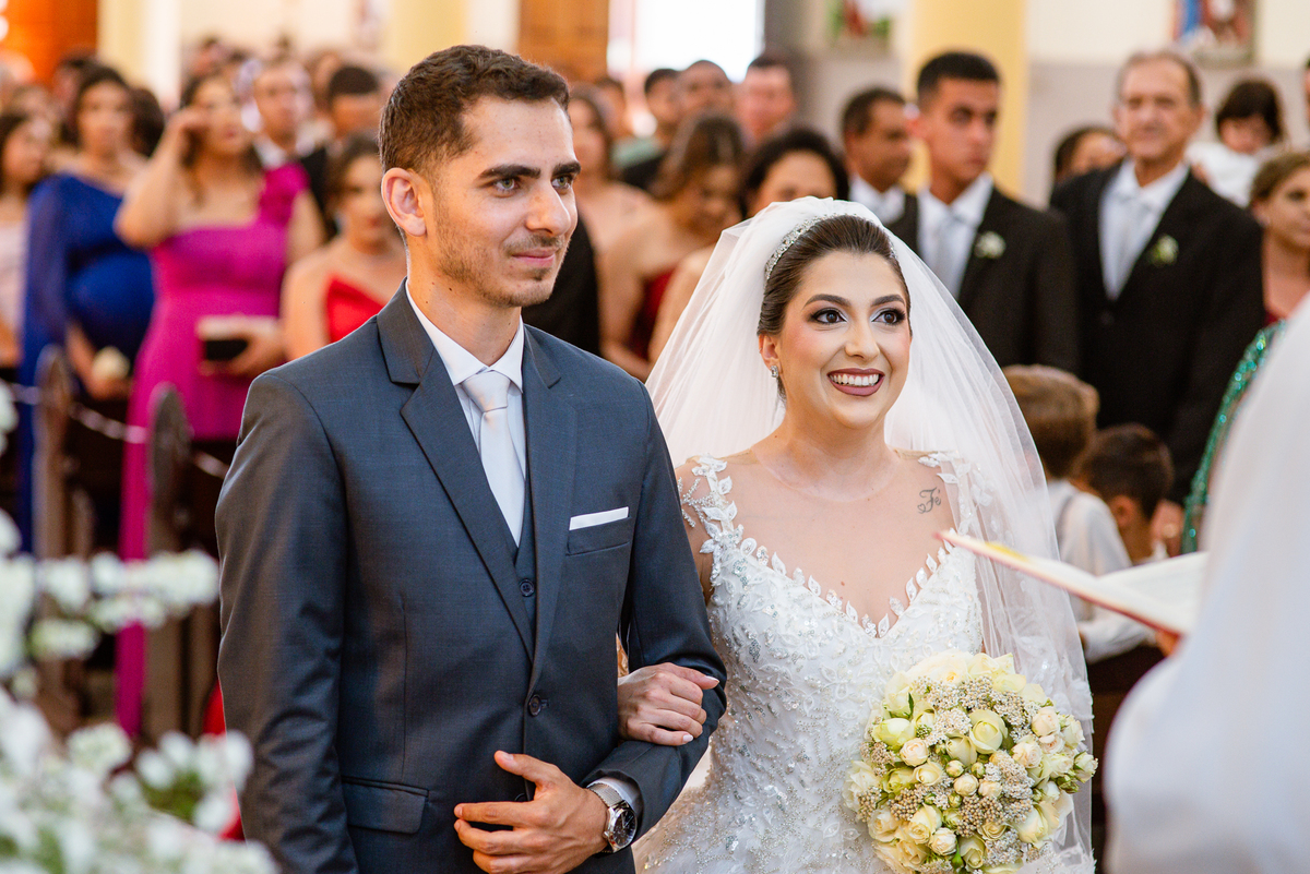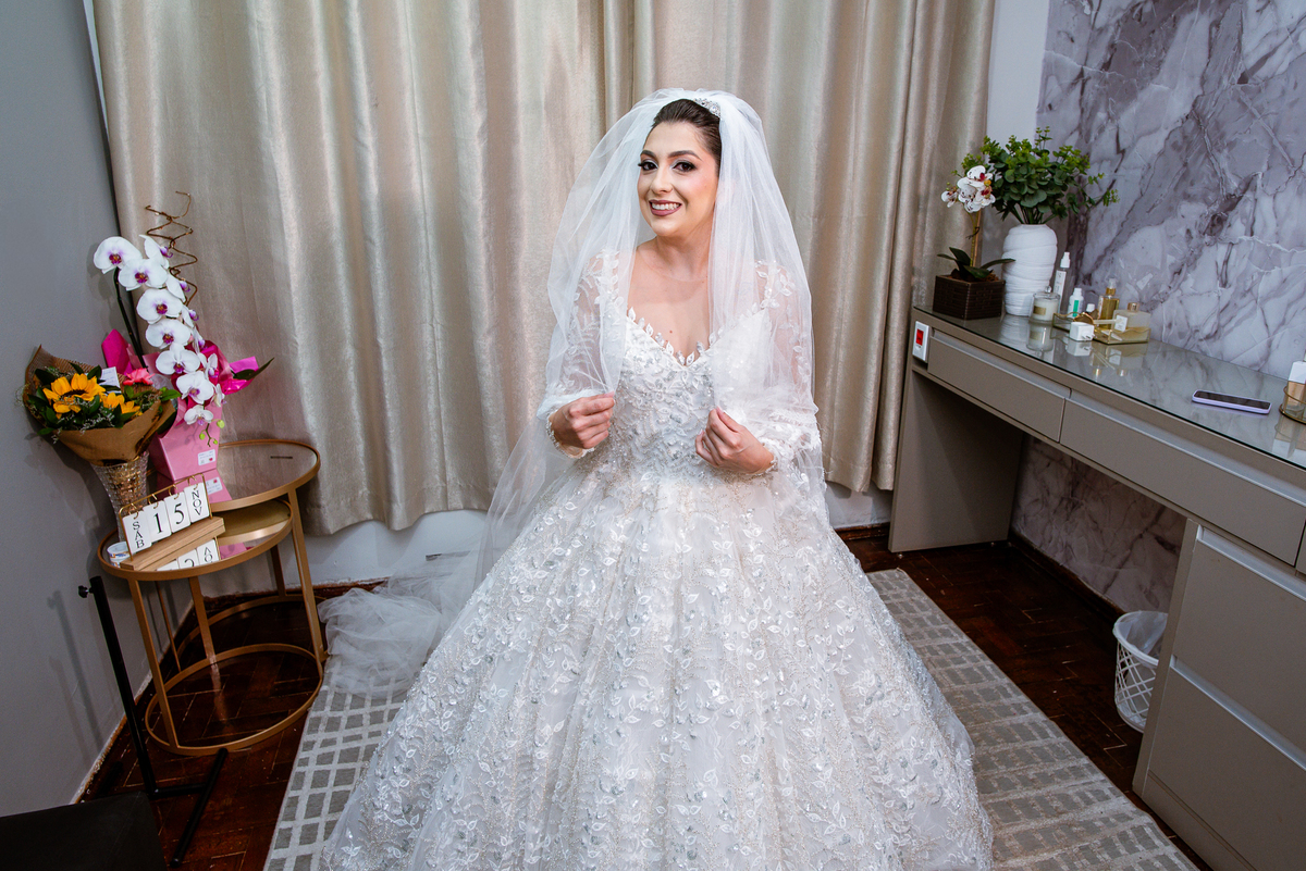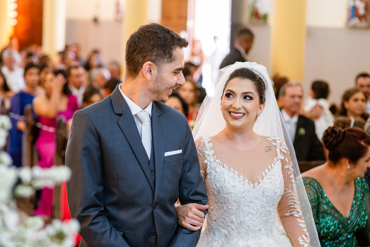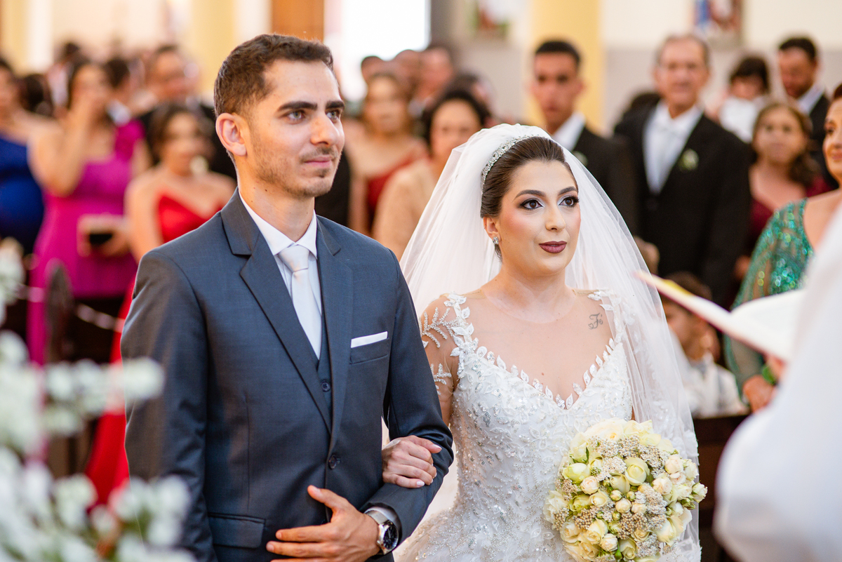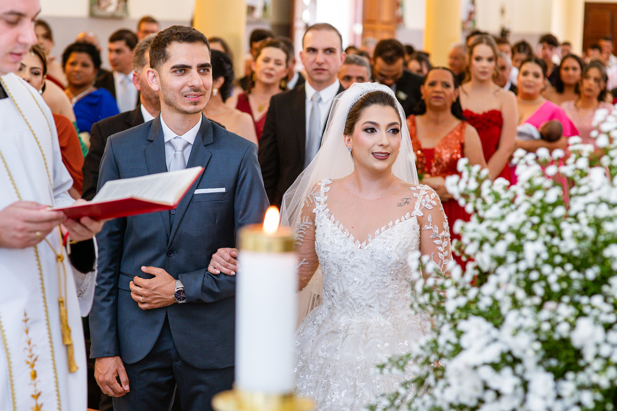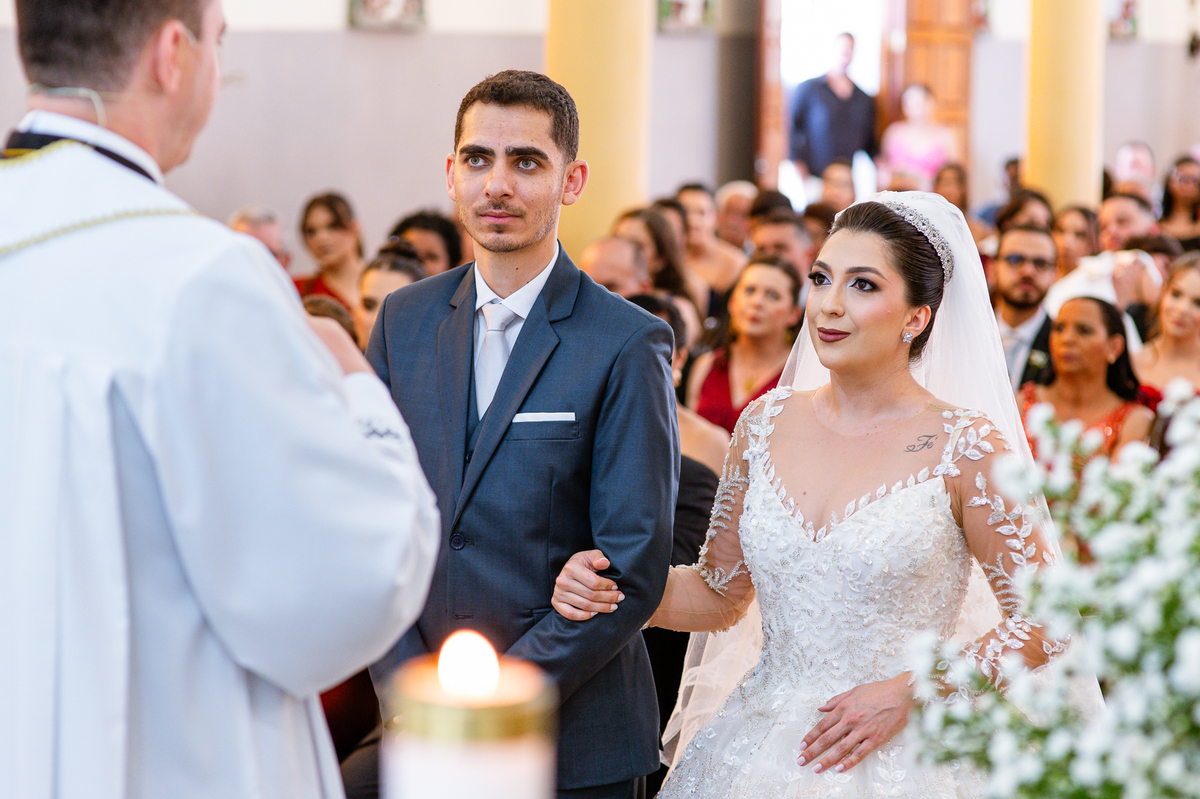No salão, Amanda estava praticamente pronta. Era hora de colocar seu vestido. Em alguns minutos ela surgiu pronta, com seu penteado e make belíssimos e o vestido divo colocado em seu corpo. Enfim, era hora dos últimos retoques para partimos para a Igreja. Mas ainda tivemos tempo de surpresas! Até então, ela não havia visto seu buquê, e quem fez essa entrega foi a sua mãe. Quando Amanda recebeu, ela sorriu de canto a canto do rosto. Havia ficado muito além de suas expectativas. Agora o conjunto estava completo e a noiva pronta. Fizemos nossas tradicionais fotografias da noiva pronta e já seguimos pra celebração. Chegando na Igreja, os padrinhos já estavam todos alinhados pela equipe cerimonial. Fizemos as fotografias da noiva no carro e já partimos pro altar. A equipe musical estava aguardando o início e tão logo chegamos eles começaram a cantar.