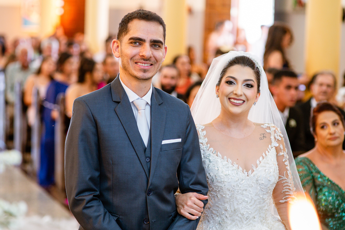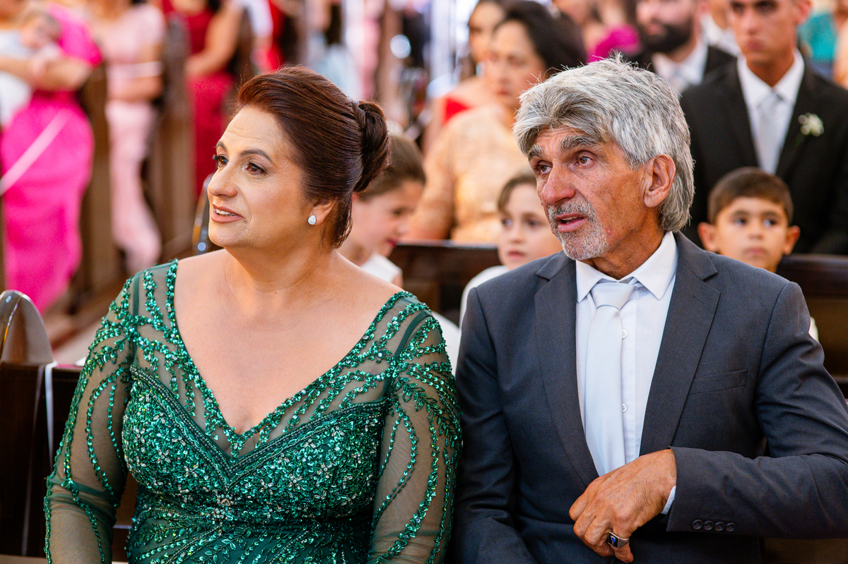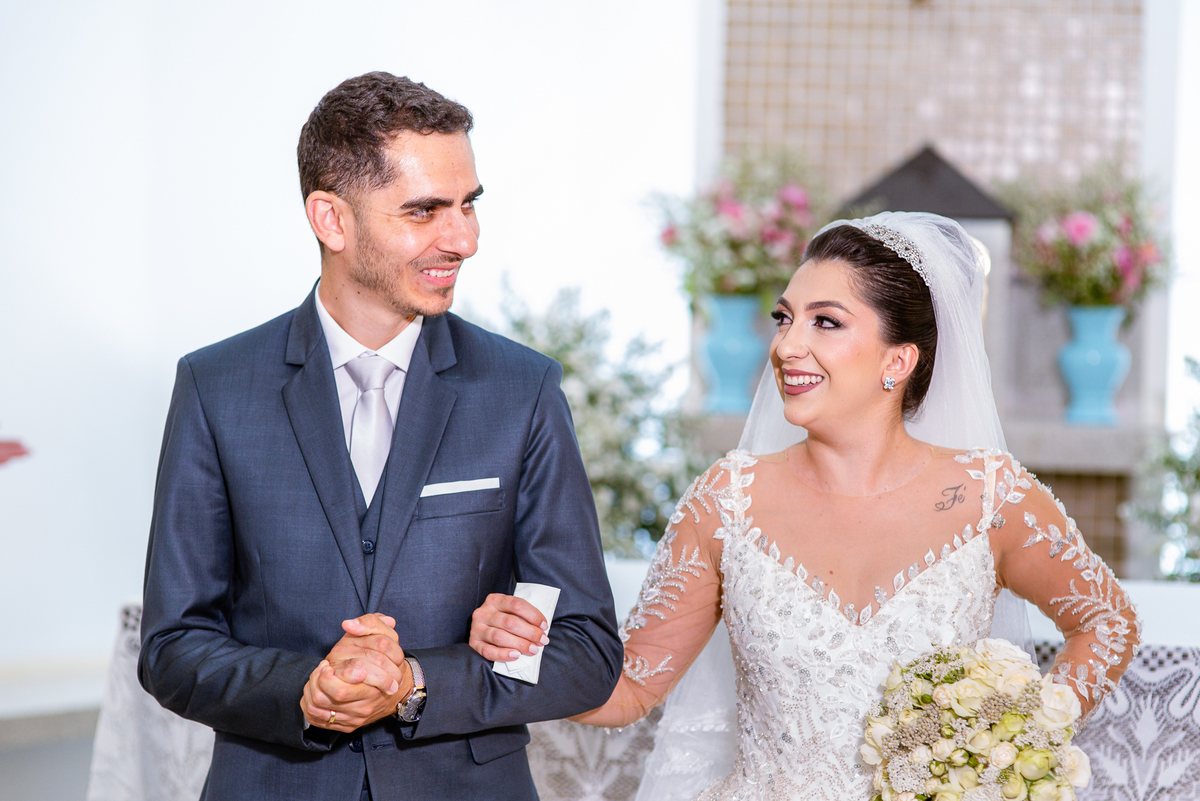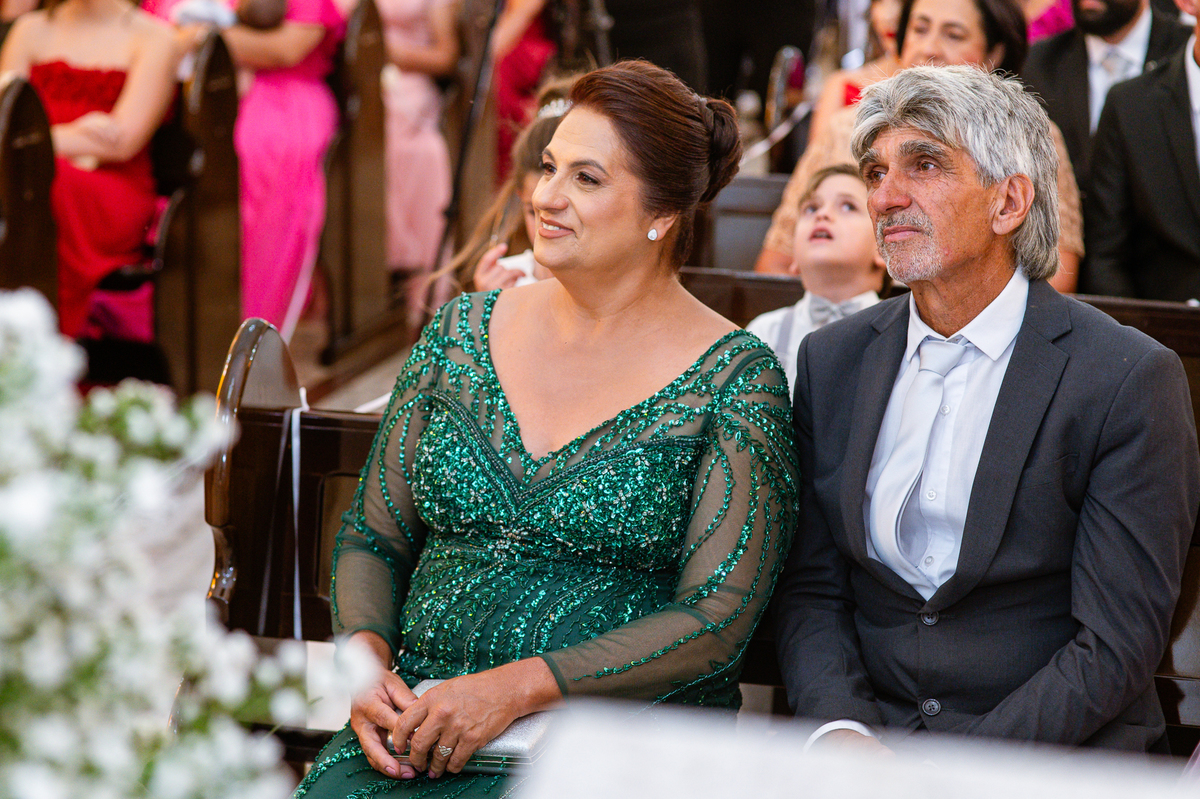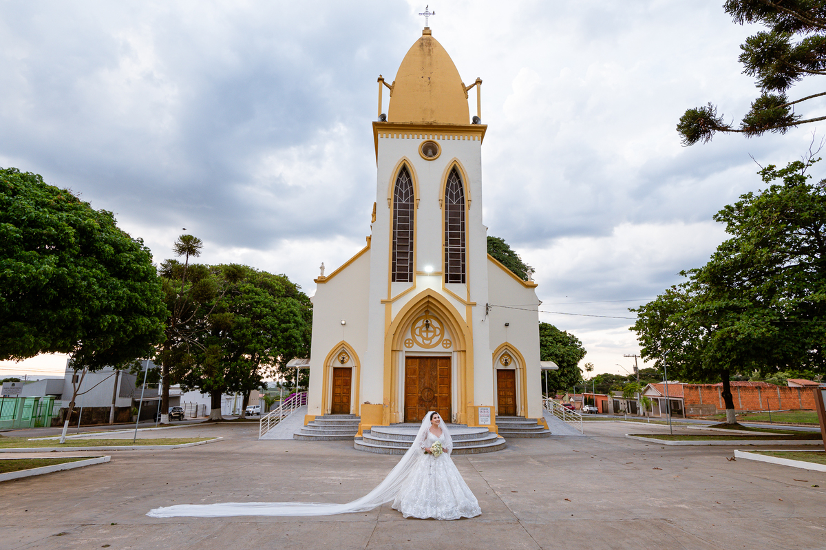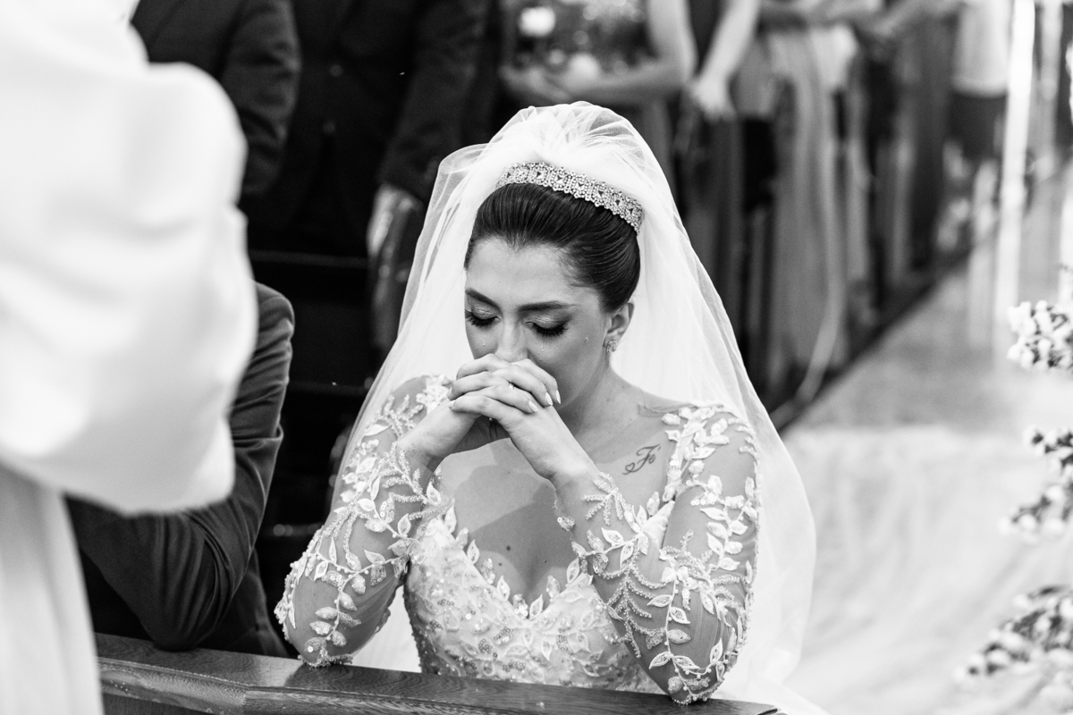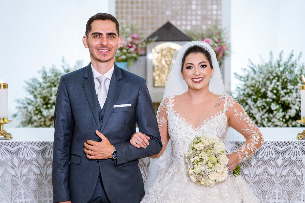 No salão, Amanda estava praticamente pronta. Era hora de colocar seu vestido. Em alguns minutos ela surgiu pronta, com seu penteado e make belíssimos e o vestido divo colocado em seu corpo. Enfim, era hora dos últimos retoques para partimos para a Igreja. Mas ainda tivemos tempo de surpresas! Até então, ela não havia visto seu buquê, e quem fez essa entrega foi a sua mãe. Quando Amanda recebeu, ela sorriu de canto a canto do rosto. Havia ficado muito além de suas expectativas. Agora o conjunto estava completo e a noiva pronta. Fizemos nossas tradicionais fotografias da noiva pronta e já seguimos pra celebração. Chegando na Igreja, os padrinhos já estavam todos alinhados pela equipe cerimonial. Fizemos as fotografias da noiva no carro e já partimos pro altar. A equipe musical estava aguardando o início e tão logo chegamos eles começaram a cantar.
