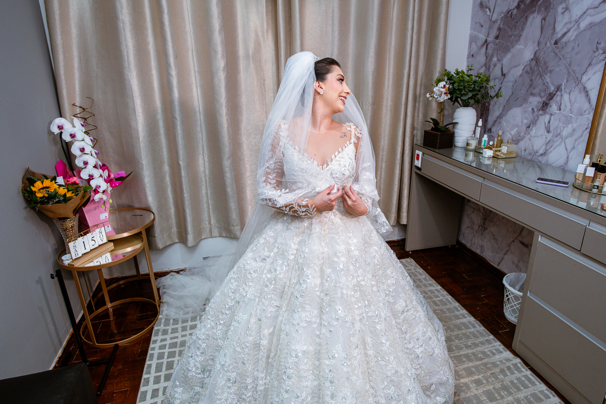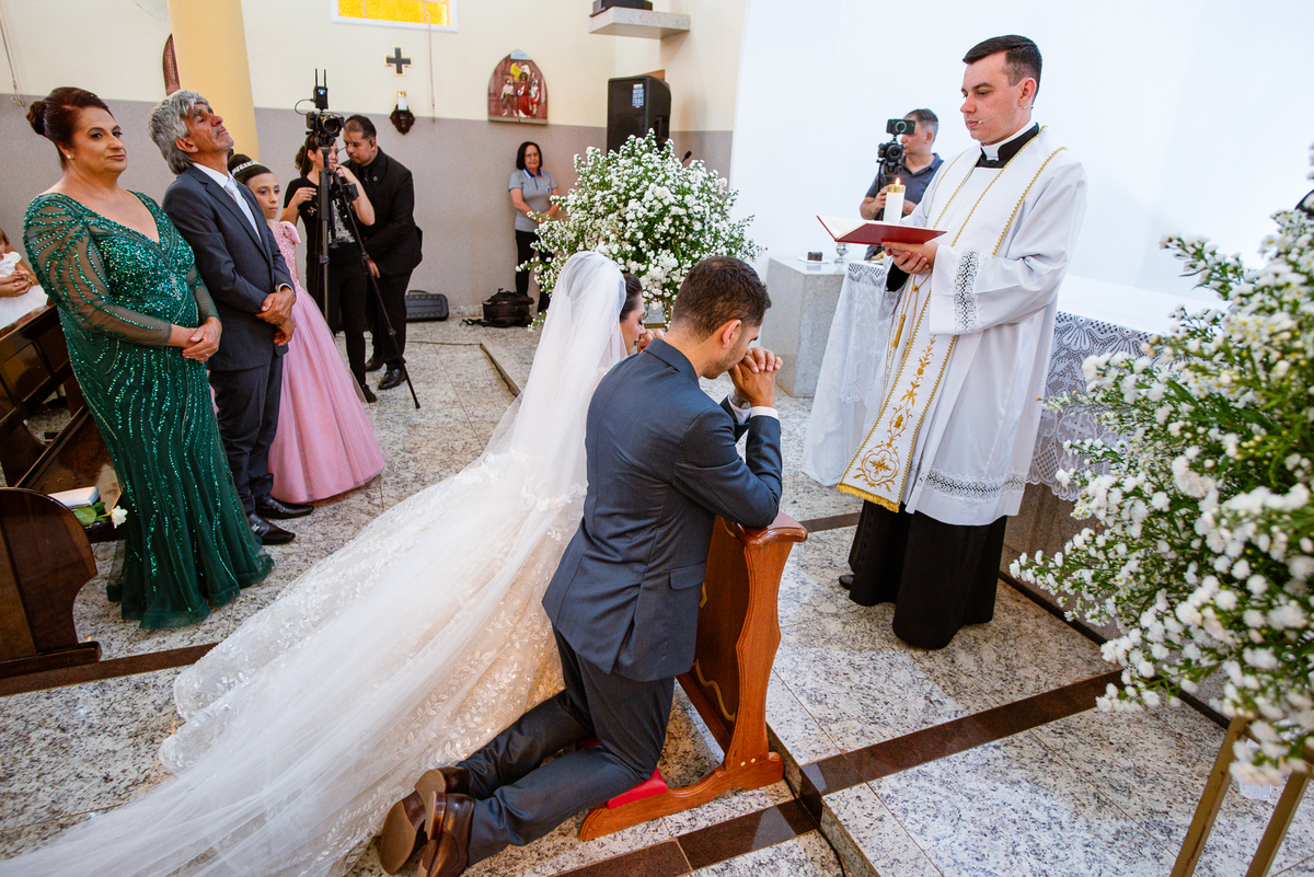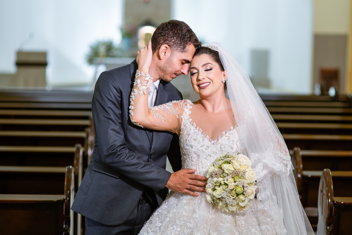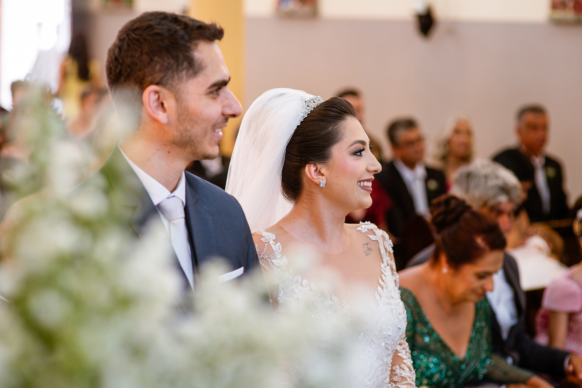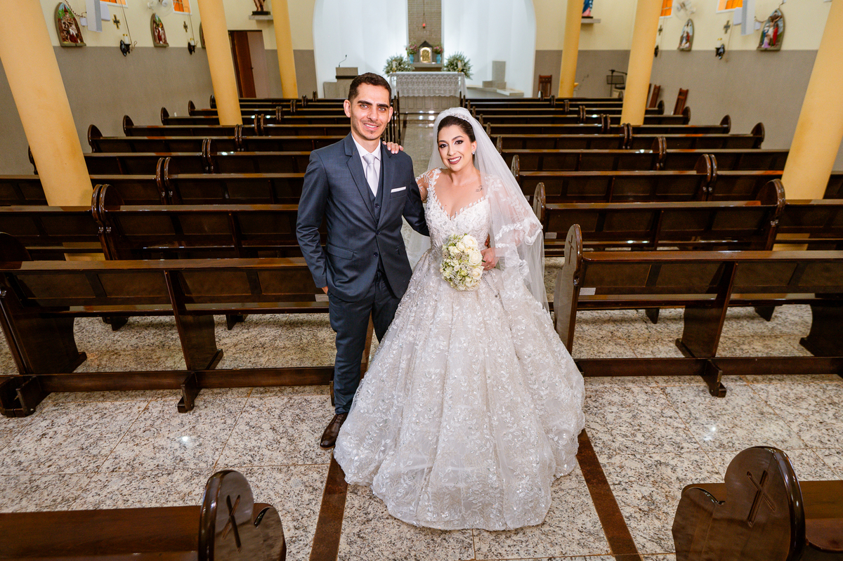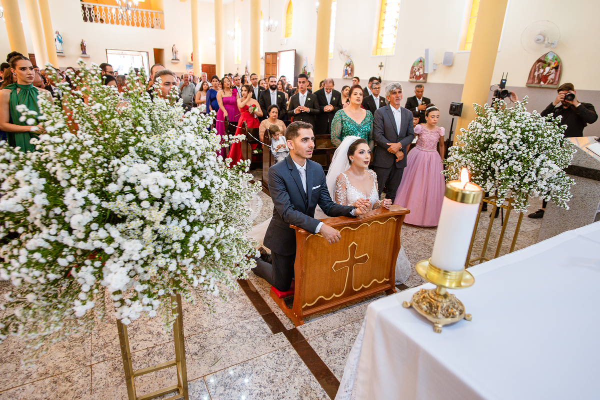 No salão, Amanda estava praticamente pronta. Era hora de colocar seu vestido. Em alguns minutos ela surgiu pronta, com seu penteado e make belíssimos e o vestido divo colocado em seu corpo. Enfim, era hora dos últimos retoques para partimos para a Igreja. Mas ainda tivemos tempo de surpresas! Até então, ela não havia visto seu buquê, e quem fez essa entrega foi a sua mãe. Quando Amanda recebeu, ela sorriu de canto a canto do rosto. Havia ficado muito além de suas expectativas. Agora o conjunto estava completo e a noiva pronta. Fizemos nossas tradicionais fotografias da noiva pronta e já seguimos pra celebração. Chegando na Igreja, os padrinhos já estavam todos alinhados pela equipe cerimonial. Fizemos as fotografias da noiva no carro e já partimos pro altar. A equipe musical estava aguardando o início e tão logo chegamos eles começaram a cantar.