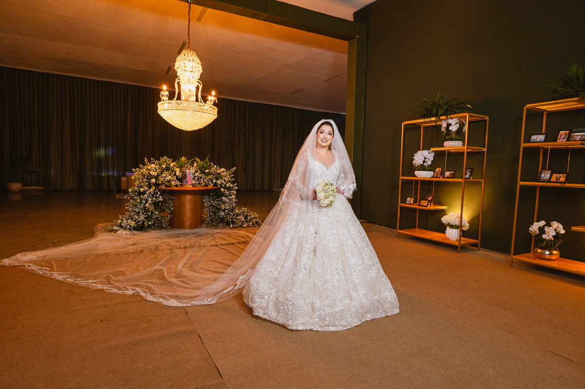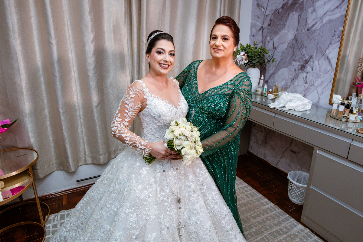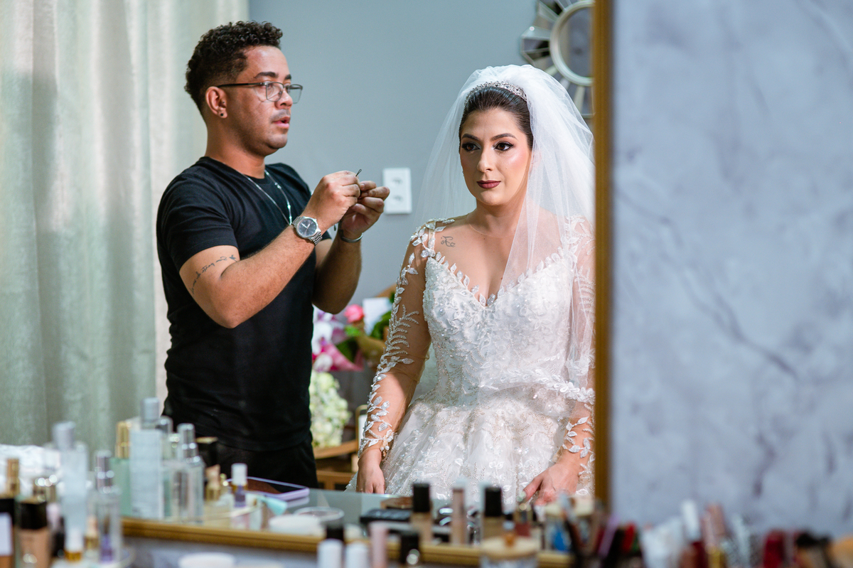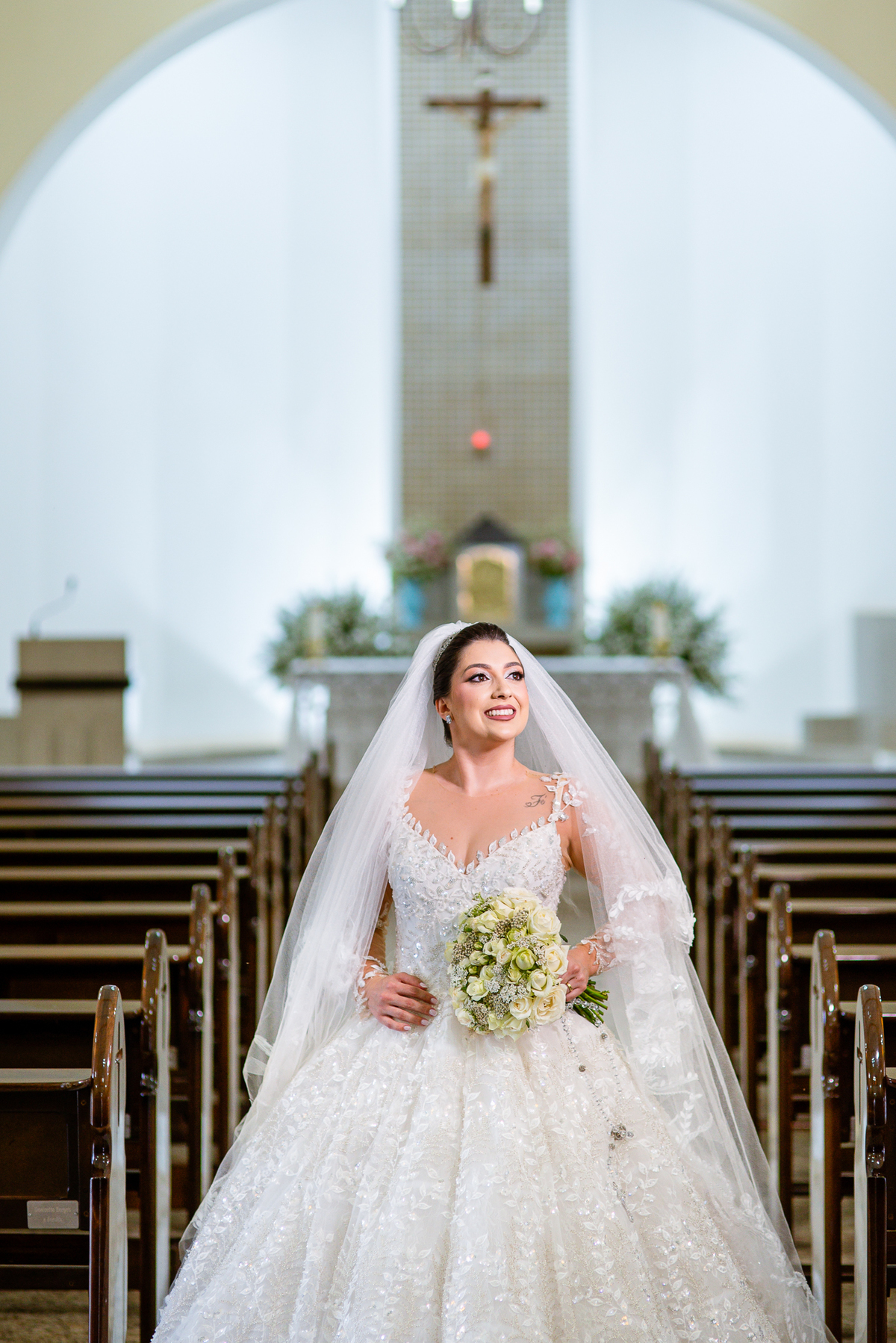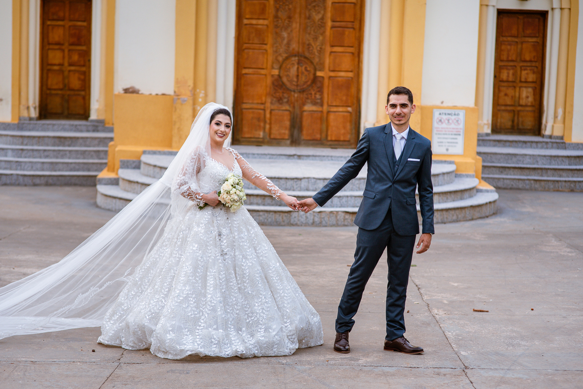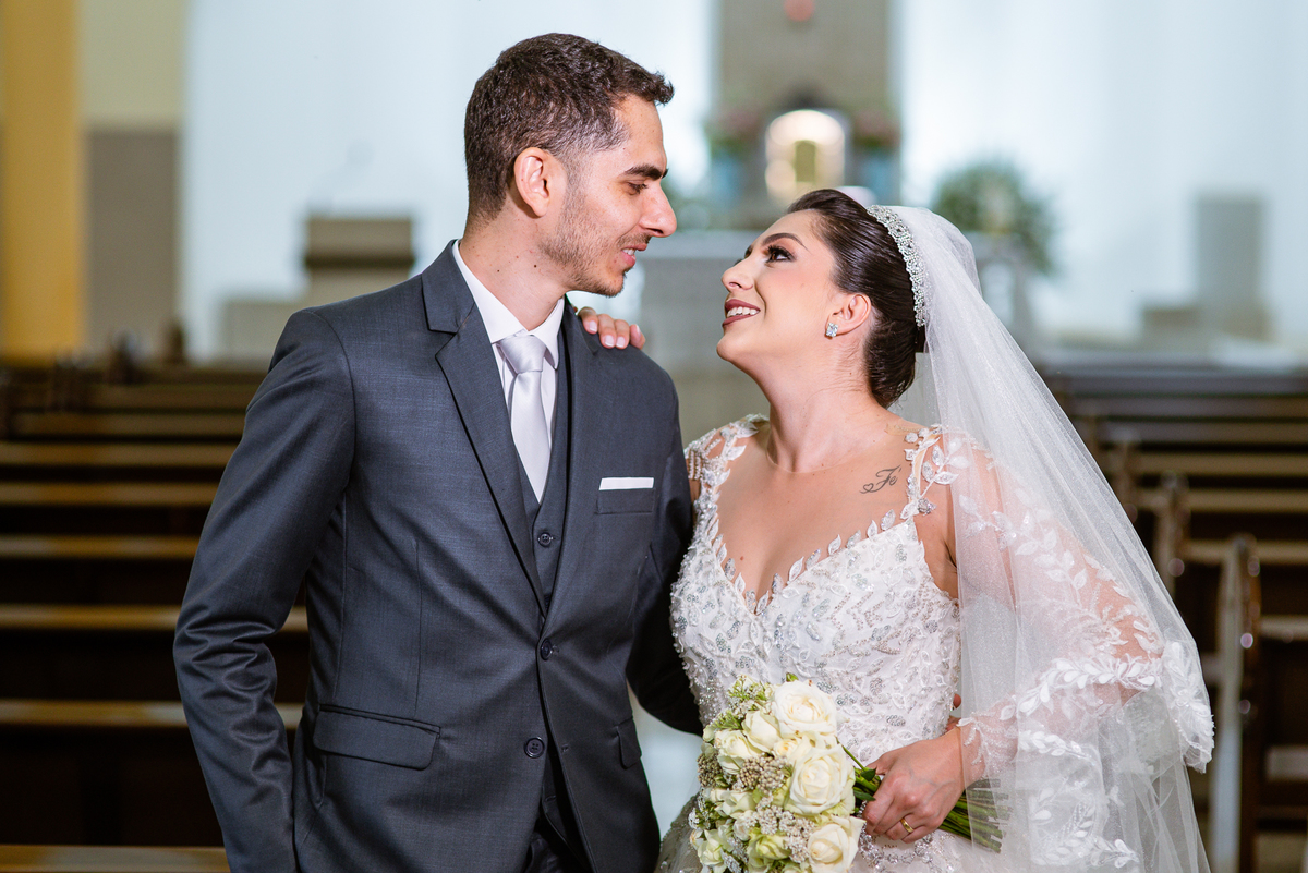 No salão, Amanda estava praticamente pronta. Era hora de colocar seu vestido. Em alguns minutos ela surgiu pronta, com seu penteado e make belíssimos e o vestido divo colocado em seu corpo. Enfim, era hora dos últimos retoques para partimos para a Igreja. Mas ainda tivemos tempo de surpresas! Até então, ela não havia visto seu buquê, e quem fez essa entrega foi a sua mãe. Quando Amanda recebeu, ela sorriu de canto a canto do rosto. Havia ficado muito além de suas expectativas. Agora o conjunto estava completo e a noiva pronta. Fizemos nossas tradicionais fotografias da noiva pronta e já seguimos pra celebração. Chegando na Igreja, os padrinhos já estavam todos alinhados pela equipe cerimonial. Fizemos as fotografias da noiva no carro e já partimos pro altar. A equipe musical estava aguardando o início e tão logo chegamos eles começaram a cantar.