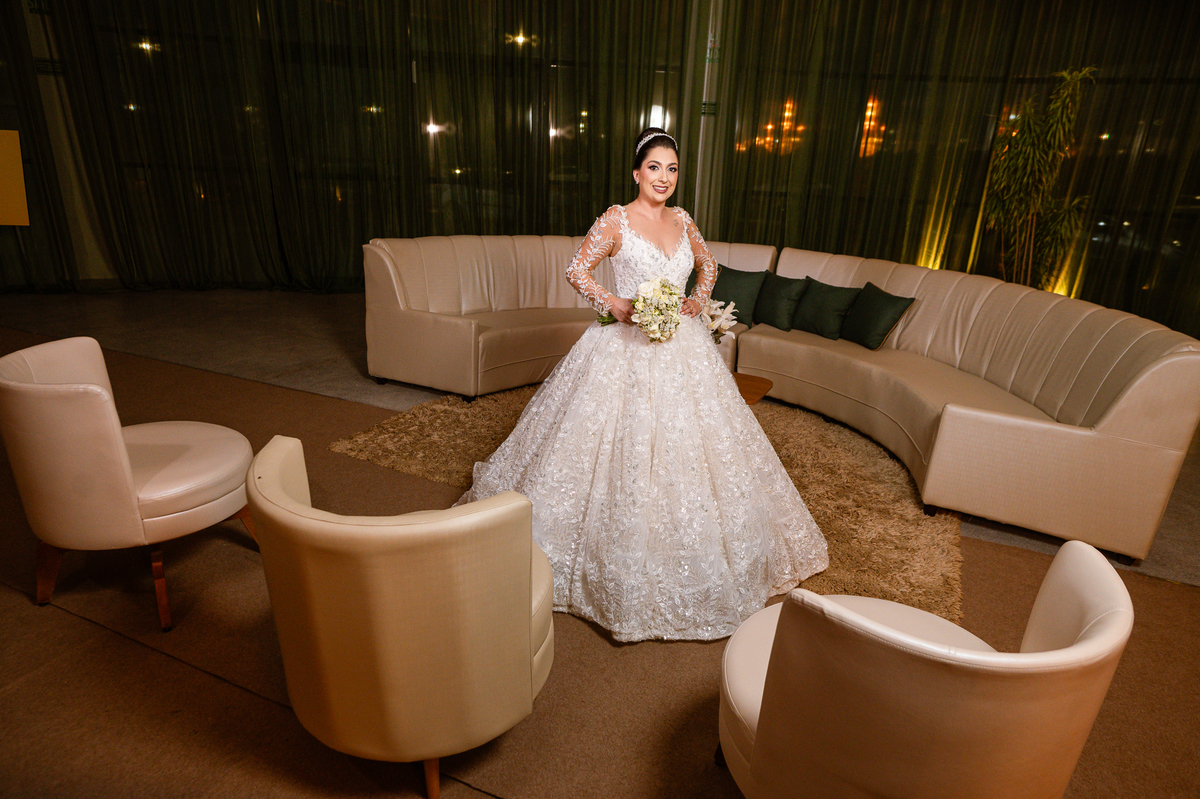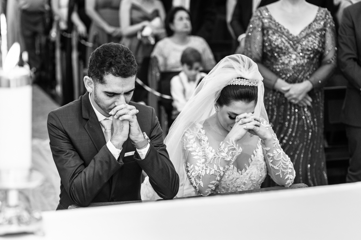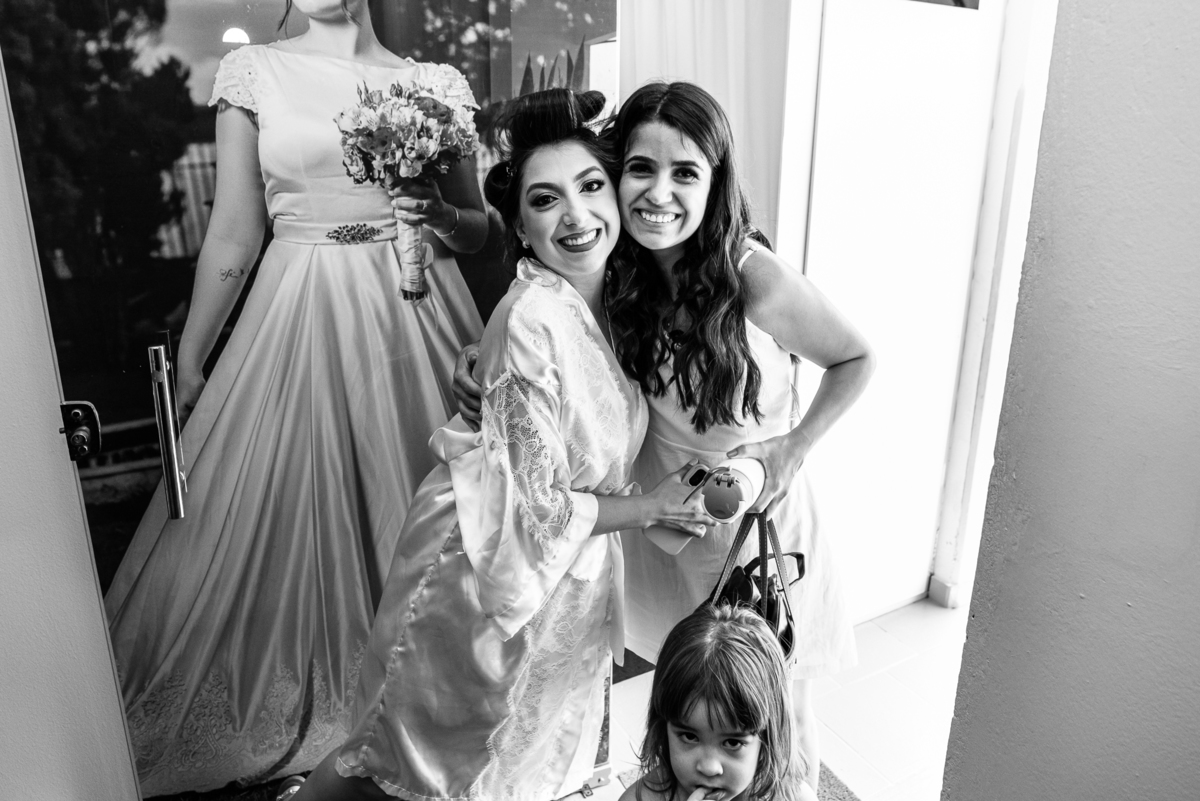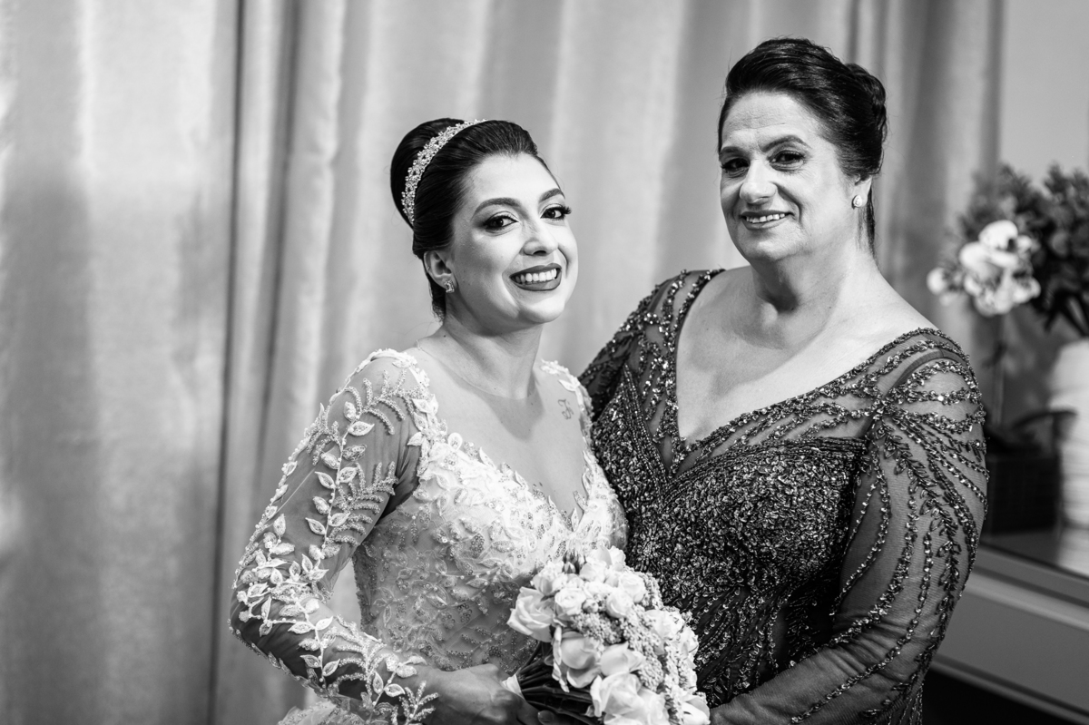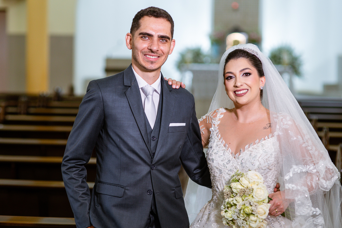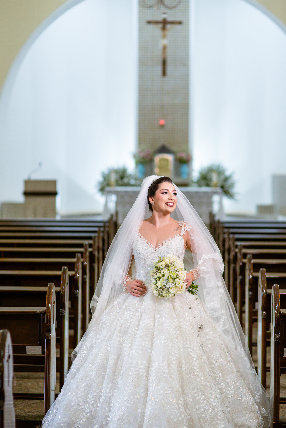 No salão, Amanda estava praticamente pronta. Era hora de colocar seu vestido. Em alguns minutos ela surgiu pronta, com seu penteado e make belíssimos e o vestido divo colocado em seu corpo. Enfim, era hora dos últimos retoques para partimos para a Igreja. Mas ainda tivemos tempo de surpresas! Até então, ela não havia visto seu buquê, e quem fez essa entrega foi a sua mãe. Quando Amanda recebeu, ela sorriu de canto a canto do rosto. Havia ficado muito além de suas expectativas. Agora o conjunto estava completo e a noiva pronta. Fizemos nossas tradicionais fotografias da noiva pronta e já seguimos pra celebração. Chegando na Igreja, os padrinhos já estavam todos alinhados pela equipe cerimonial. Fizemos as fotografias da noiva no carro e já partimos pro altar. A equipe musical estava aguardando o início e tão logo chegamos eles começaram a cantar.