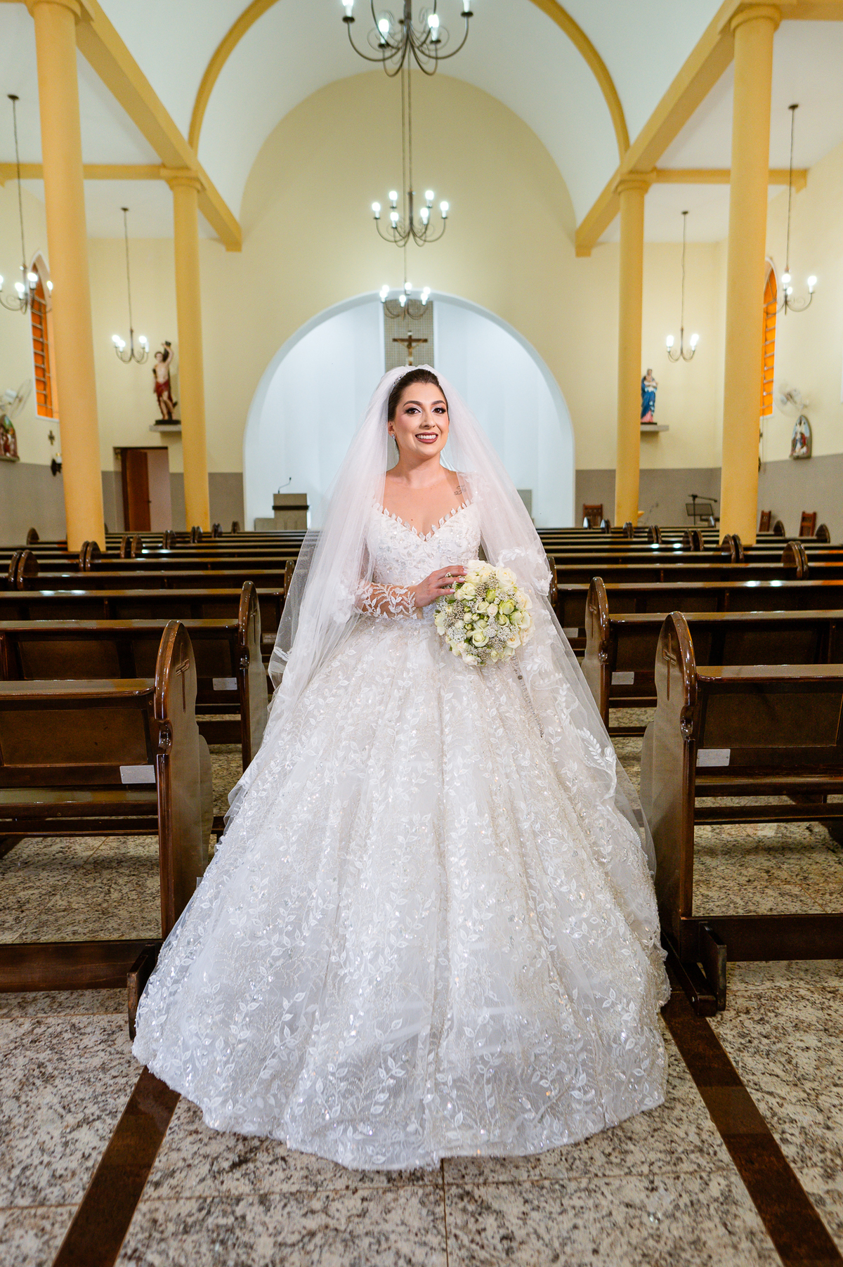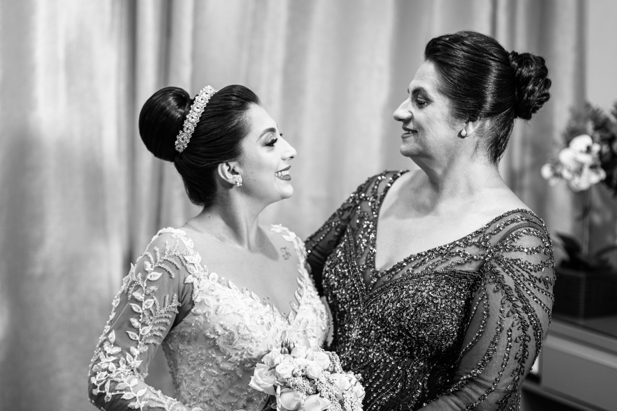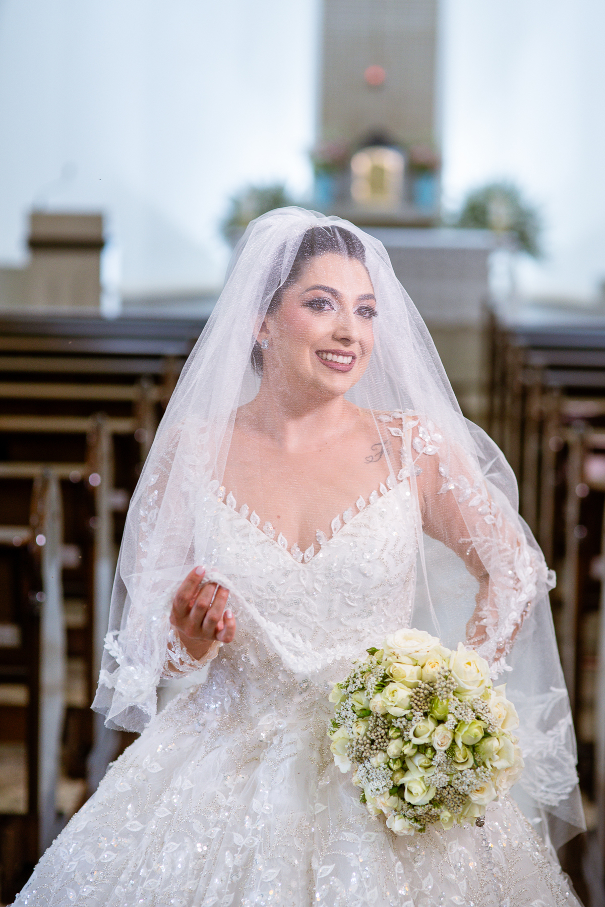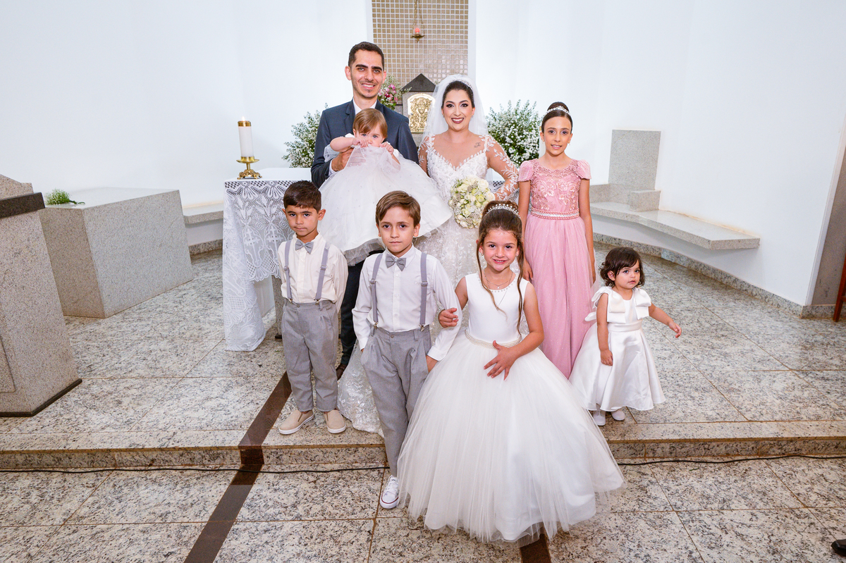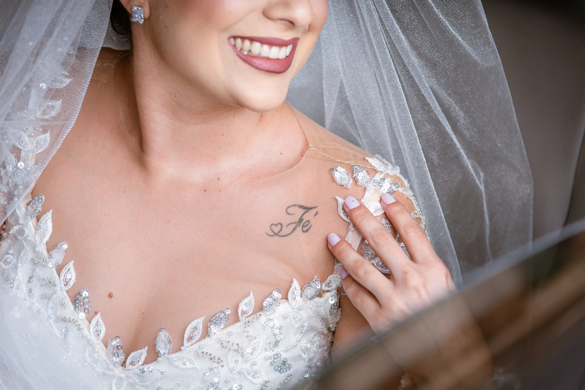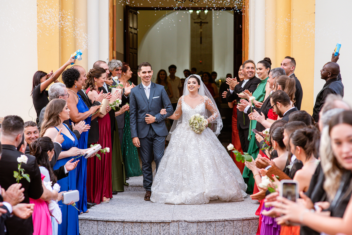 No salão, Amanda estava praticamente pronta. Era hora de colocar seu vestido. Em alguns minutos ela surgiu pronta, com seu penteado e make belíssimos e o vestido divo colocado em seu corpo. Enfim, era hora dos últimos retoques para partimos para a Igreja. Mas ainda tivemos tempo de surpresas! Até então, ela não havia visto seu buquê, e quem fez essa entrega foi a sua mãe. Quando Amanda recebeu, ela sorriu de canto a canto do rosto. Havia ficado muito além de suas expectativas. Agora o conjunto estava completo e a noiva pronta. Fizemos nossas tradicionais fotografias da noiva pronta e já seguimos pra celebração. Chegando na Igreja, os padrinhos já estavam todos alinhados pela equipe cerimonial. Fizemos as fotografias da noiva no carro e já partimos pro altar. A equipe musical estava aguardando o início e tão logo chegamos eles começaram a cantar.