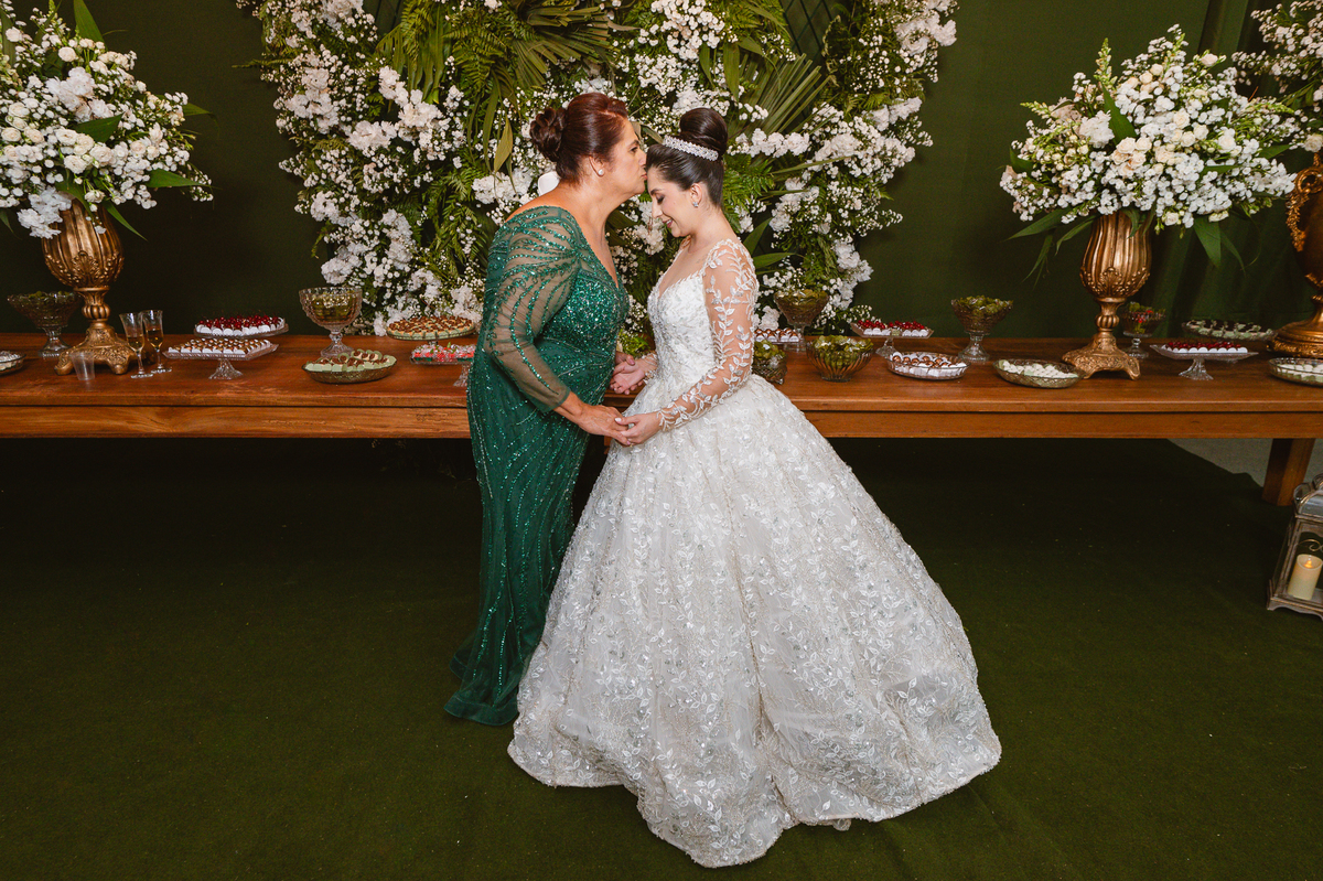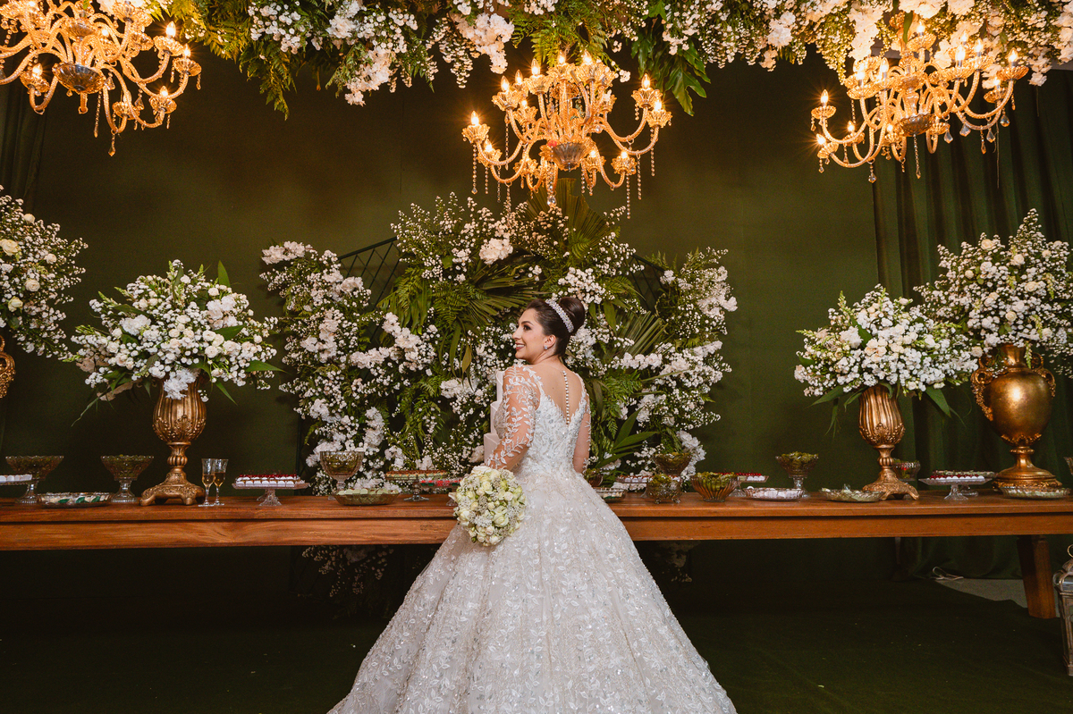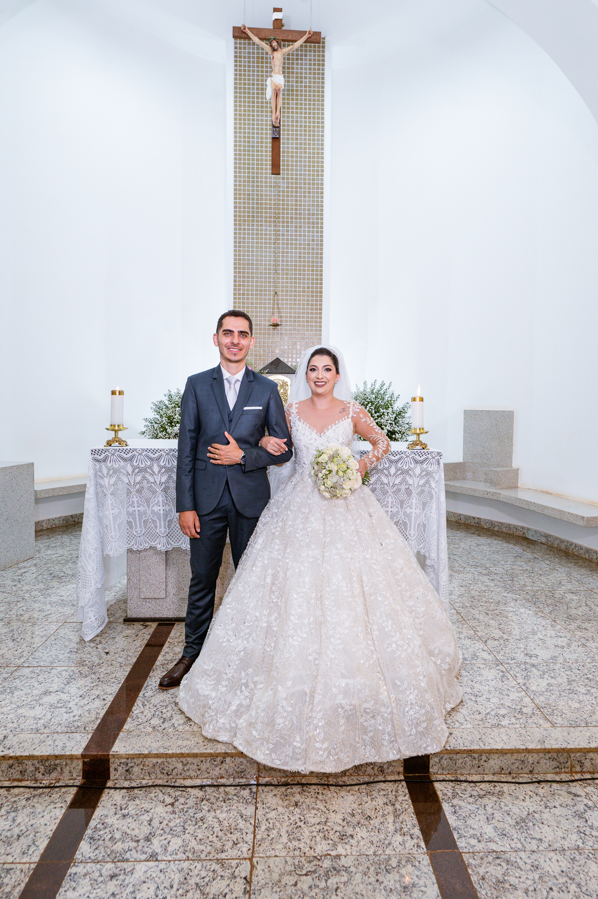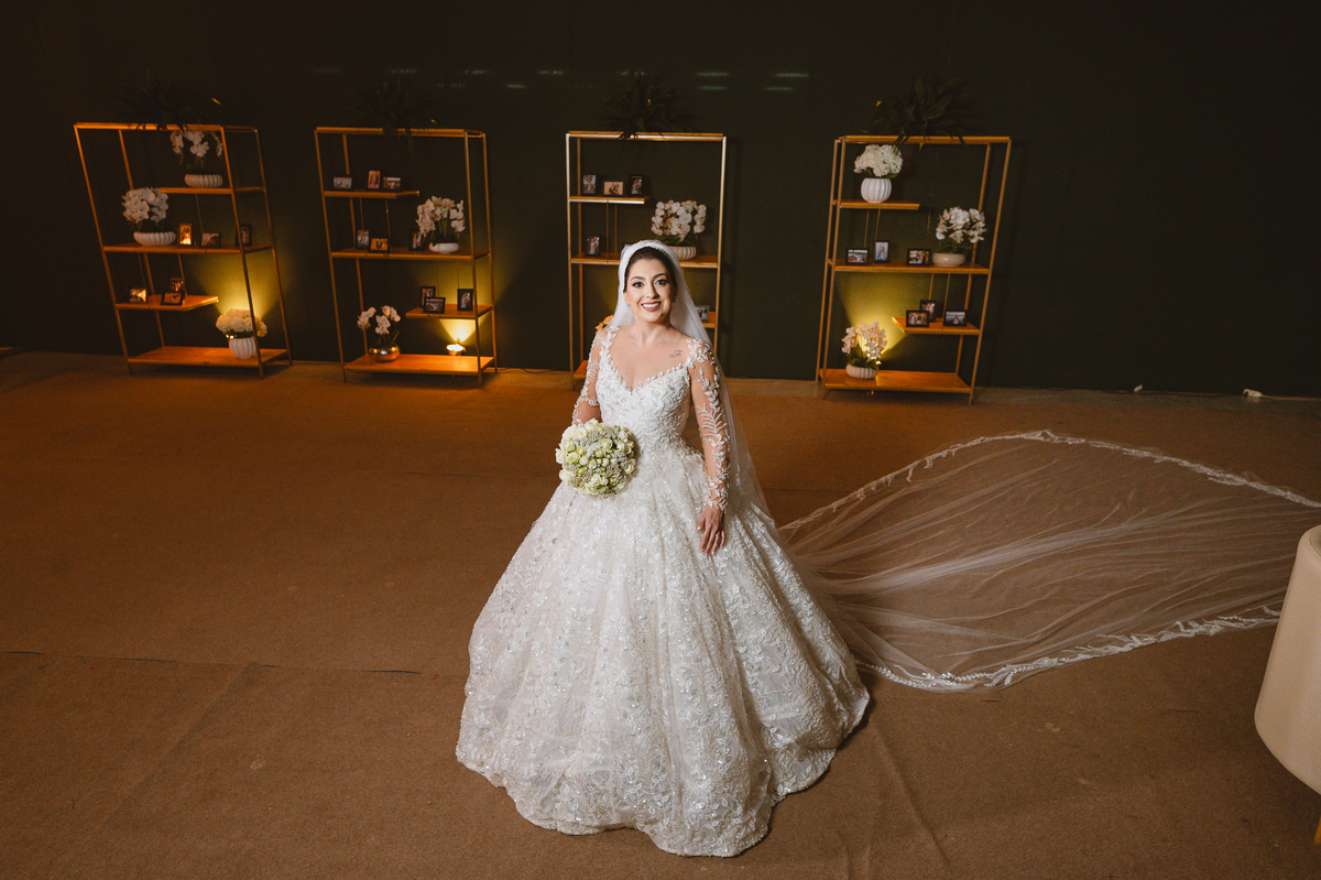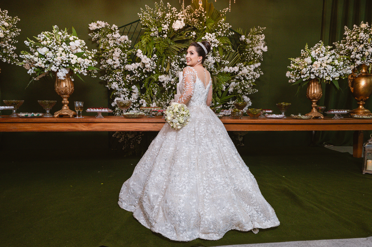 No salão, Amanda estava praticamente pronta. Era hora de colocar seu vestido. Em alguns minutos ela surgiu pronta, com seu penteado e make belíssimos e o vestido divo colocado em seu corpo. Enfim, era hora dos últimos retoques para partimos para a Igreja. Mas ainda tivemos tempo de surpresas! Até então, ela não havia visto seu buquê, e quem fez essa entrega foi a sua mãe. Quando Amanda recebeu, ela sorriu de canto a canto do rosto. Havia ficado muito além de suas expectativas. Agora o conjunto estava completo e a noiva pronta. Fizemos nossas tradicionais fotografias da noiva pronta e já seguimos pra celebração. Chegando na Igreja, os padrinhos já estavam todos alinhados pela equipe cerimonial. Fizemos as fotografias da noiva no carro e já partimos pro altar. A equipe musical estava aguardando o início e tão logo chegamos eles começaram a cantar.