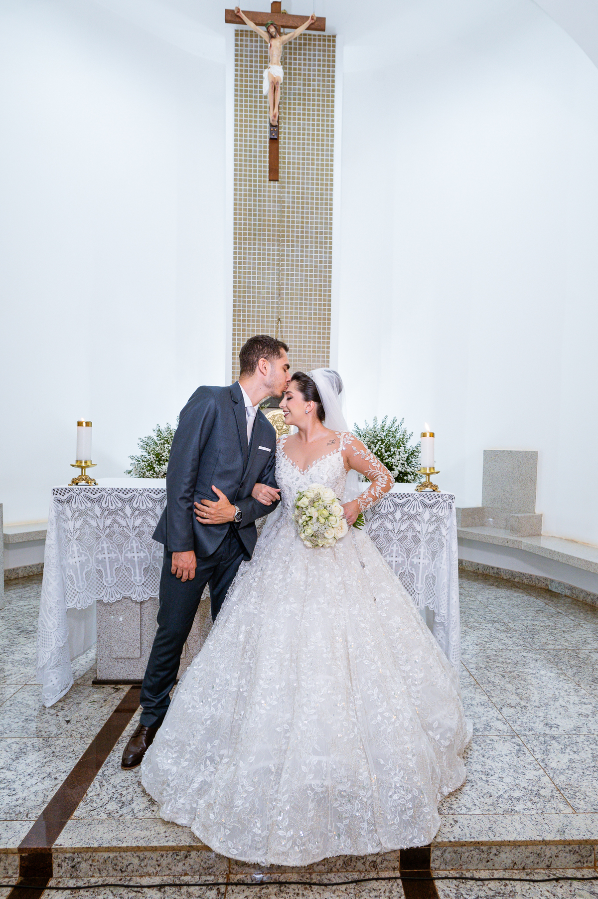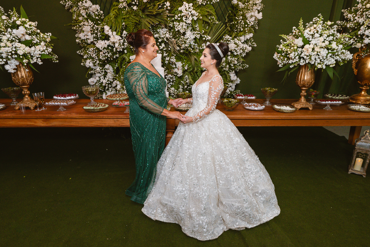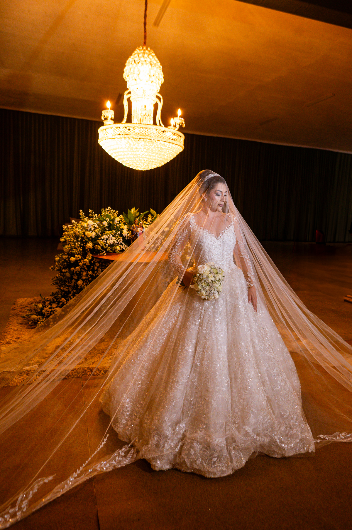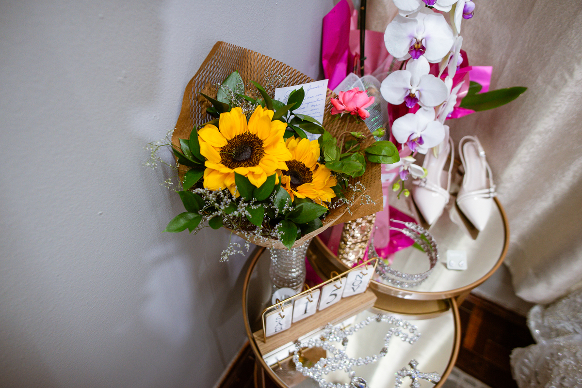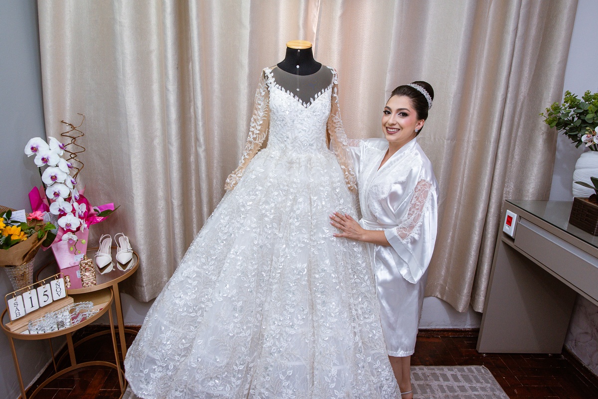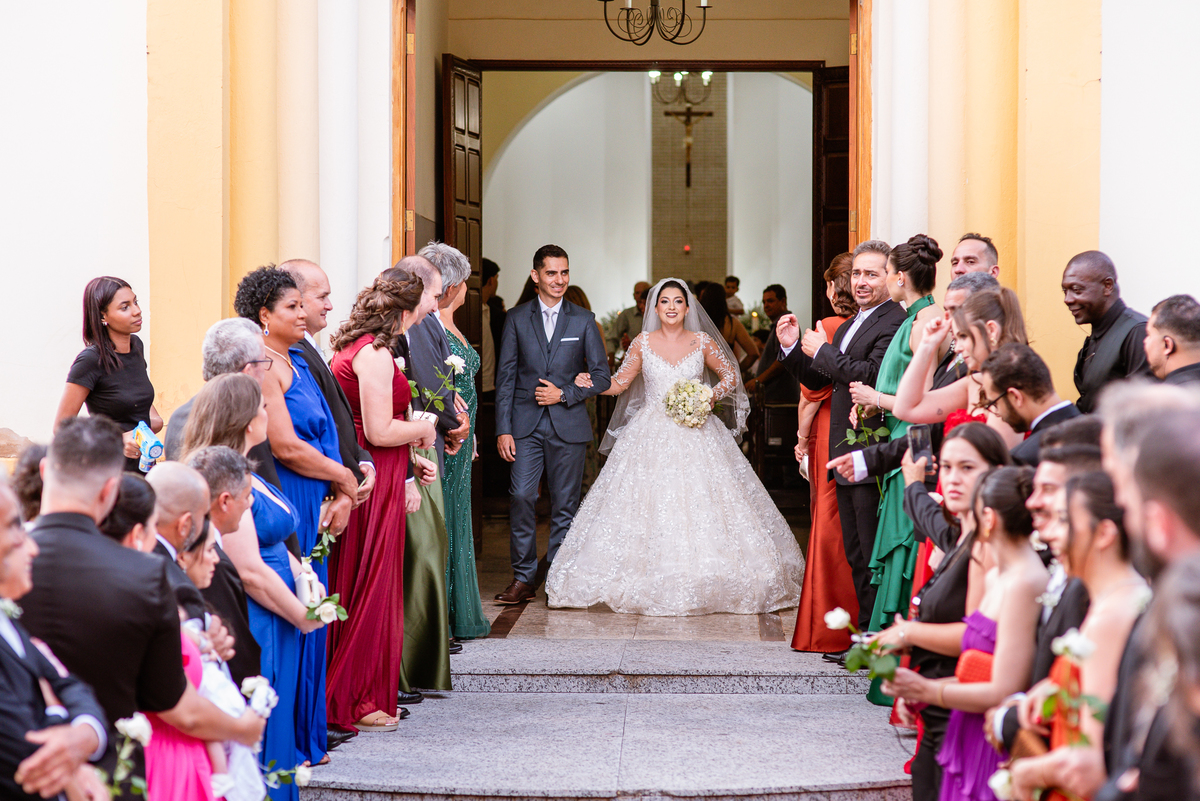 No salão, Amanda estava praticamente pronta. Era hora de colocar seu vestido. Em alguns minutos ela surgiu pronta, com seu penteado e make belíssimos e o vestido divo colocado em seu corpo. Enfim, era hora dos últimos retoques para partimos para a Igreja. Mas ainda tivemos tempo de surpresas! Até então, ela não havia visto seu buquê, e quem fez essa entrega foi a sua mãe. Quando Amanda recebeu, ela sorriu de canto a canto do rosto. Havia ficado muito além de suas expectativas. Agora o conjunto estava completo e a noiva pronta. Fizemos nossas tradicionais fotografias da noiva pronta e já seguimos pra celebração. Chegando na Igreja, os padrinhos já estavam todos alinhados pela equipe cerimonial. Fizemos as fotografias da noiva no carro e já partimos pro altar. A equipe musical estava aguardando o início e tão logo chegamos eles começaram a cantar.