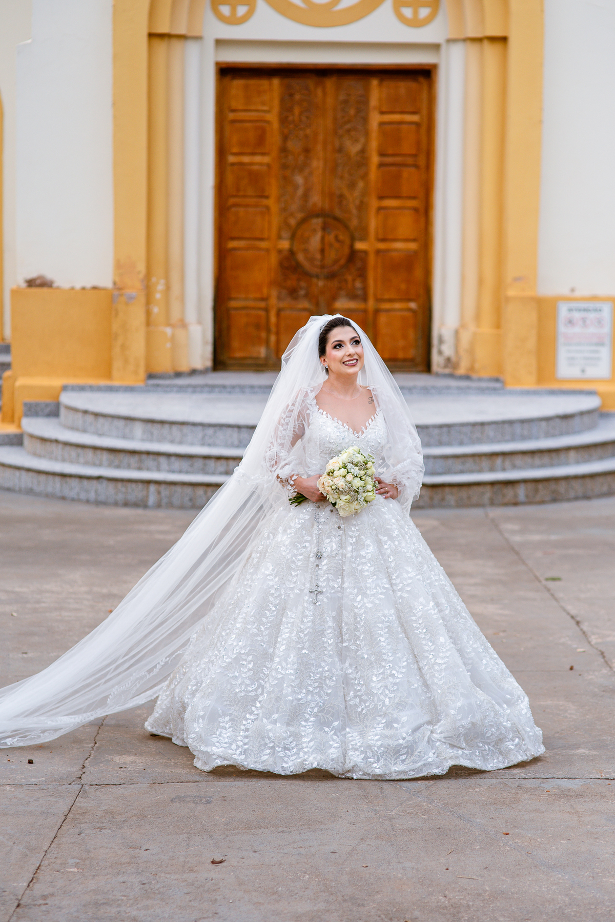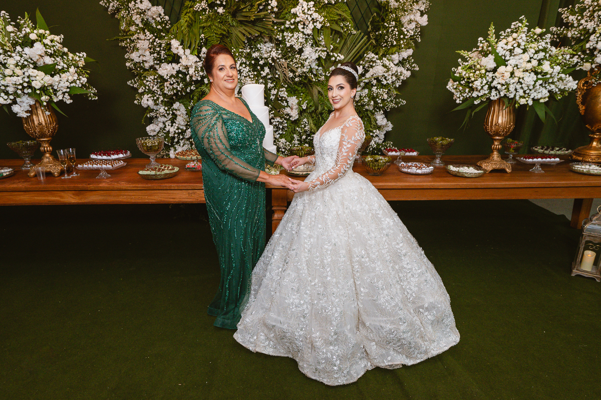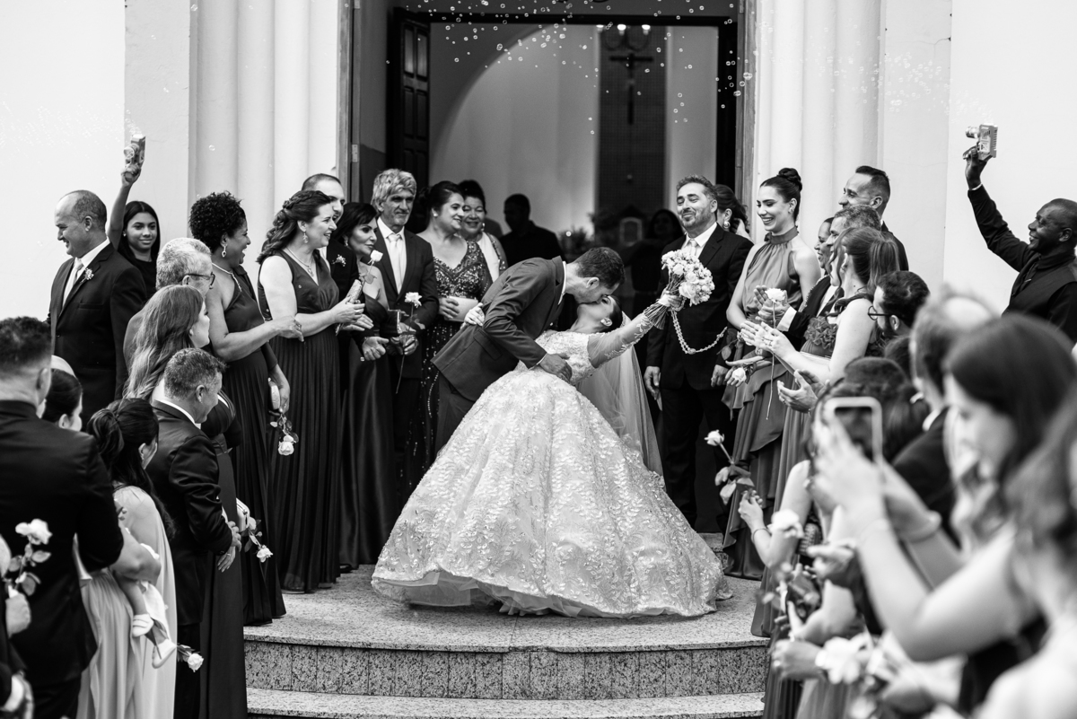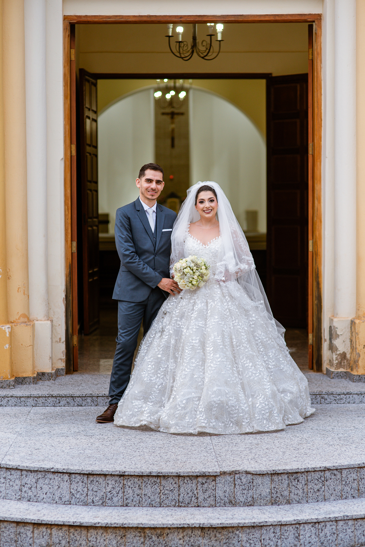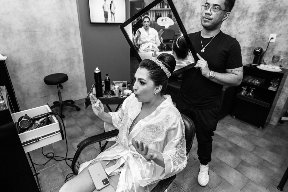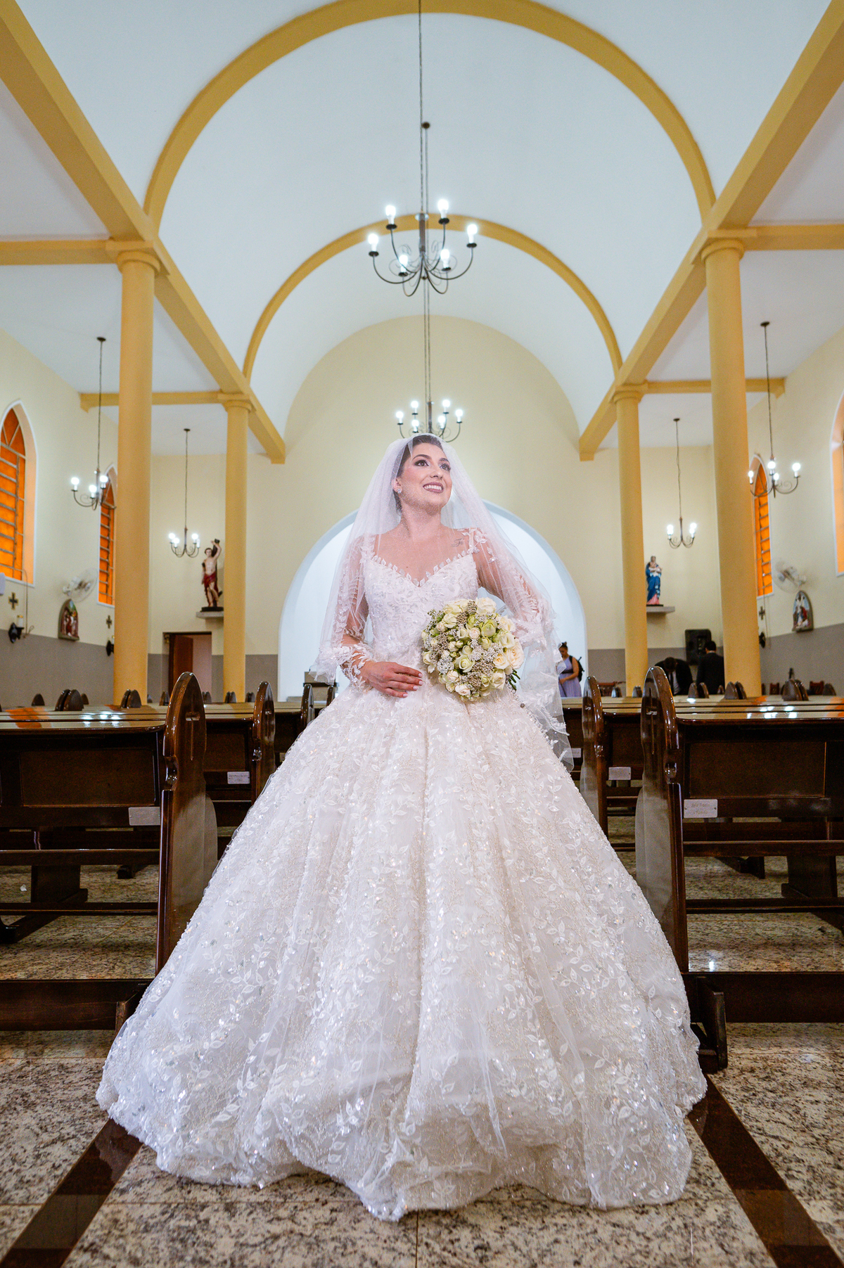 No salão, Amanda estava praticamente pronta. Era hora de colocar seu vestido. Em alguns minutos ela surgiu pronta, com seu penteado e make belíssimos e o vestido divo colocado em seu corpo. Enfim, era hora dos últimos retoques para partimos para a Igreja. Mas ainda tivemos tempo de surpresas! Até então, ela não havia visto seu buquê, e quem fez essa entrega foi a sua mãe. Quando Amanda recebeu, ela sorriu de canto a canto do rosto. Havia ficado muito além de suas expectativas. Agora o conjunto estava completo e a noiva pronta. Fizemos nossas tradicionais fotografias da noiva pronta e já seguimos pra celebração. Chegando na Igreja, os padrinhos já estavam todos alinhados pela equipe cerimonial. Fizemos as fotografias da noiva no carro e já partimos pro altar. A equipe musical estava aguardando o início e tão logo chegamos eles começaram a cantar.