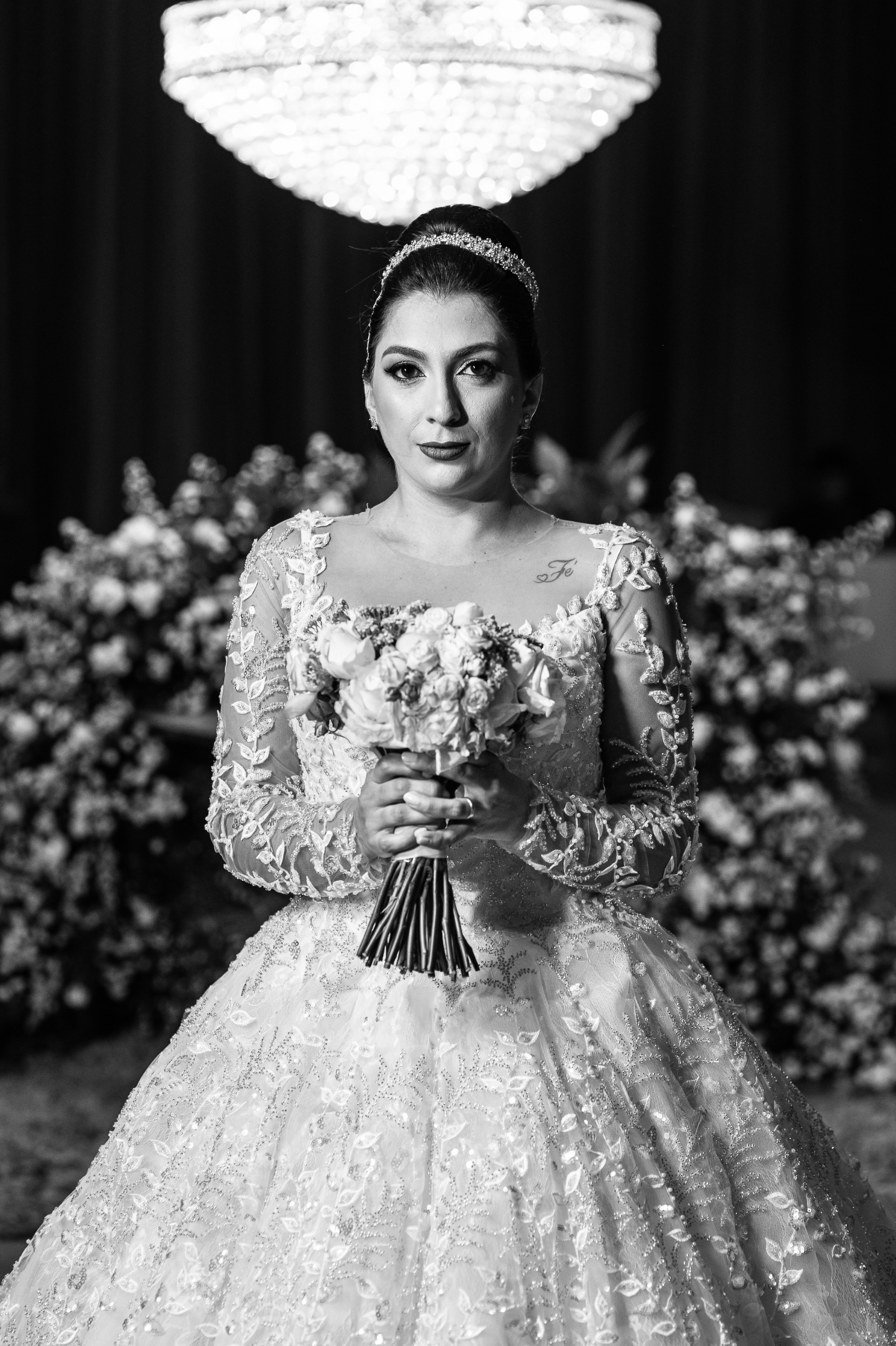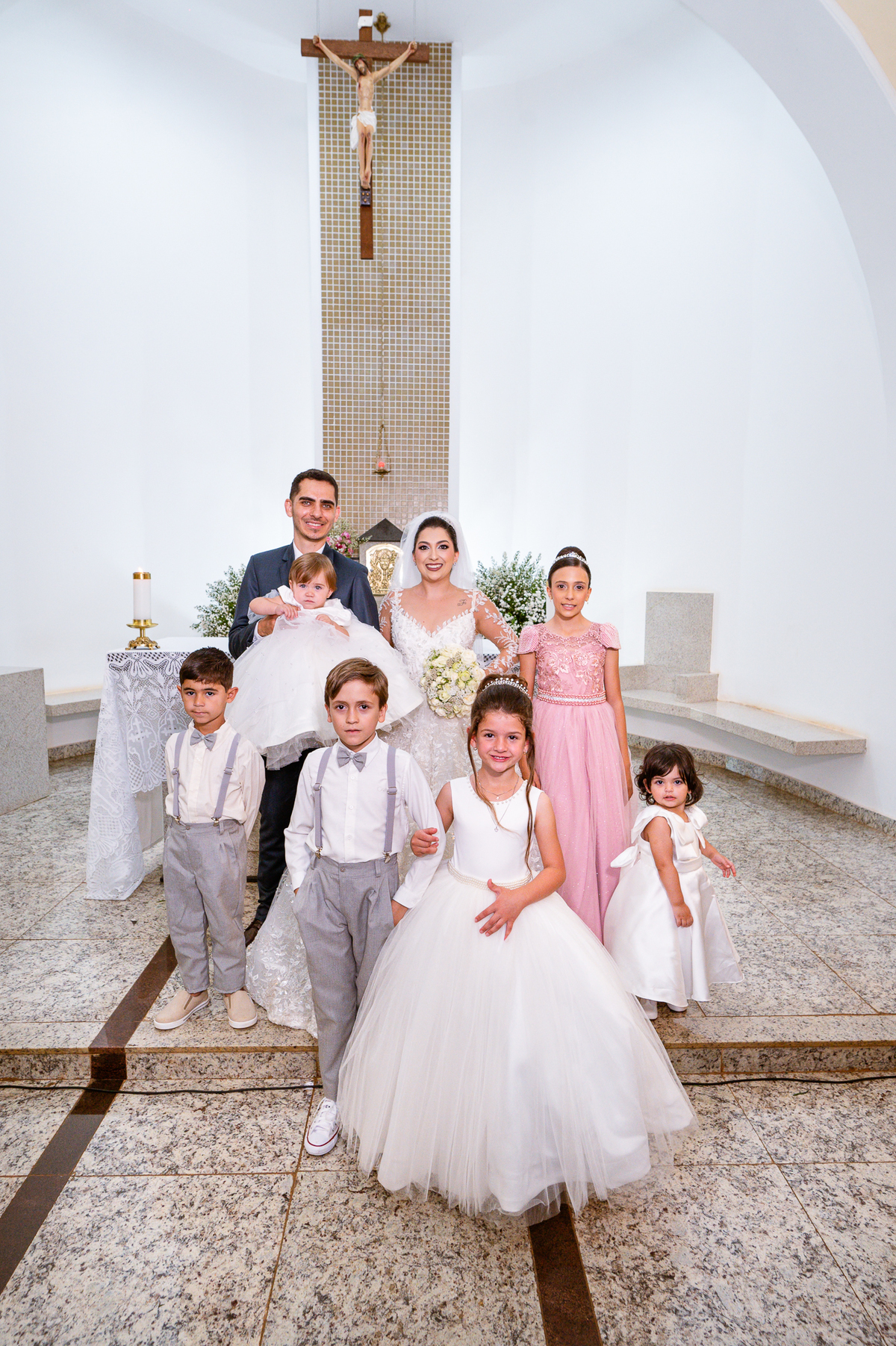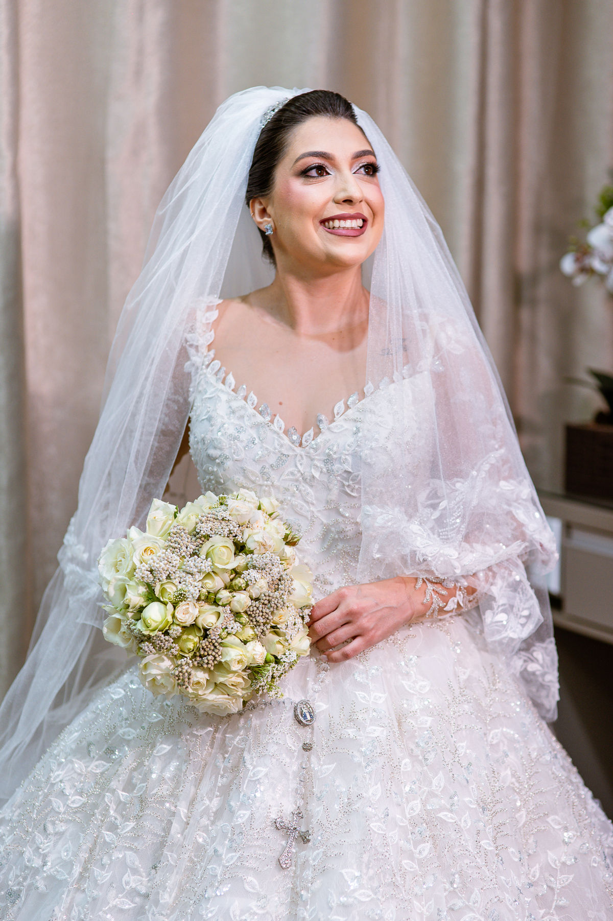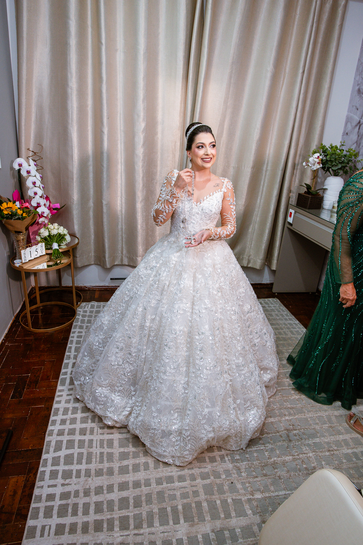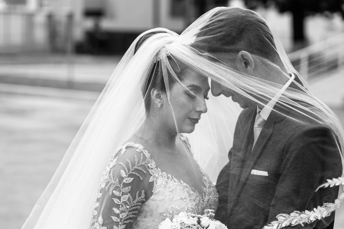 No salão, Amanda estava praticamente pronta. Era hora de colocar seu vestido. Em alguns minutos ela surgiu pronta, com seu penteado e make belíssimos e o vestido divo colocado em seu corpo. Enfim, era hora dos últimos retoques para partimos para a Igreja. Mas ainda tivemos tempo de surpresas! Até então, ela não havia visto seu buquê, e quem fez essa entrega foi a sua mãe. Quando Amanda recebeu, ela sorriu de canto a canto do rosto. Havia ficado muito além de suas expectativas. Agora o conjunto estava completo e a noiva pronta. Fizemos nossas tradicionais fotografias da noiva pronta e já seguimos pra celebração. Chegando na Igreja, os padrinhos já estavam todos alinhados pela equipe cerimonial. Fizemos as fotografias da noiva no carro e já partimos pro altar. A equipe musical estava aguardando o início e tão logo chegamos eles começaram a cantar.