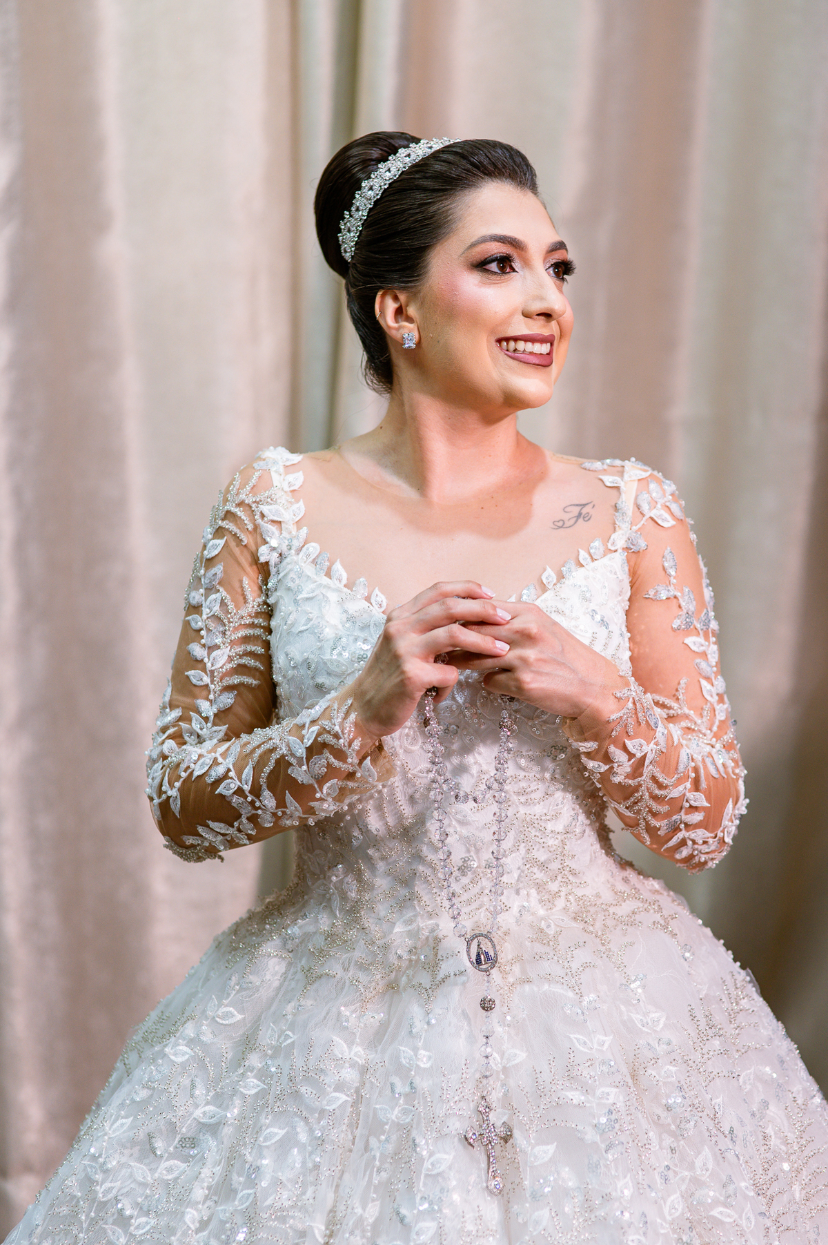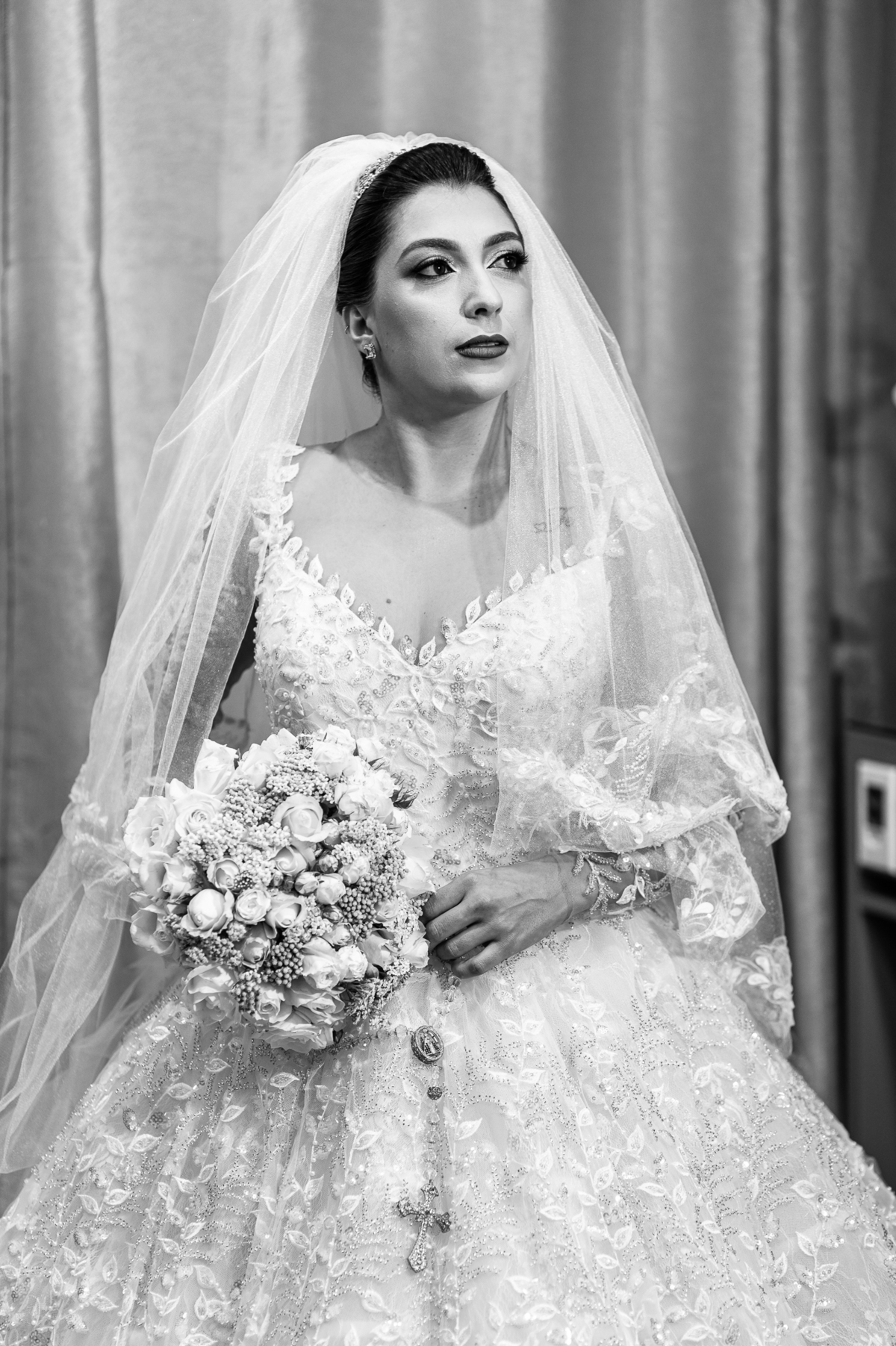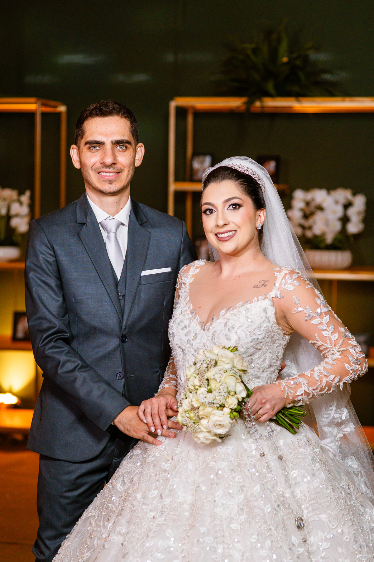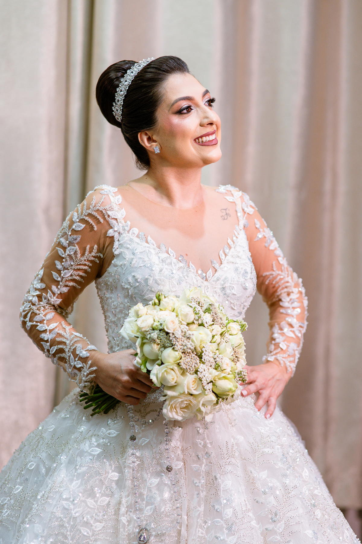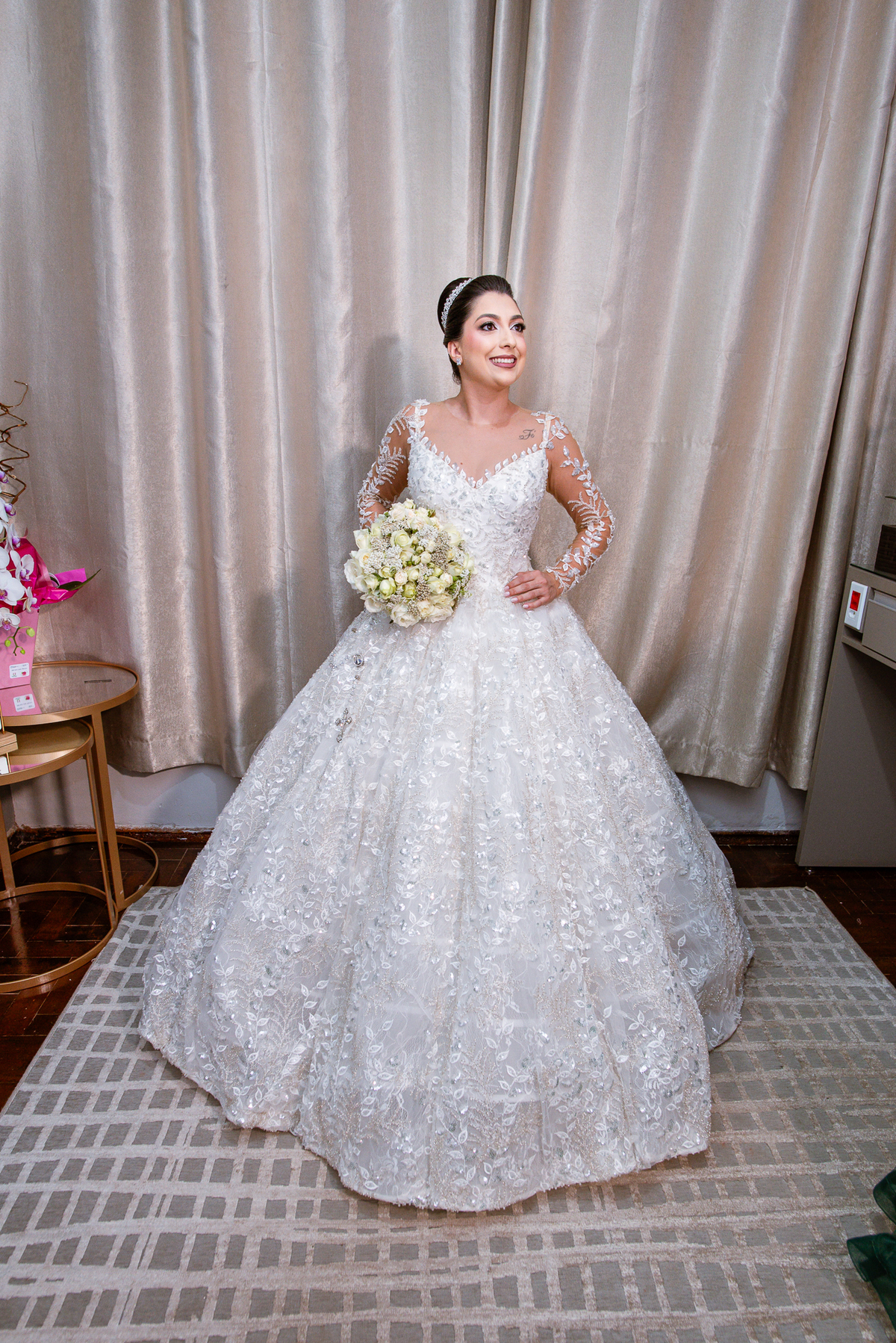 No salão, Amanda estava praticamente pronta. Era hora de colocar seu vestido. Em alguns minutos ela surgiu pronta, com seu penteado e make belíssimos e o vestido divo colocado em seu corpo. Enfim, era hora dos últimos retoques para partimos para a Igreja. Mas ainda tivemos tempo de surpresas! Até então, ela não havia visto seu buquê, e quem fez essa entrega foi a sua mãe. Quando Amanda recebeu, ela sorriu de canto a canto do rosto. Havia ficado muito além de suas expectativas. Agora o conjunto estava completo e a noiva pronta. Fizemos nossas tradicionais fotografias da noiva pronta e já seguimos pra celebração. Chegando na Igreja, os padrinhos já estavam todos alinhados pela equipe cerimonial. Fizemos as fotografias da noiva no carro e já partimos pro altar. A equipe musical estava aguardando o início e tão logo chegamos eles começaram a cantar.