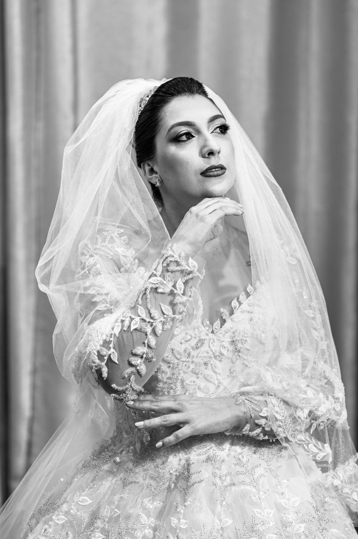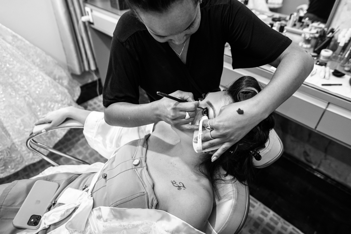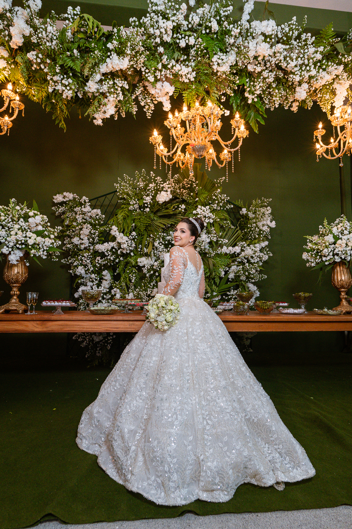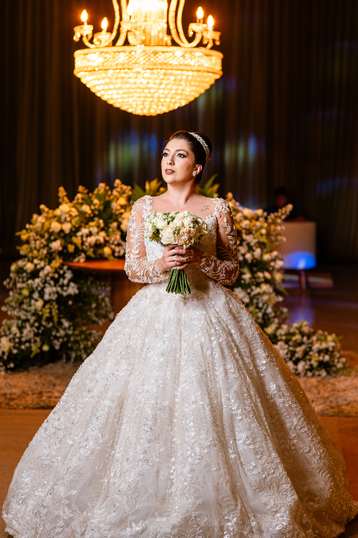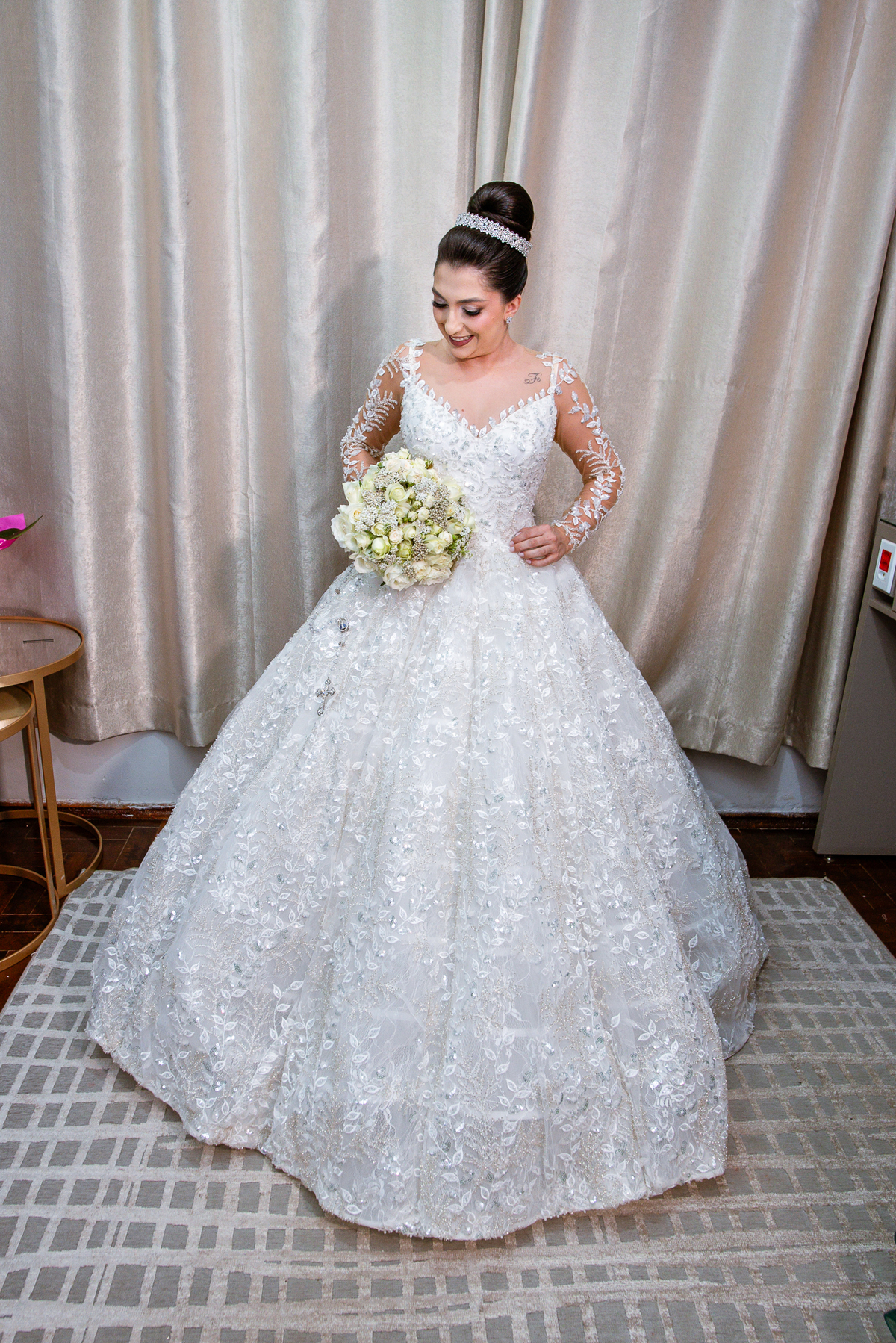 No salão, Amanda estava praticamente pronta. Era hora de colocar seu vestido. Em alguns minutos ela surgiu pronta, com seu penteado e make belíssimos e o vestido divo colocado em seu corpo. Enfim, era hora dos últimos retoques para partimos para a Igreja. Mas ainda tivemos tempo de surpresas! Até então, ela não havia visto seu buquê, e quem fez essa entrega foi a sua mãe. Quando Amanda recebeu, ela sorriu de canto a canto do rosto. Havia ficado muito além de suas expectativas. Agora o conjunto estava completo e a noiva pronta. Fizemos nossas tradicionais fotografias da noiva pronta e já seguimos pra celebração. Chegando na Igreja, os padrinhos já estavam todos alinhados pela equipe cerimonial. Fizemos as fotografias da noiva no carro e já partimos pro altar. A equipe musical estava aguardando o início e tão logo chegamos eles começaram a cantar.