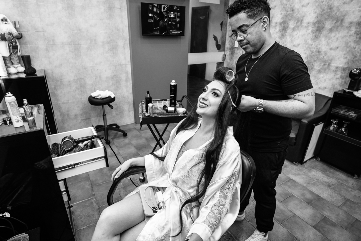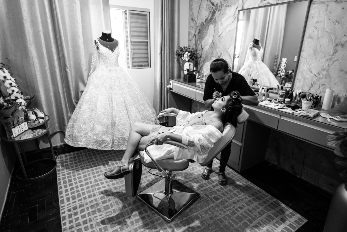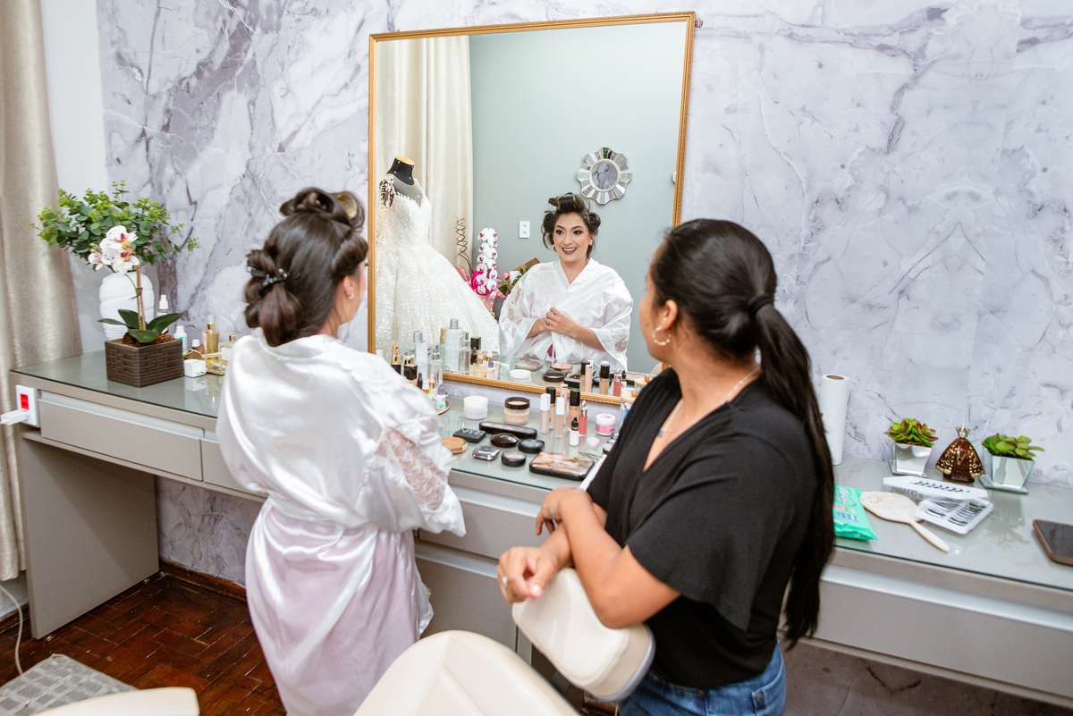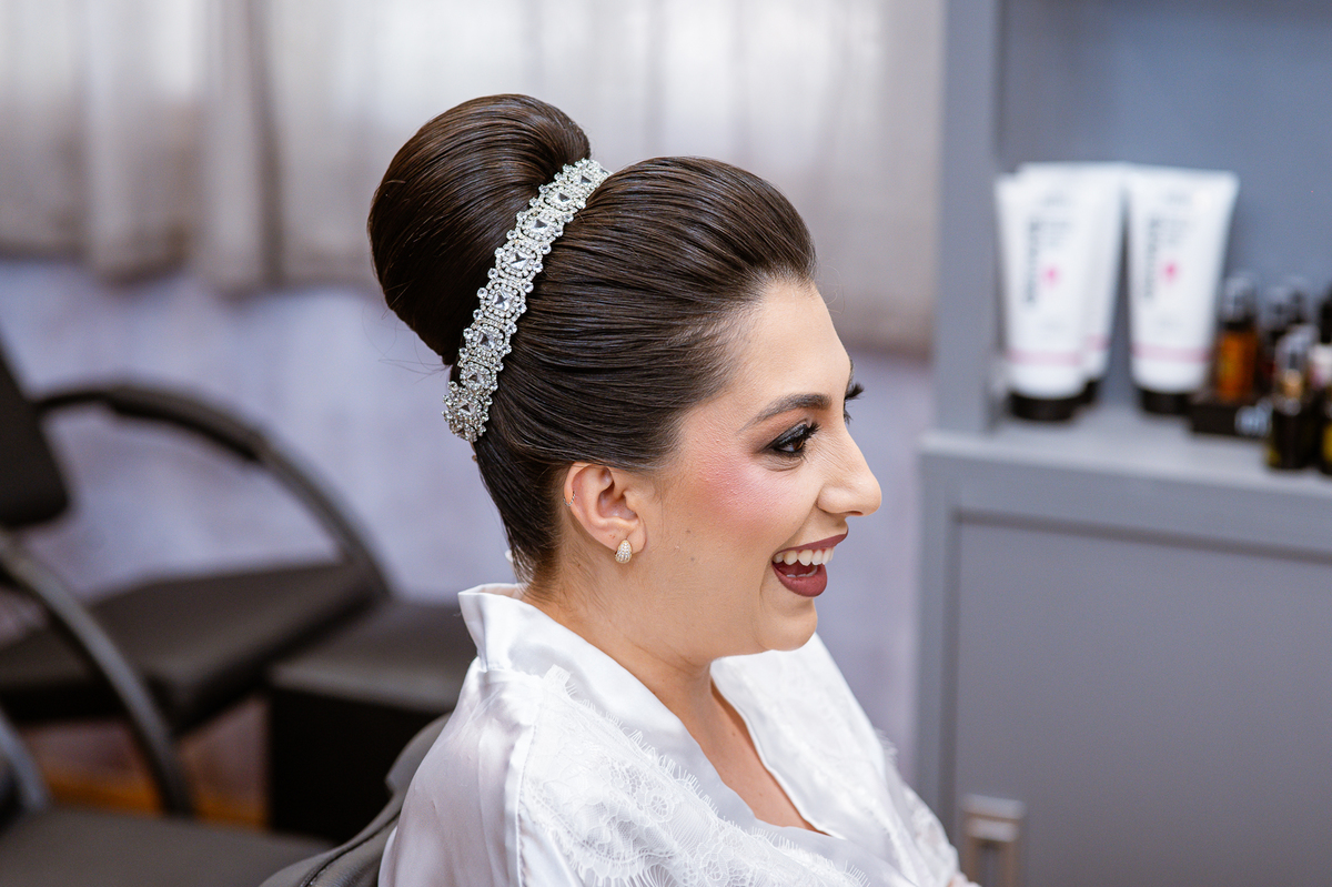 Um casamento pra lá de especial. Serra do Salitre parou para assistir um dia de princesa! O casamento de Amanda e Murilo aconteceu no mês de Novembro e fomos incumbidos de contar essa história de amor em forma de fotografias. Começamos o dia de noiva com a Amanda se produzindo, com seu vestido lindíssimo ao fundo aguardando seu momento. A make escolhida por ela foi uma maquiagem clássica, realçando seus traços e harmonizando com seu penteado. Ela estava tranquila, e quem acompanhava de perto era sua mãe e também a florista que é grudada na sua madrinha. Depois da make, era hora de realizar o penteado. Amanda tem um cabelão lindíssimo e optou acertadamente por um penteado clássico com coque. Aos poucos, o penteado foi tomando forma e as madeixas deram lugar ao coque lindíssimo.