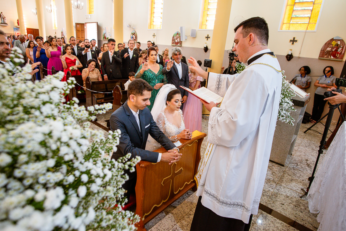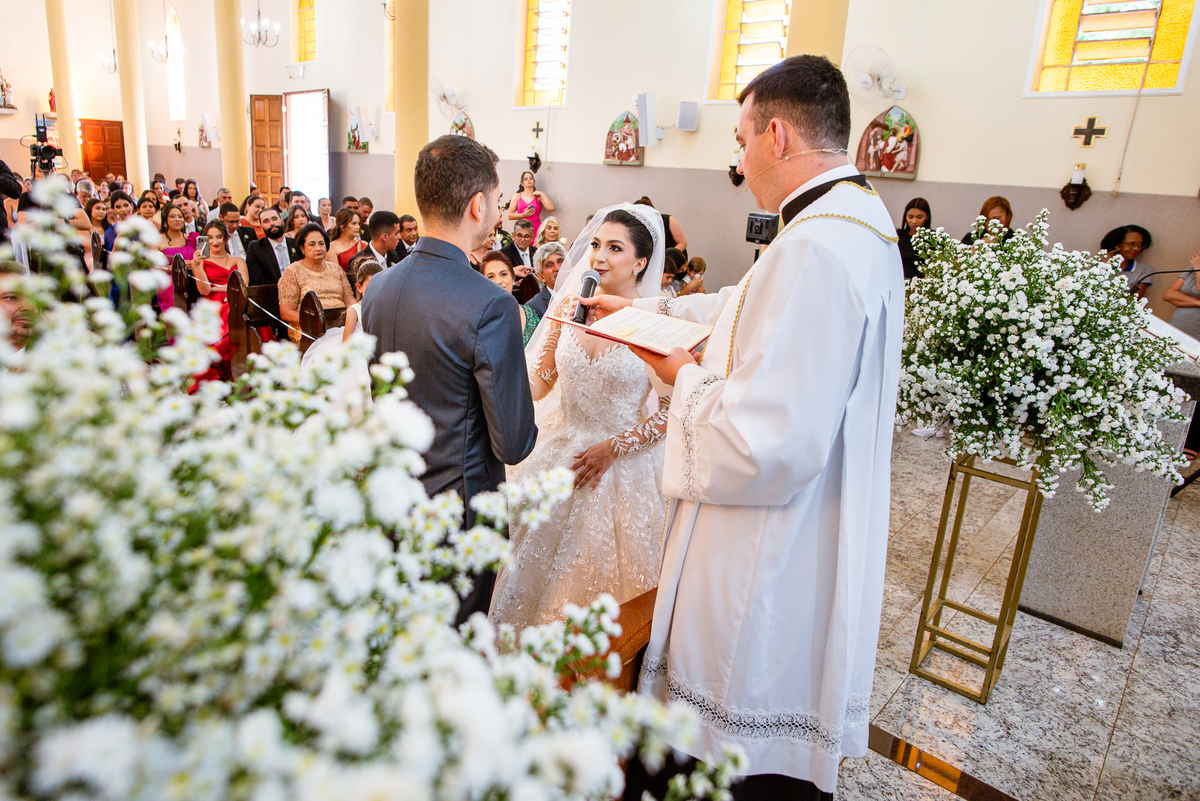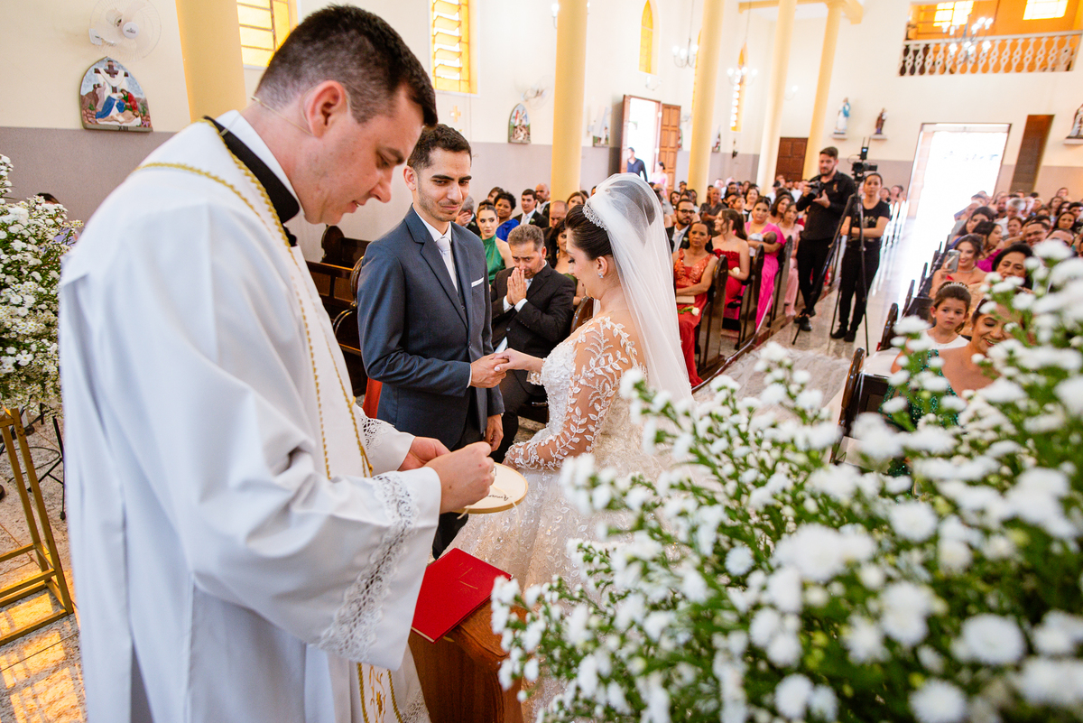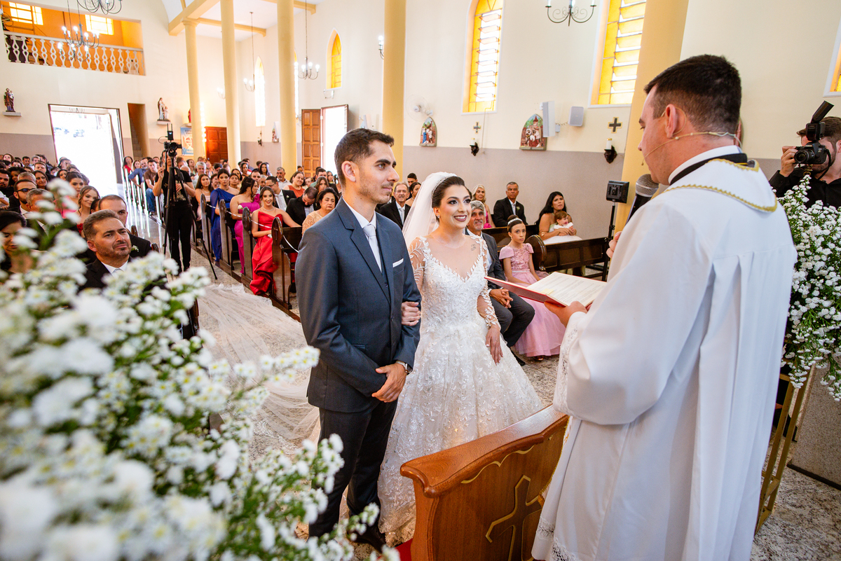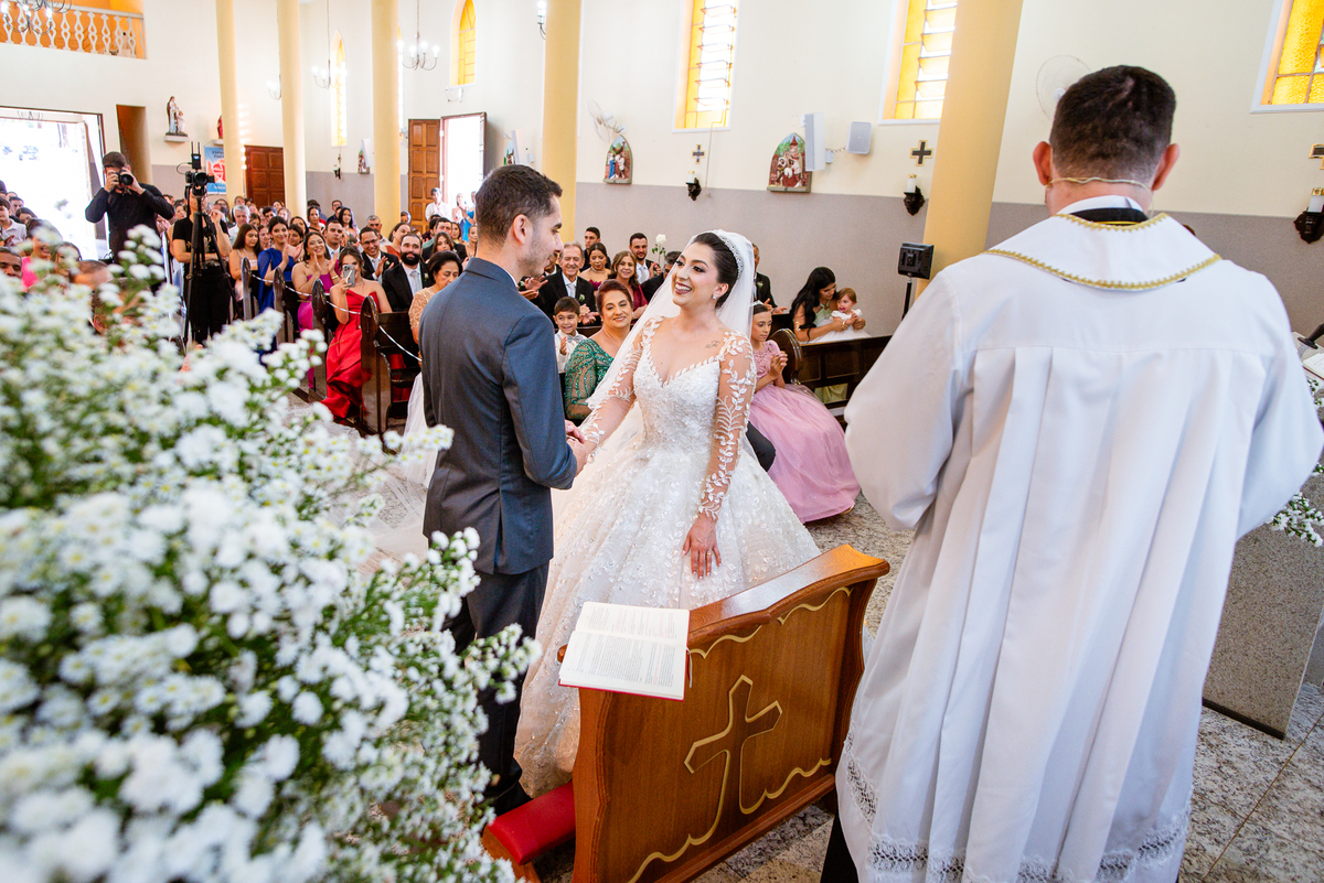 Agora, frente a frente estavam noivo e noiva. Aquele momento tão especial e desejado estava acontecendo. Murilo então carinhosamente beijou a fronte de Amanda e selou aquele momento para sempre. Agora, os dois caminharam juntos rumo ao altar, onde o padre os aguardava para a celebração. O padre Cléber os recebeu, com toda simpatia. Trouxe-nos uma palavra abençoadíssima, e mesmo com toda seriedade do momento, ainda conseguiu arrancar vários sorrisos dos dois. Foi uma homilia linda e reconfortante. Ao final, eles foram perguntados sobre seus votos de amor eterno que ambos responderam sim. Depois, fizeram seu juramento de amor um para o outro. As alianças foram abençoadas e benzidas. Amanda e Murilo colocaram a aliança um no dedo do outro e foram declarados casados perante Deus e as testemunhas. Com uma forte salva de palmas, os convidados comemoraram aquele momento com os recém-casados.