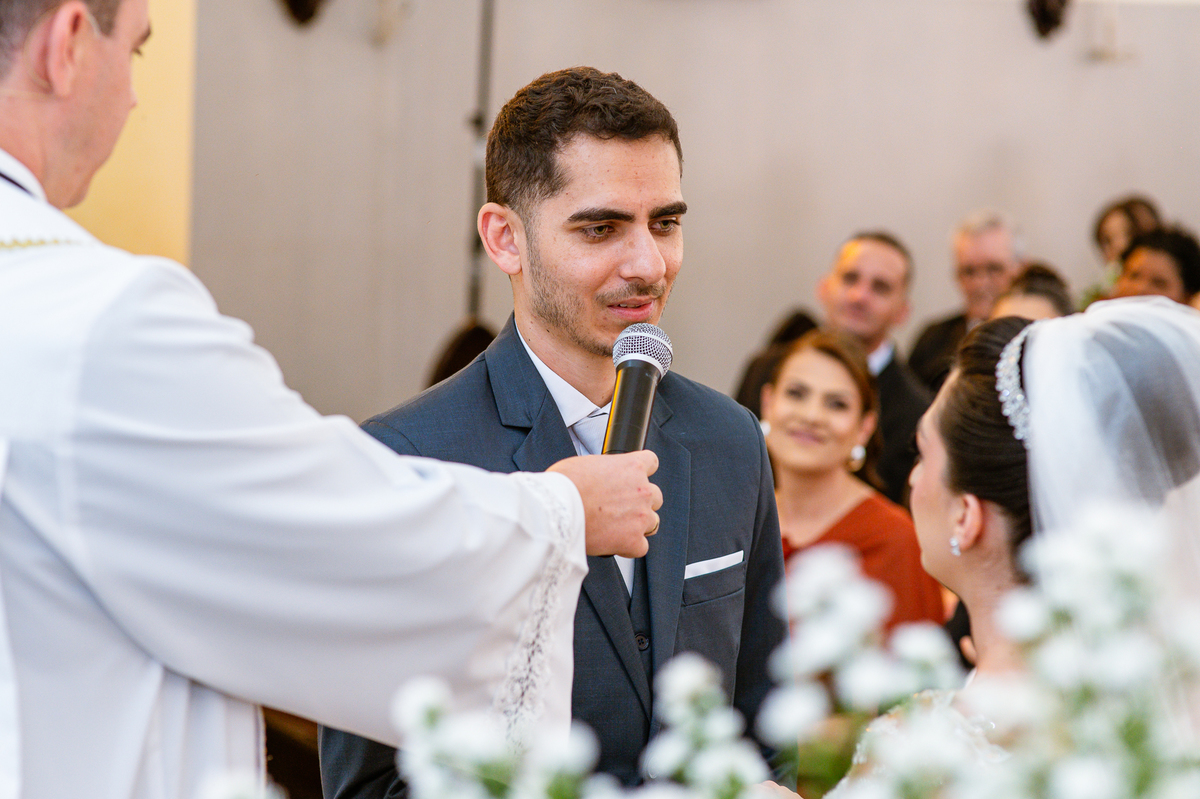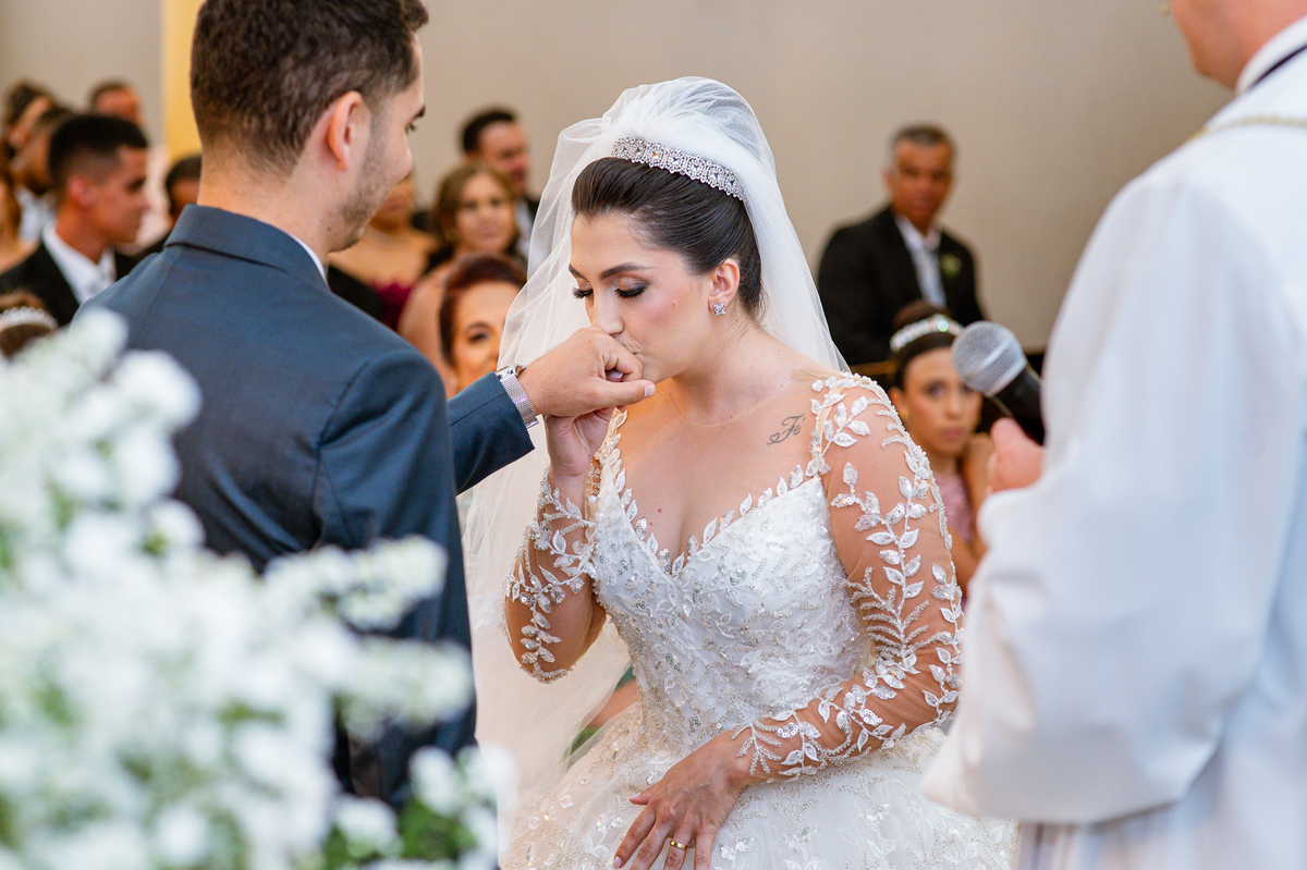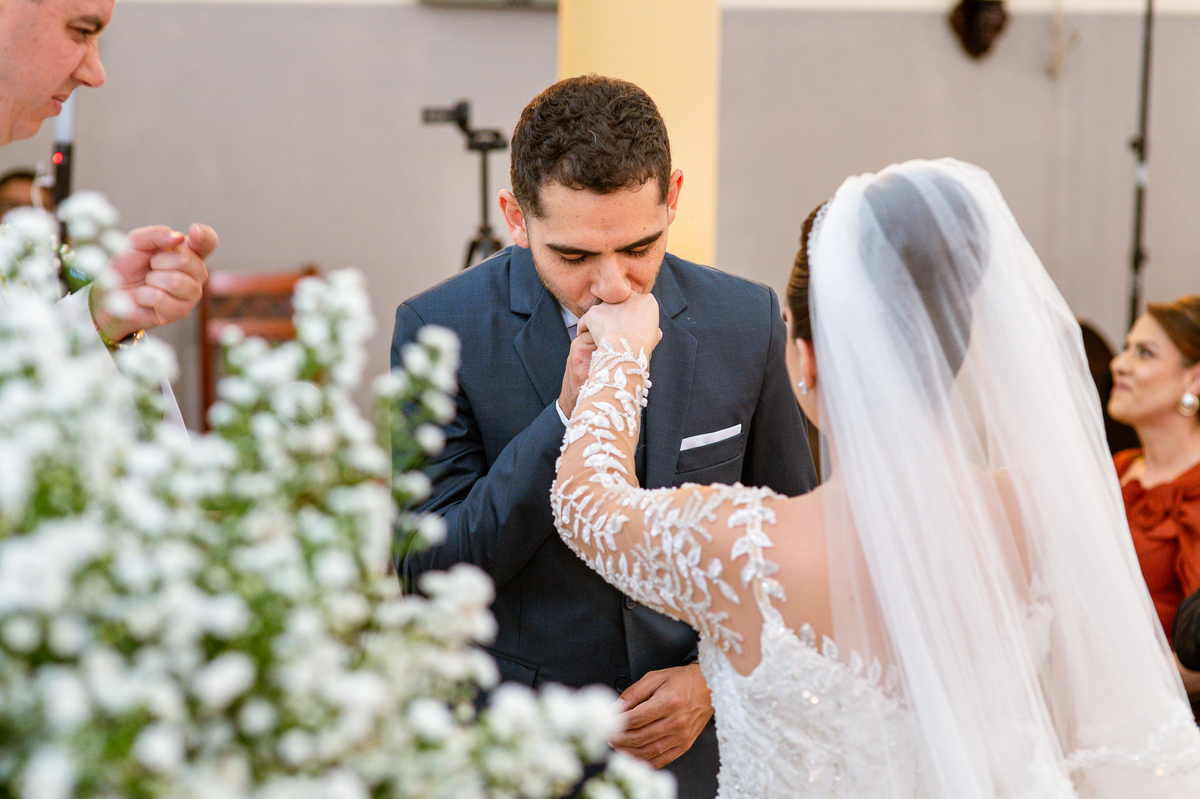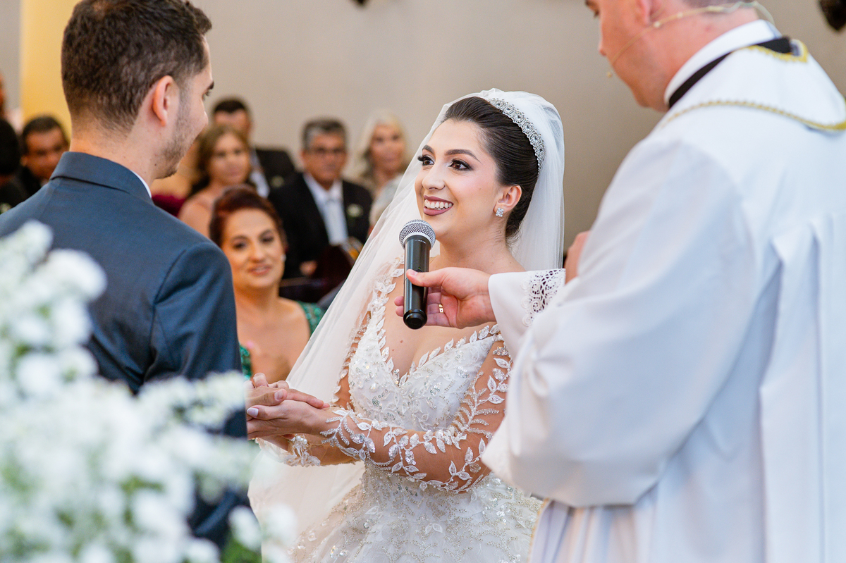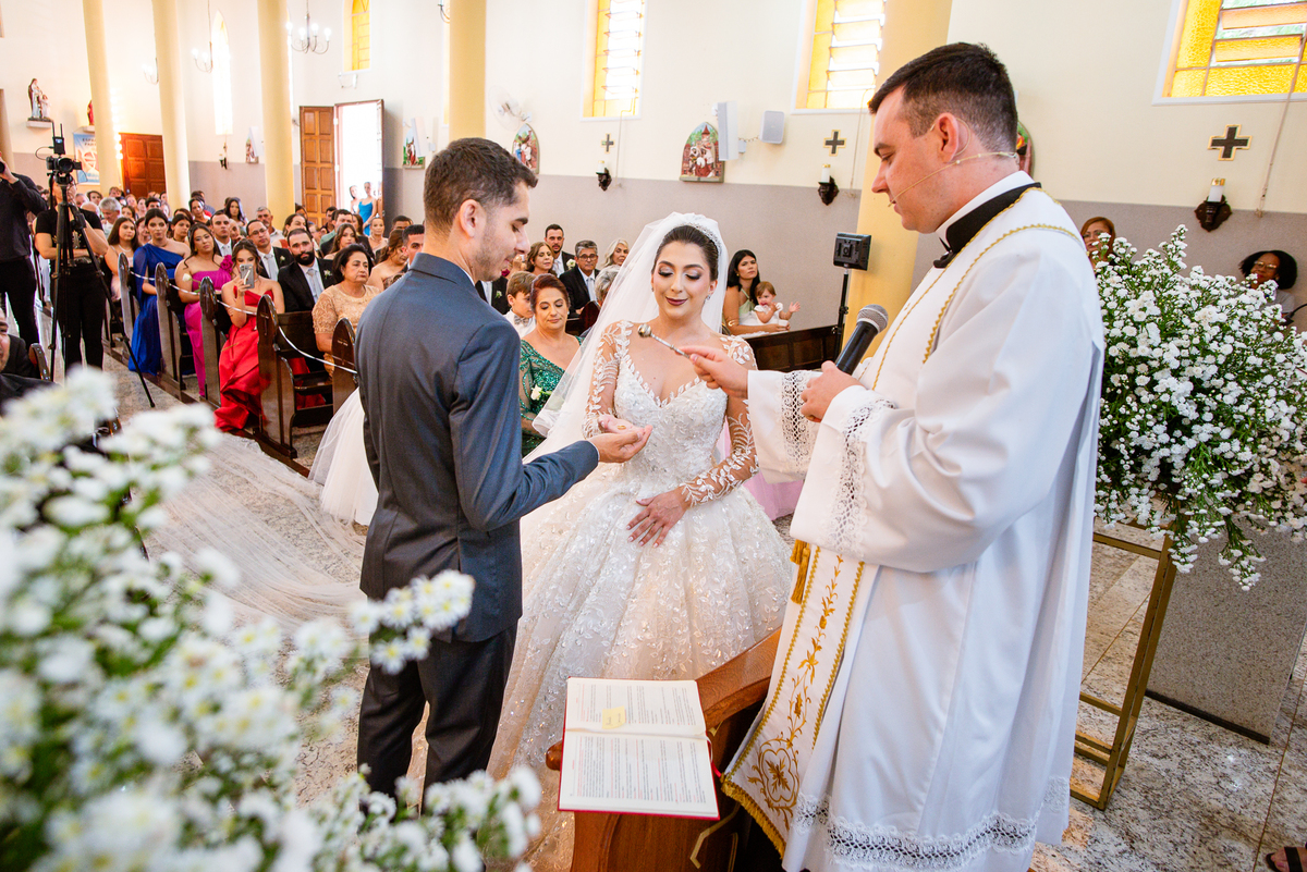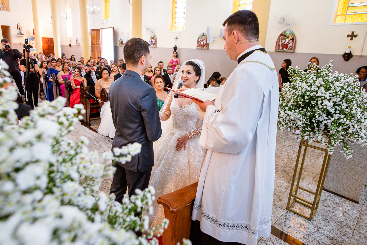 Agora, frente a frente estavam noivo e noiva. Aquele momento tão especial e desejado estava acontecendo. Murilo então carinhosamente beijou a fronte de Amanda e selou aquele momento para sempre. Agora, os dois caminharam juntos rumo ao altar, onde o padre os aguardava para a celebração. O padre Cléber os recebeu, com toda simpatia. Trouxe-nos uma palavra abençoadíssima, e mesmo com toda seriedade do momento, ainda conseguiu arrancar vários sorrisos dos dois. Foi uma homilia linda e reconfortante. Ao final, eles foram perguntados sobre seus votos de amor eterno que ambos responderam sim. Depois, fizeram seu juramento de amor um para o outro. As alianças foram abençoadas e benzidas. Amanda e Murilo colocaram a aliança um no dedo do outro e foram declarados casados perante Deus e as testemunhas. Com uma forte salva de palmas, os convidados comemoraram aquele momento com os recém-casados.