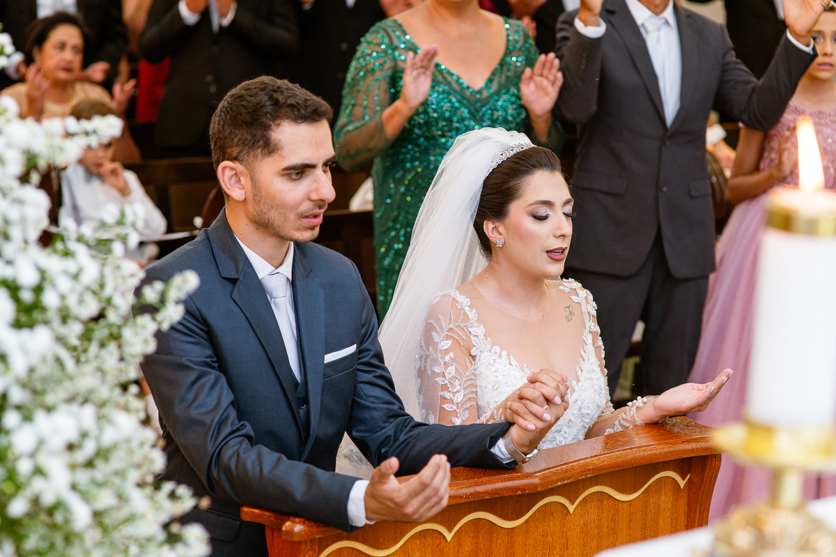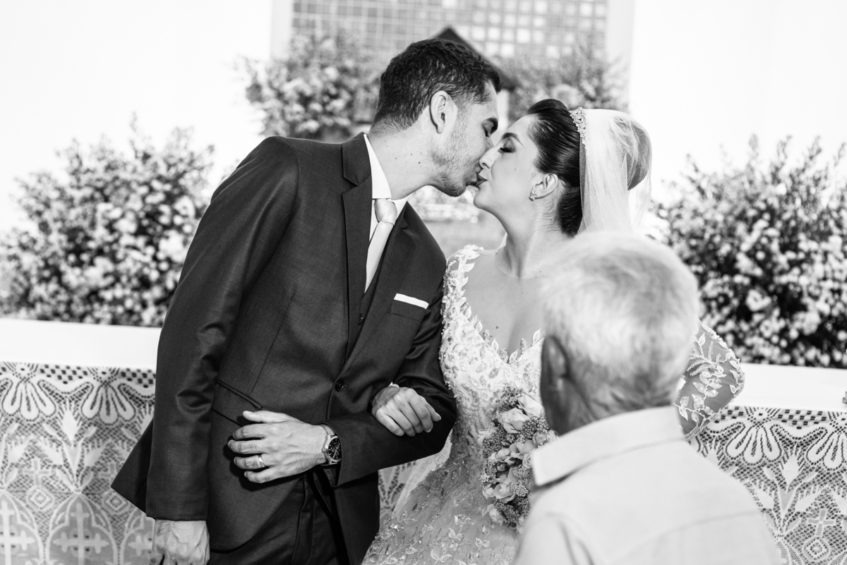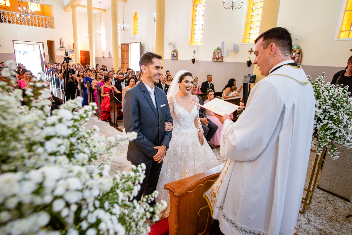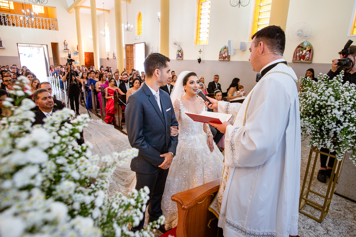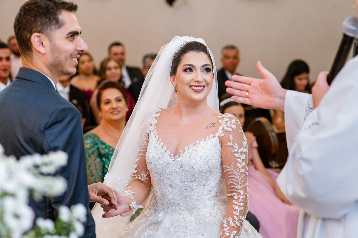 Agora, frente a frente estavam noivo e noiva. Aquele momento tão especial e desejado estava acontecendo. Murilo então carinhosamente beijou a fronte de Amanda e selou aquele momento para sempre. Agora, os dois caminharam juntos rumo ao altar, onde o padre os aguardava para a celebração. O padre Cléber os recebeu, com toda simpatia. Trouxe-nos uma palavra abençoadíssima, e mesmo com toda seriedade do momento, ainda conseguiu arrancar vários sorrisos dos dois. Foi uma homilia linda e reconfortante. Ao final, eles foram perguntados sobre seus votos de amor eterno que ambos responderam sim. Depois, fizeram seu juramento de amor um para o outro. As alianças foram abençoadas e benzidas. Amanda e Murilo colocaram a aliança um no dedo do outro e foram declarados casados perante Deus e as testemunhas. Com uma forte salva de palmas, os convidados comemoraram aquele momento com os recém-casados.
