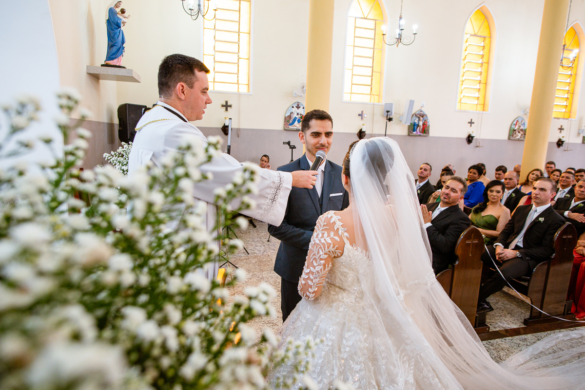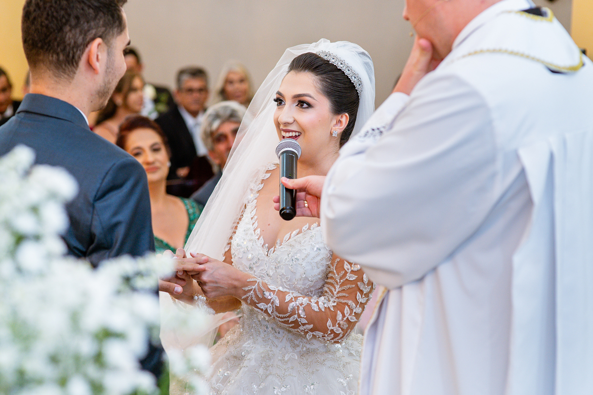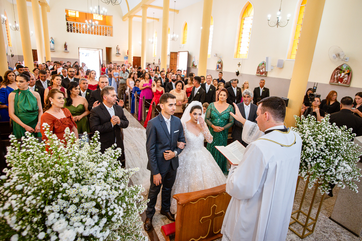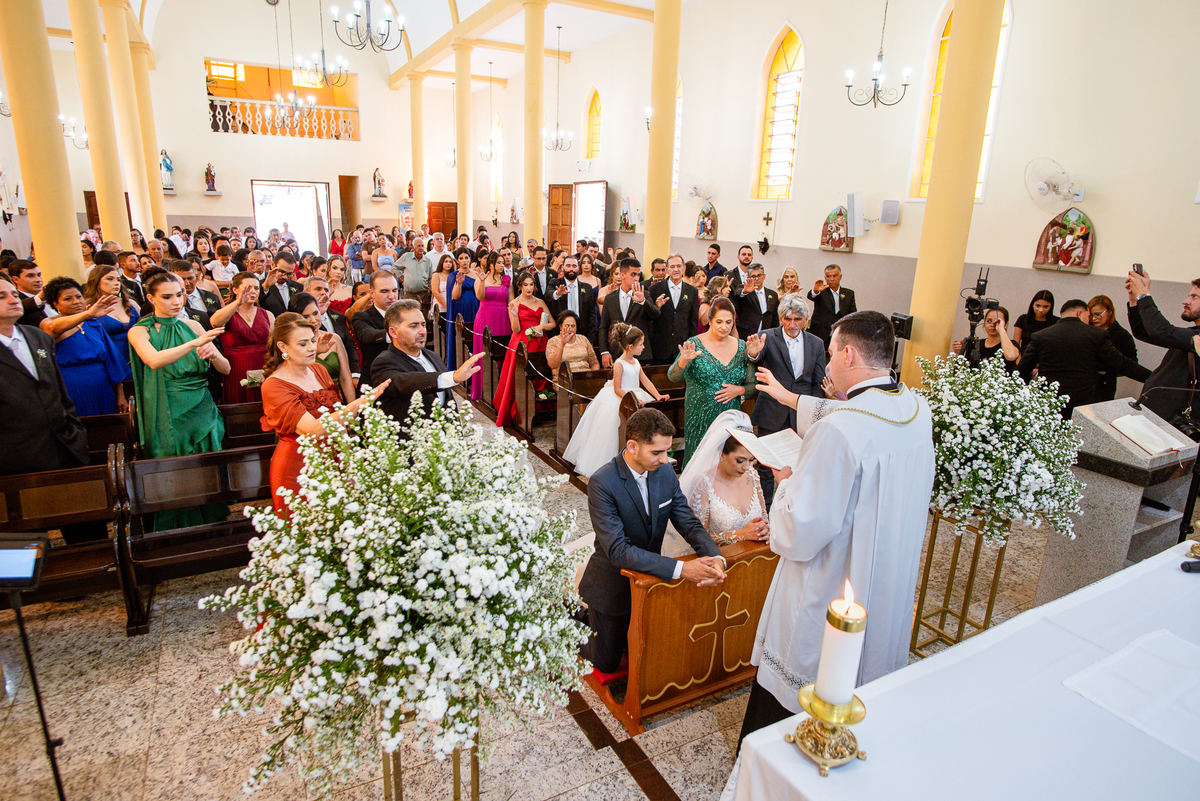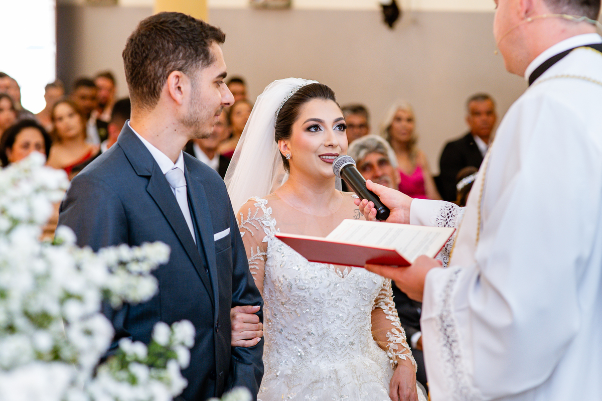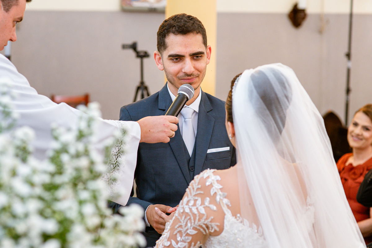 Agora, frente a frente estavam noivo e noiva. Aquele momento tão especial e desejado estava acontecendo. Murilo então carinhosamente beijou a fronte de Amanda e selou aquele momento para sempre. Agora, os dois caminharam juntos rumo ao altar, onde o padre os aguardava para a celebração. O padre Cléber os recebeu, com toda simpatia. Trouxe-nos uma palavra abençoadíssima, e mesmo com toda seriedade do momento, ainda conseguiu arrancar vários sorrisos dos dois. Foi uma homilia linda e reconfortante. Ao final, eles foram perguntados sobre seus votos de amor eterno que ambos responderam sim. Depois, fizeram seu juramento de amor um para o outro. As alianças foram abençoadas e benzidas. Amanda e Murilo colocaram a aliança um no dedo do outro e foram declarados casados perante Deus e as testemunhas. Com uma forte salva de palmas, os convidados comemoraram aquele momento com os recém-casados.