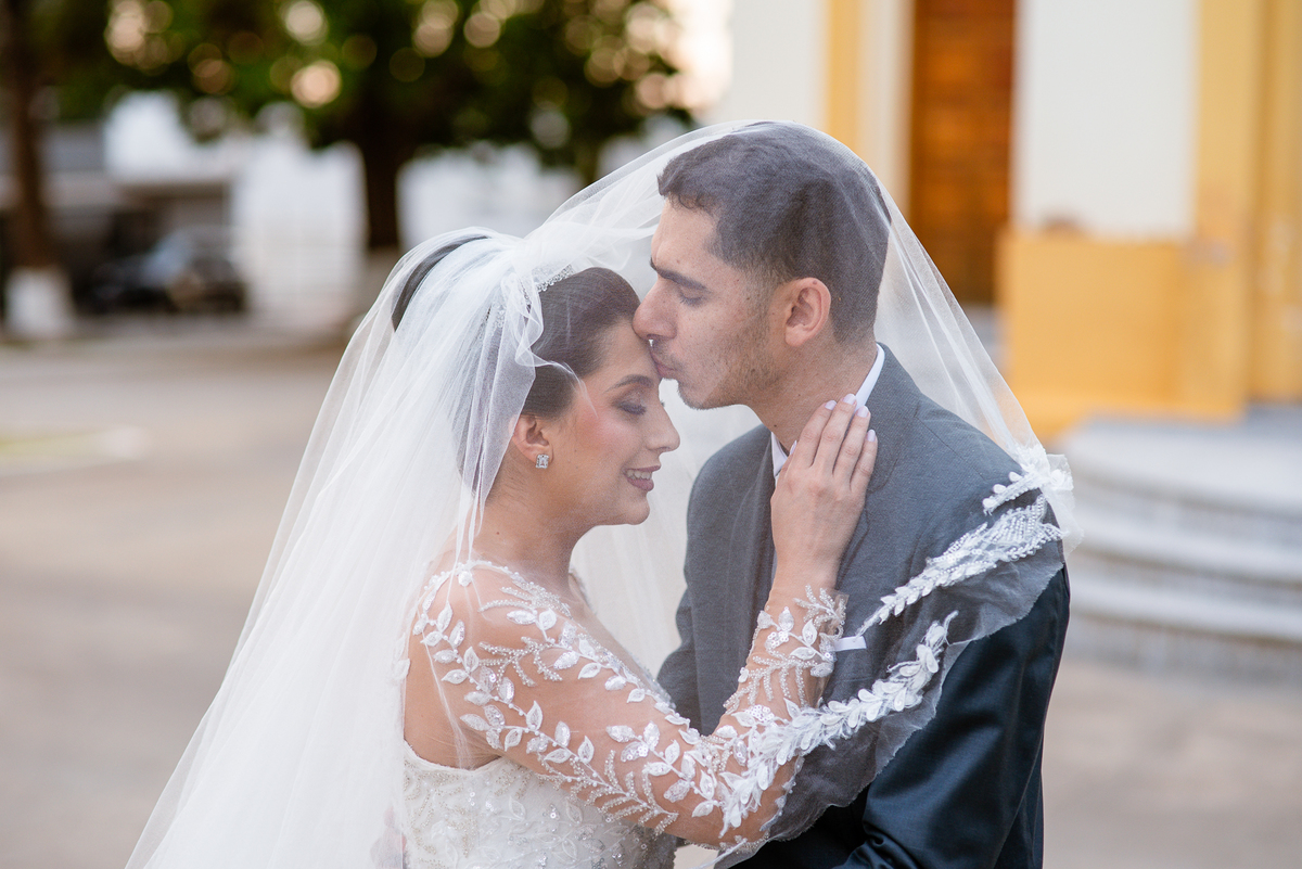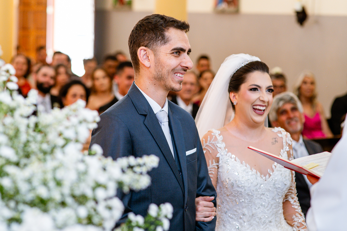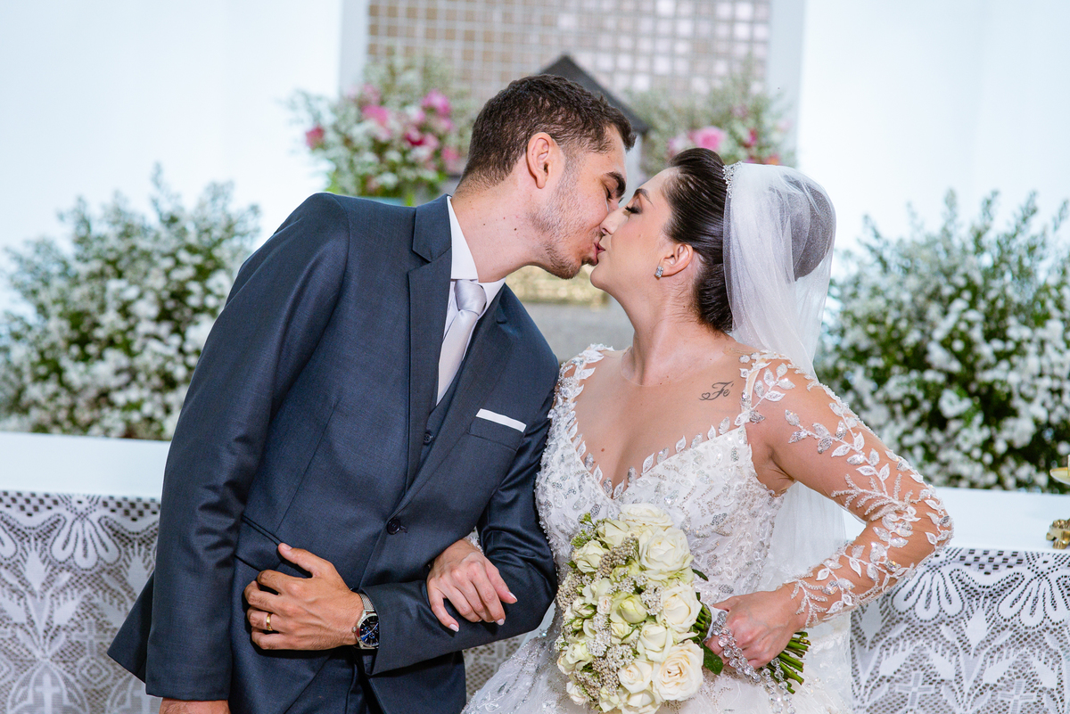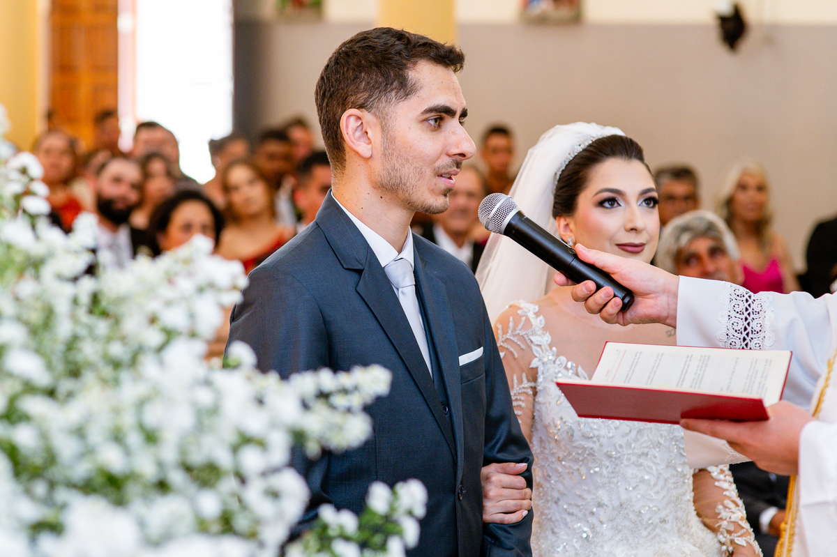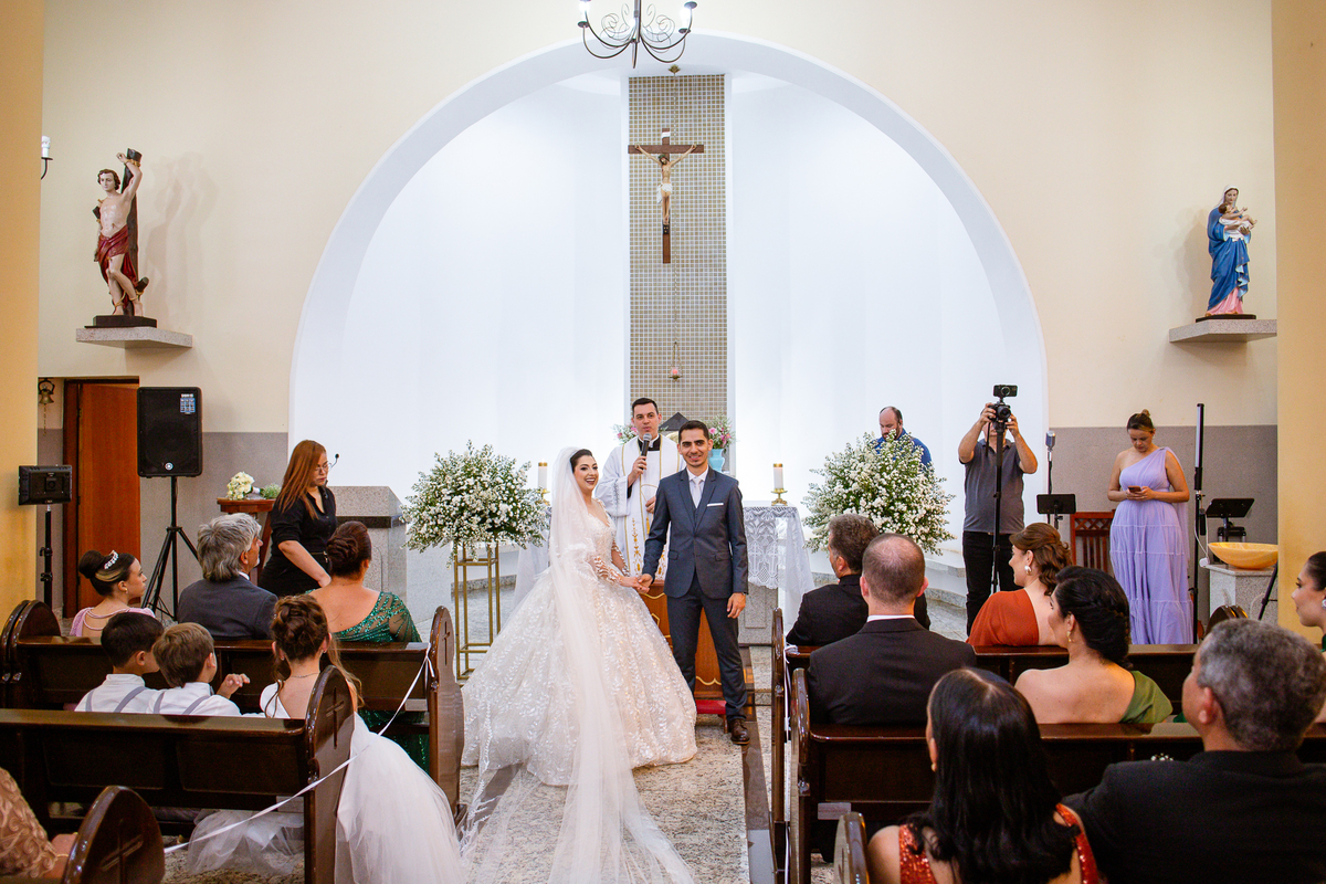 Agora, frente a frente estavam noivo e noiva. Aquele momento tão especial e desejado estava acontecendo. Murilo então carinhosamente beijou a fronte de Amanda e selou aquele momento para sempre. Agora, os dois caminharam juntos rumo ao altar, onde o padre os aguardava para a celebração. O padre Cléber os recebeu, com toda simpatia. Trouxe-nos uma palavra abençoadíssima, e mesmo com toda seriedade do momento, ainda conseguiu arrancar vários sorrisos dos dois. Foi uma homilia linda e reconfortante. Ao final, eles foram perguntados sobre seus votos de amor eterno que ambos responderam sim. Depois, fizeram seu juramento de amor um para o outro. As alianças foram abençoadas e benzidas. Amanda e Murilo colocaram a aliança um no dedo do outro e foram declarados casados perante Deus e as testemunhas. Com uma forte salva de palmas, os convidados comemoraram aquele momento com os recém-casados.