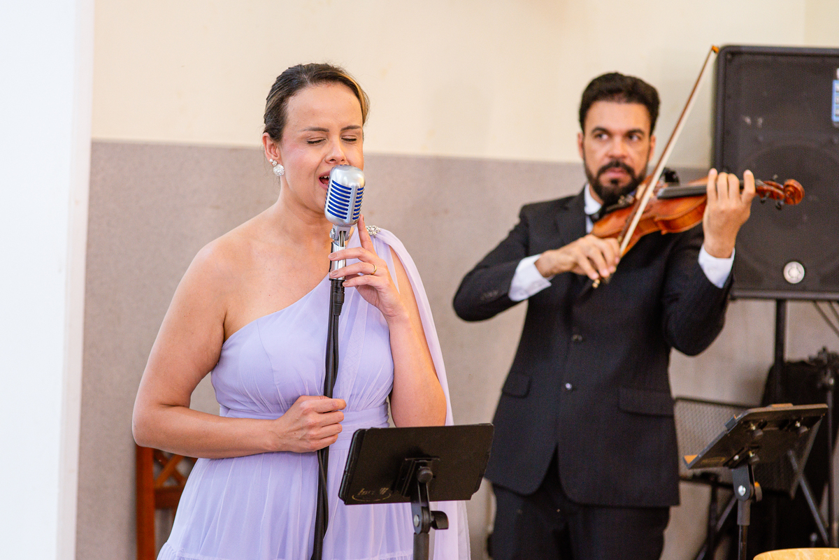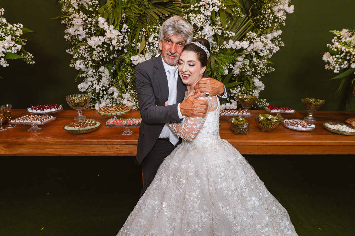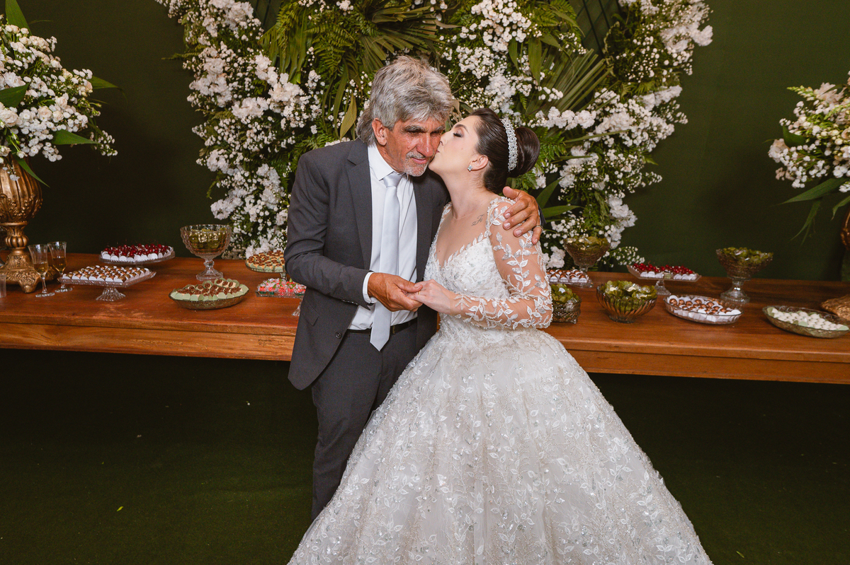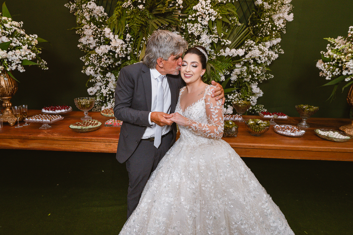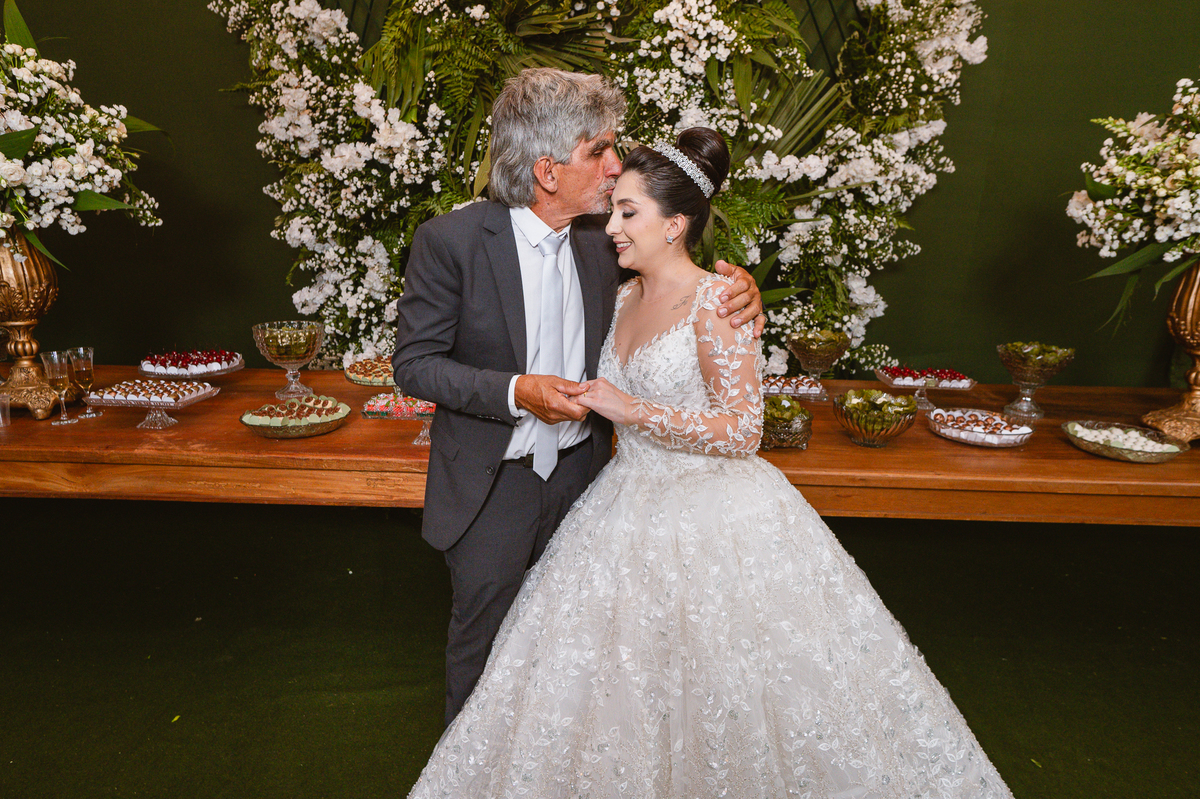 Enfim, depois desse momento super emocionante, os dois se posicionaram detrás da porta. O músico responsável pela anunciação da entrada da noiva começou a tocar sua trombeta no corredor. Era chegada a hora mais esperada. Os corações todos aflitos, mal podiam conter a explosão de sentimentos. Depois de chegar ao final do corredor, o músico se virou e finalizou a marcha nupcial. As portas foram abertas e Amanda surgiu de braços dados com seu pai. A luz daquela tarde entrou naquele ambiente como se fosse um sopro. A noiva parou na primeira parte e olhou nos olhos de seu pai que lhe retribuiu com um largo sorriso. Eles caminharam lentamente rumo ao encontro com o noivo. Poucos passos depois, eles pararam e aguardaram a vinda de Murilo. O noivo caminhou até eles, esperou seu sogro se despedir de Amanda e recebeu dele a mão de sua noiva. Foi um momento muito especial de carinho. Quem conhece o pai da noiva sabe o quanto ele não é de demonstrar carinho em público. Mas ele fez! Olhou nos olhos da filha, parou de frente, encostou a cabeça de leve em sua testa e depois a beijou. Por fim, entregou a mão dela para seu amado noivo e ainda com as lágrimas descendo o rosto, ele os deixou.